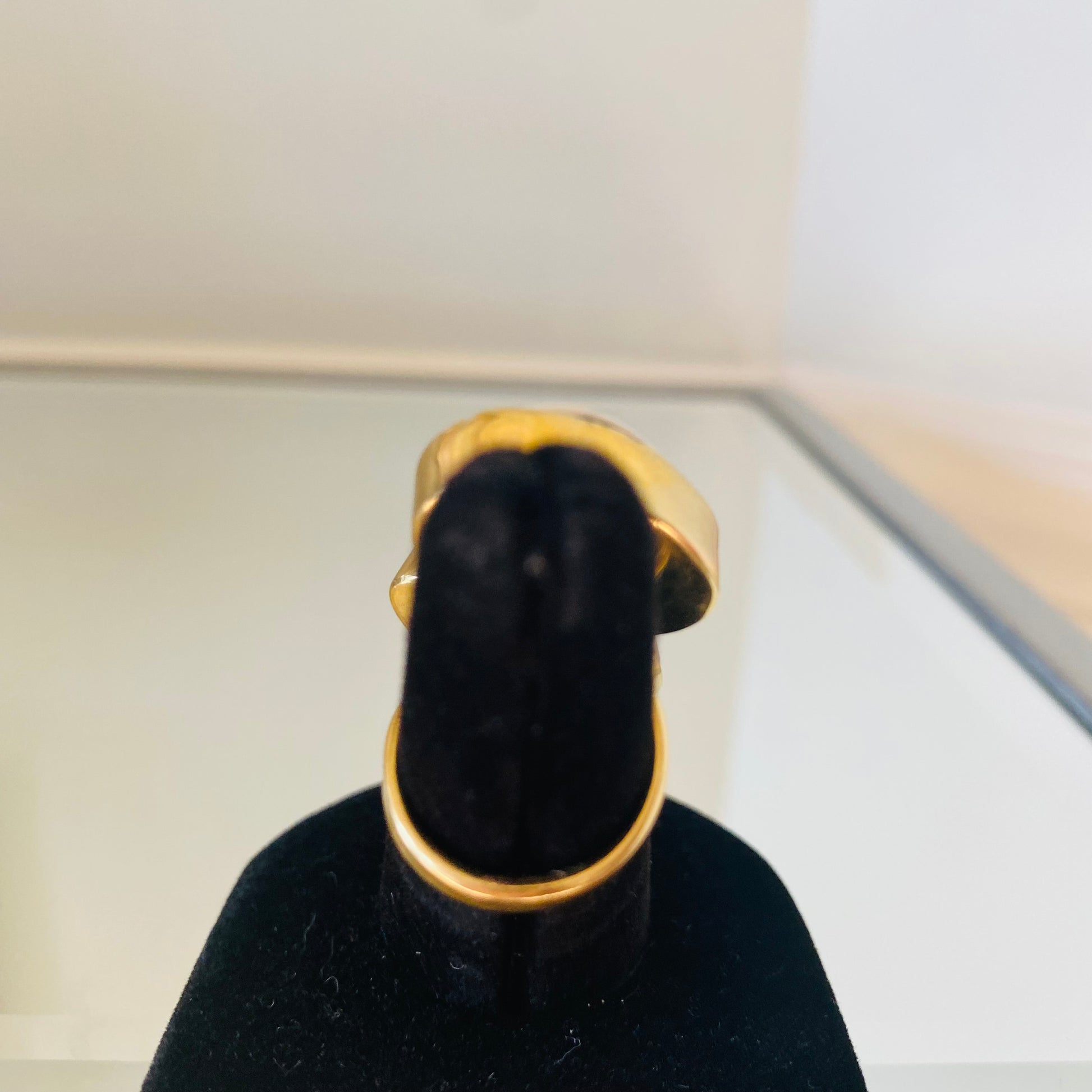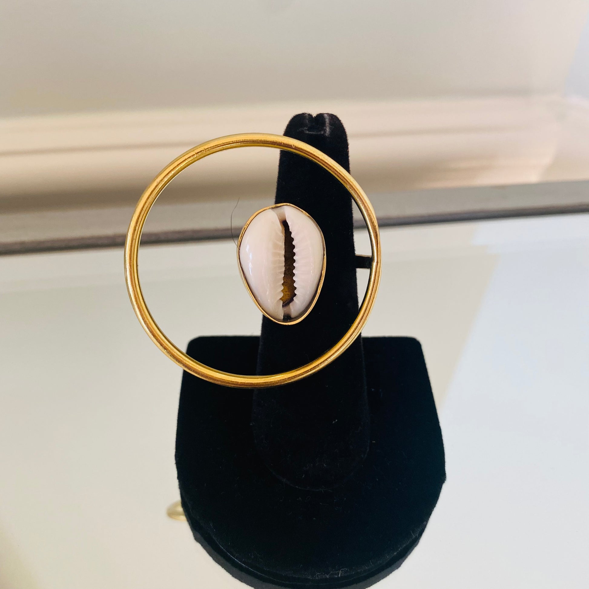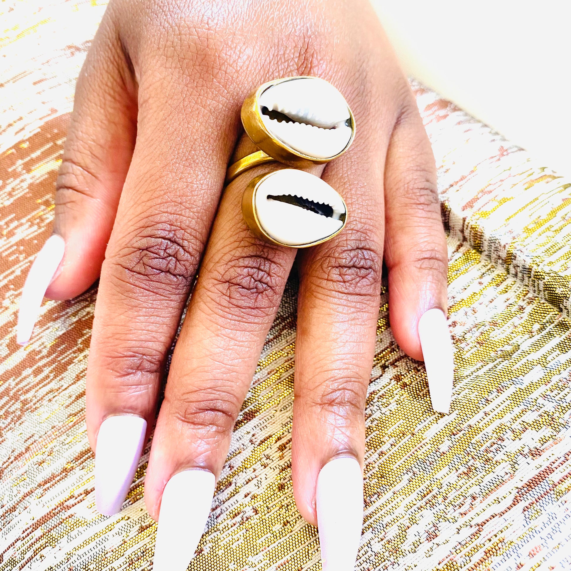 The Cowrie Shell was used as currency during the slave trade; it has held its value; chic authentic Cowrie shell, encapsulated in polished brass; adjustable to fit most finger sizes. It elevates the look of any finger and hand; it mixes well with other non-African pieces to achieve a Boho-chic vibe; adjustable.