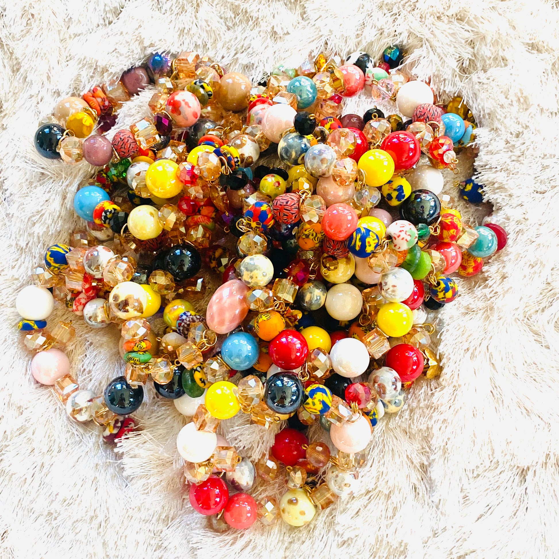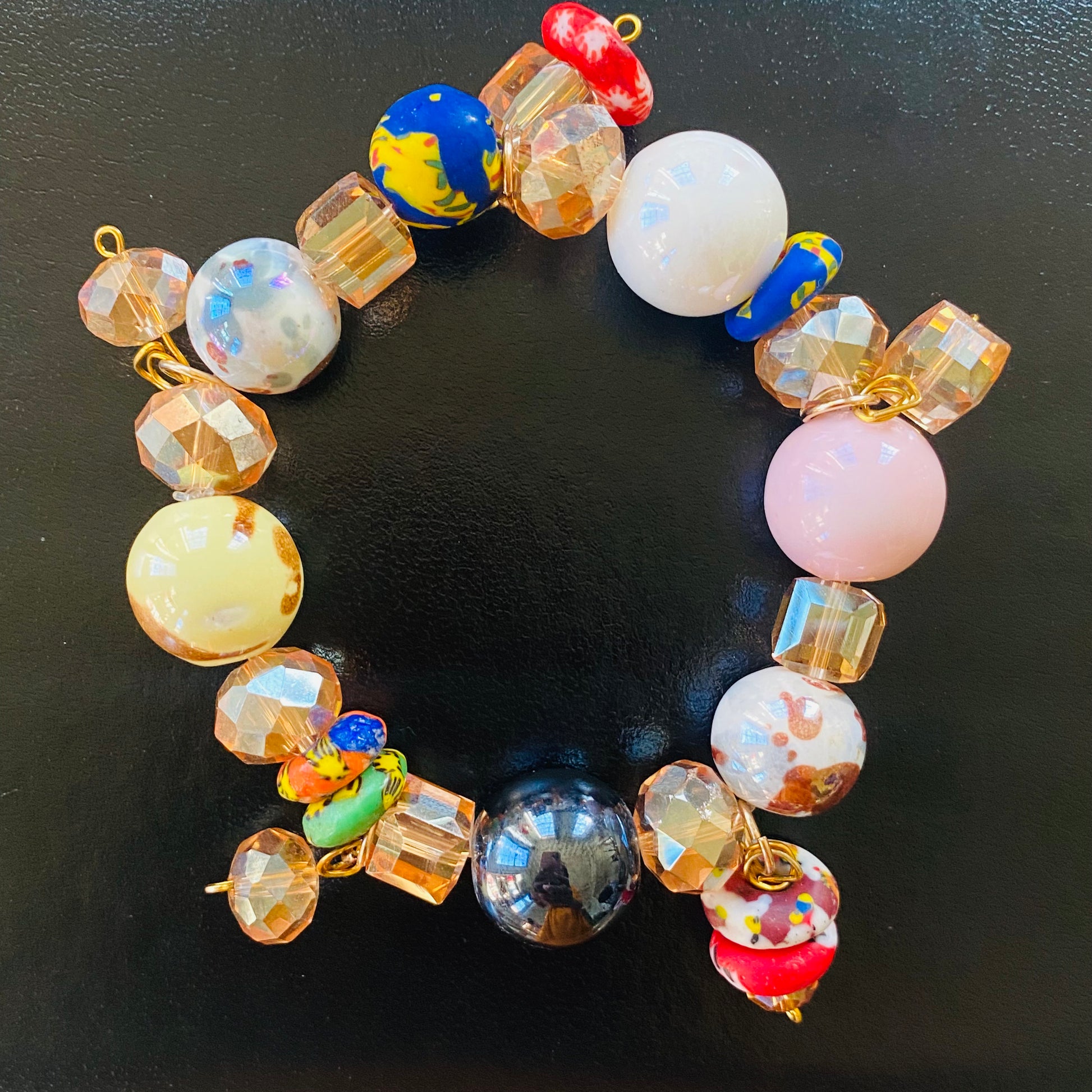 A pretty, classy, unique combination of a variety of ceramic and hand-painted African glass beads; accented with square and round crystal elements; adjustable; stretchy to fit all wrists; listing is for one bracelet.