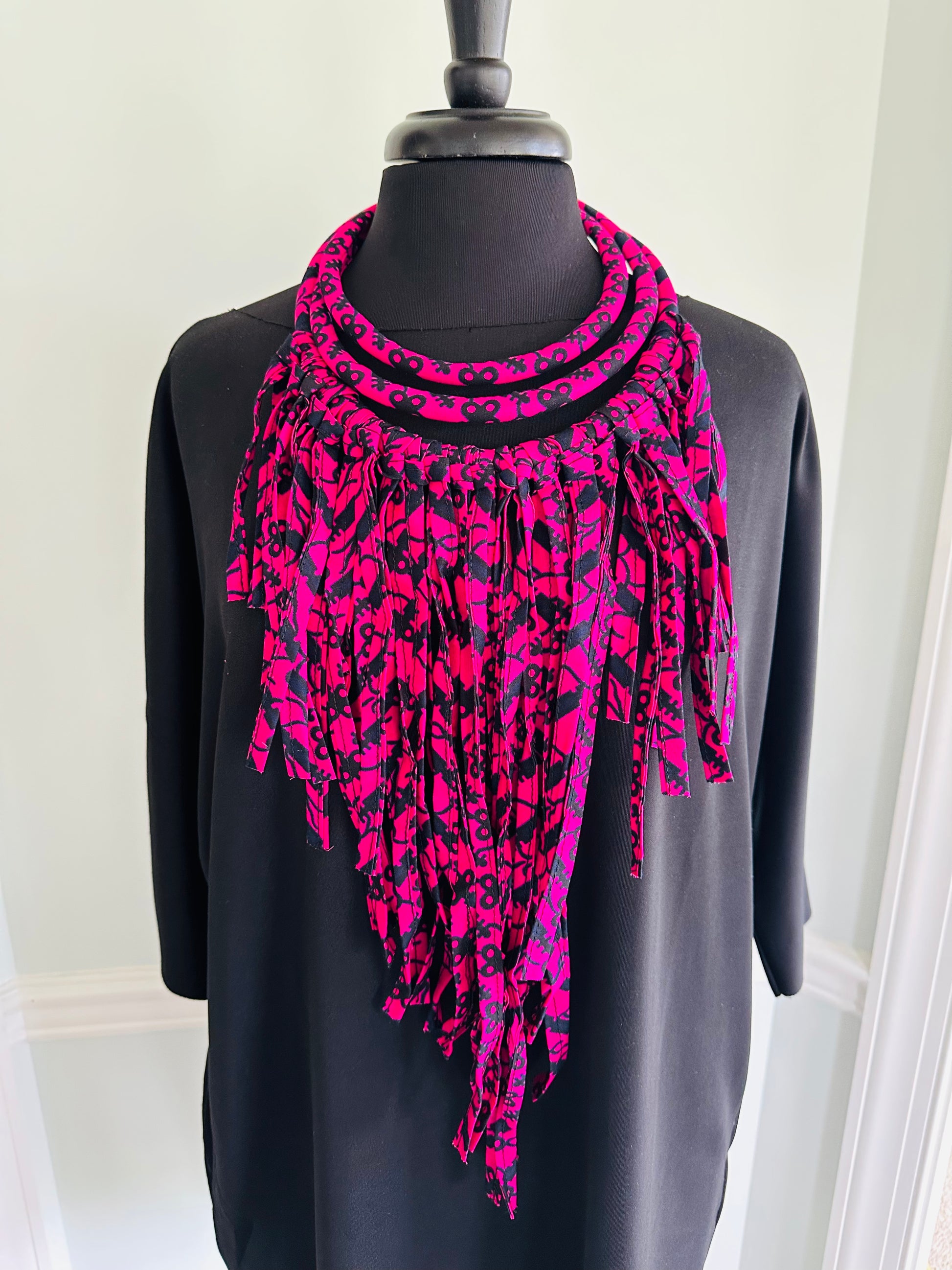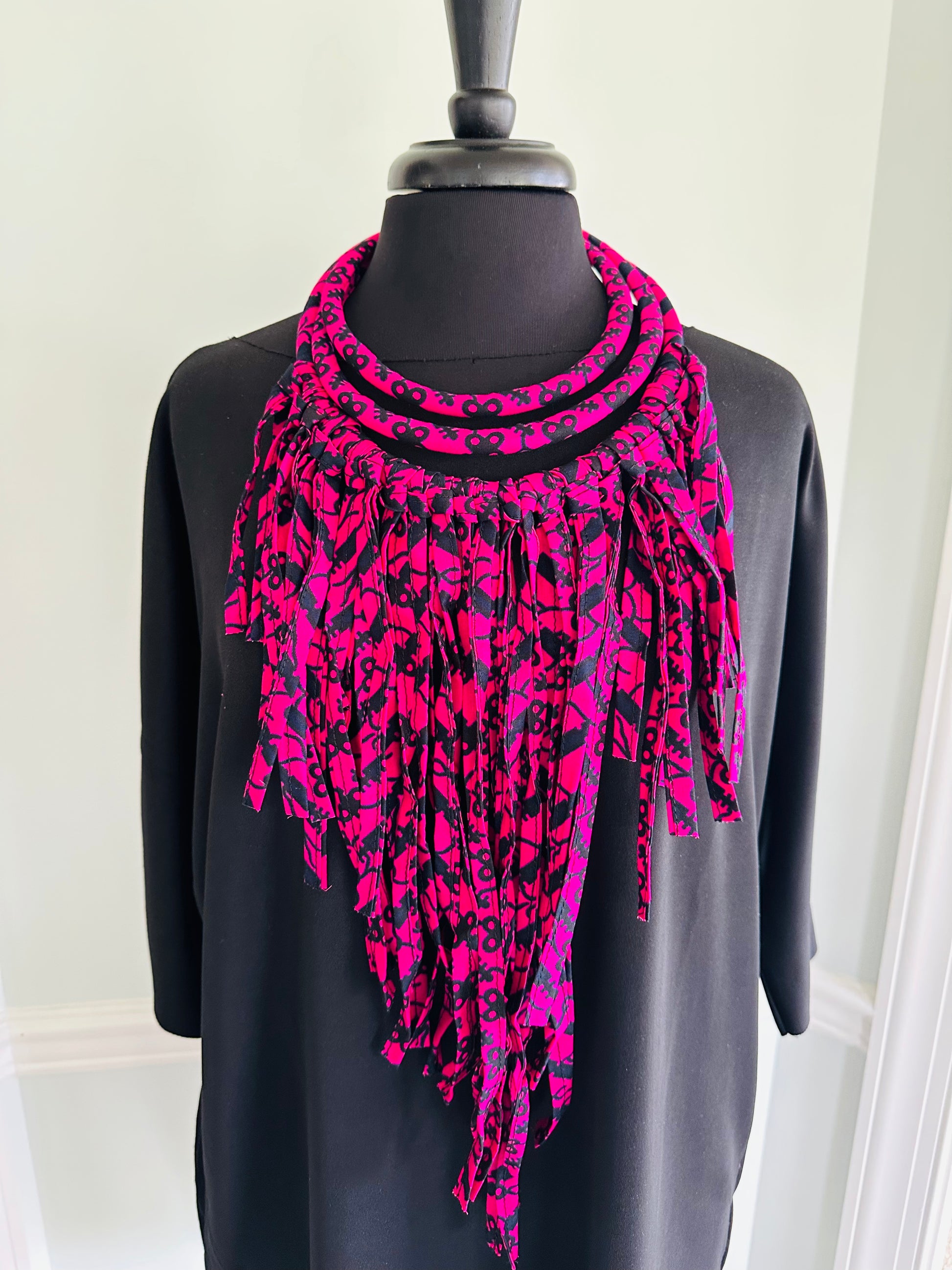 Authentic African fabric, artfully worked to create this unique masterpiece; adjustable tie closure to fit everyone; hangs to 27 inches; adjustable; make a one-of-a-kind statement.
