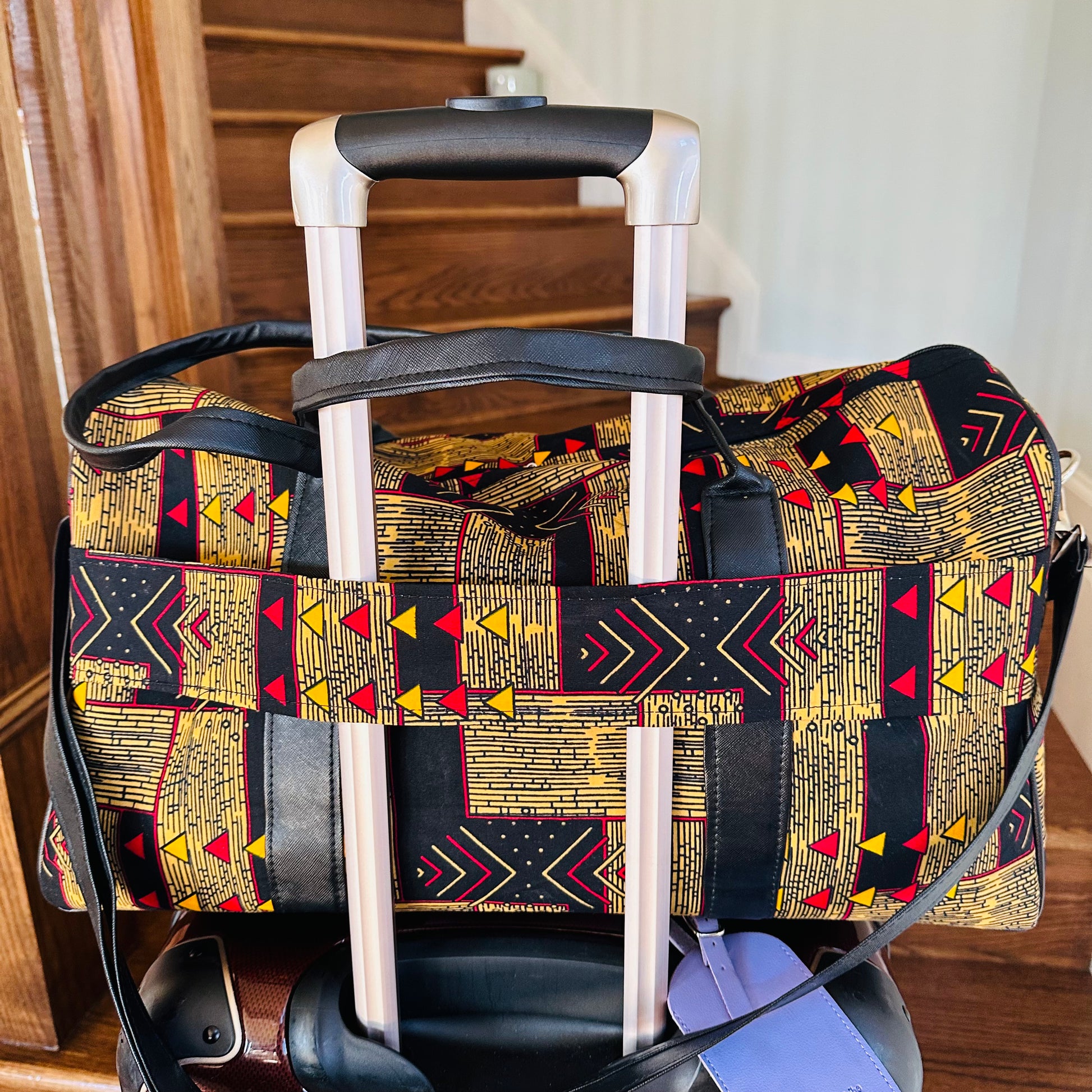 High quality Ankara fabric, fully lined with easy clean interior fabric; inside zipper pocket; double zipper top closure; top handles; detachable, adjustable long strap; folds flat for storage; sleeve on the back to slide over your suitcase handle for ease of navigating through these travel streets. Clever!