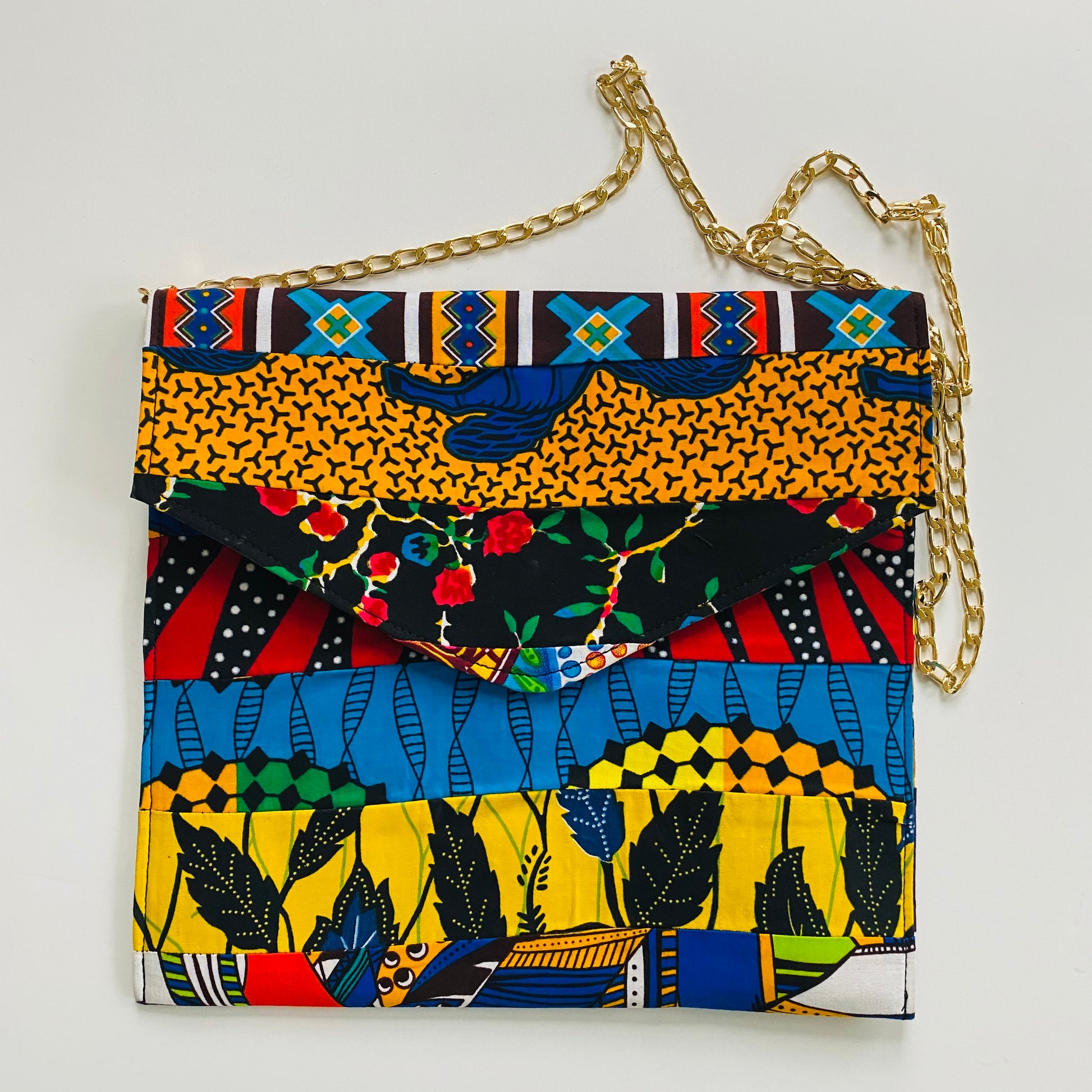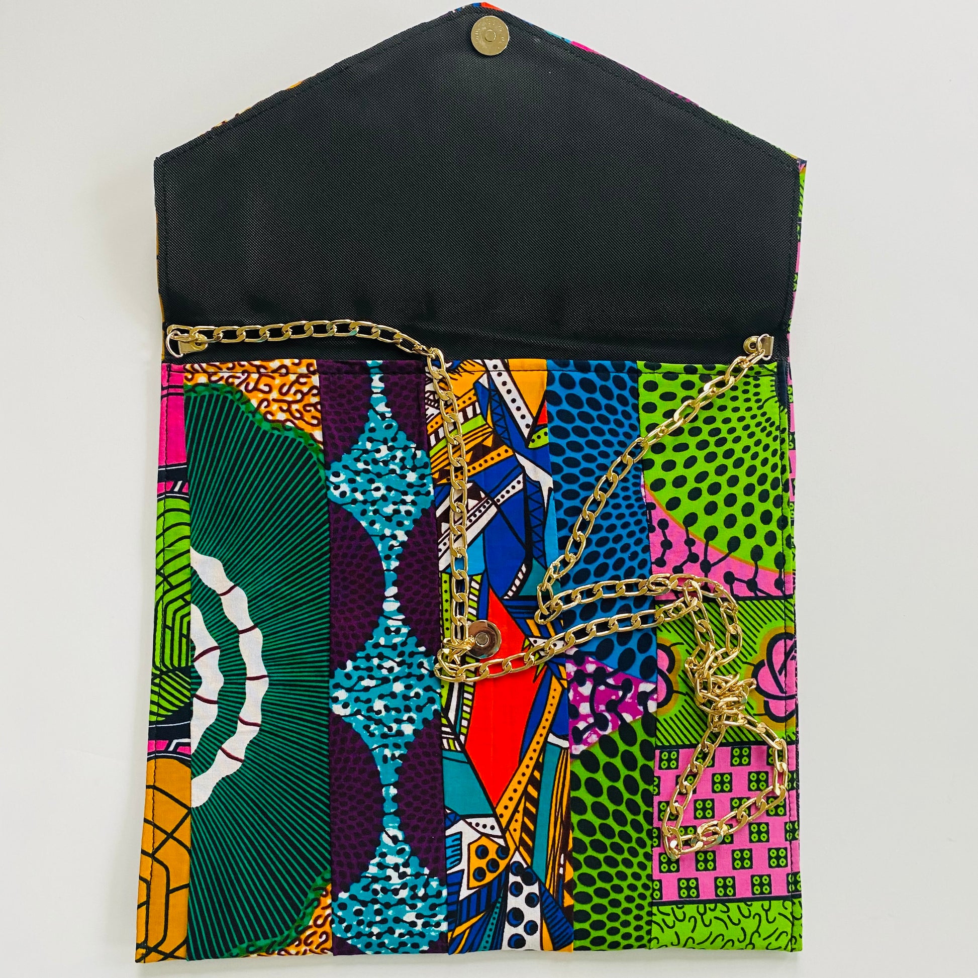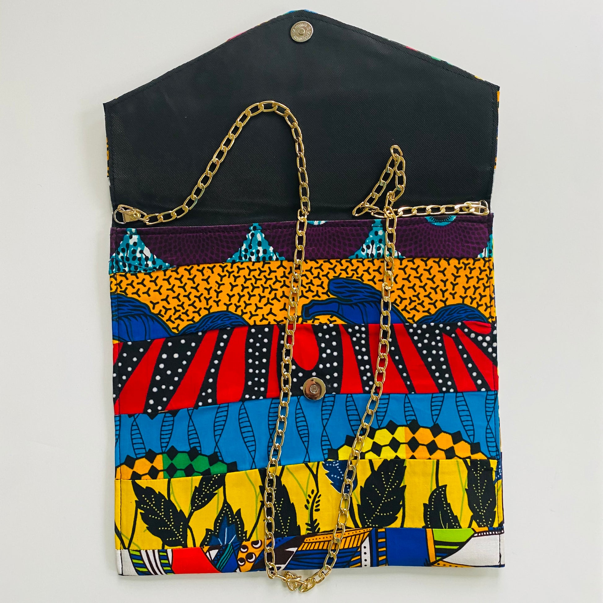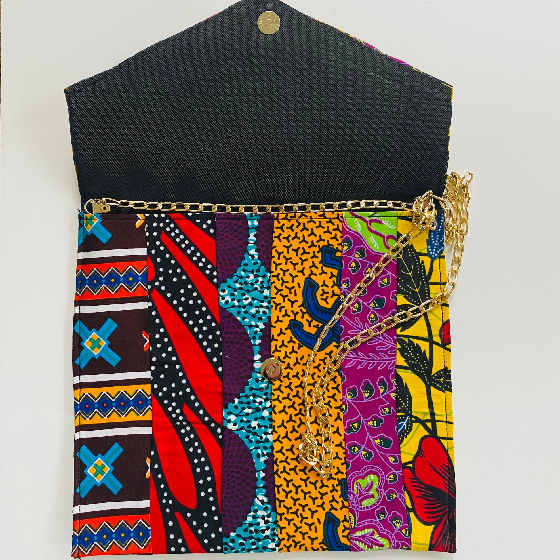 Beautiful, vibrant Ankara (African) print fabric, hand-patched, and stitched to perfection, to create this STUNNING work of art; this piece is absolutely gorgeous; deep inside to hold all the things you want to carry out with you; snap button closure; chain shoulder/crossbody strap. Each clutch is unique in the colors and placement of the fabric patches; no 2 are alike. They’re all stunning.