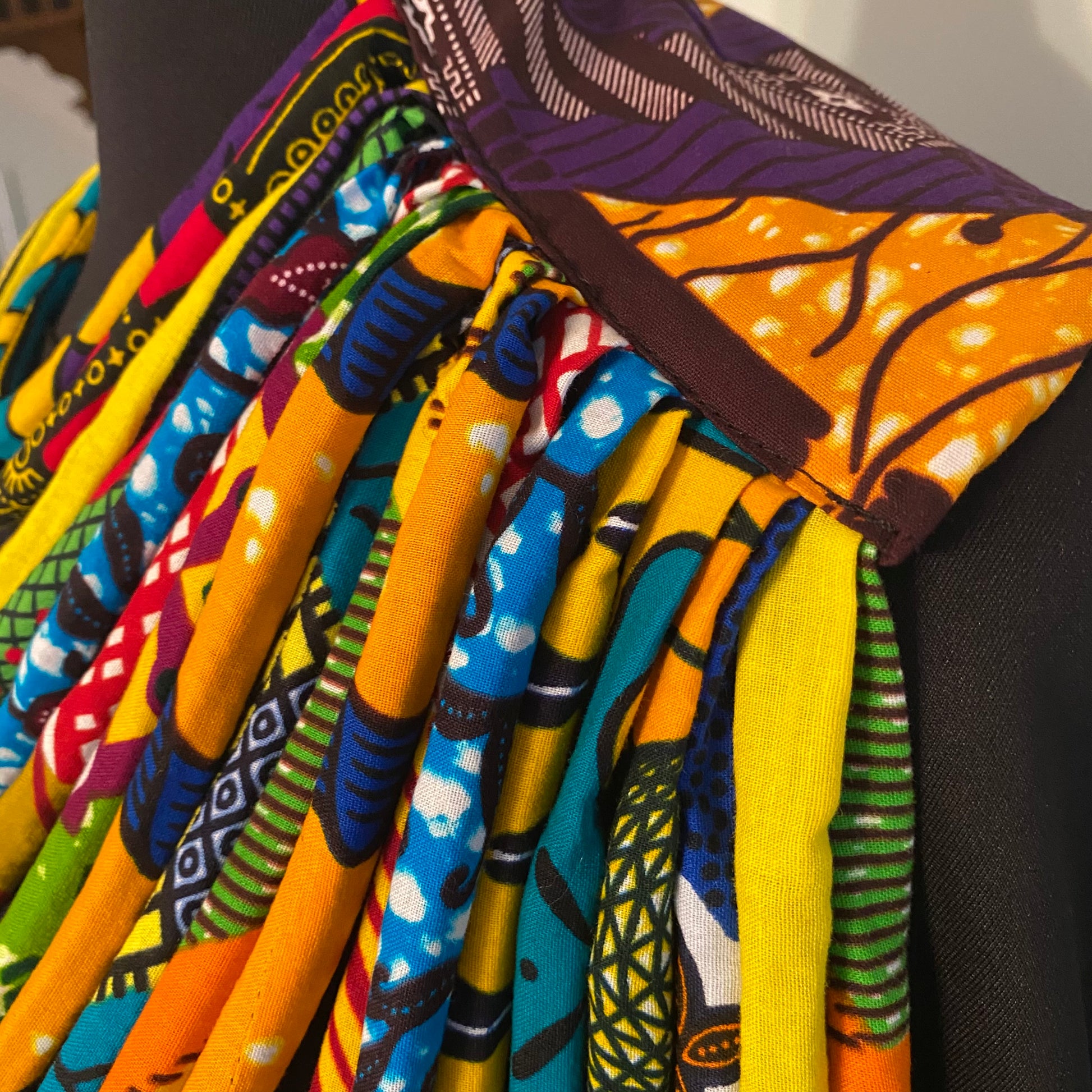 Variety of African print fabric rolled into tubing to create this GODDESS of a statement piece; this is not your regular, average piece; clients love how it fits, sits and makes them feel; glide wherever you go, Sis., because you’ll feel like the woman of substance that you are in this masterpiece; it’s truly a WOW statement necklace.