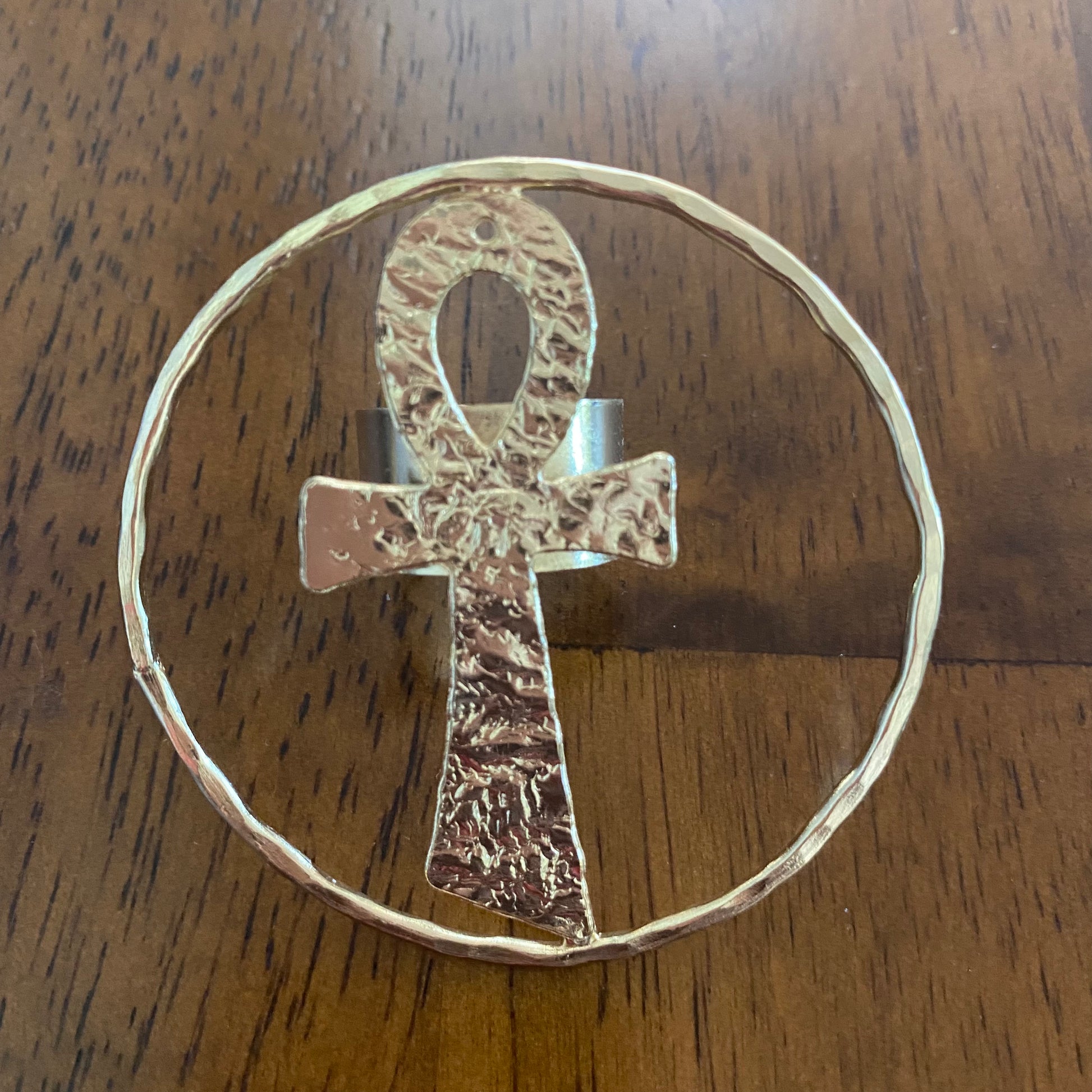 The Ankh in Brass, encapsulated by a circle; clever work of art; adjustable; 2 inch tall circle; make a bold statement; pairs well with our other brass pieces.