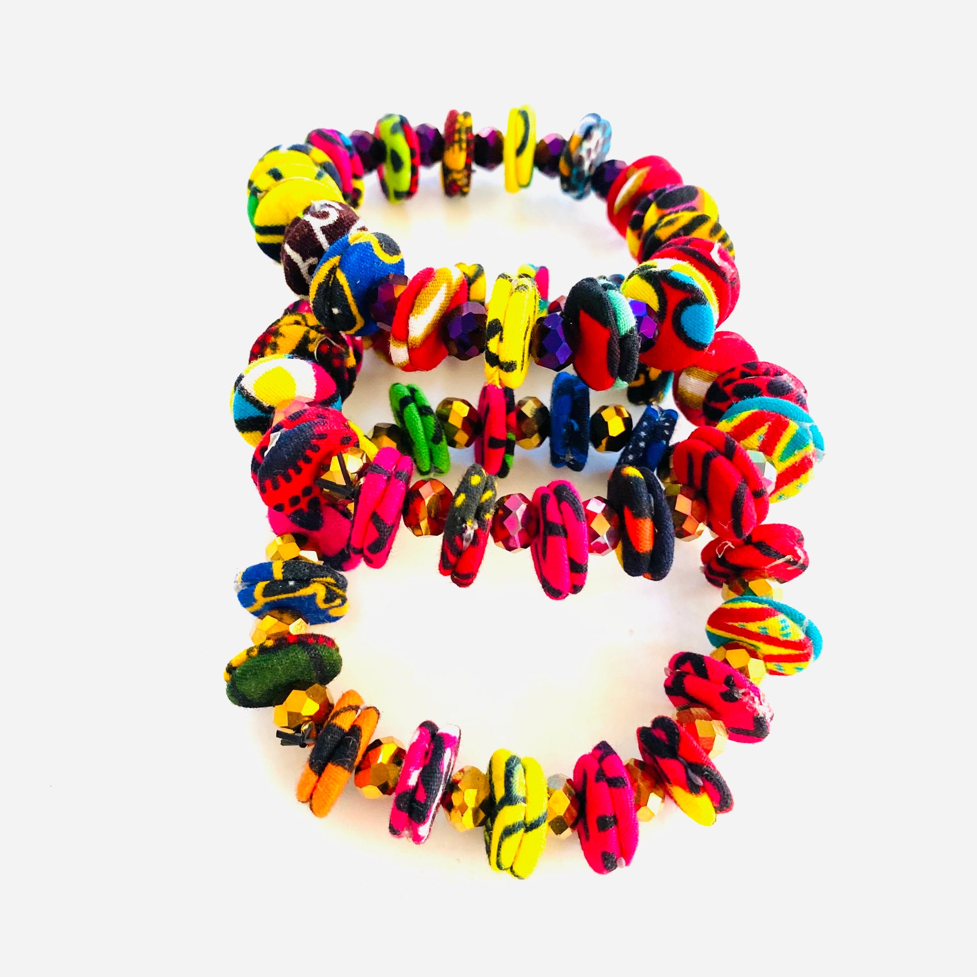 African print covered buttons, cleverly placed to create this simple yet chic bracelet; pairs well with our Button necklaces; stretchy; curvy wrist friendly.