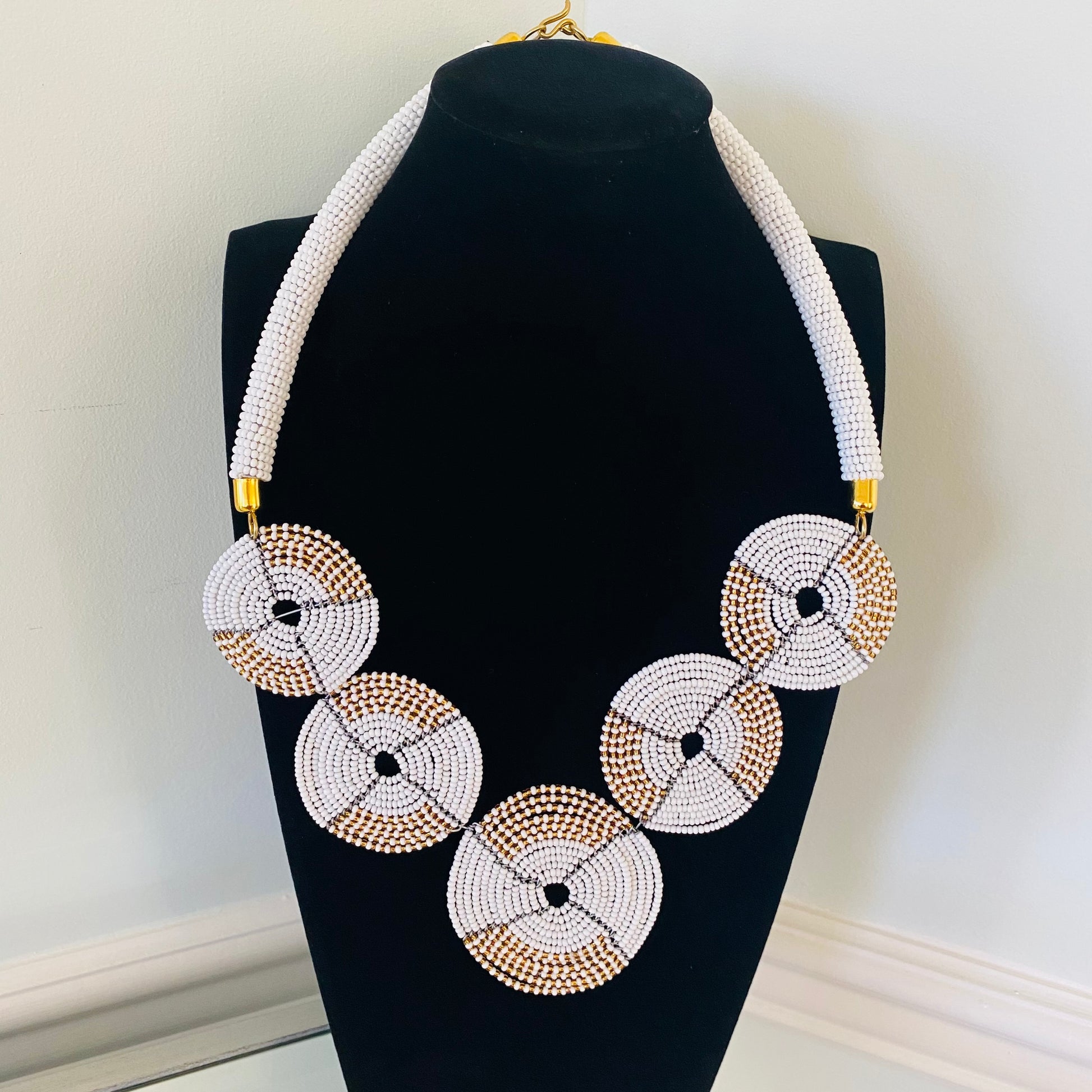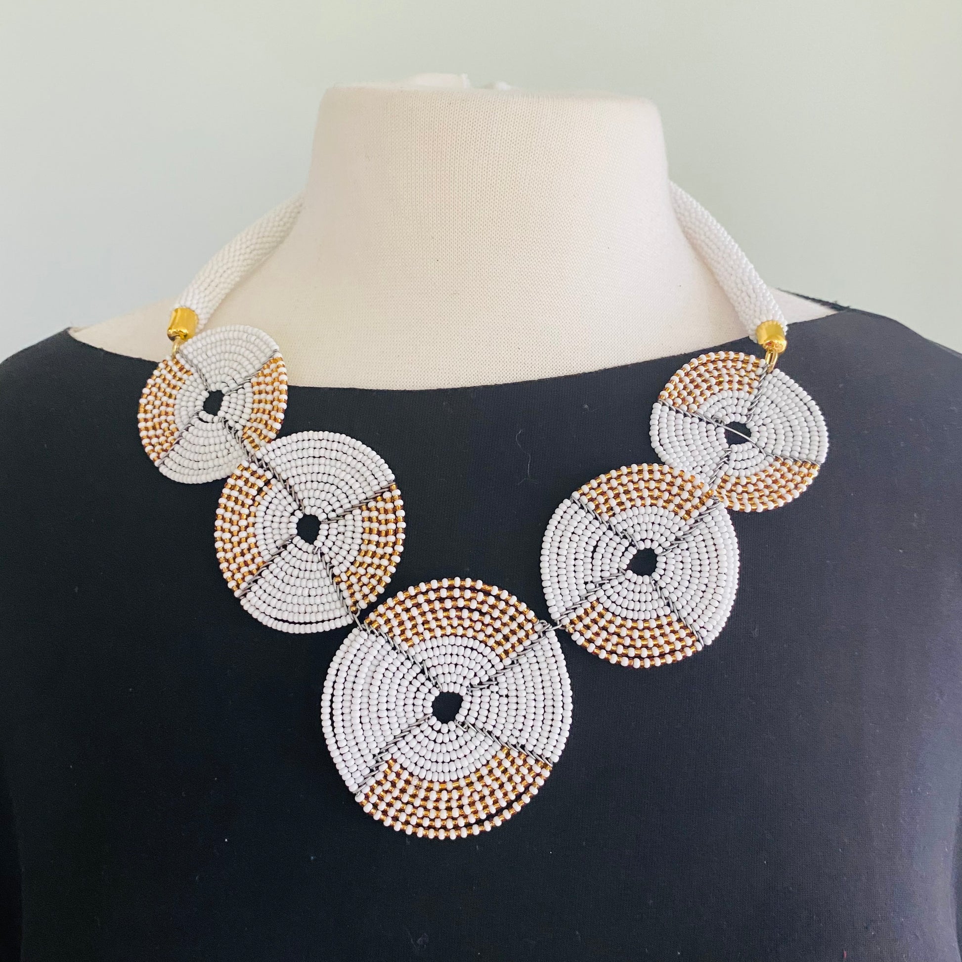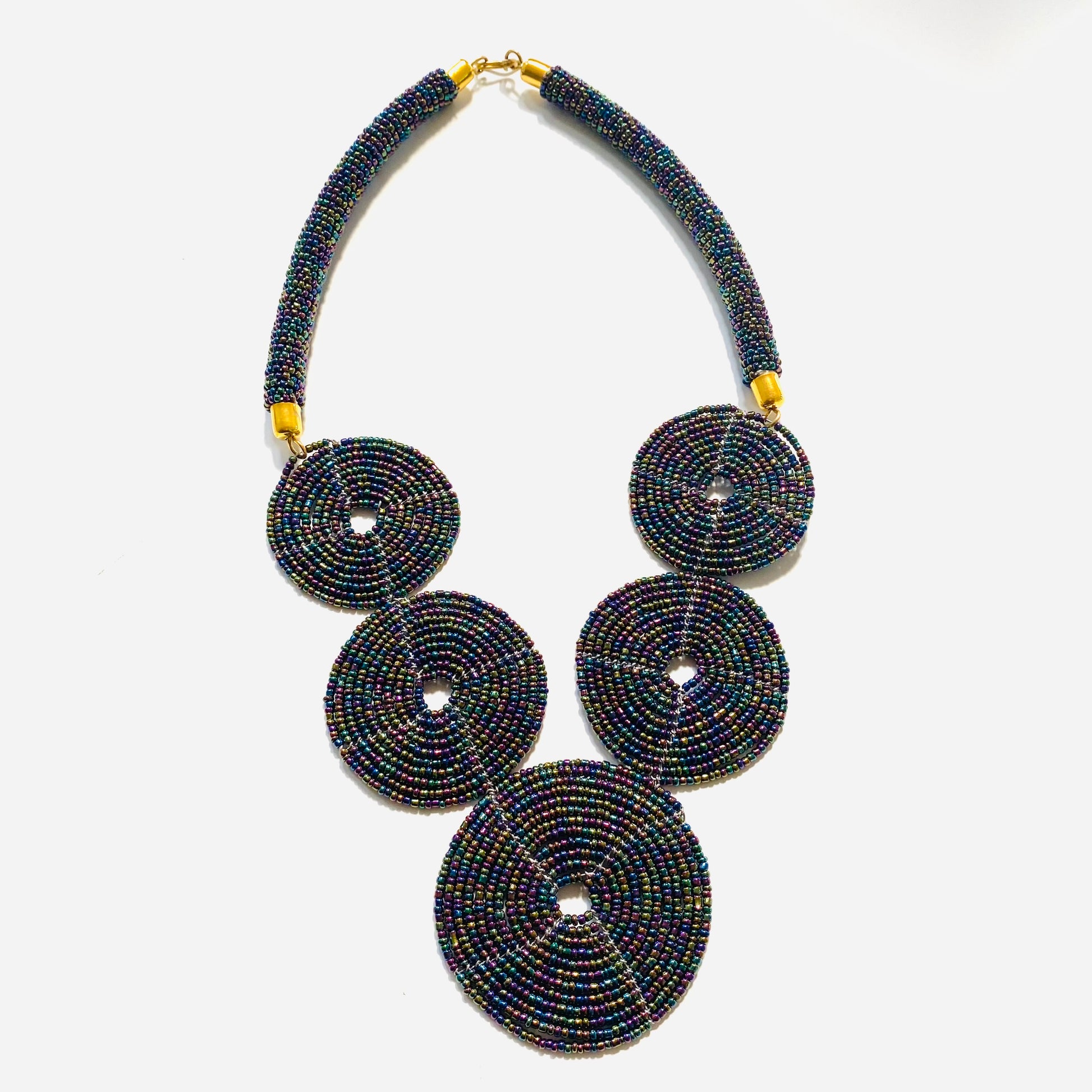 African beads molded into circles that remind us of this life that we live; life is a circle; we take the good and bad, and use it to the best of our ability; office friendly piece; chain extension available upon request.