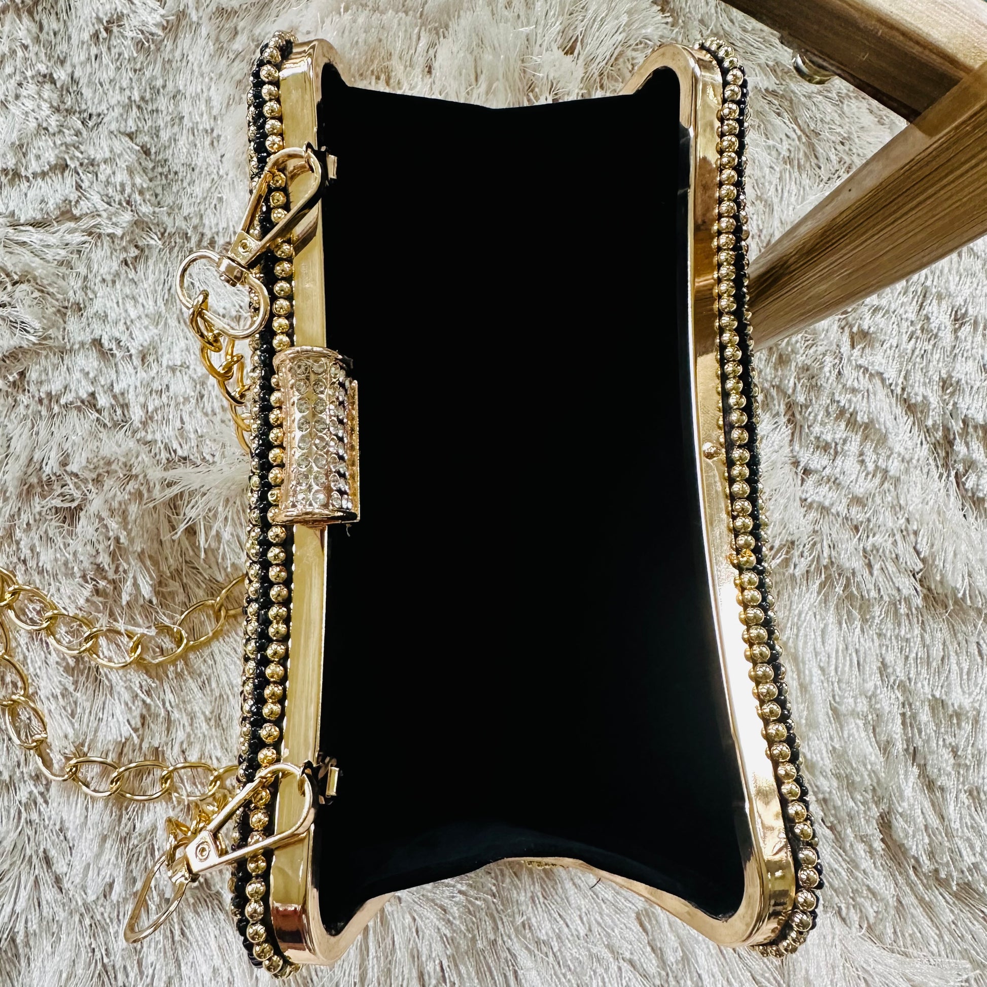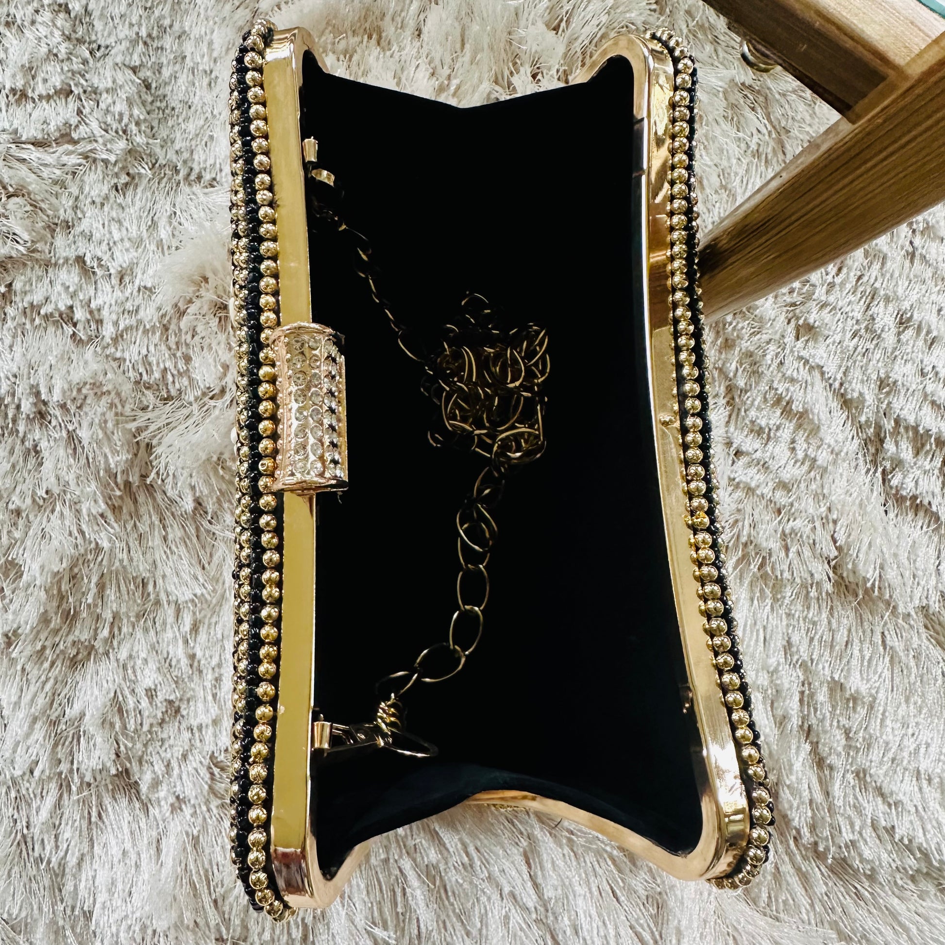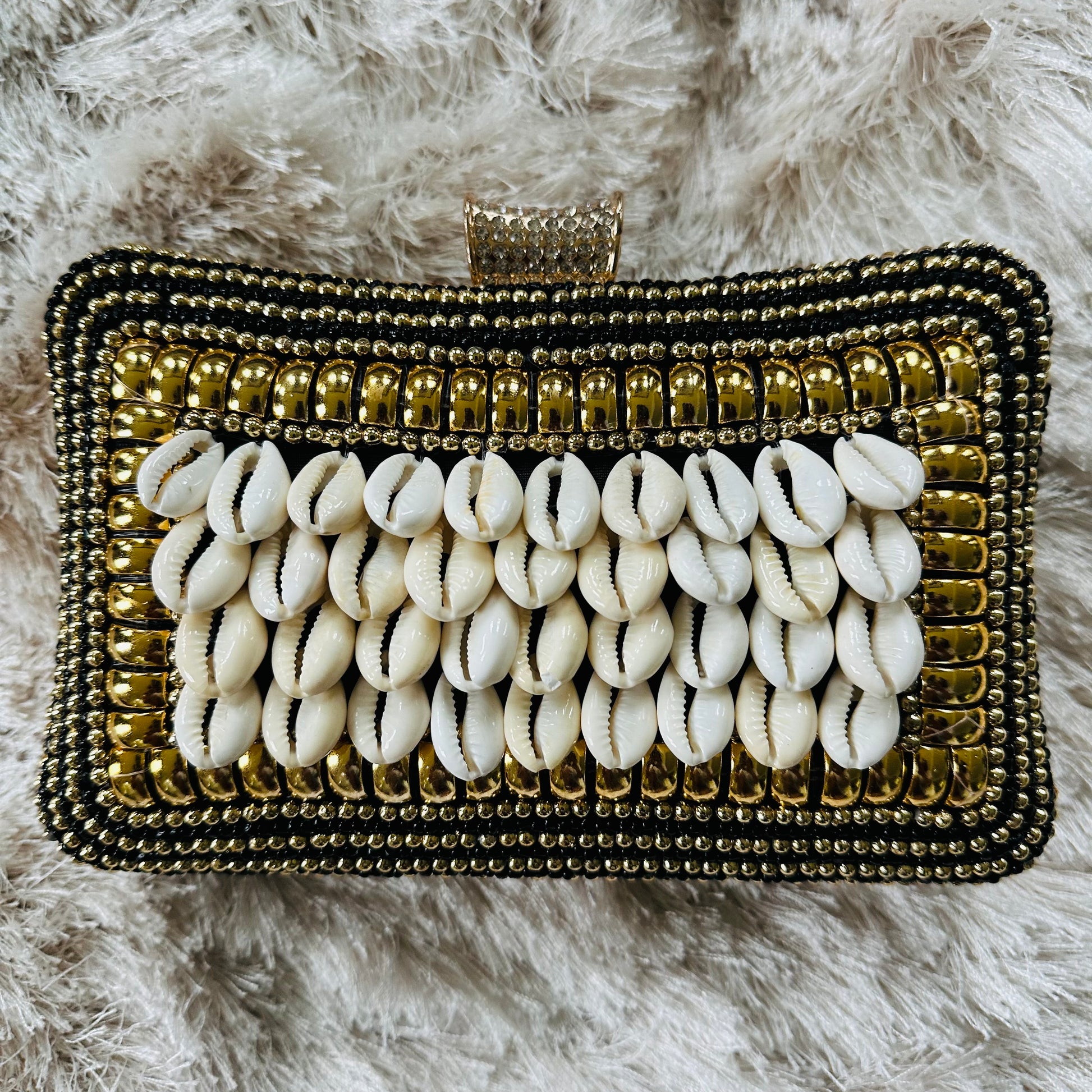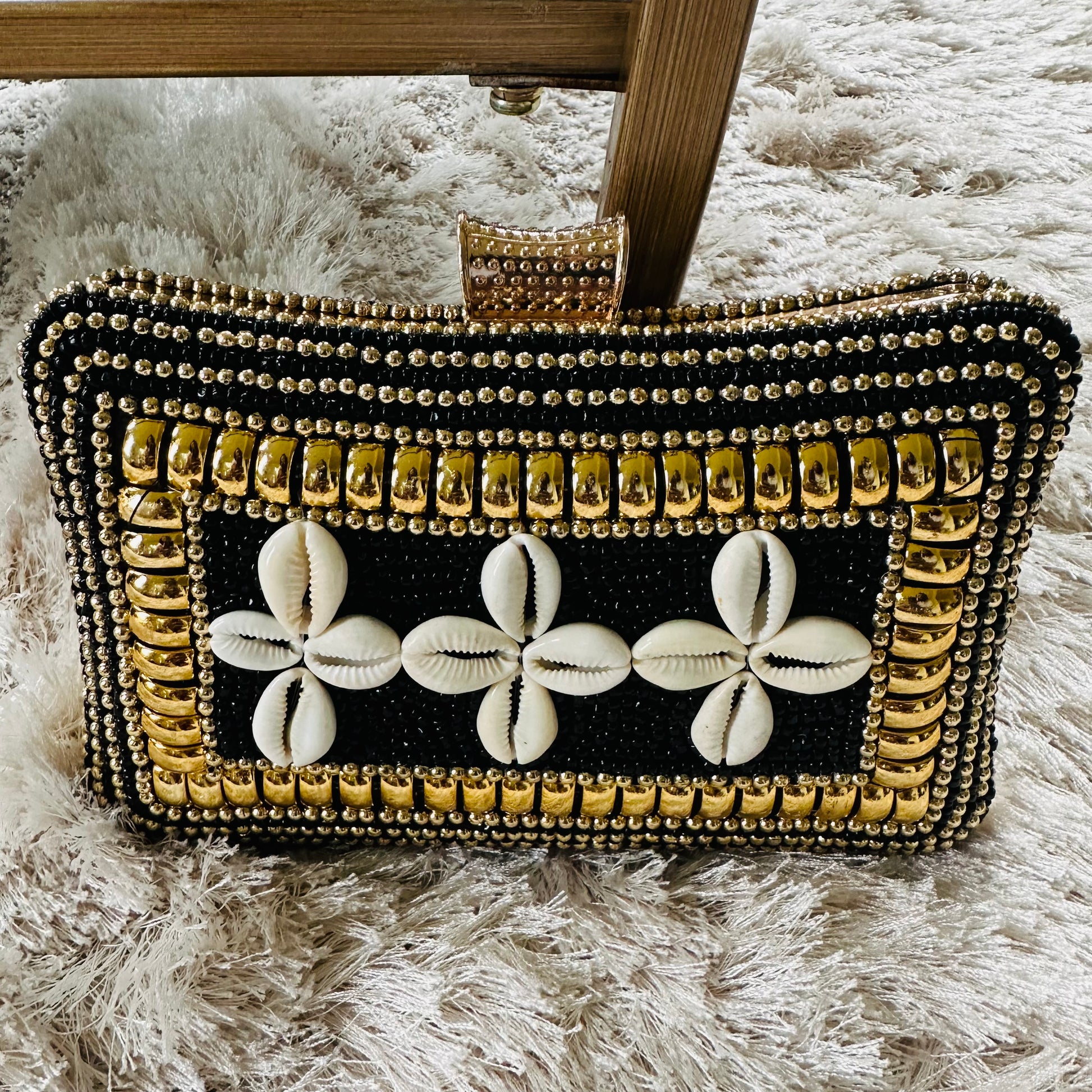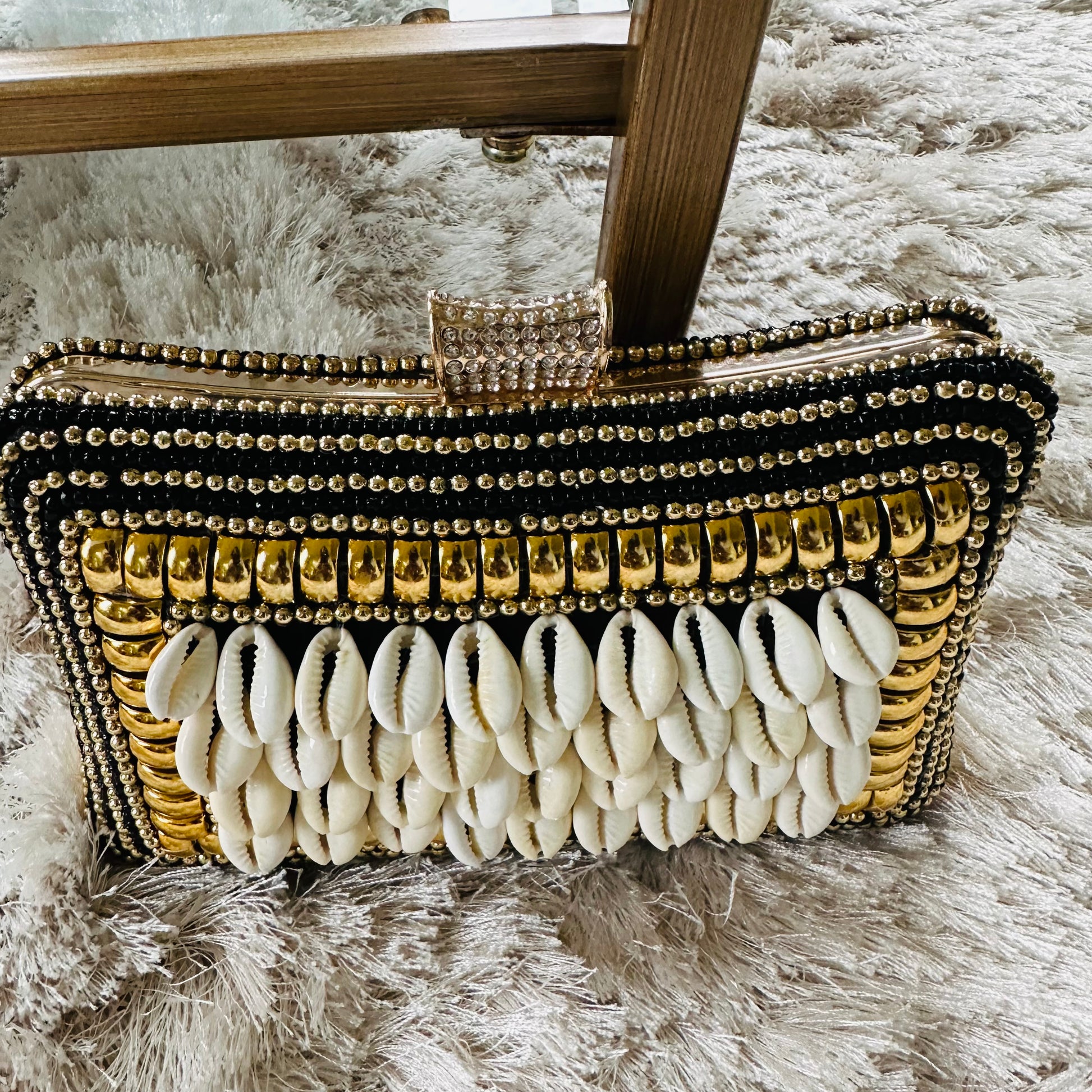 A stunning Clutch that’s guaranteed to be a showstopper; each side has a different cowrie shells design; removable chain strap; can be worn crossbody, on the shoulder or as a clutch; turn all the heads, Sis!