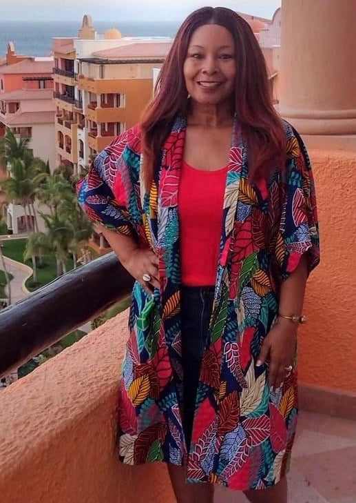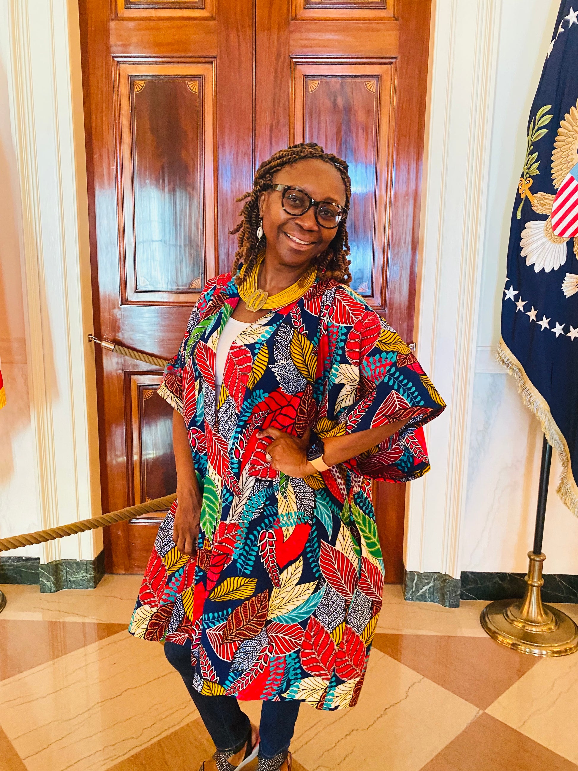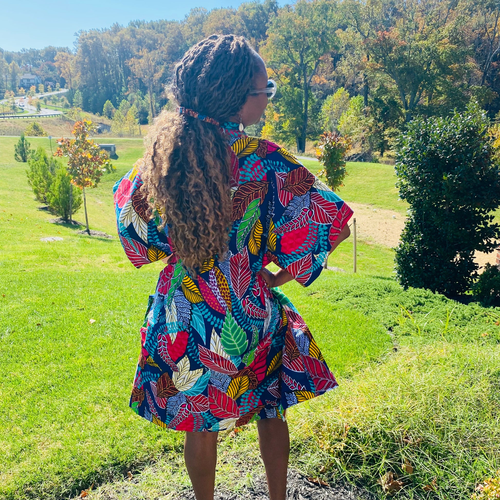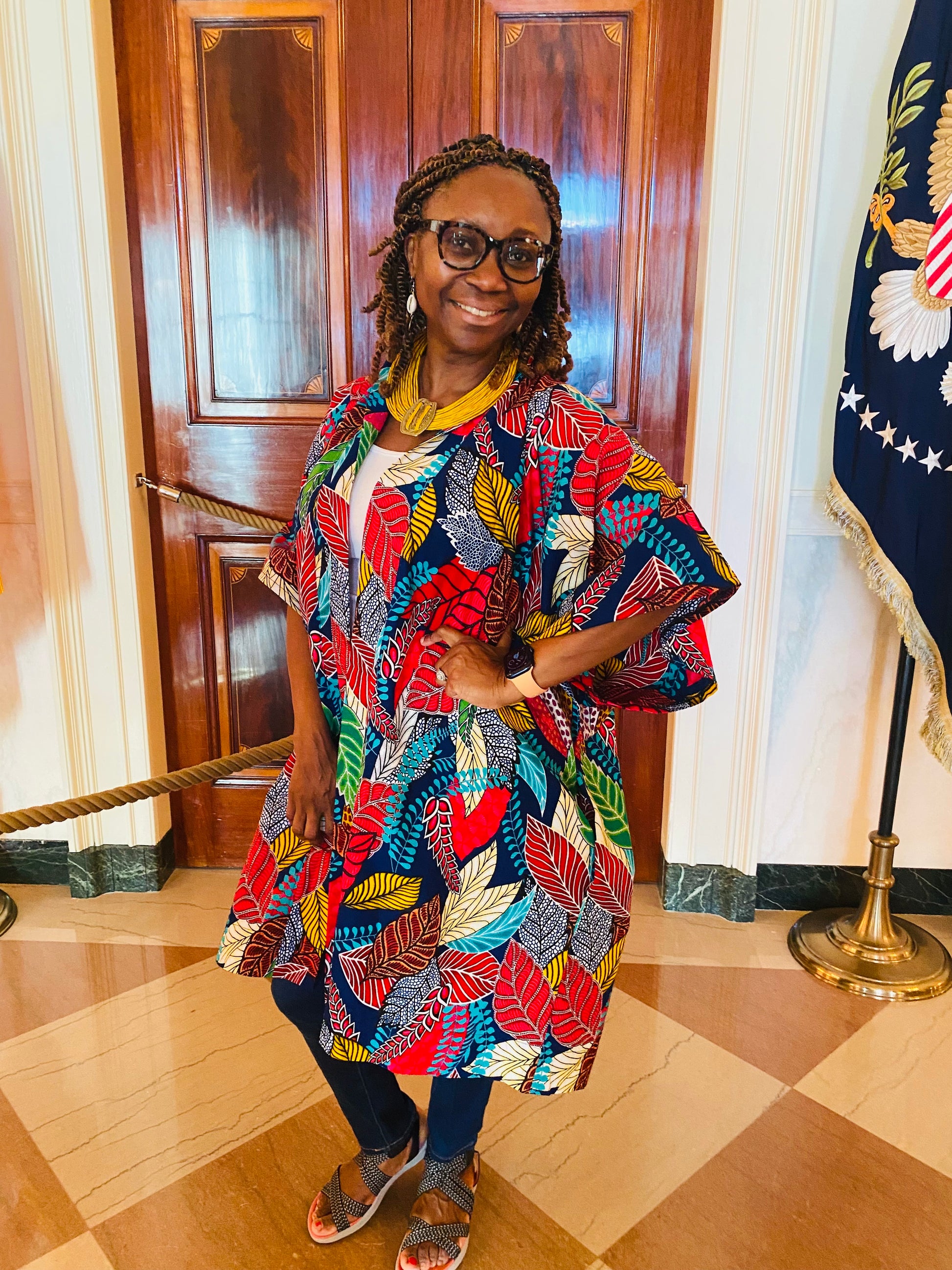 African print fabric; deep pockets; open front; Kimono sleeves; 42 inches long; knee length; wear a belt and leave it open as a style idea; model is 5’2” and is wearing a small; model normally wears a size 4 or 6.