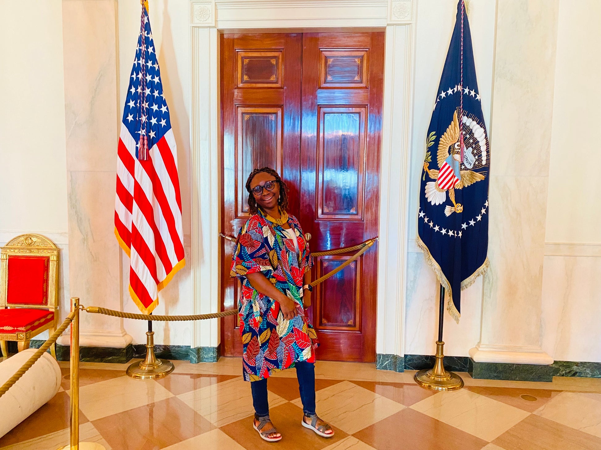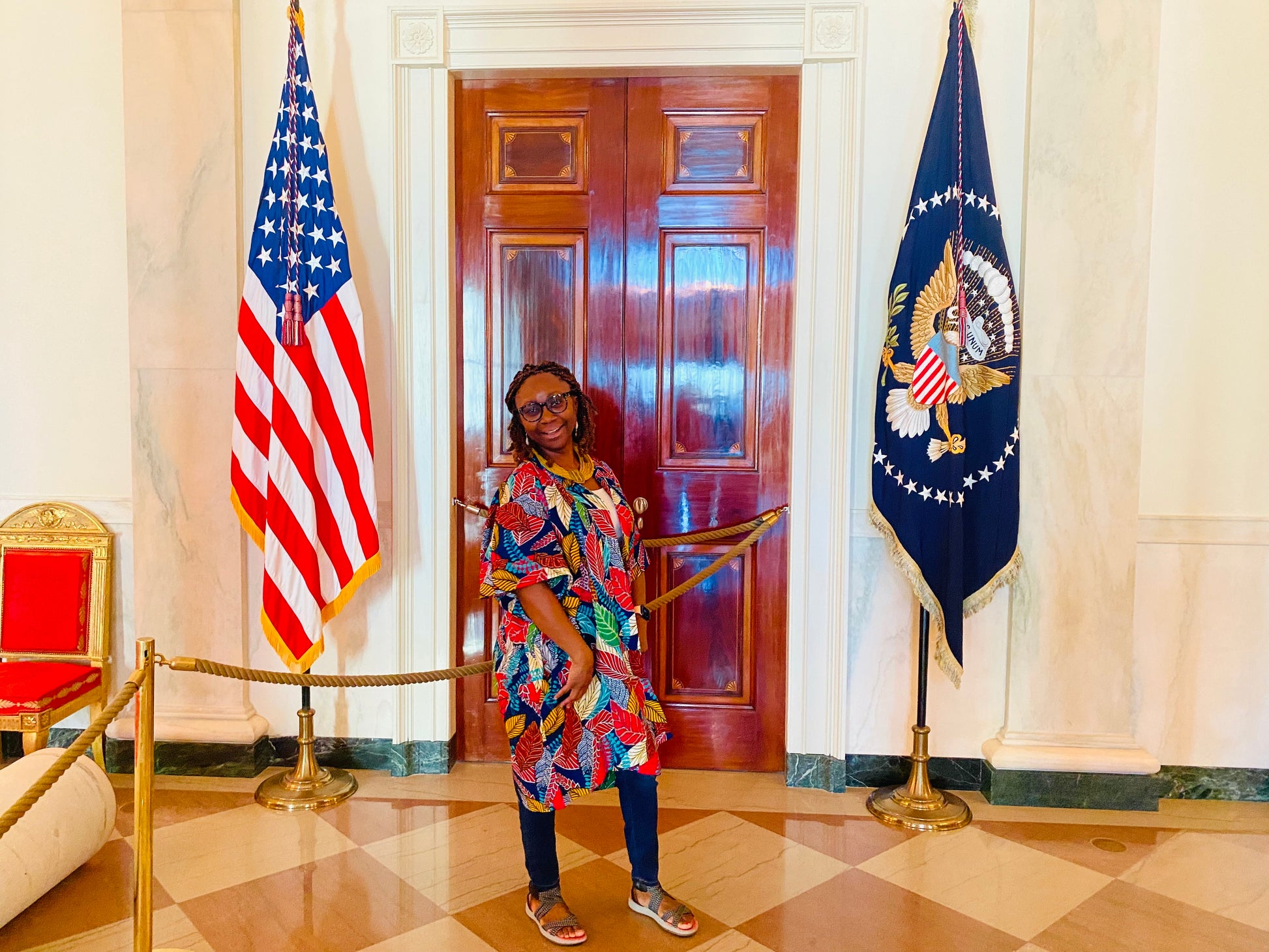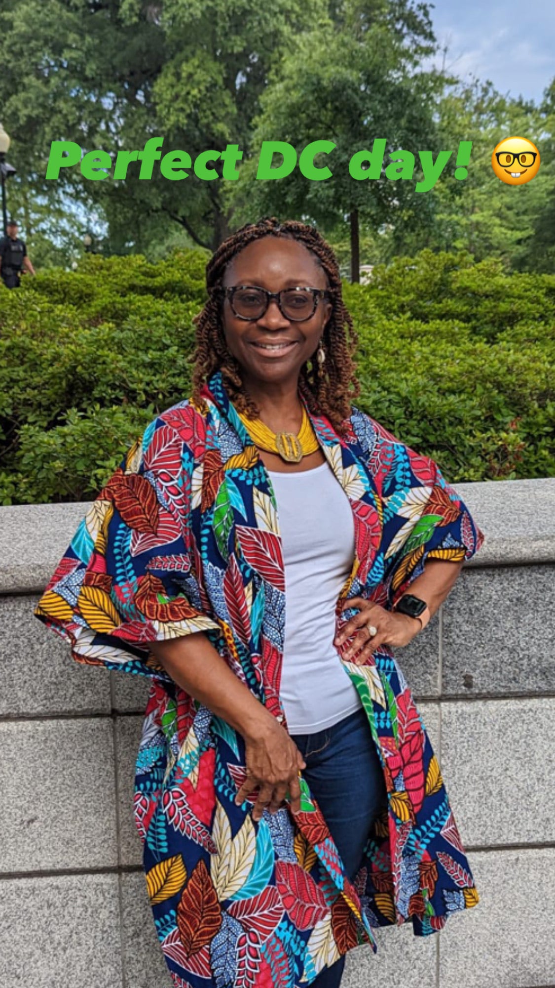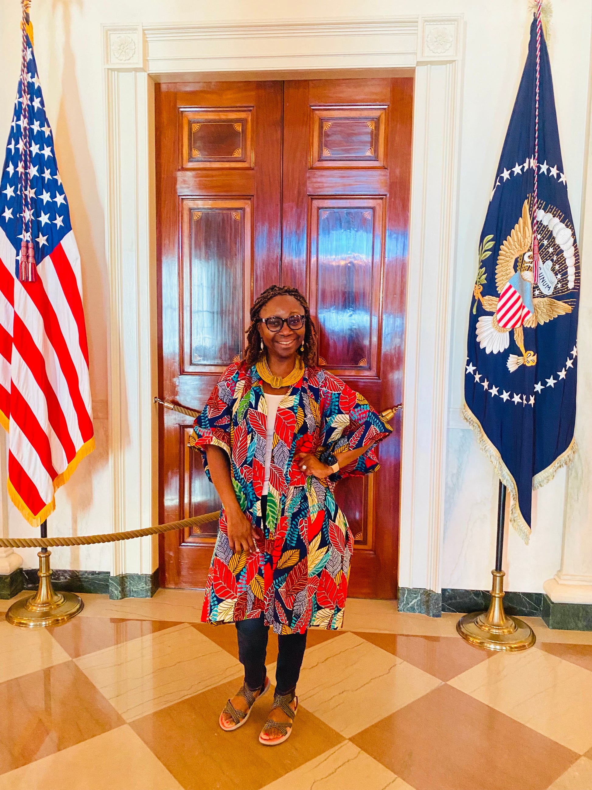 African print fabric; deep pockets; open front; Kimono sleeves; 42 inches long; knee length; wear a belt and leave it open as a style idea; model is 5’2” and is wearing a small; model normally wears a size 4 or 6.