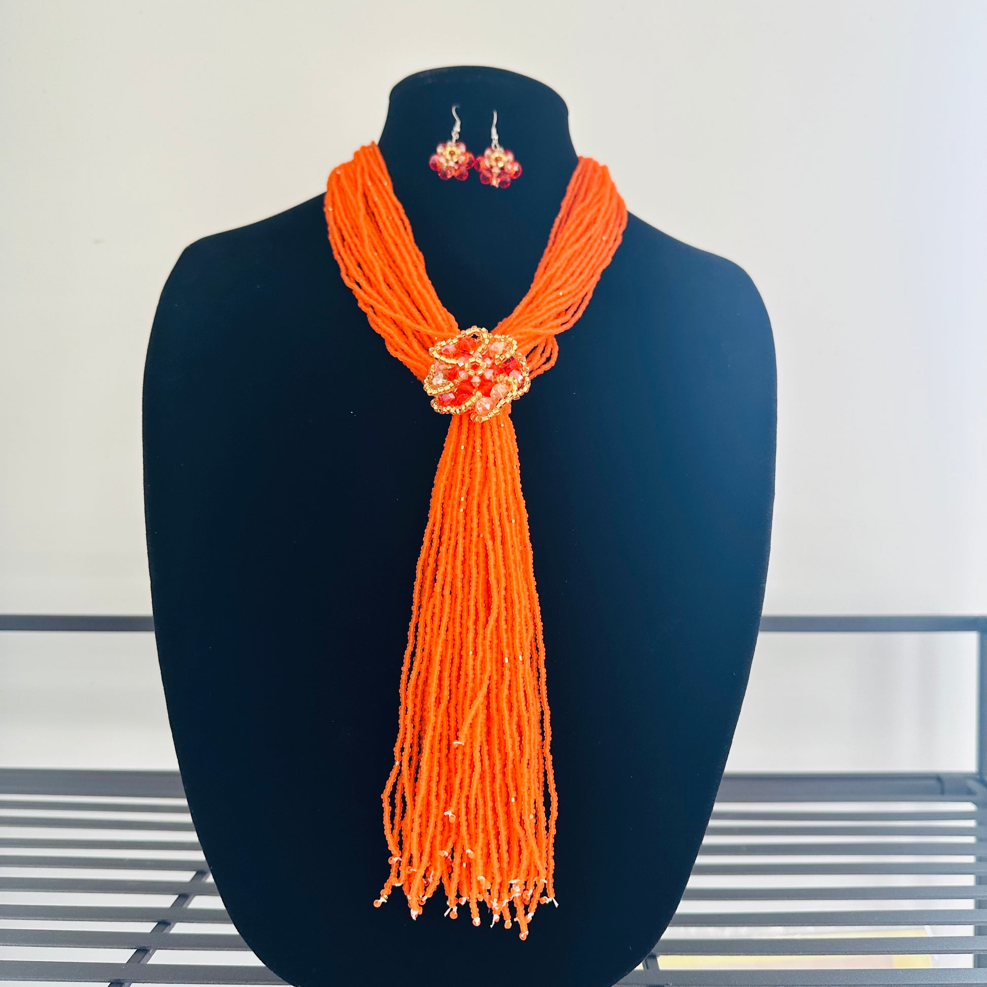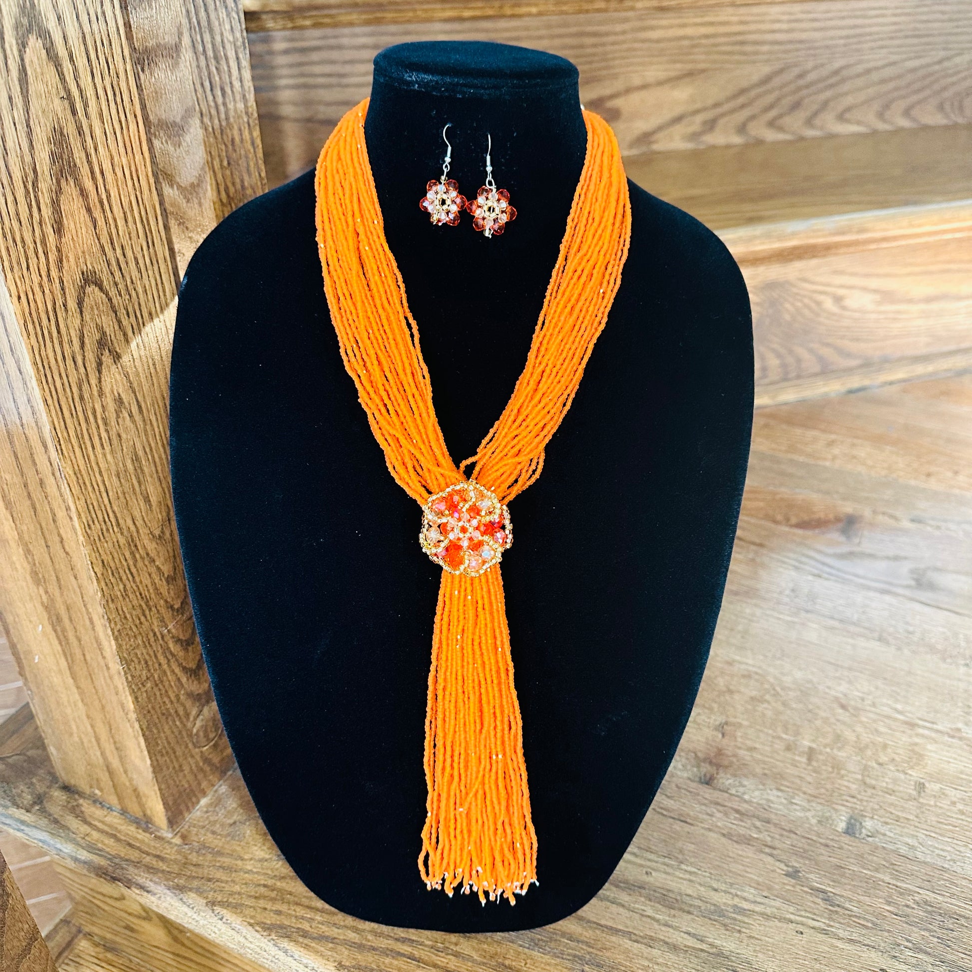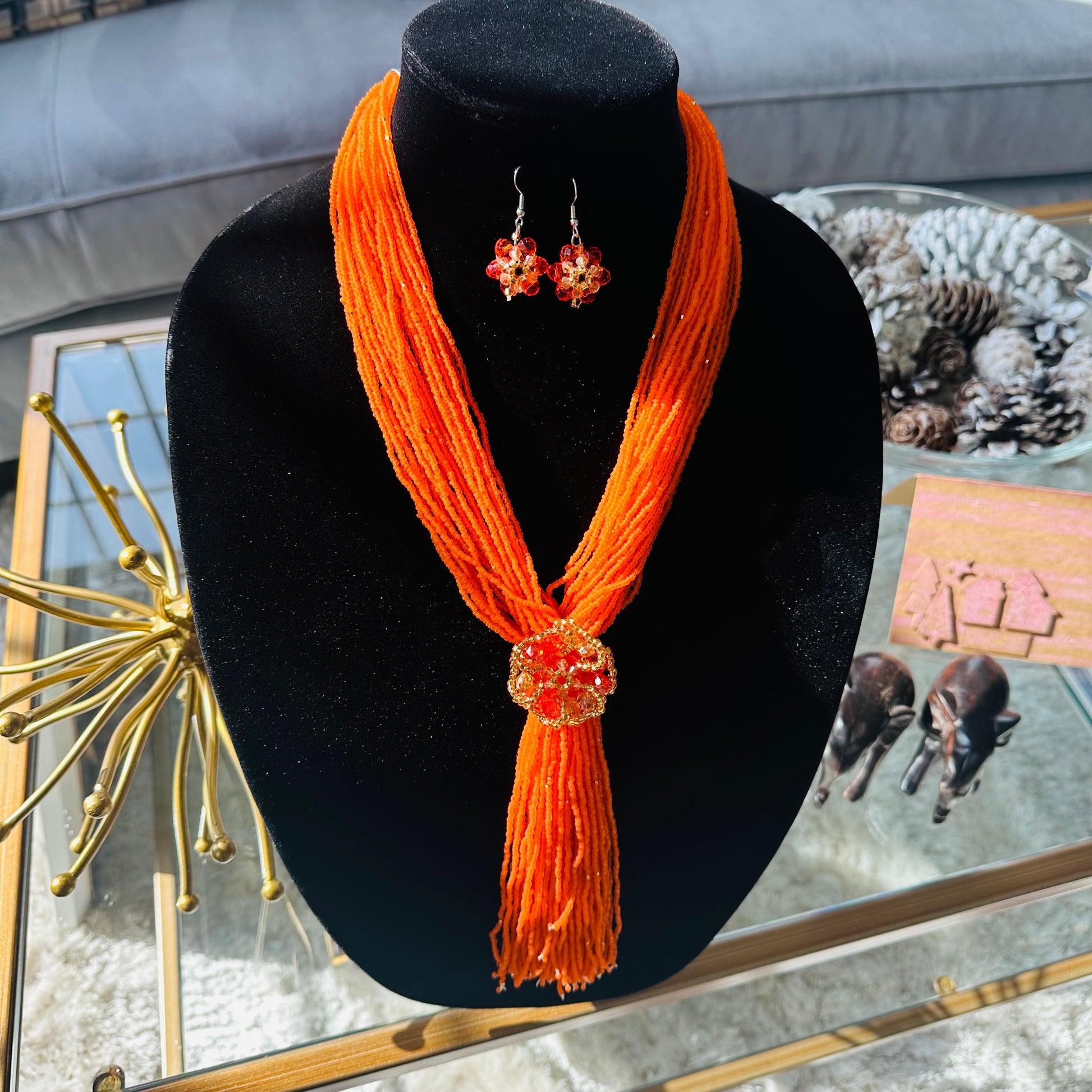 Authentic African beading, expertly crafted for your adornment and styling; hangs to 18.5 inches from neck; adjustable; lobster clasp closure; comes with earrings.