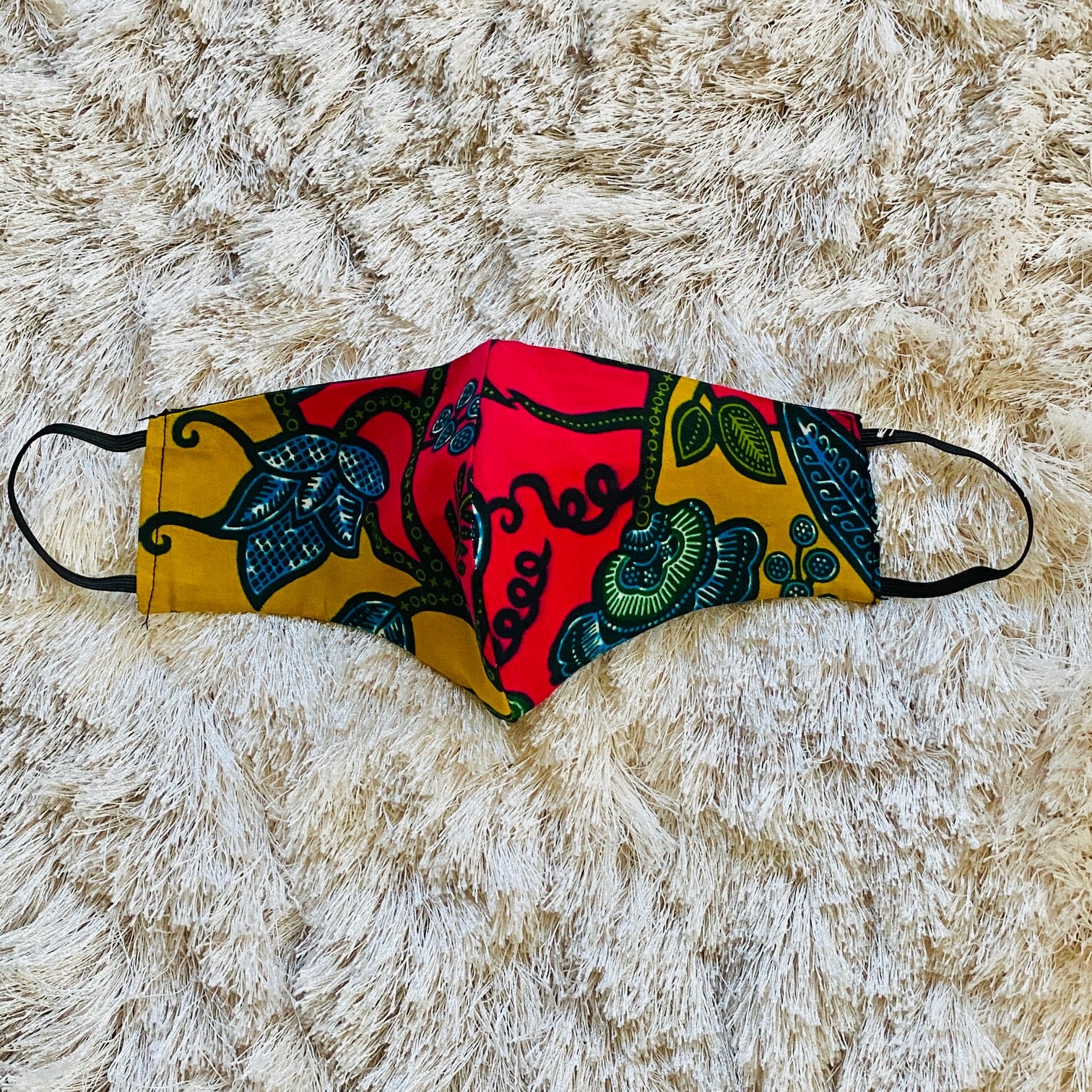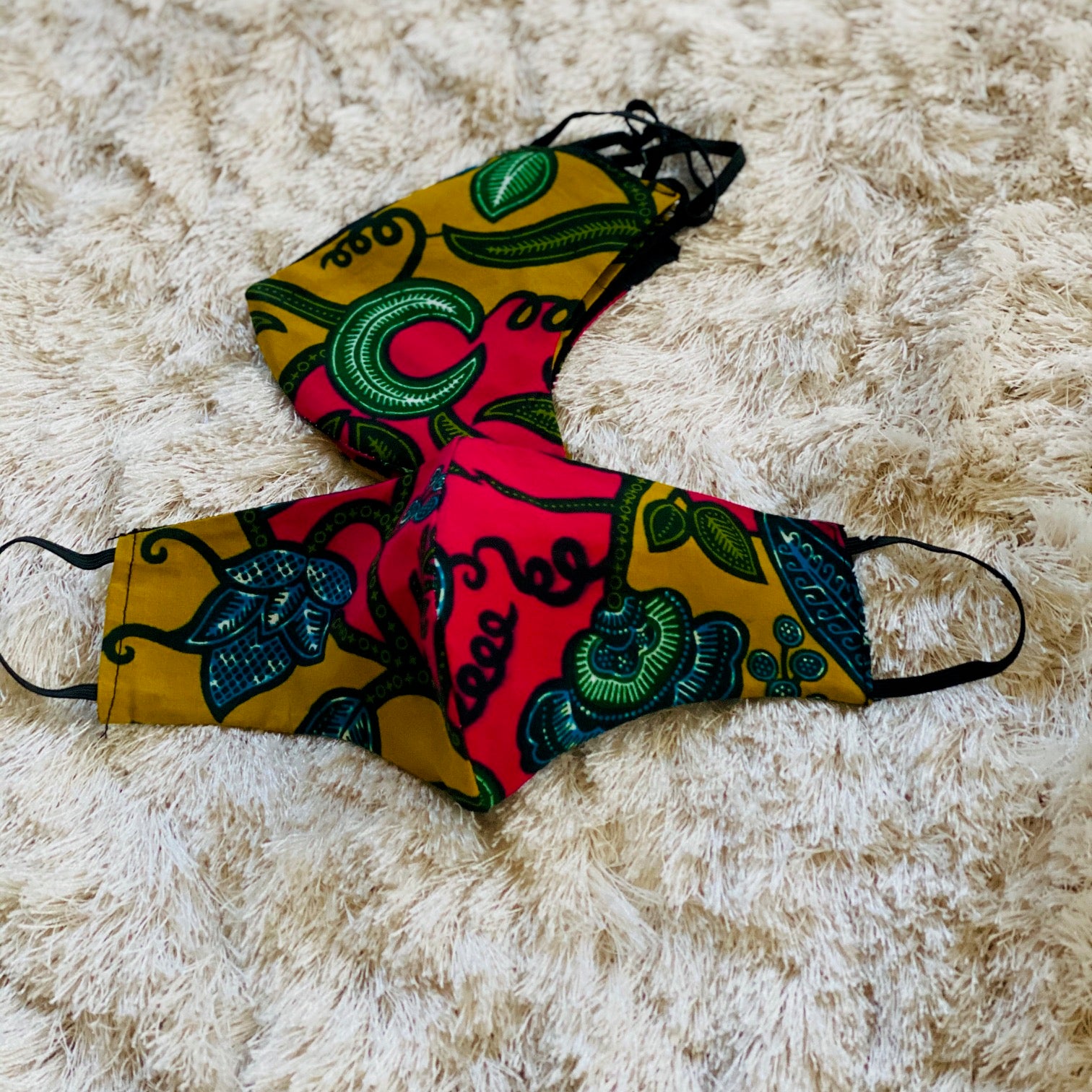 Handmade African print masks. Breathable quality 100% cotton, double-layered, non-surgical, soft elastic ear loops. This mask does not have pockets for filters.