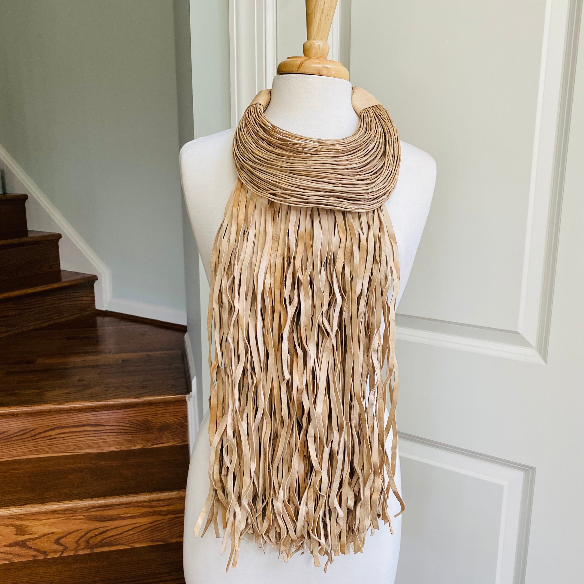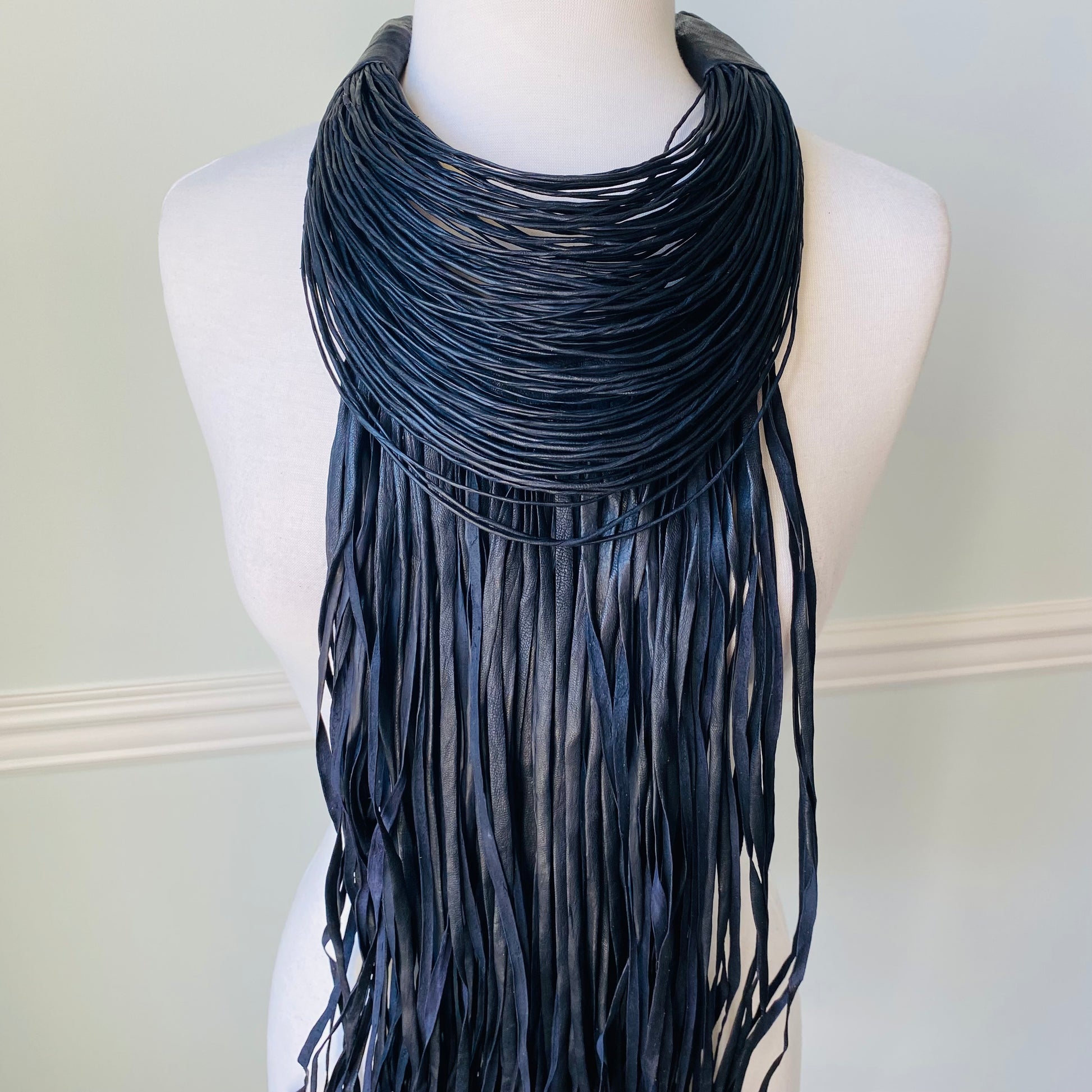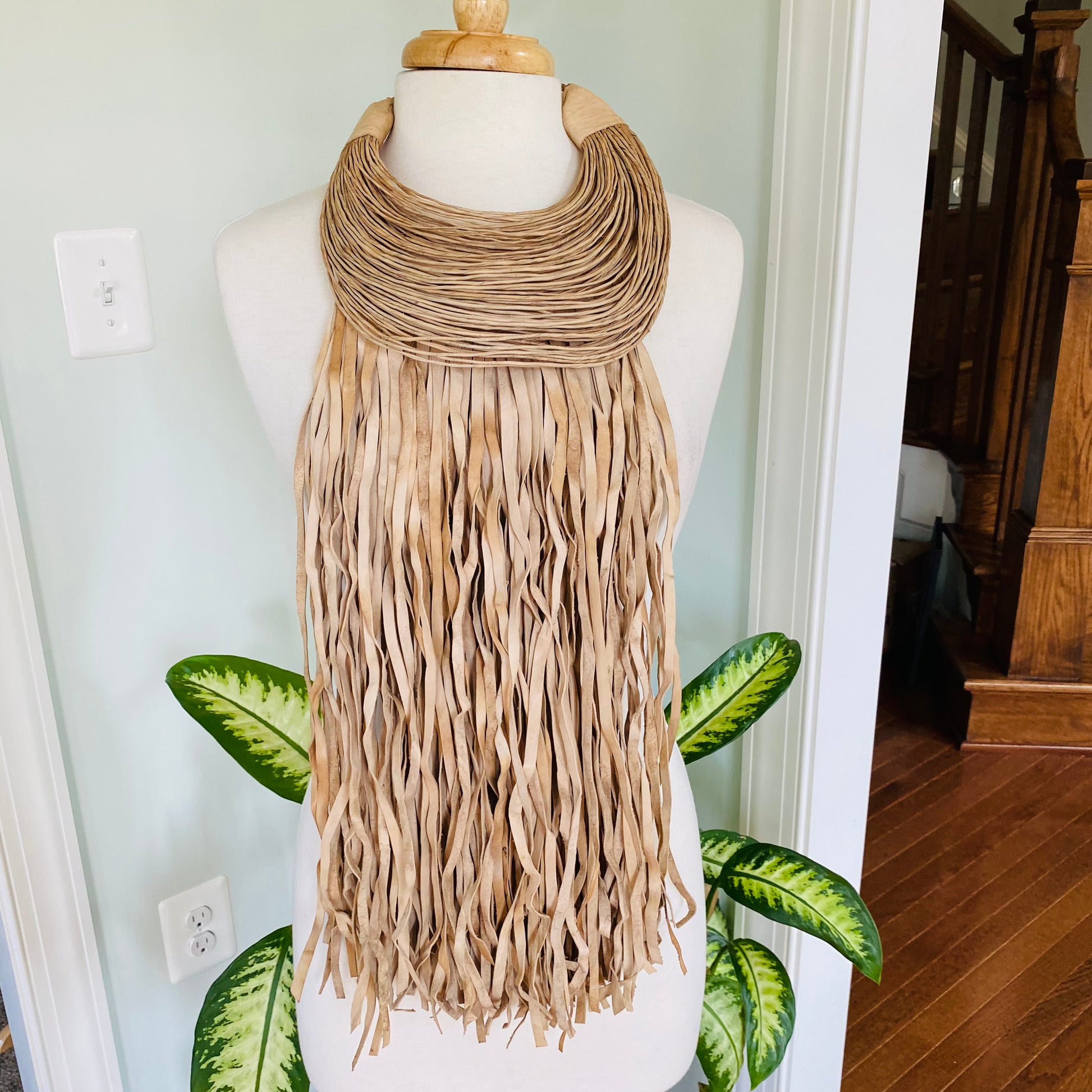 ALL GENUINE AFRICAN LEATHER; we’ve combined two of our signature necklaces to create this beautiful, clever masterpiece; our Majestic Leather Collection with an all leather twist; a truly one-of-a-kind neck art; make a pretty and colorful fashion statement.