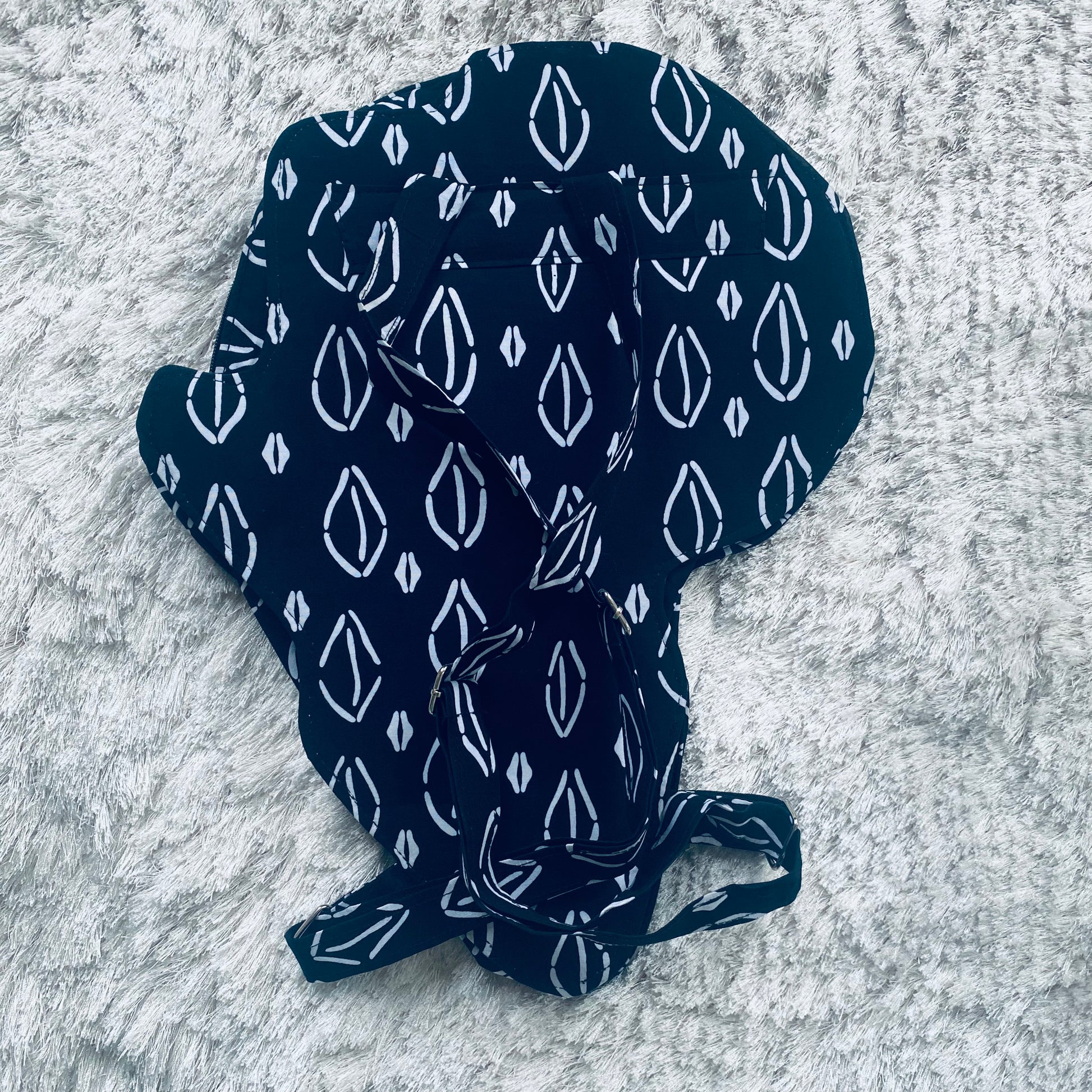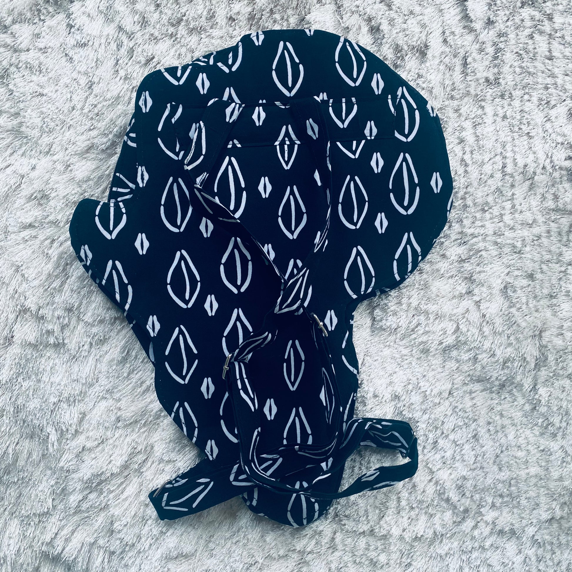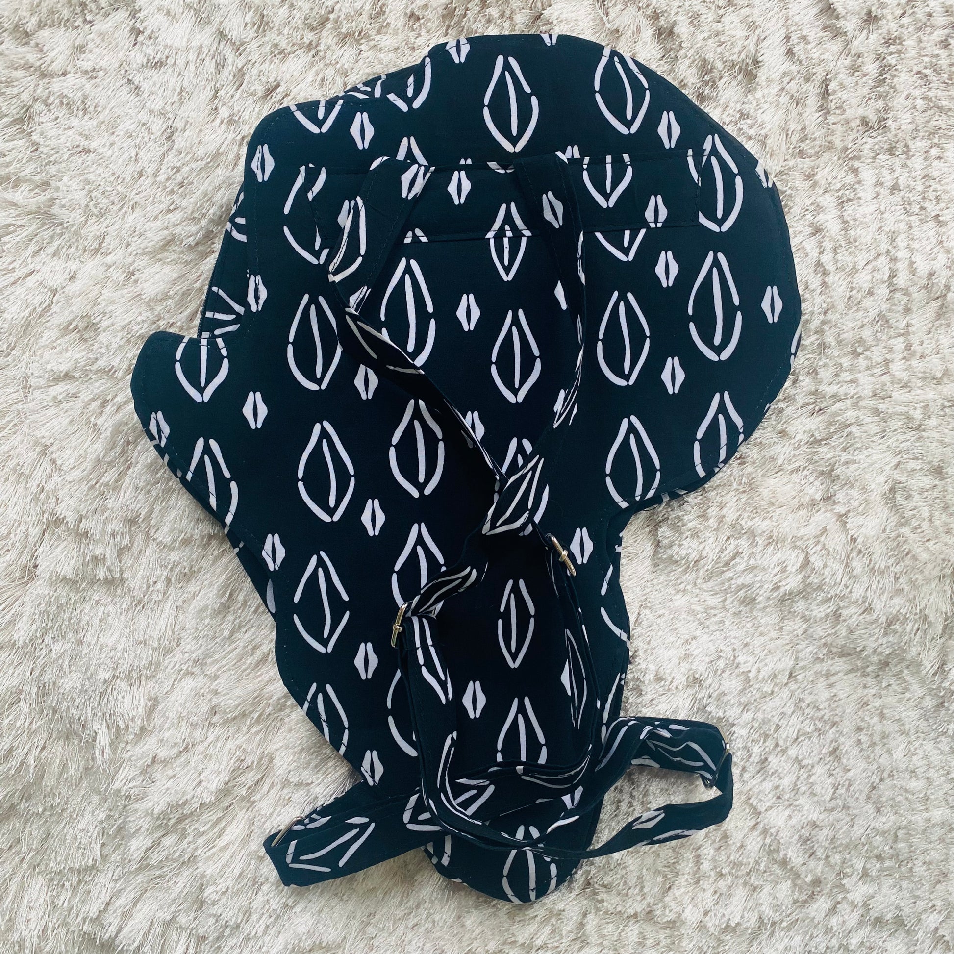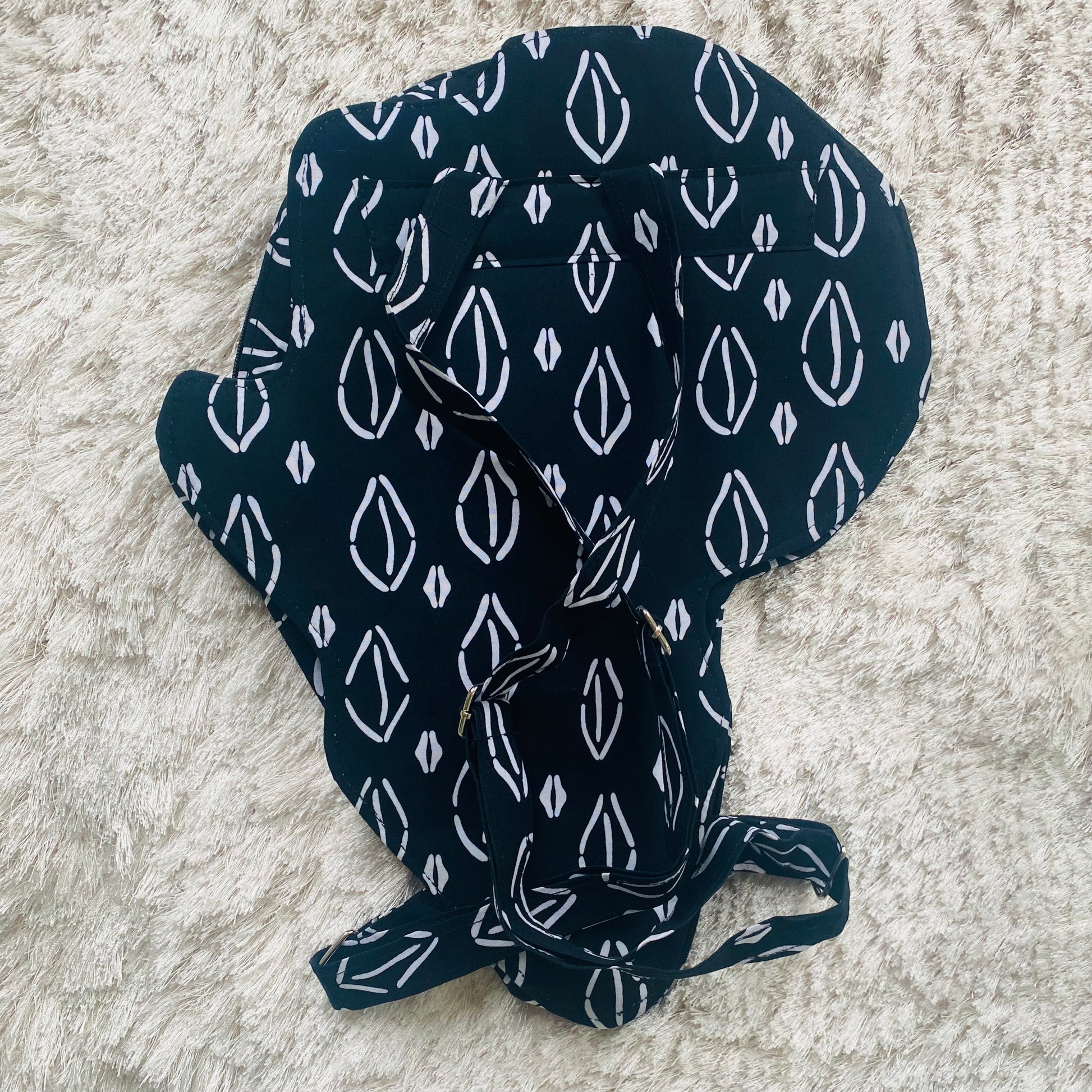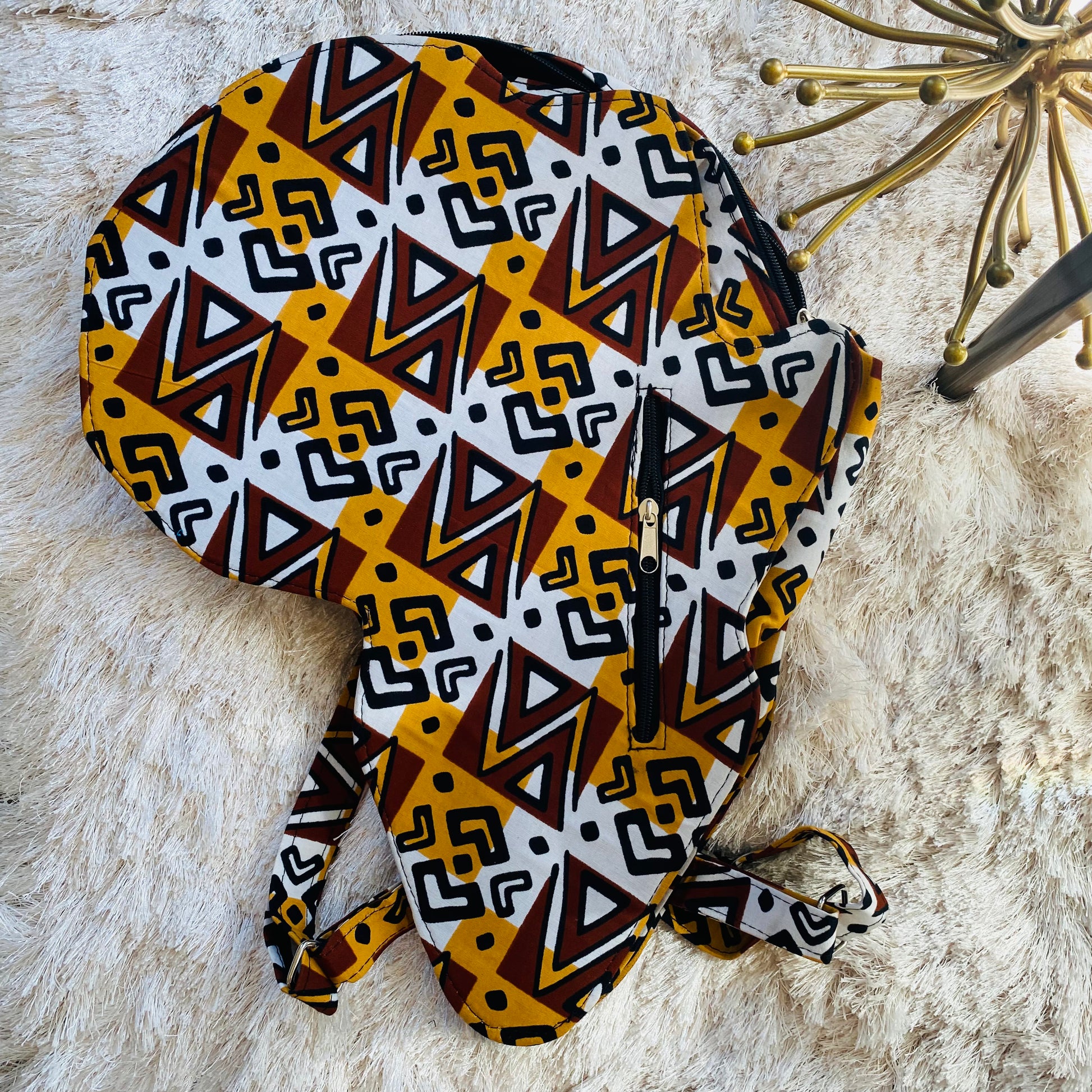 Authentic African fabric, cut and shaped into our beautiful continent of Africa; adjustable straps; double zipper top closure; external zipper pocket.