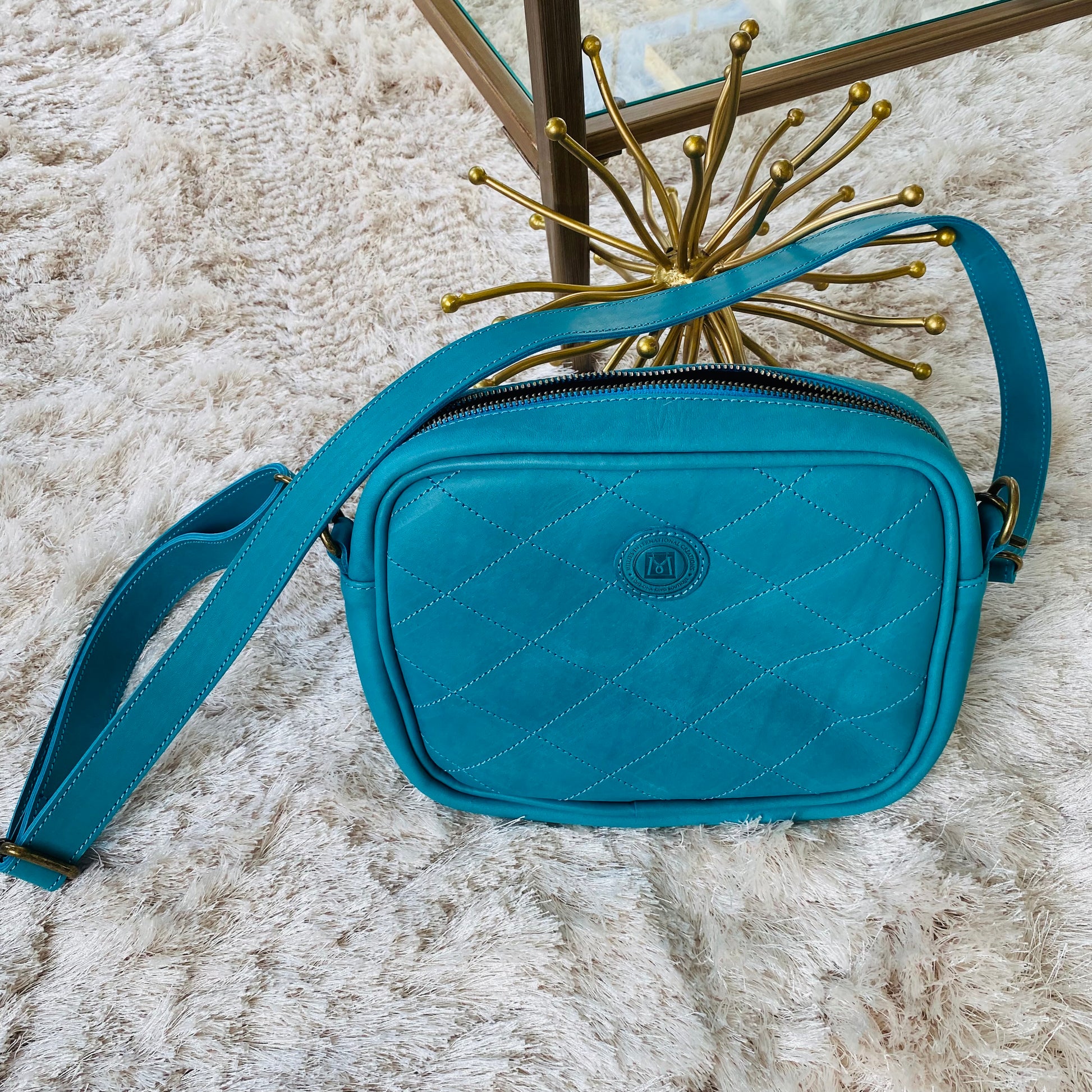 Supple, quilted, high-grade leather; zippered top closure; inside pockets; adjustable strap for shoulder carry or crossbody; crisscross design; holds a lot!