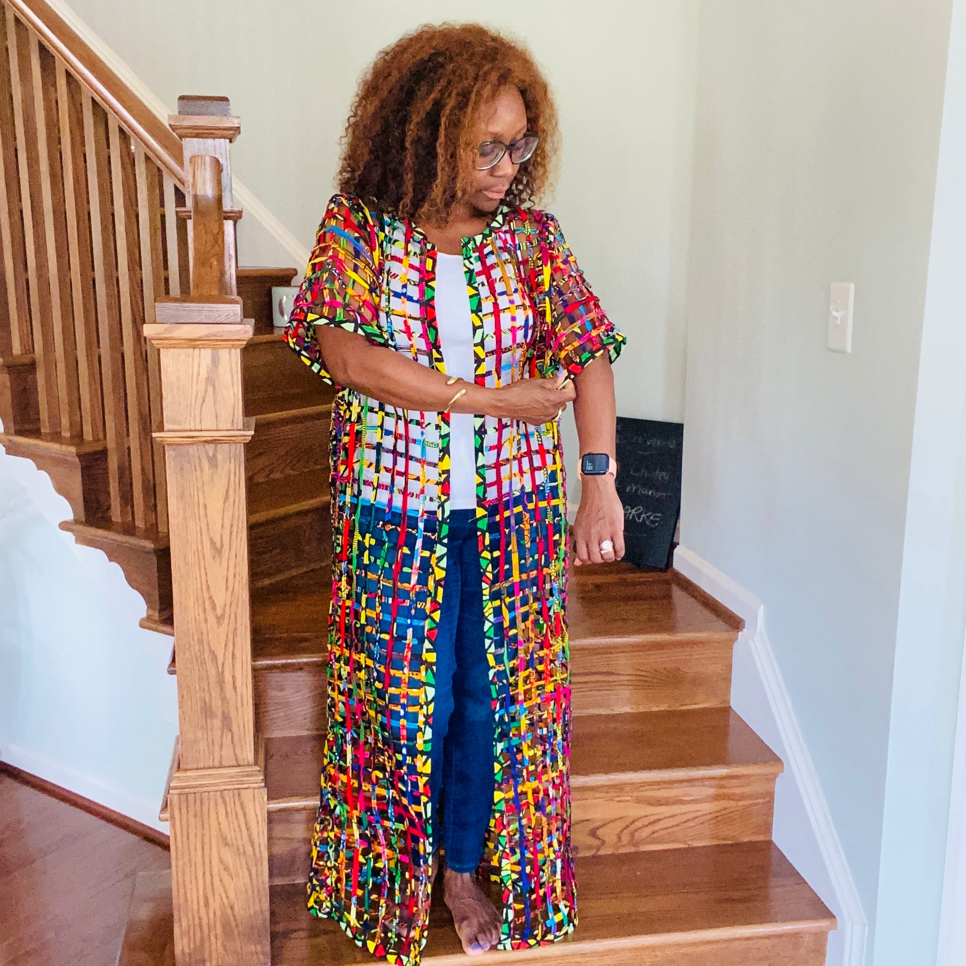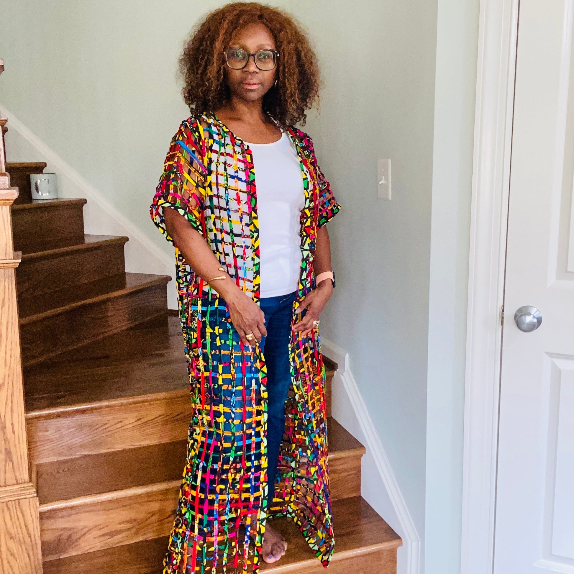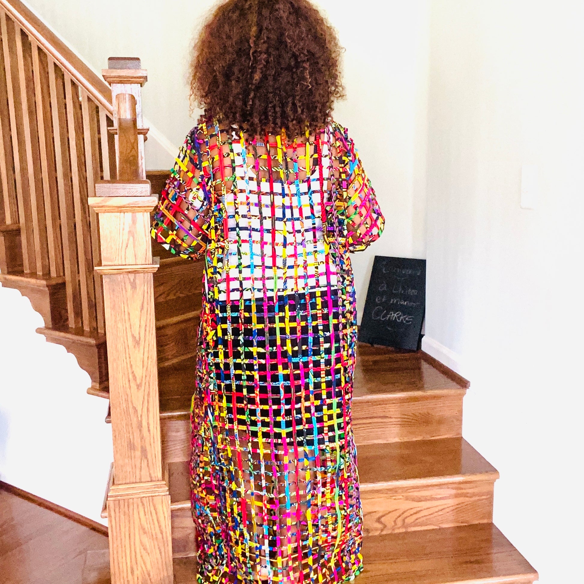 A tedious patchwork creation to form a mesh jacket; vibrant authentic African fabric; wear it loose or add a solid color belt; fits to