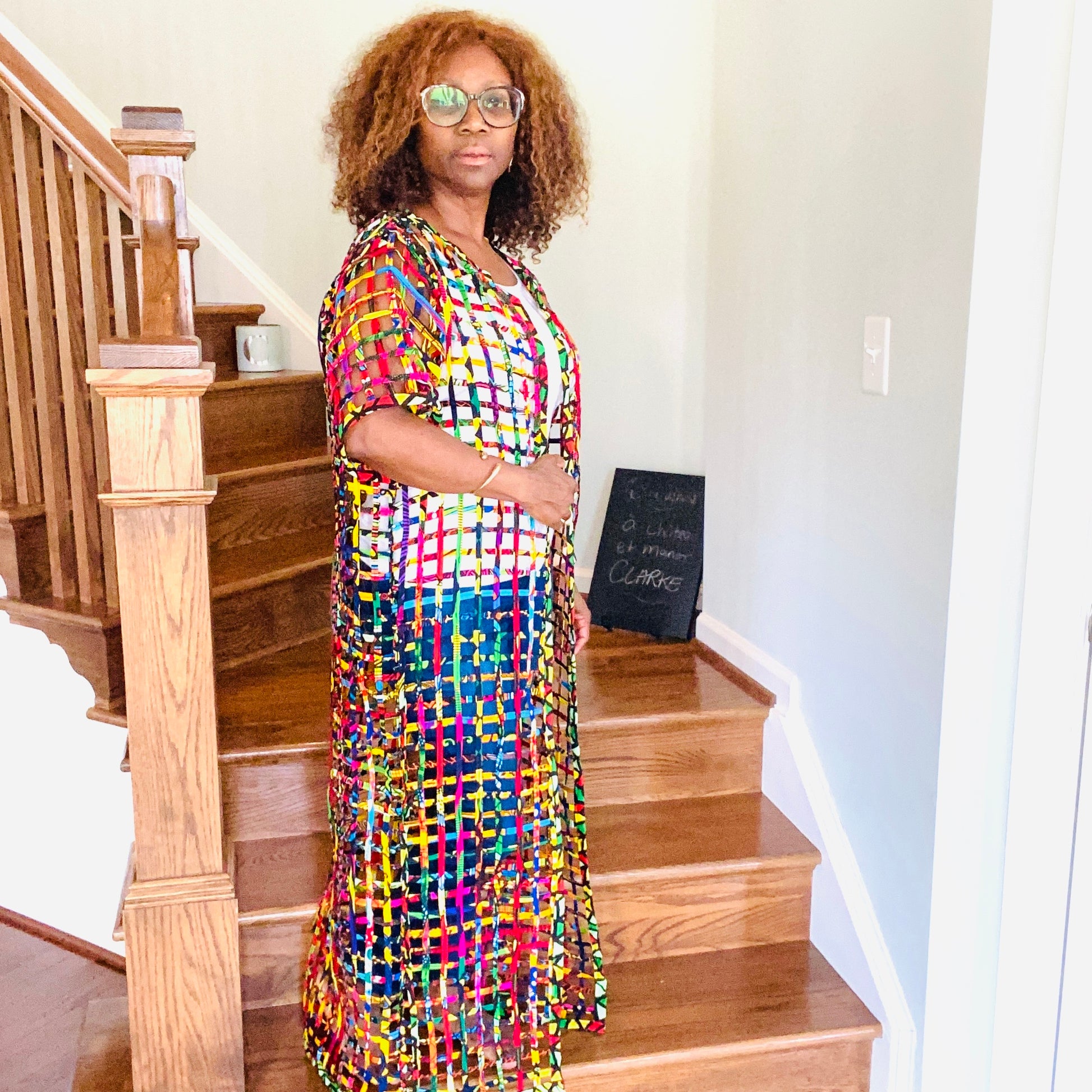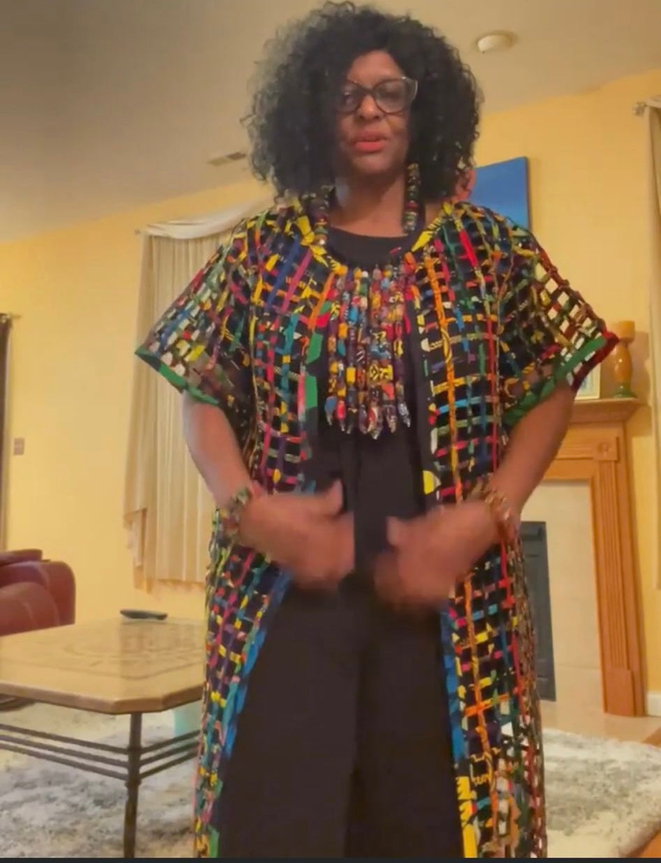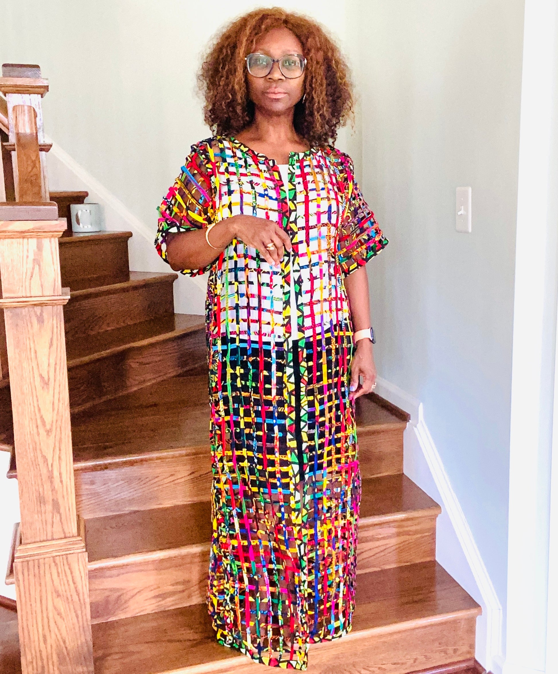 A tedious patchwork creation to form a mesh jacket; vibrant authentic African fabric; wear it loose or add a solid color belt; fits to