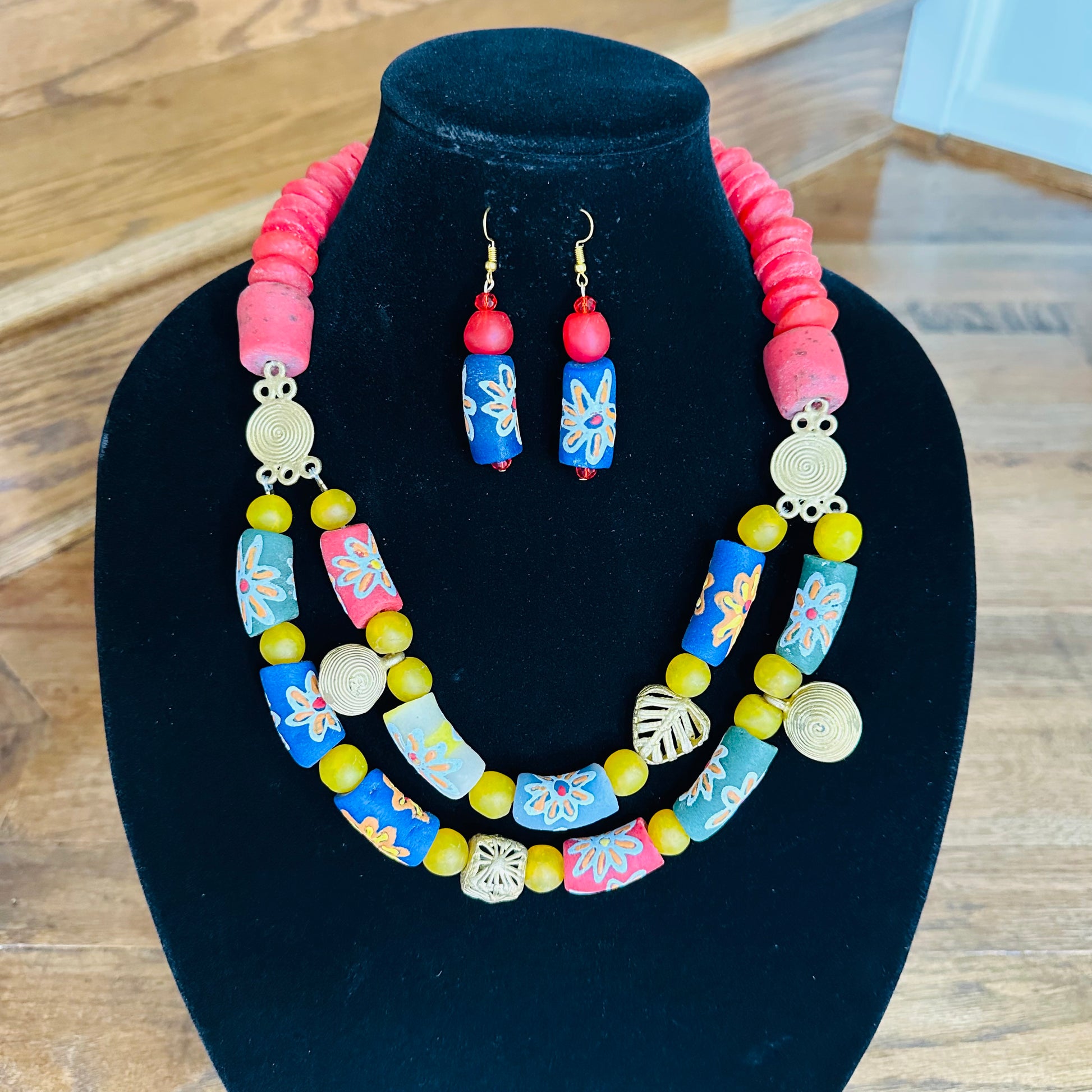 Stunning variety of African beads, with a mixture of focal beads; set includes necklace, earrings and a bracelet; hangs to 15 inches; stunning elegance.