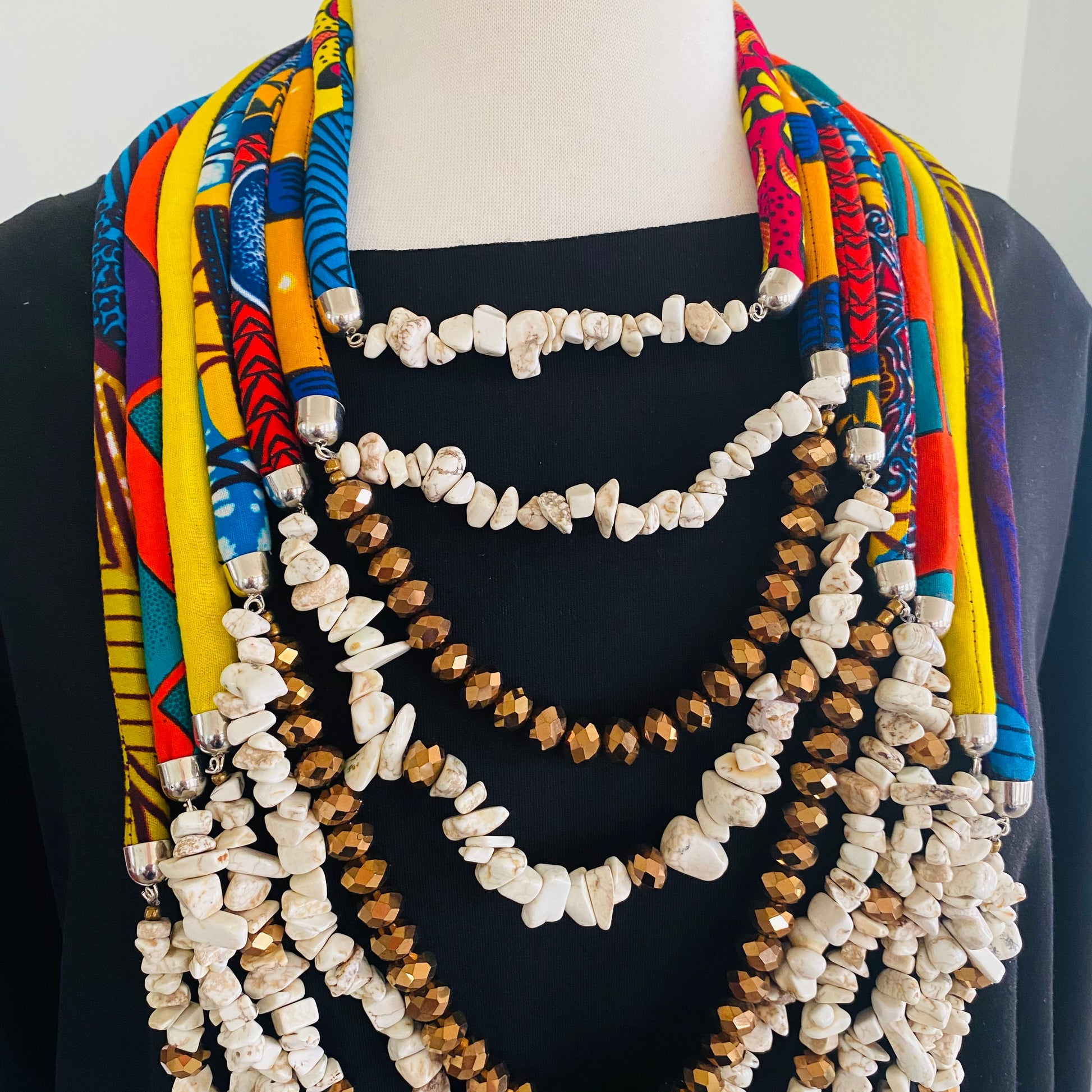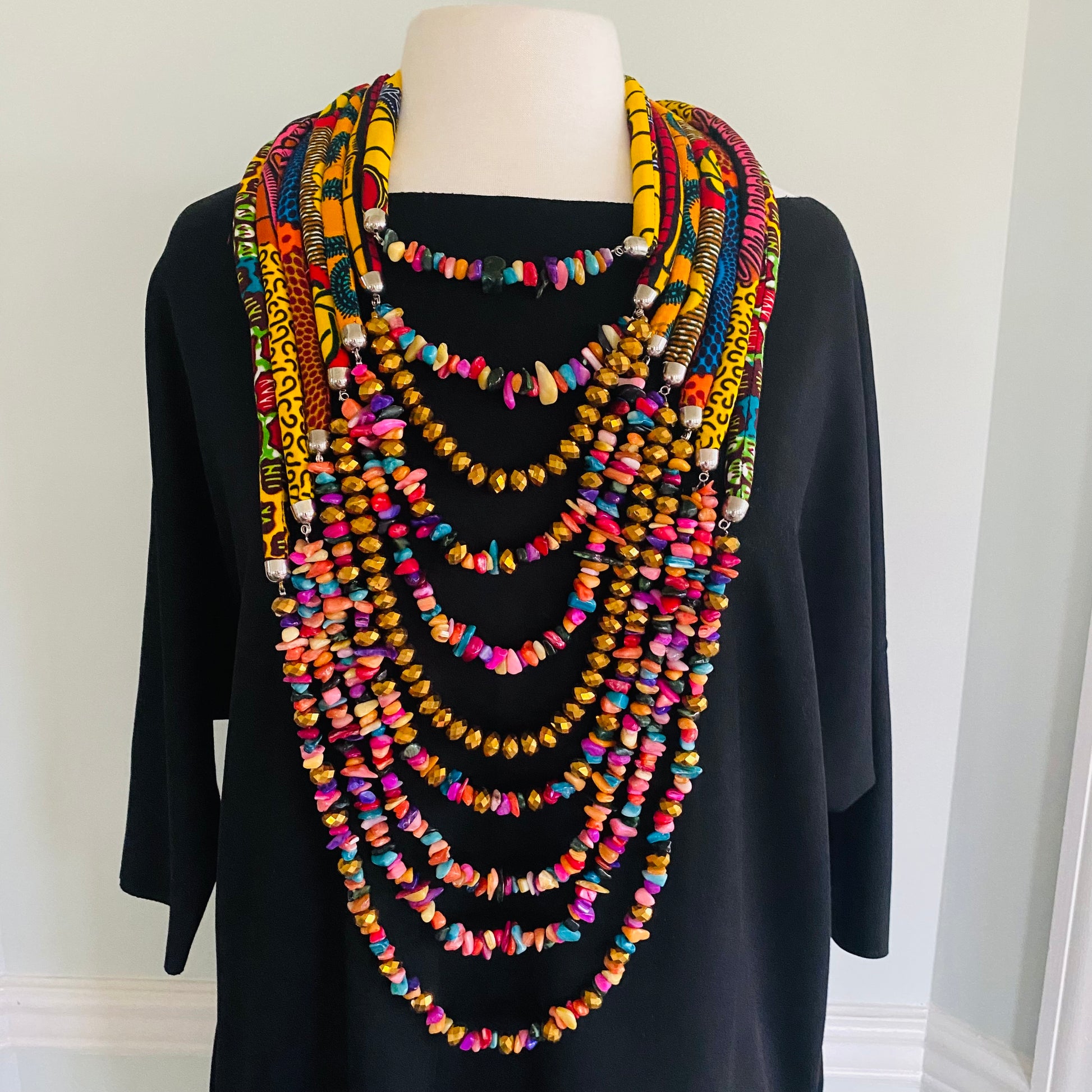 Please note that all the fabric colors on each necklace are different, but vibrant. No two are alike.