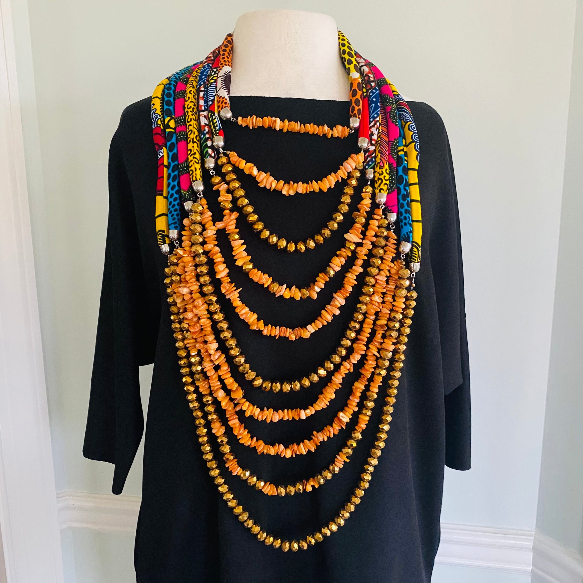 Gorgeous stones and sparkling beads, dazzling in gold with an Ankara twist; she hangs down to 23 inches in length; guaranteed to turn heads and be asked where did you get that; she’s bad bad, y’all!