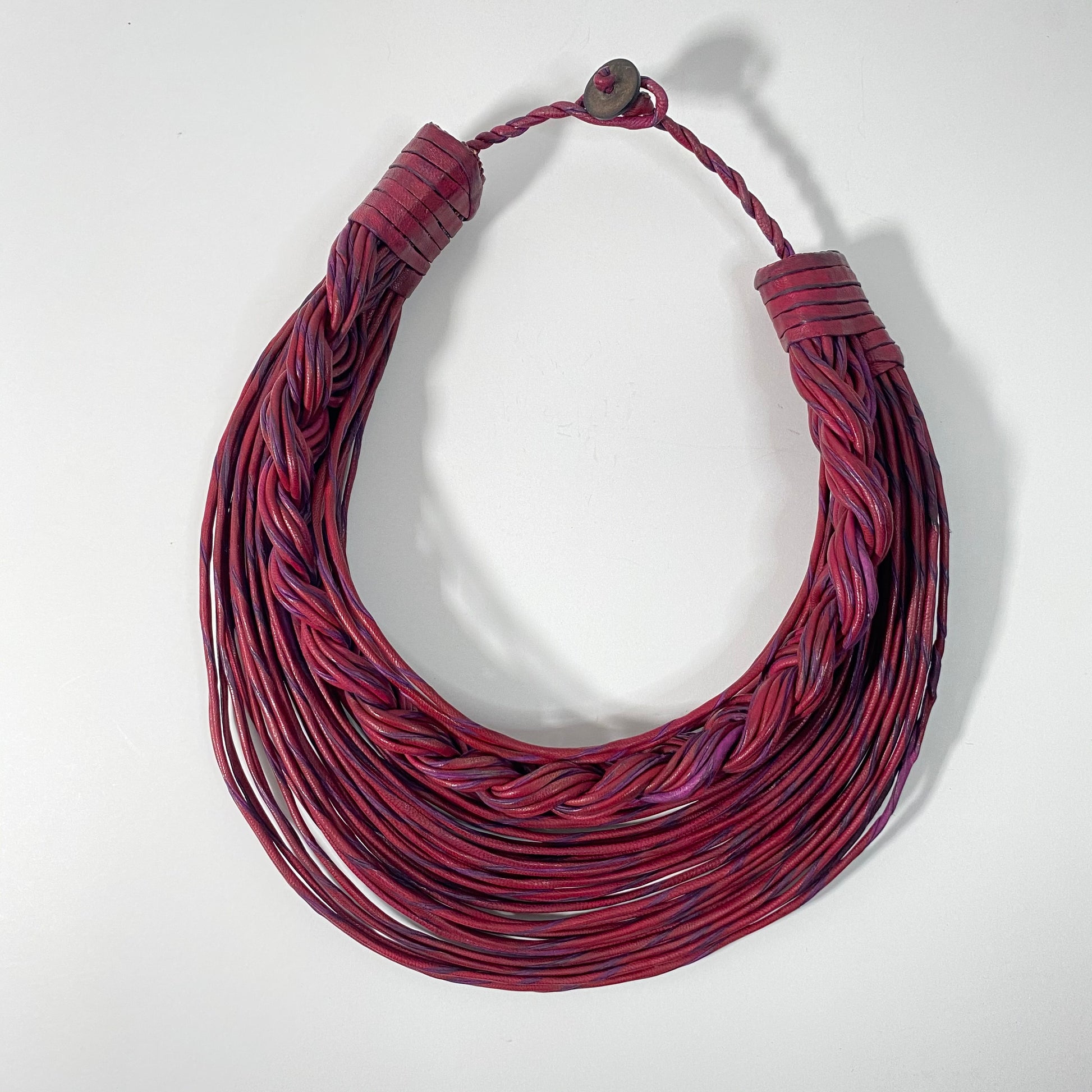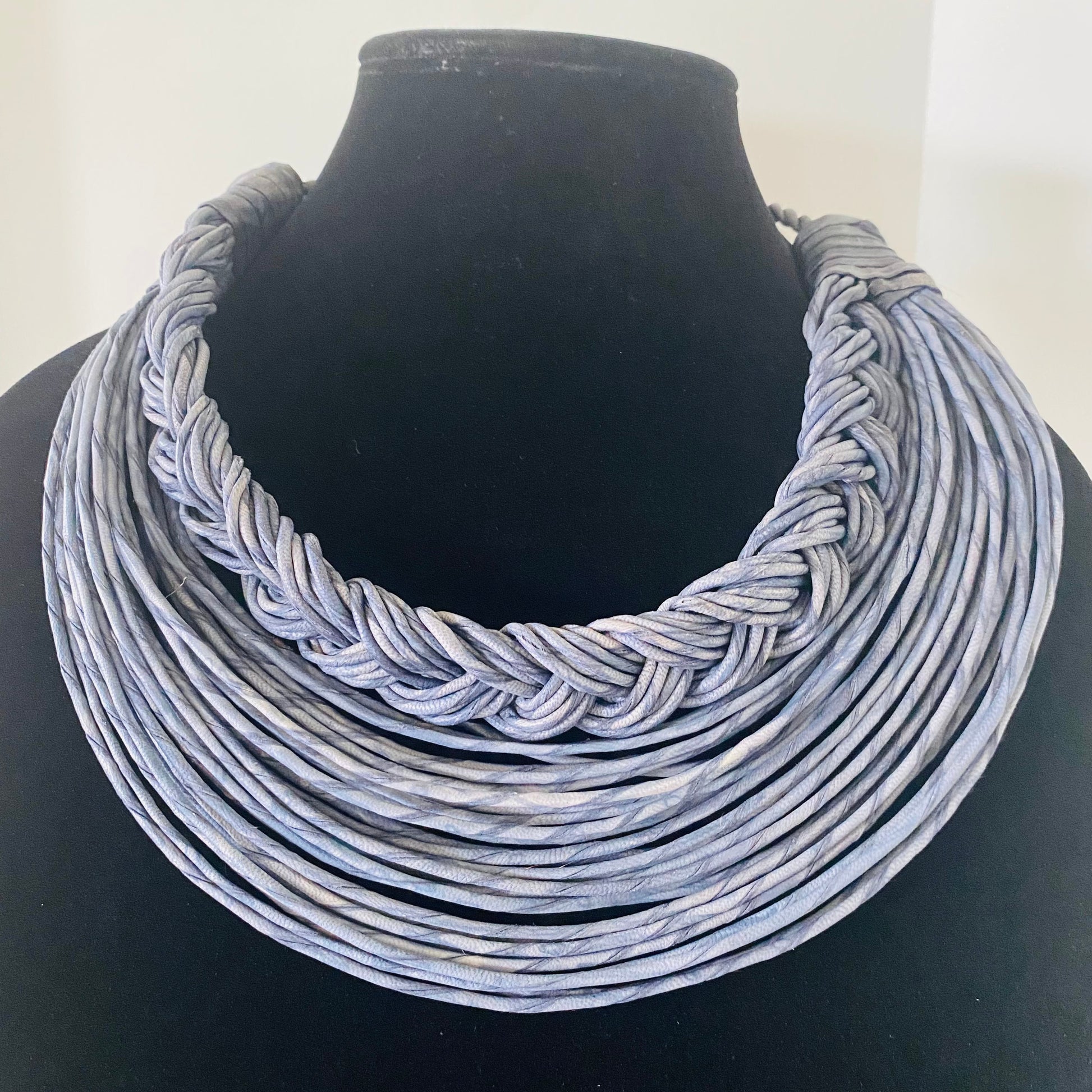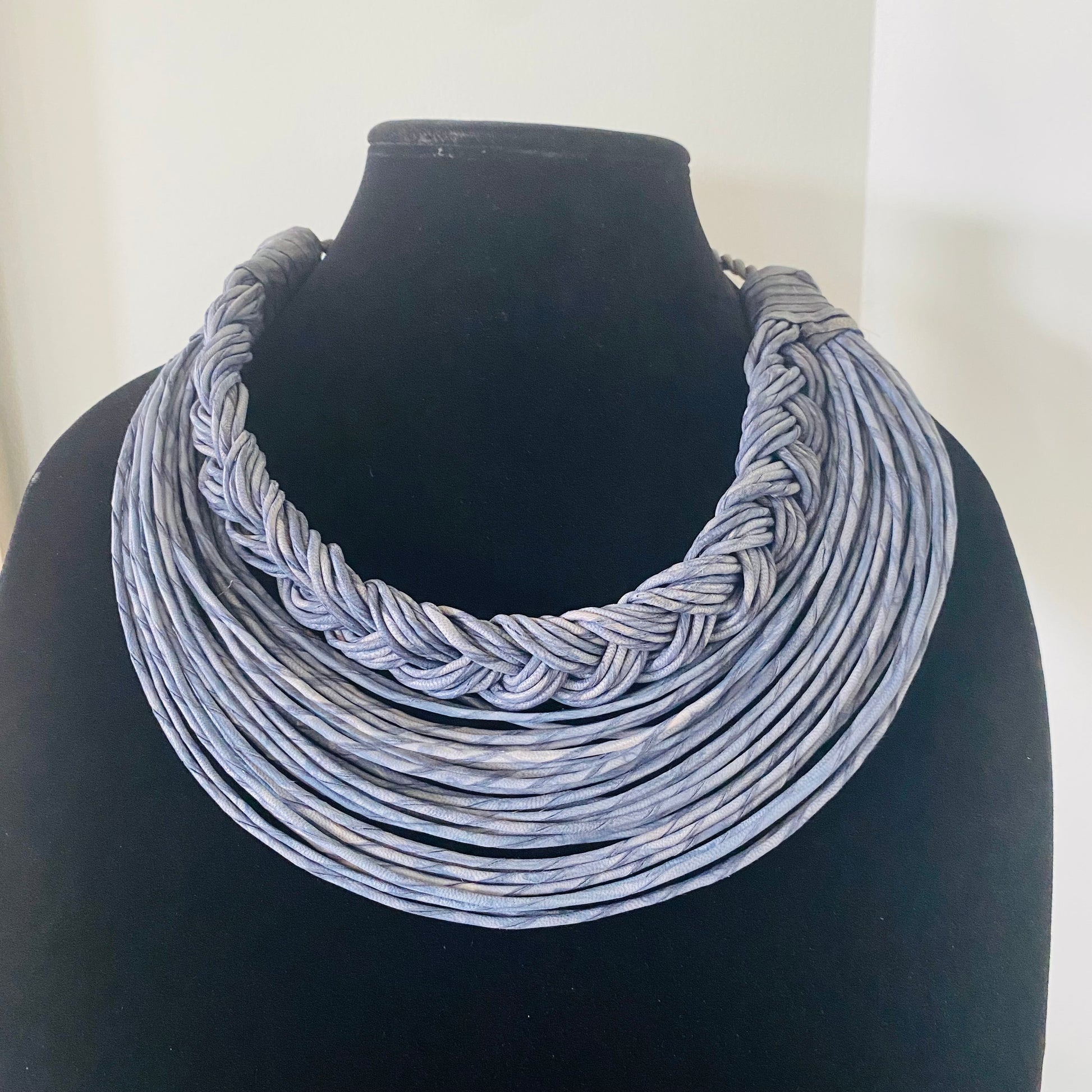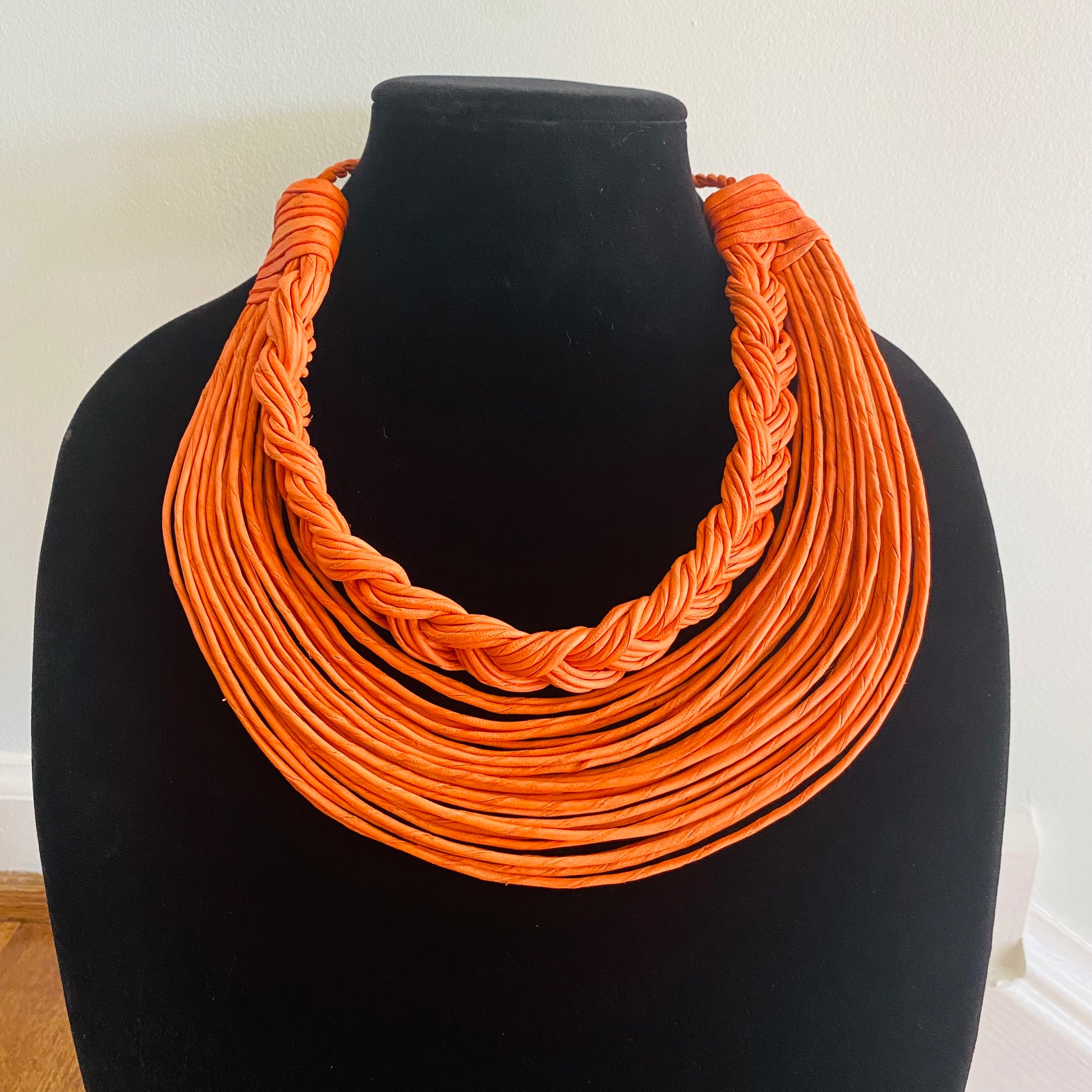 Our ever-popular handmade Raffia necklace with a twist. Semi-macramé infused with straw; ahhh, so clever! Super lightweight, so no two are identical. A unique versatile piece that can be worn with professional attire or casual wear. Any imperfections are a part of the uniqueness of the product.
