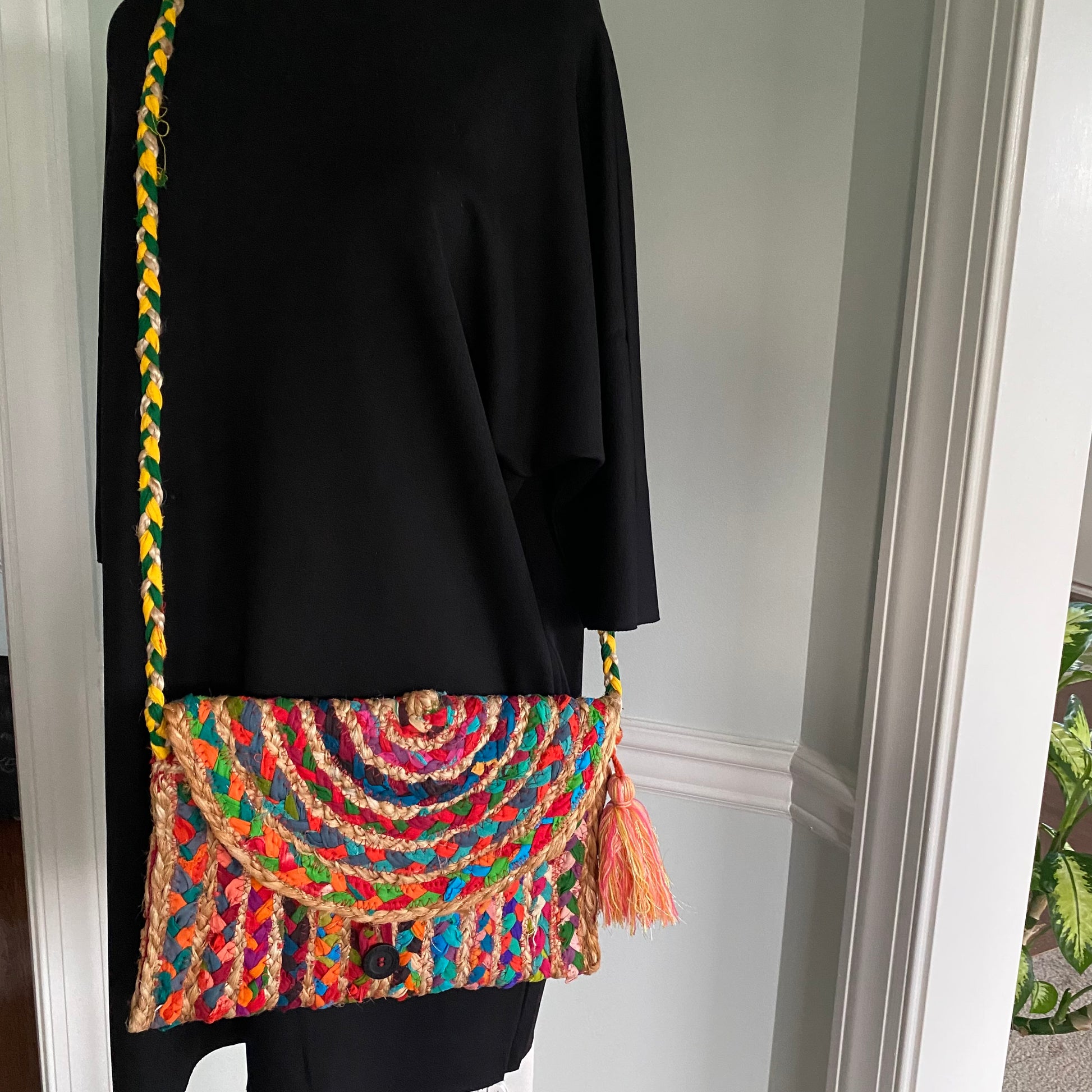 Gorgeous, tropical colors woven with jute to create this clutch/crossbody bag for those moments when nothing else will do; zip top closure underneath the buttoned flap; braided crossbody strap; strap can be tucked into bag to carry as a clutch; take a walk on the beach with your cell phone, wallet and keys by your side; grab one for you and another for a friend or sister.