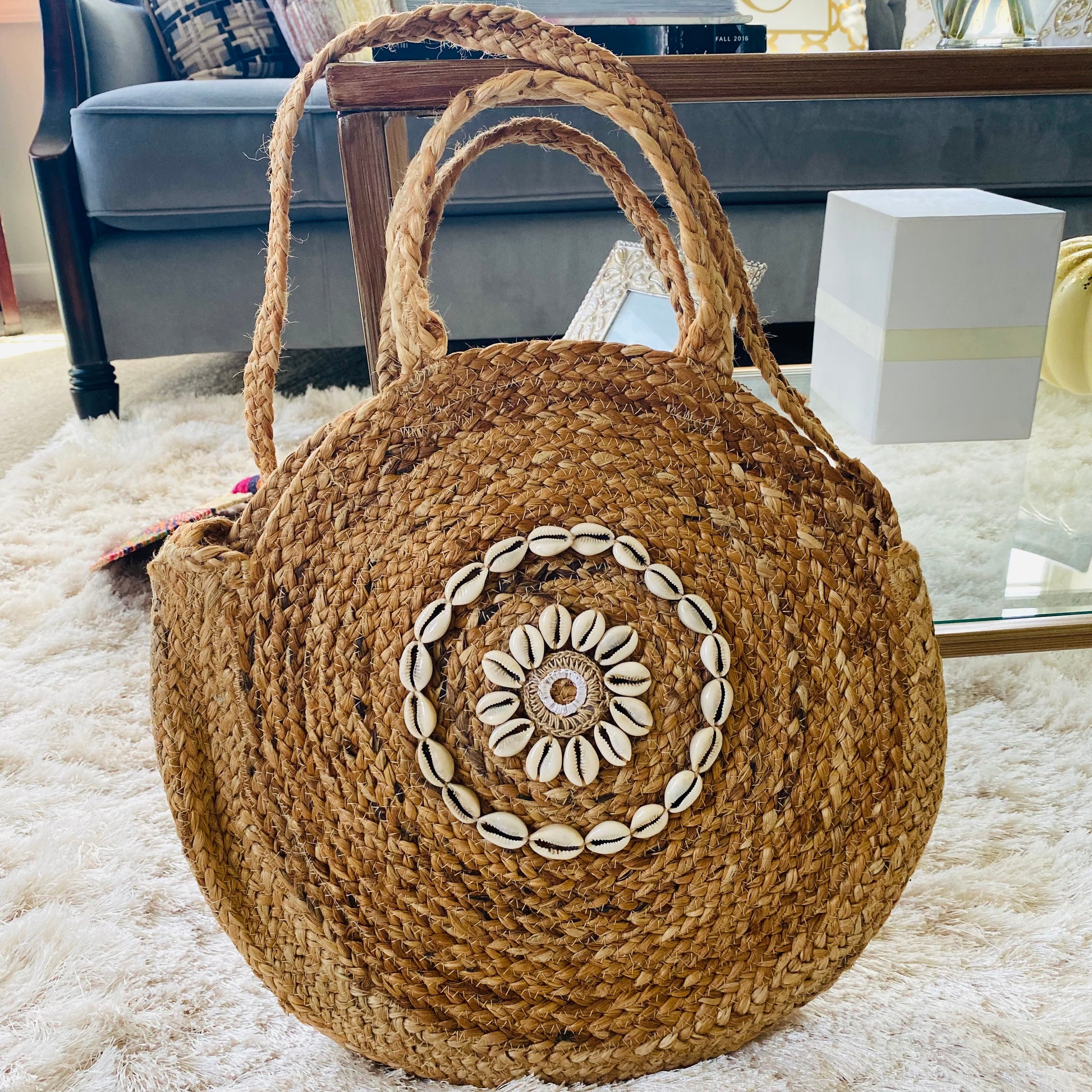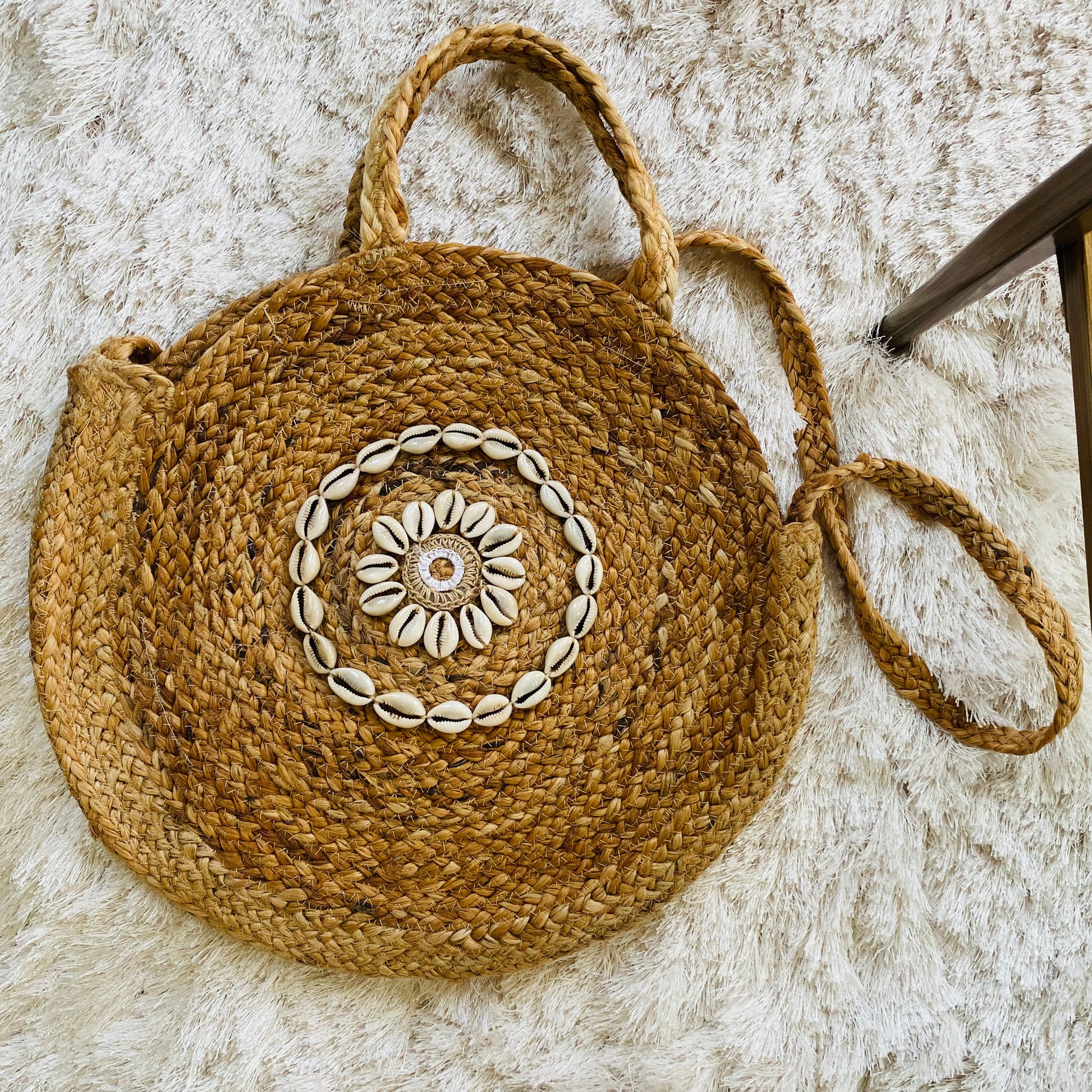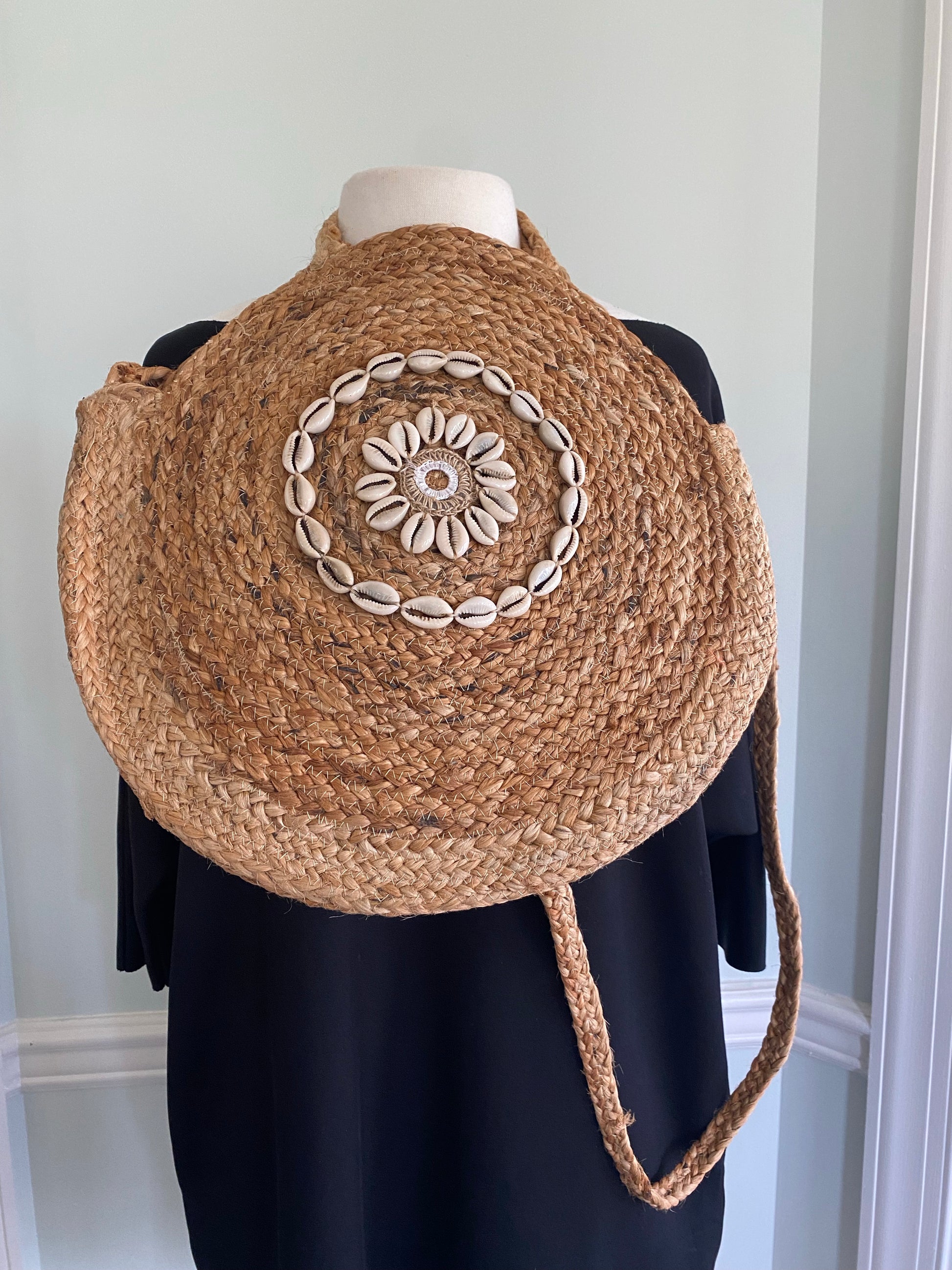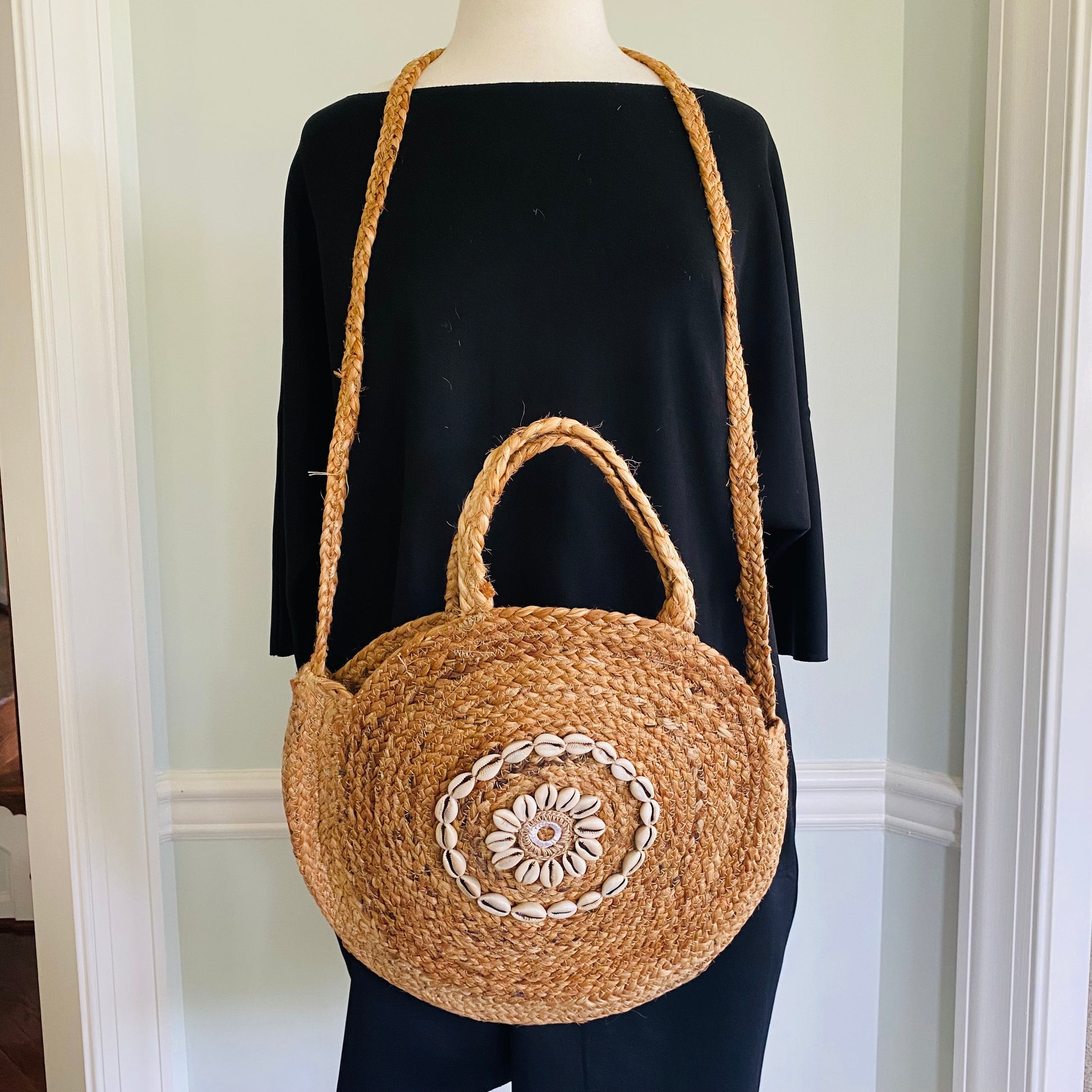 All natural jute fibers, spun together in a circle, accented with pretty Cowrie Shells from the shores of Mama Africa, to create this lightweight staple; use it any time of year, but especially as you travel for that beachy vibe; wear it crossbody using its long, 25-inch strap, or channel your inner chicness by holding it on your arm using the top handle; you decide.