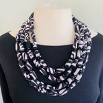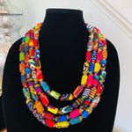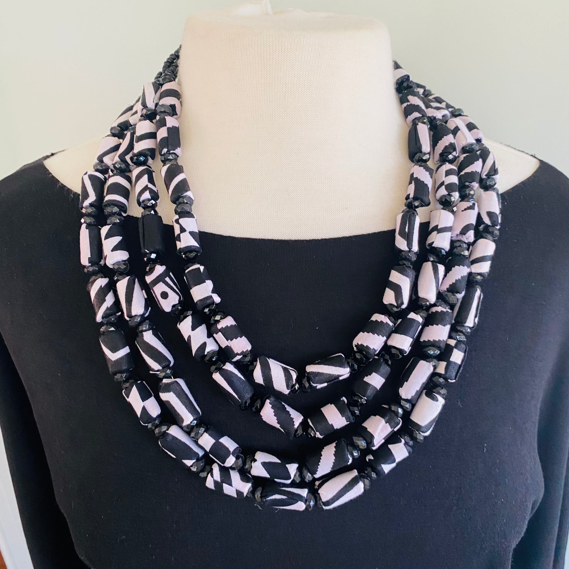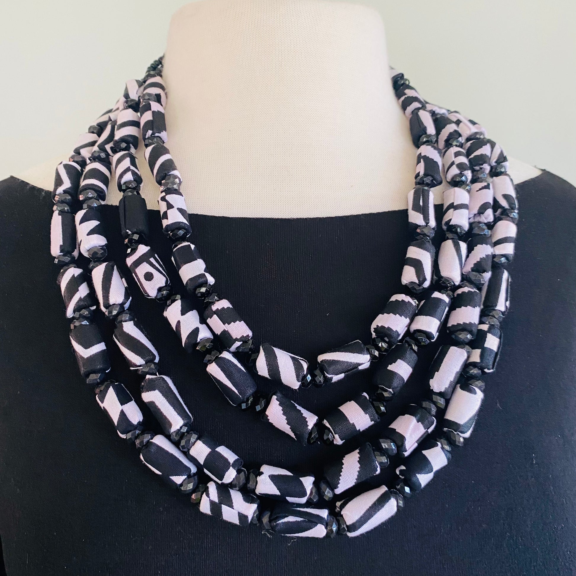 Beautiful candy-shaped beads, covered in Ankara print fabric, cleverly strung together, accented with black beads on a silver lobster clasp closure and chain extension; necklace hangs to 13.5 inches.