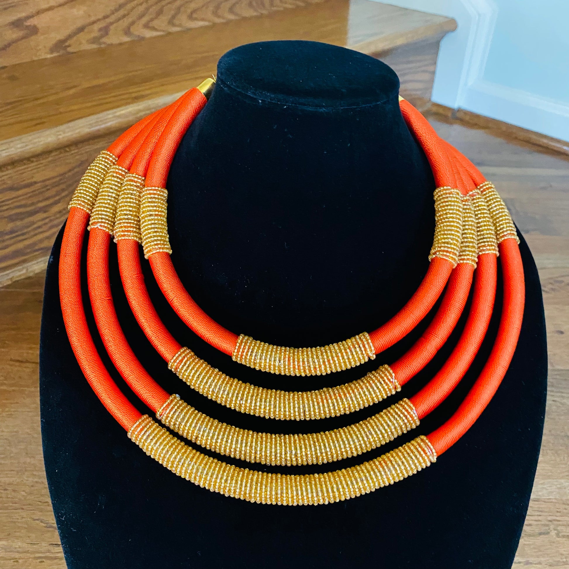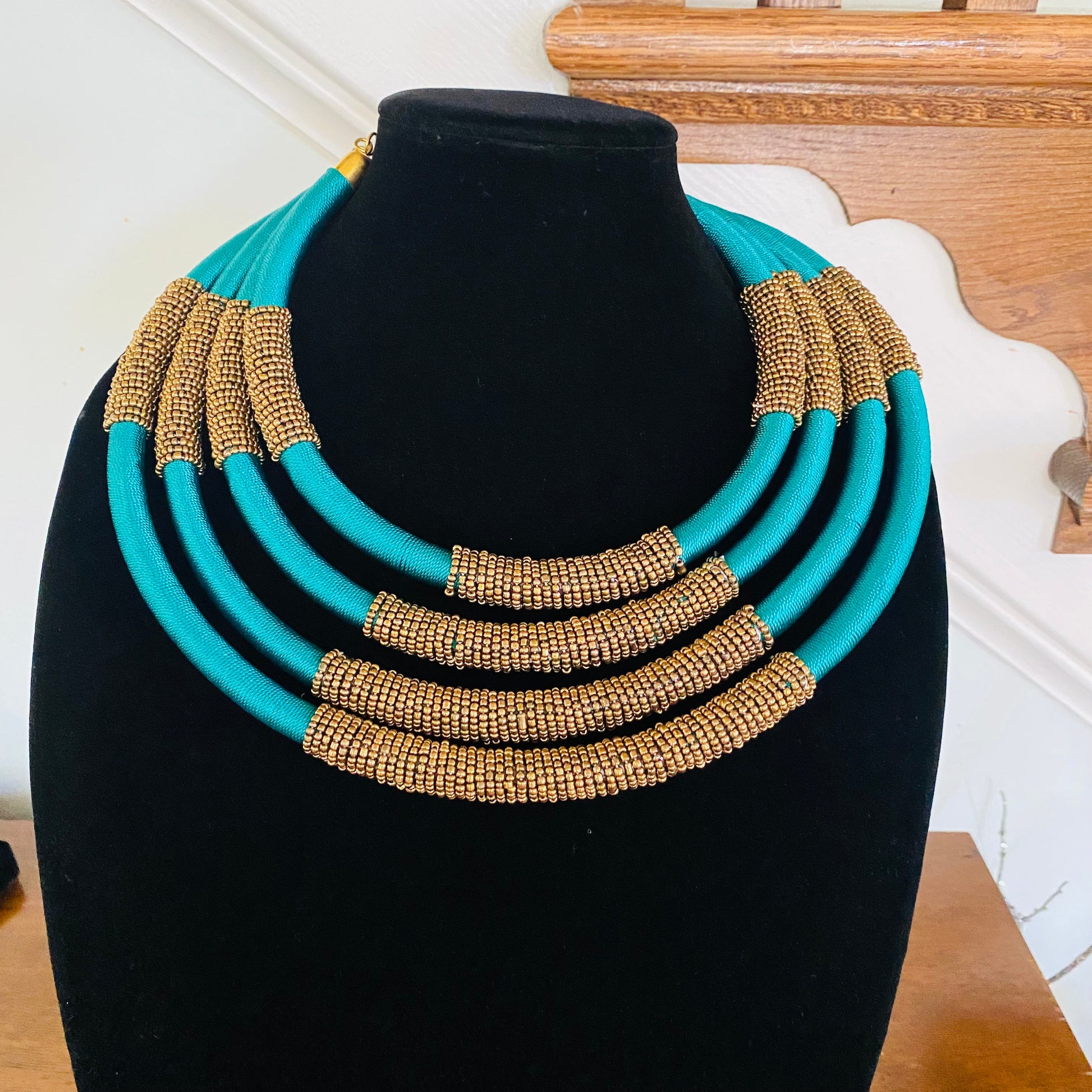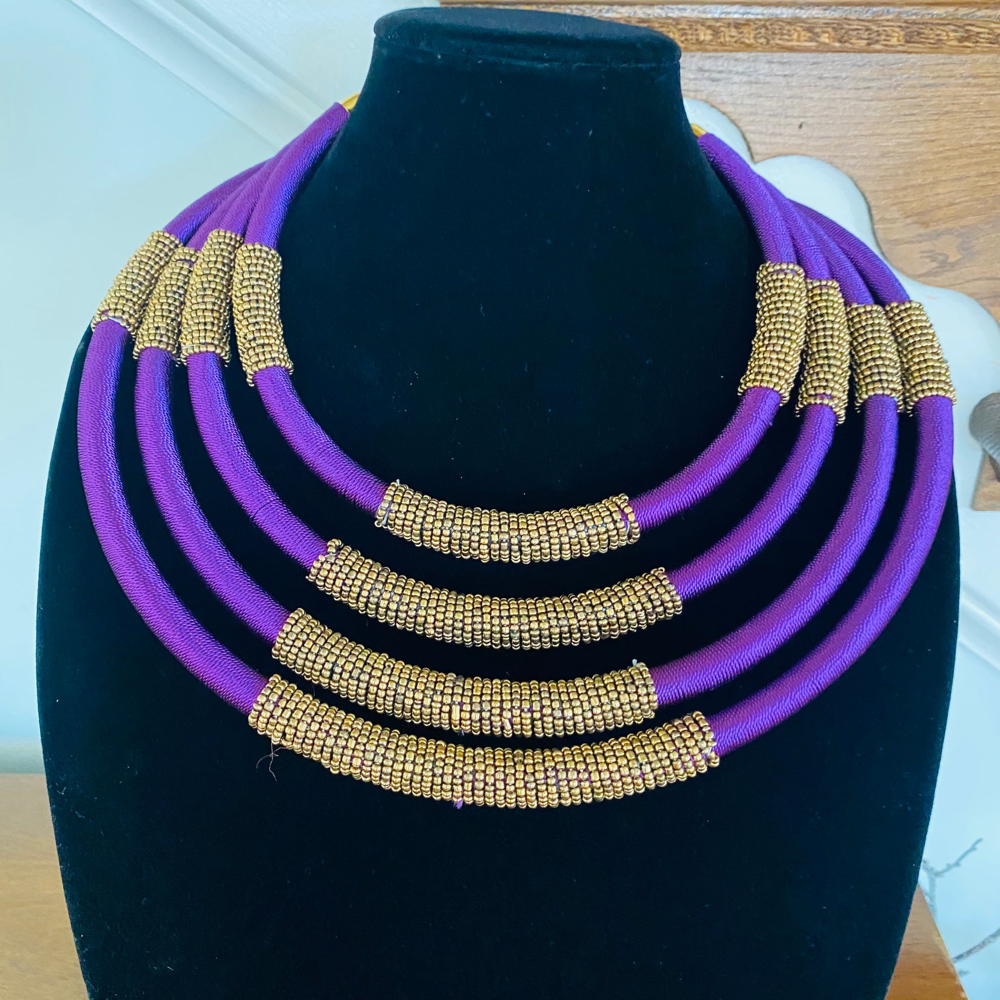 Authentic African threading, accented with bronze glass beads, lobster clasp closure; 4-rows; vibrant jewel tones for the holidays and beyond; free matching earrings and bracelet included.