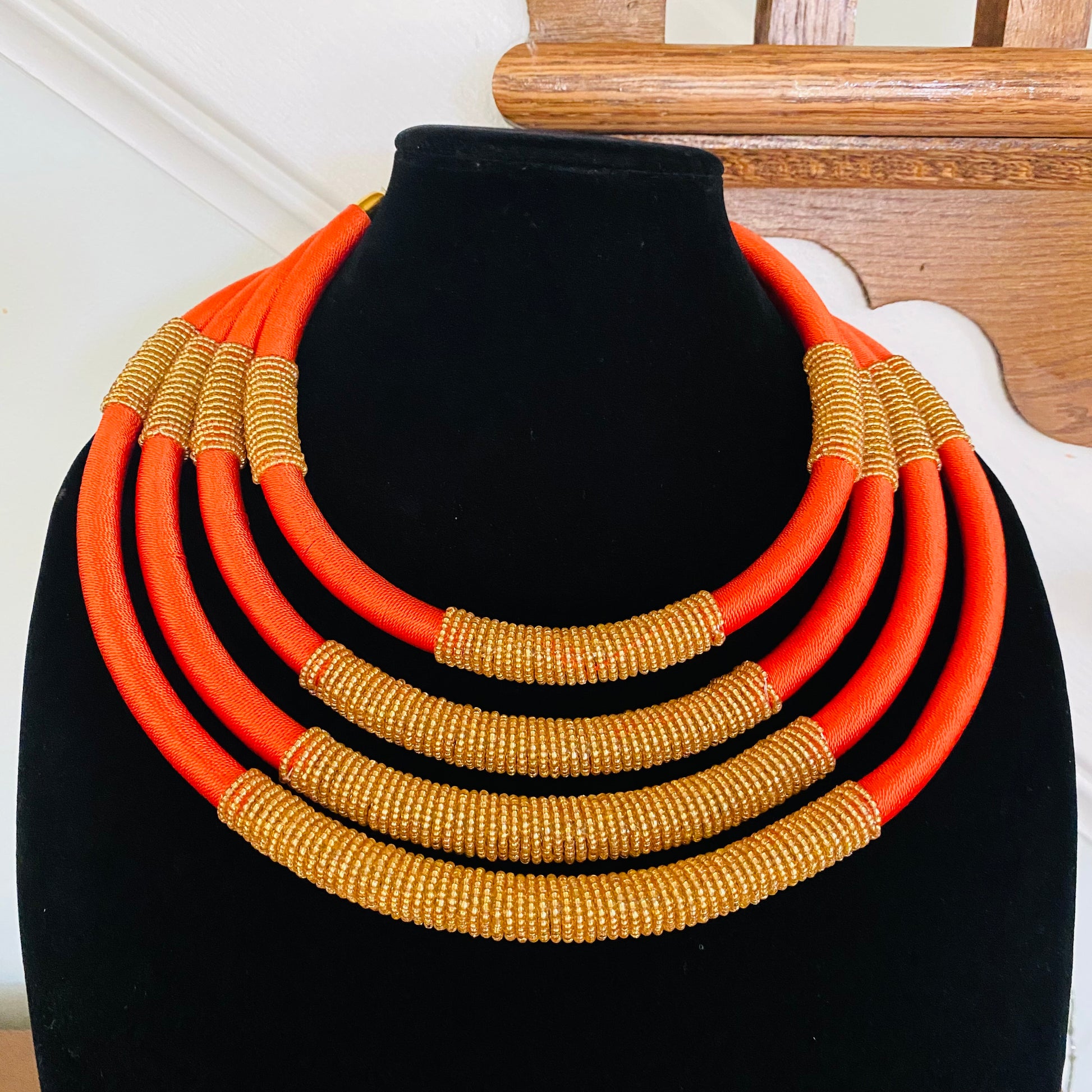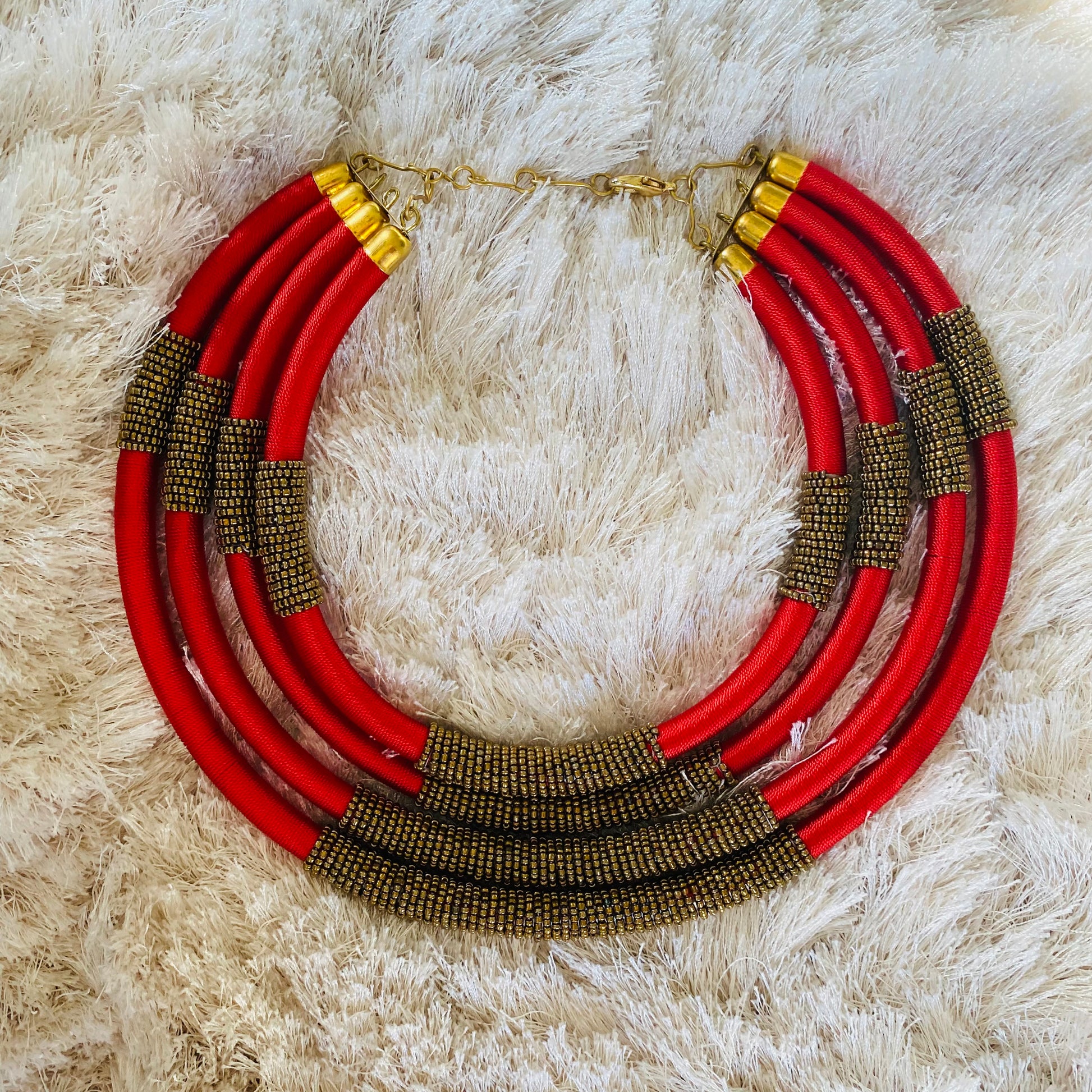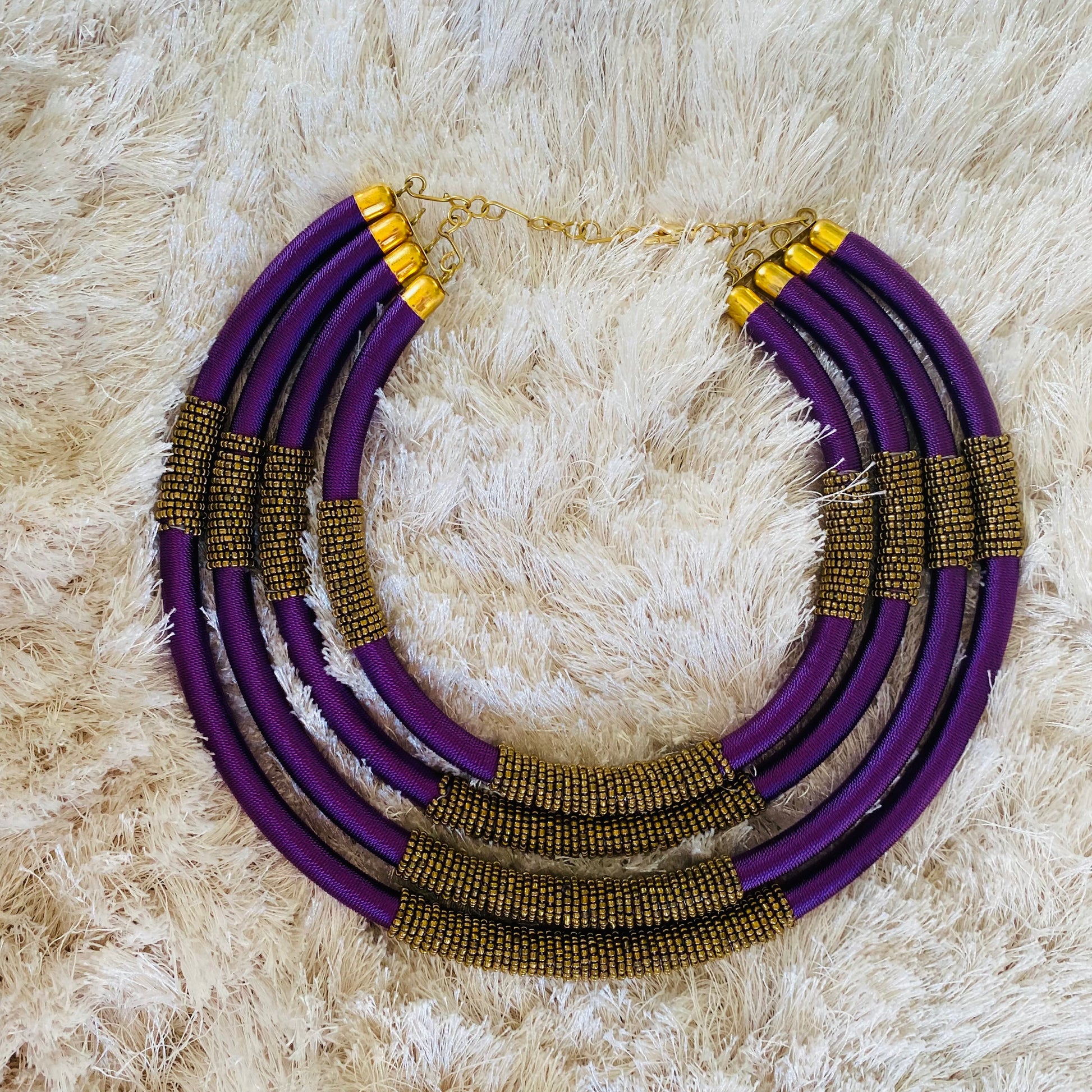 Authentic African threading, accented with bronze glass beads, lobster clasp closure; 4-rows; vibrant jewel tones for the holidays and beyond; free matching earrings and bracelet included.