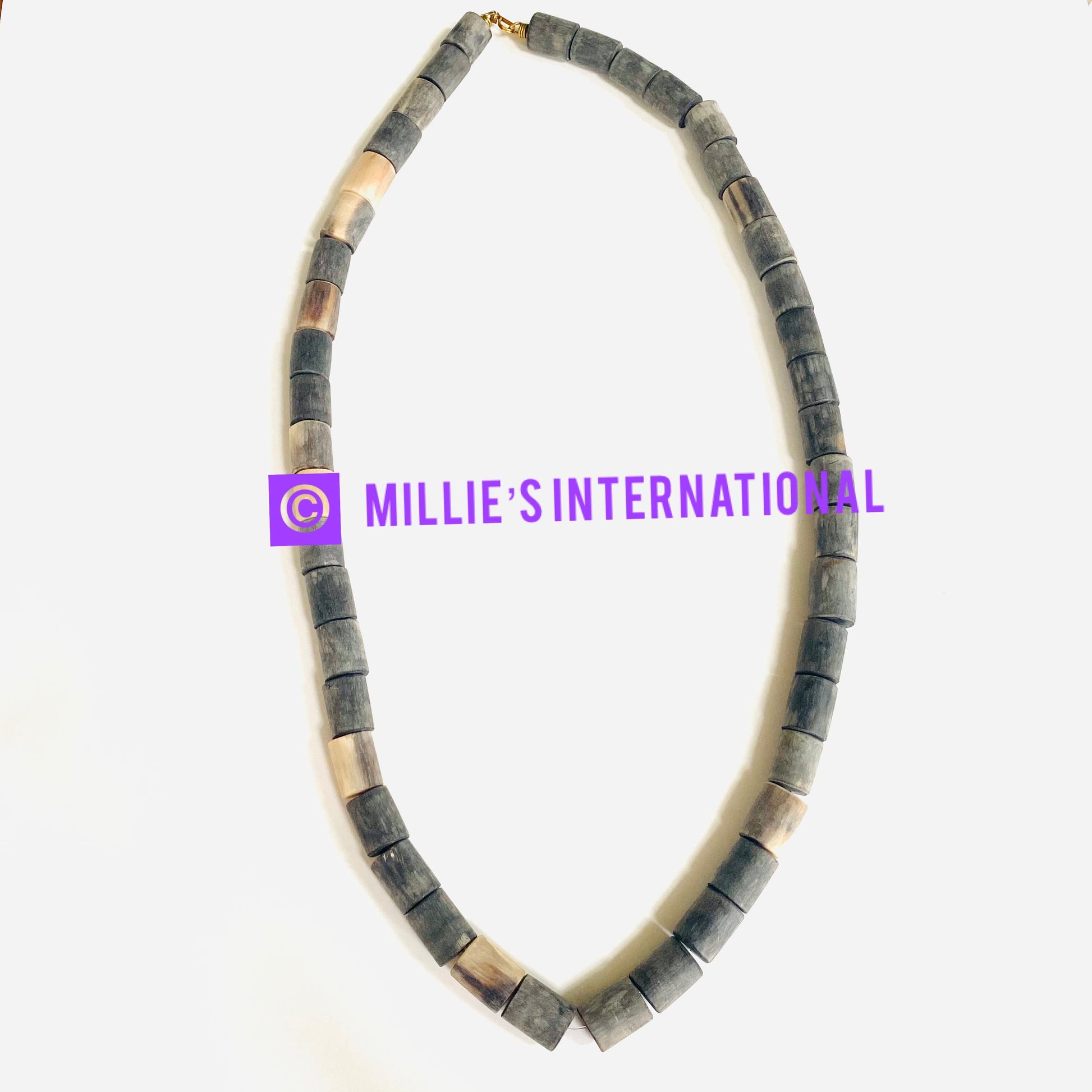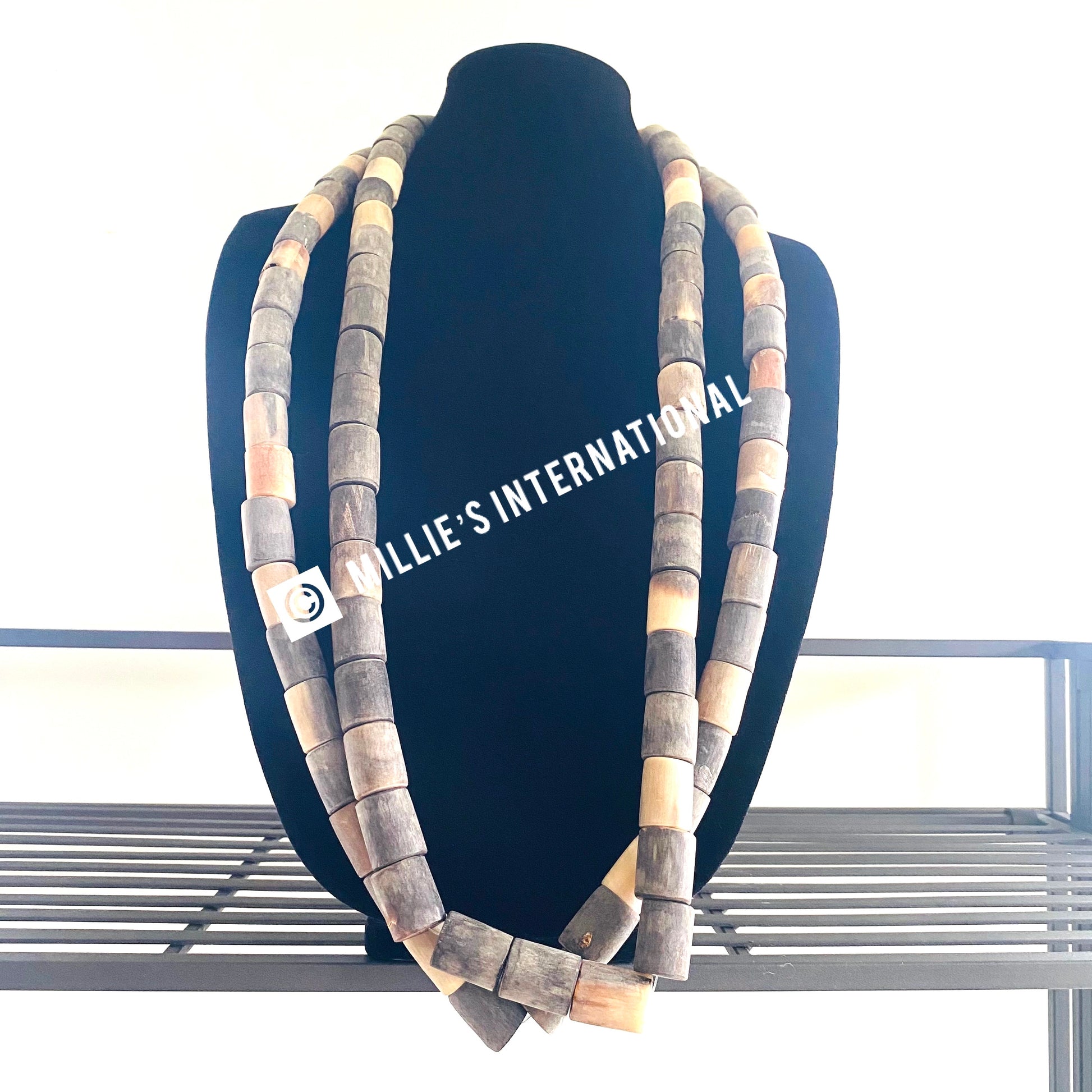 Authentic African cowhorn, machine cut into these beautiful traditional beads, then hand-strung into this work of art; it can slip right over your head or use the hook to get it on and off; necklace hangs 20 inches long.