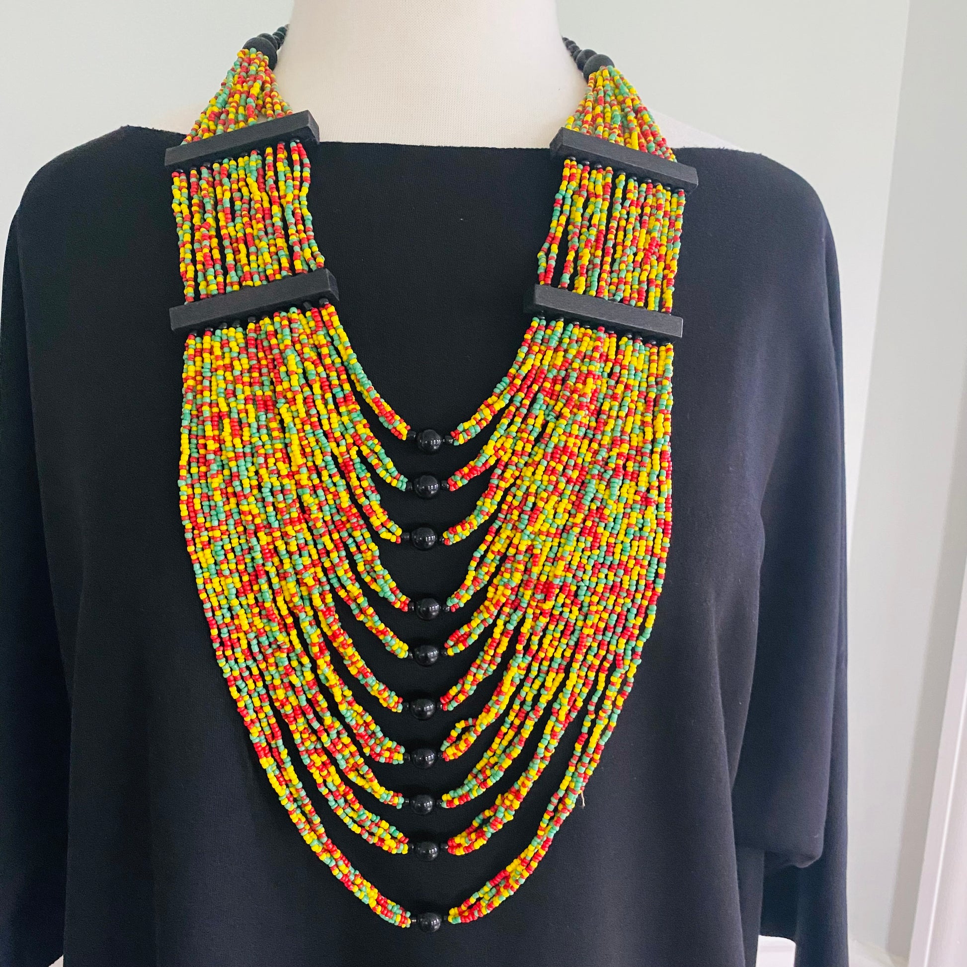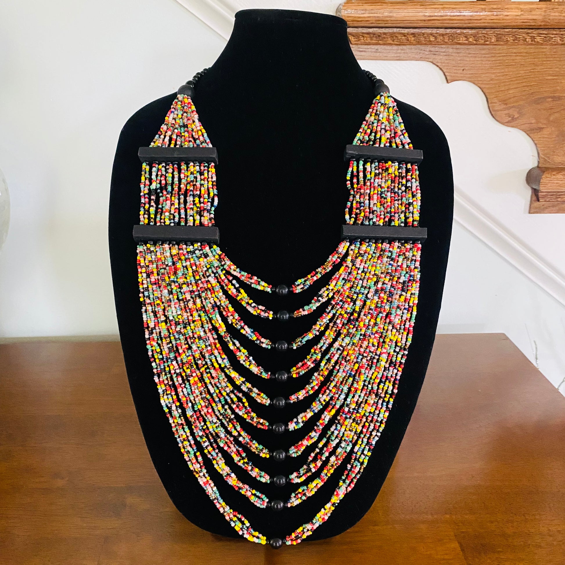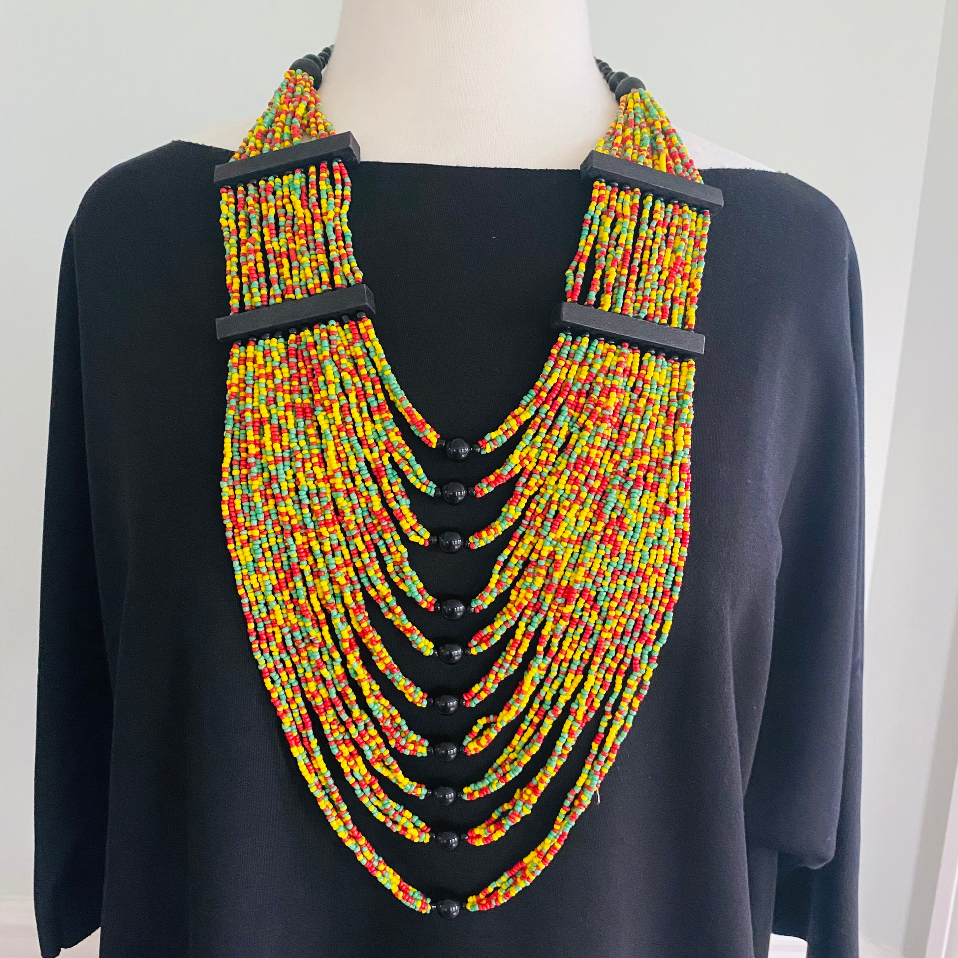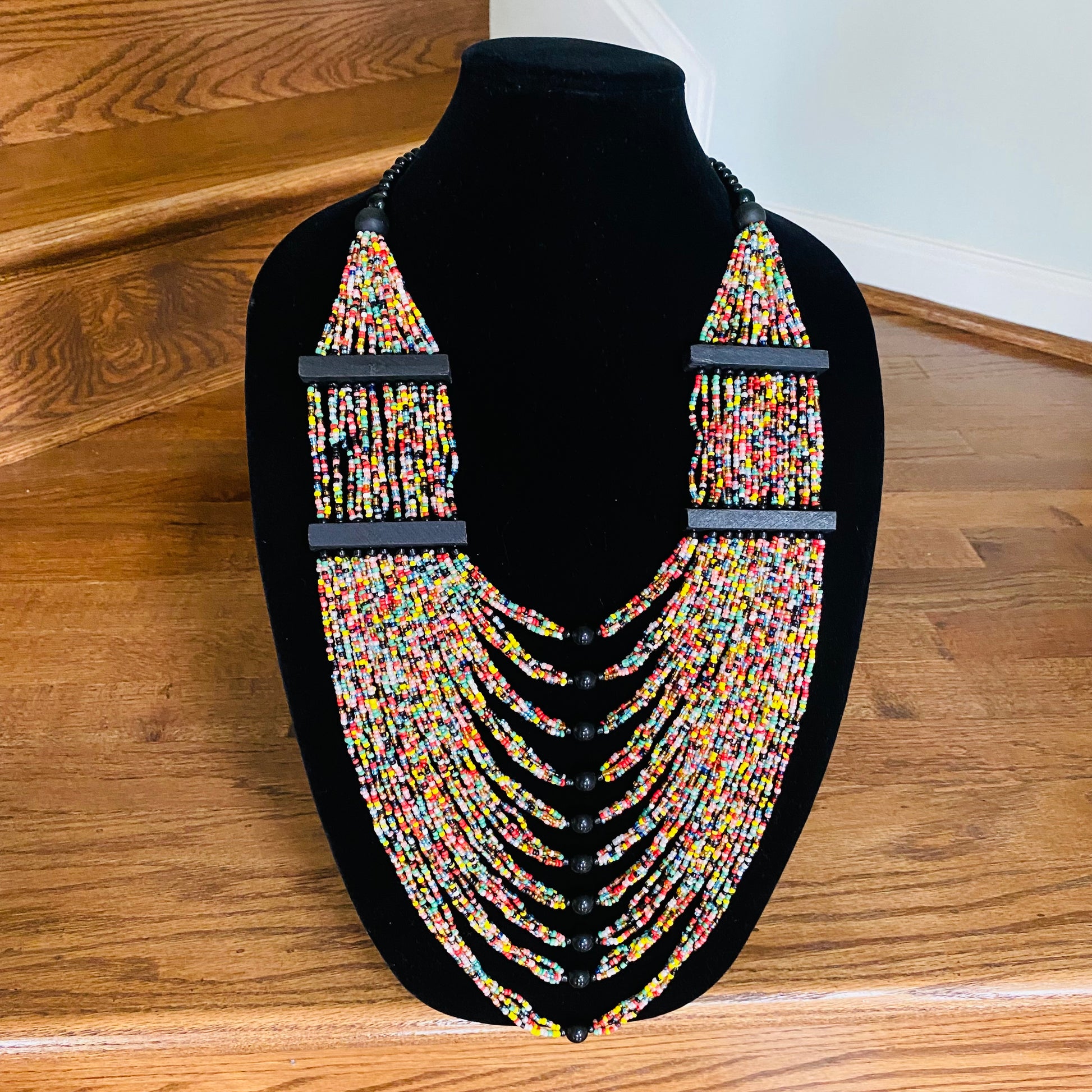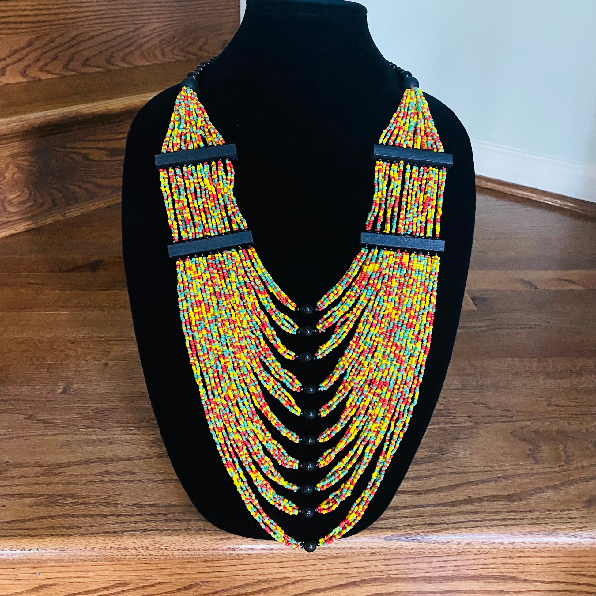 African beads, intricately strung together to create this elegant statement necklace; wear it anytime and anywhere; it can be dressed up or down for a casual look.