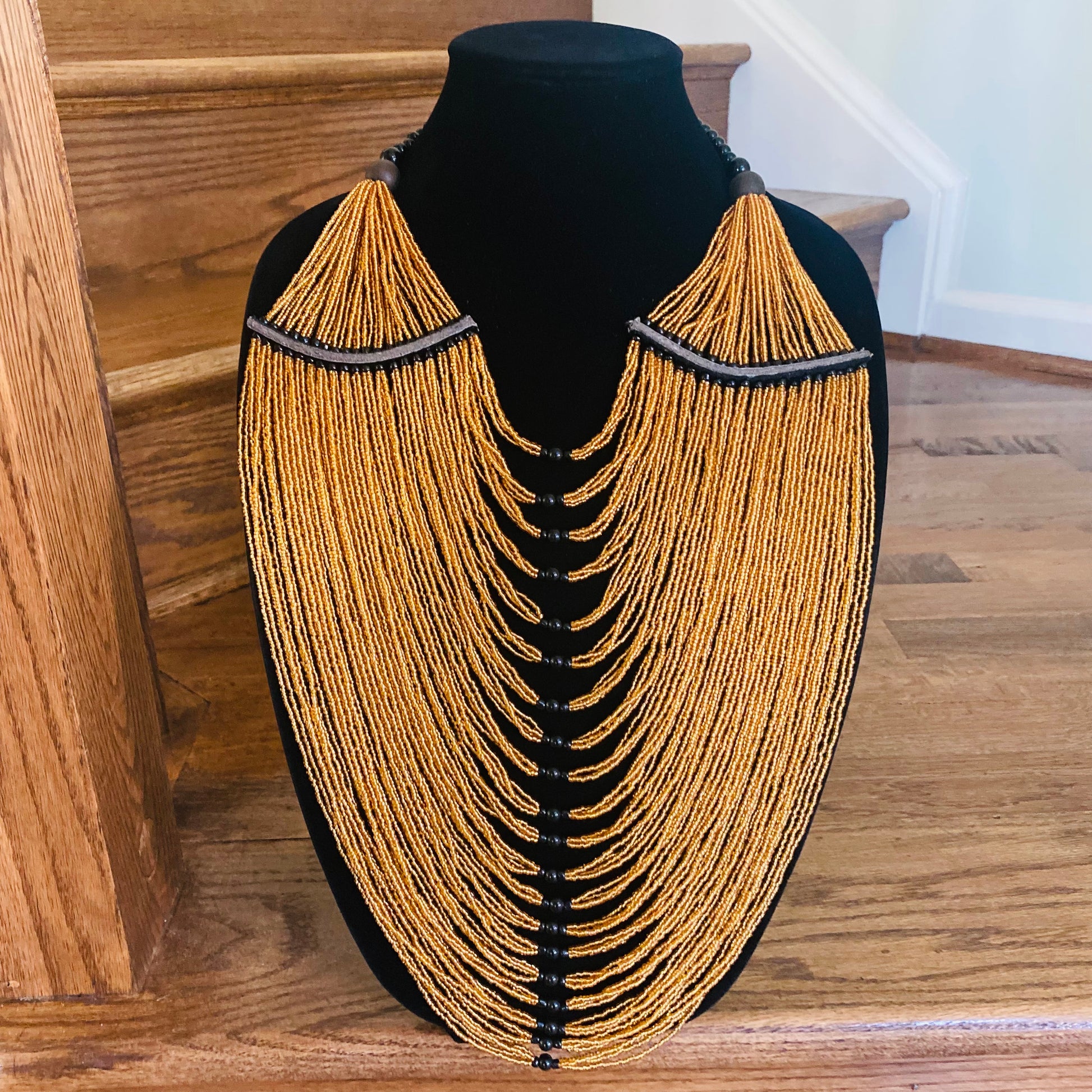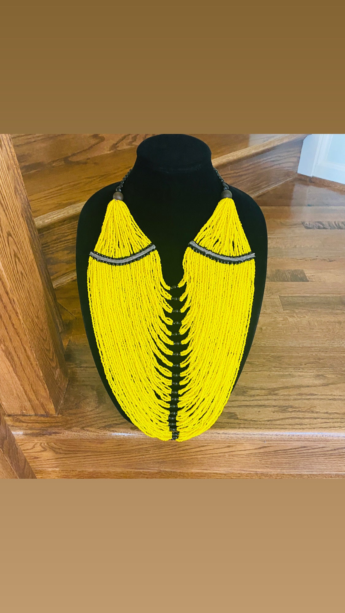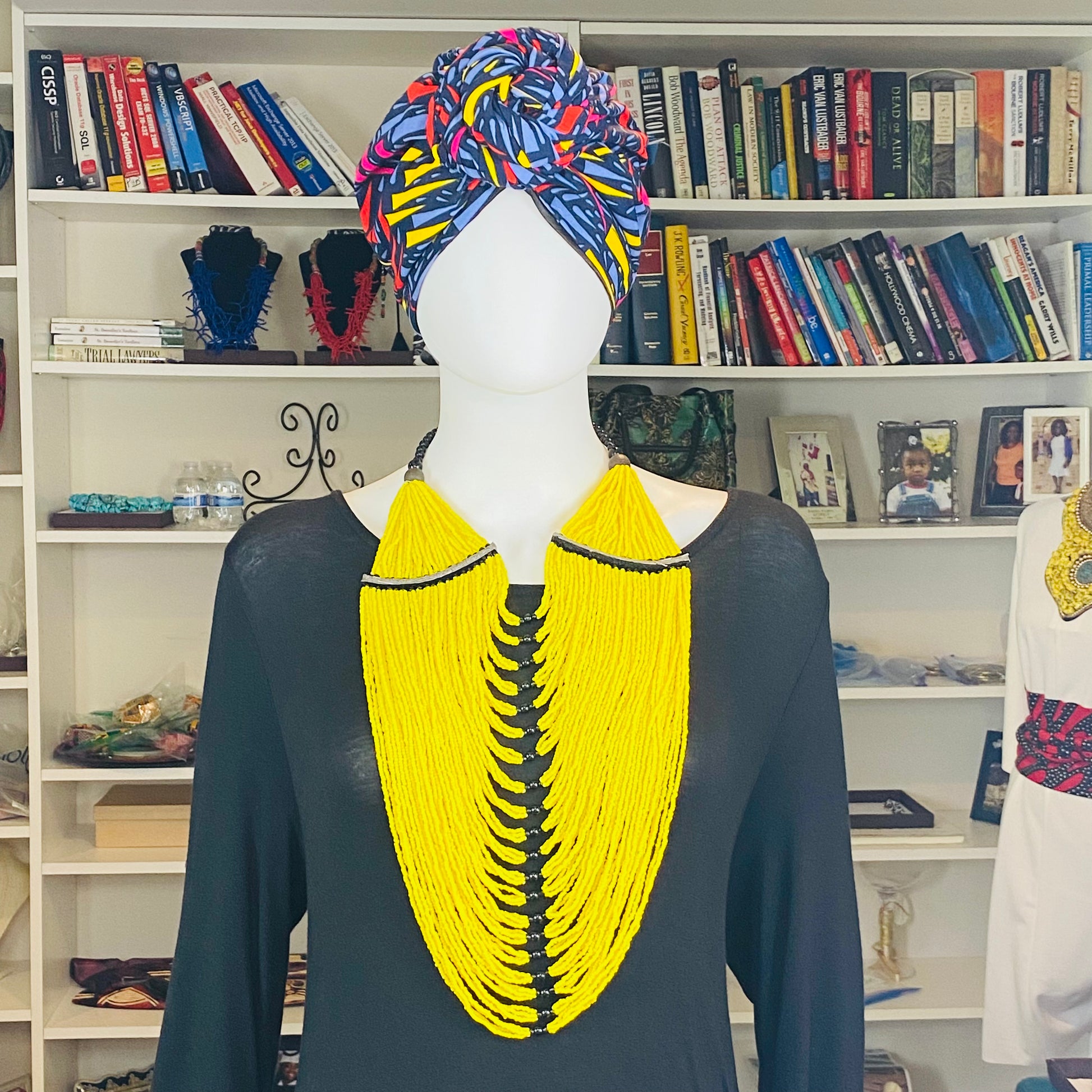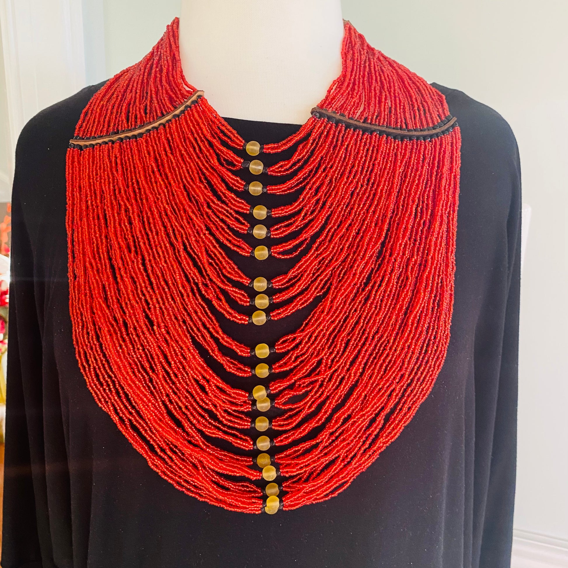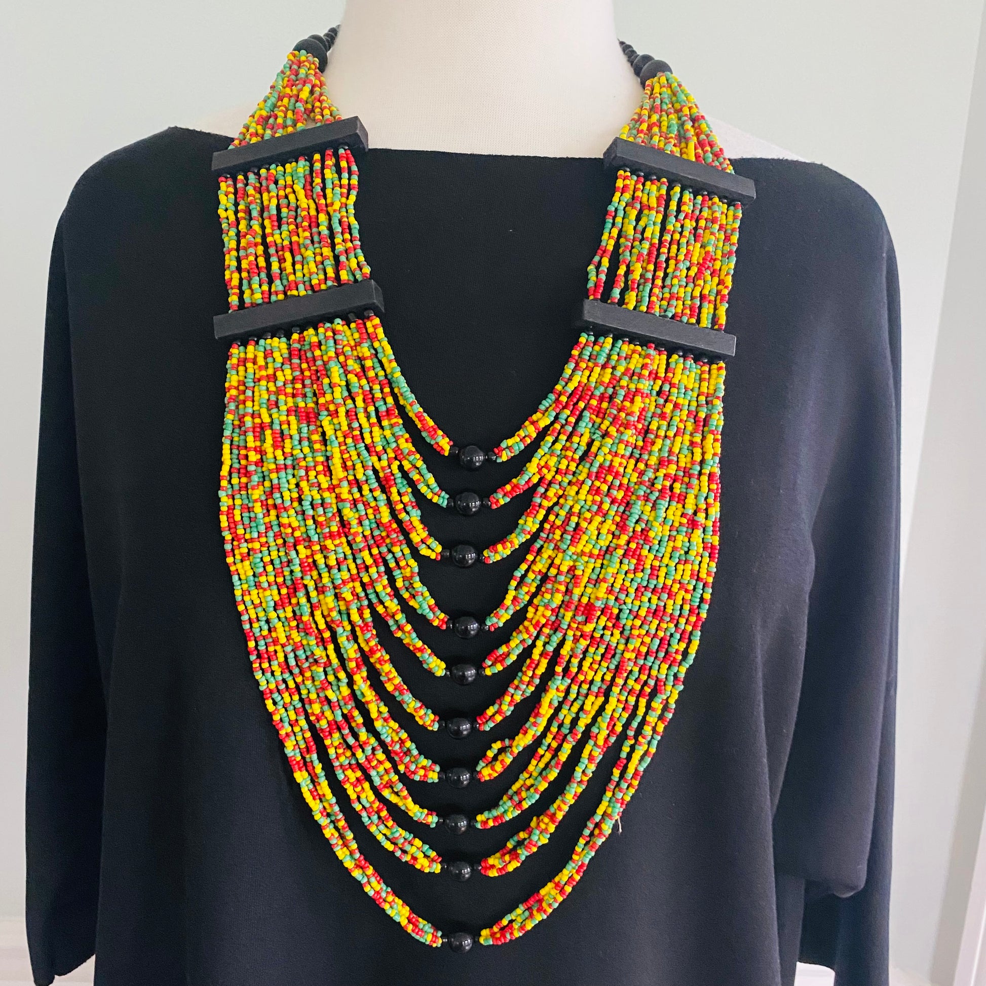 African beads, intricately strung together to create this elegant statement necklace; wear it anytime and anywhere; it can be dressed up or down for a casual look.