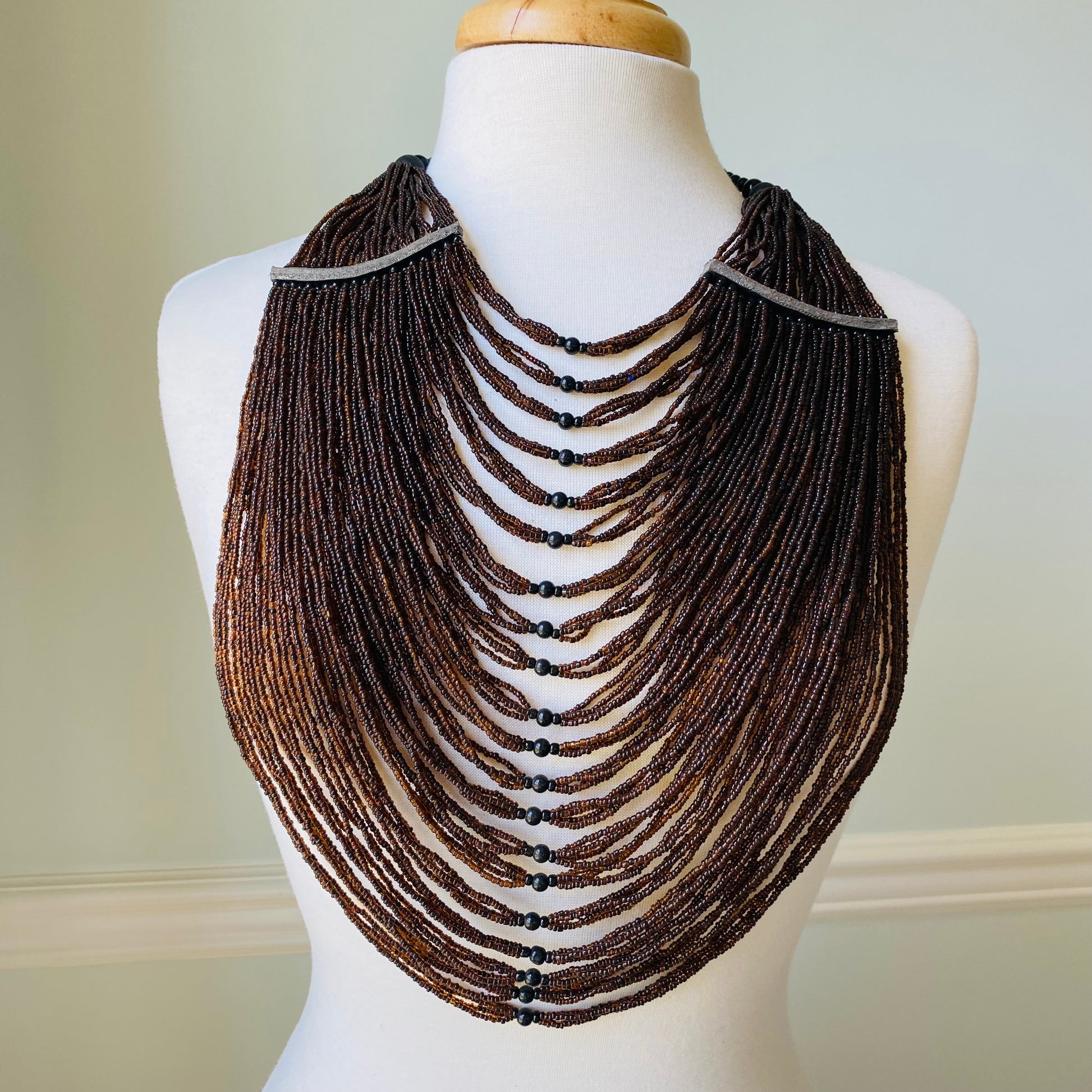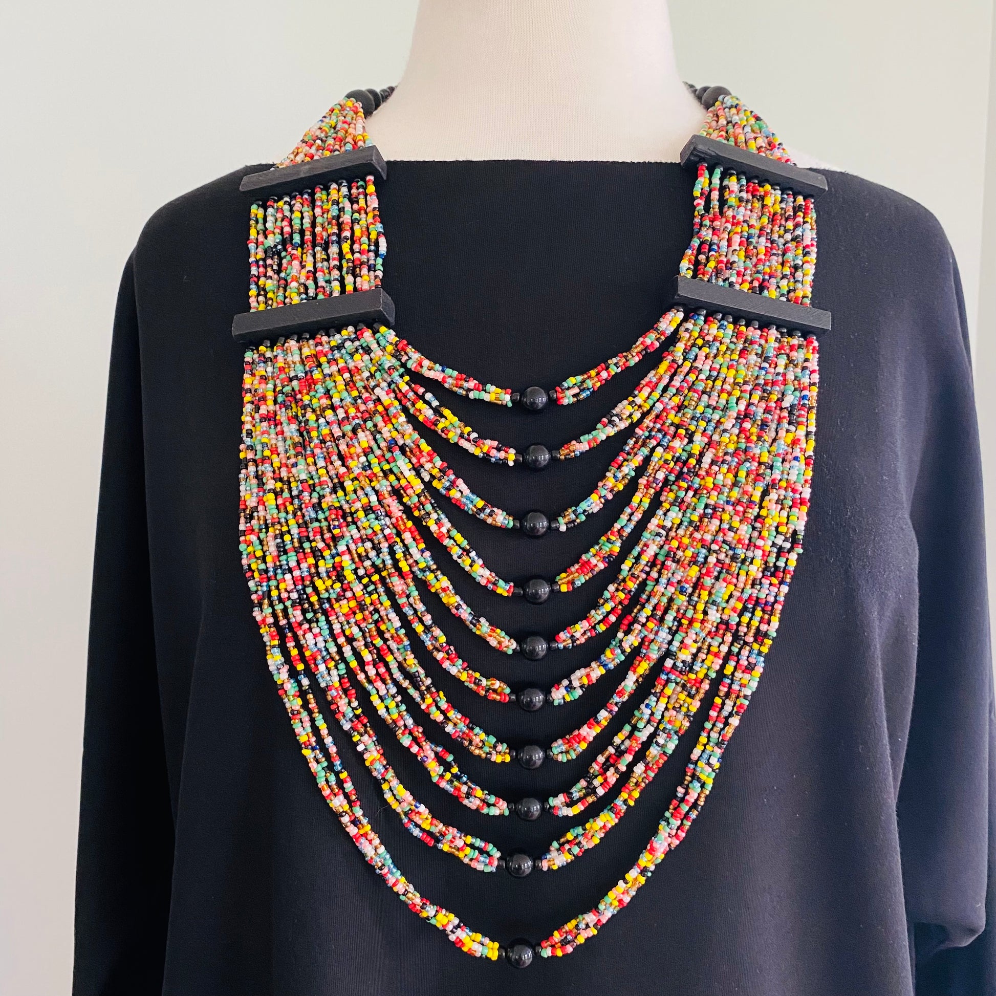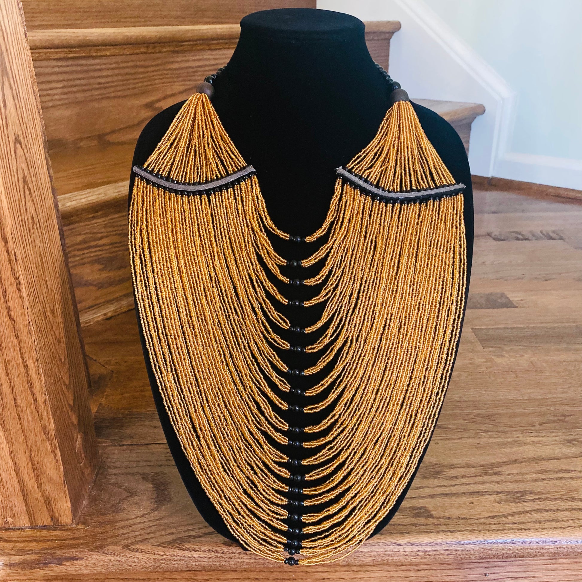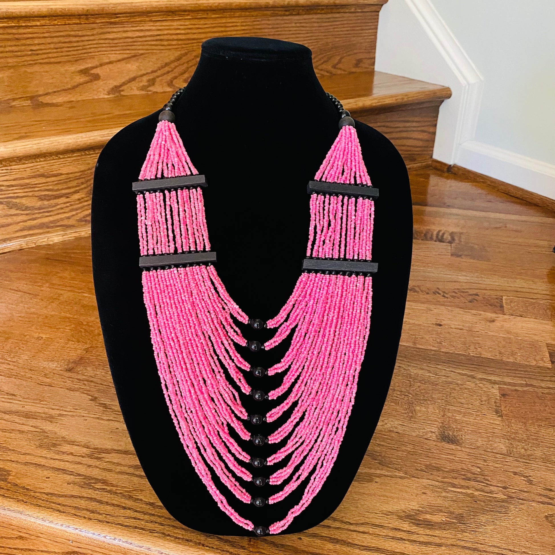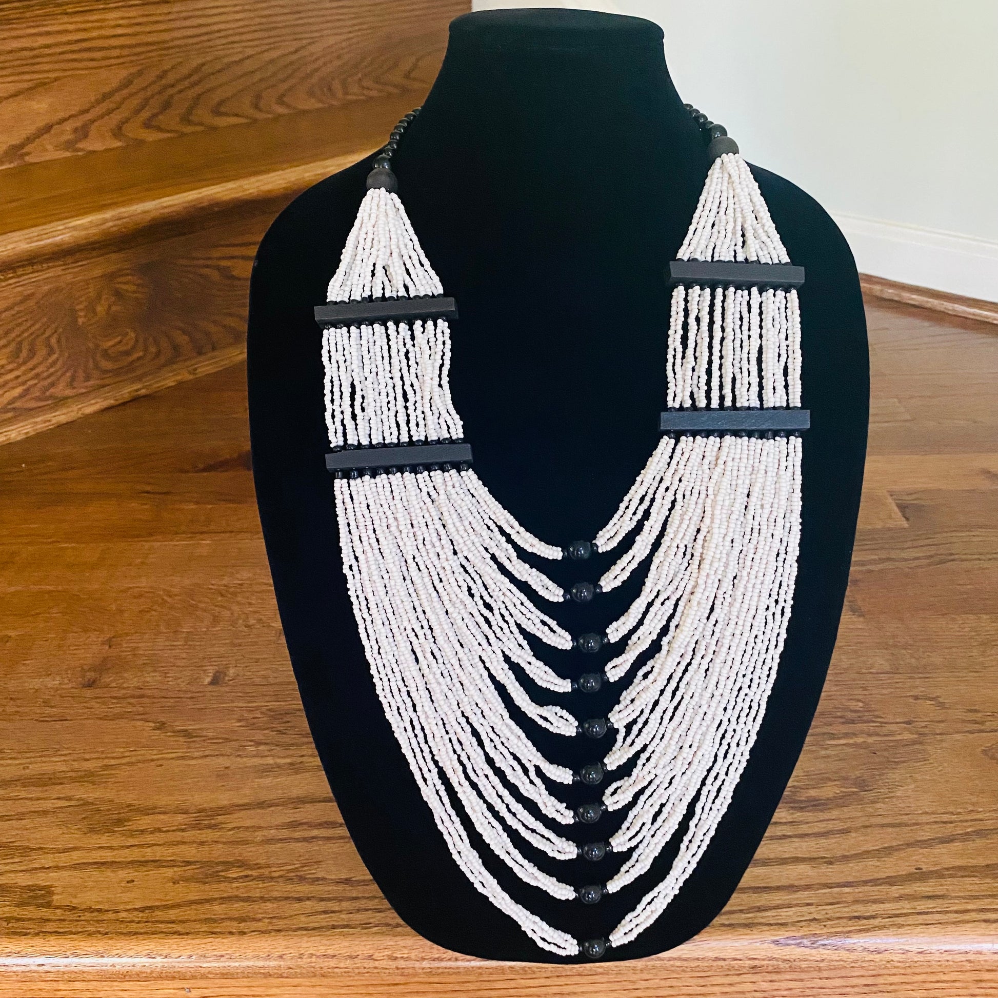 African beads, intricately strung together to create this elegant statement necklace; wear it anytime and anywhere; it can be dressed up or down for a casual look.
