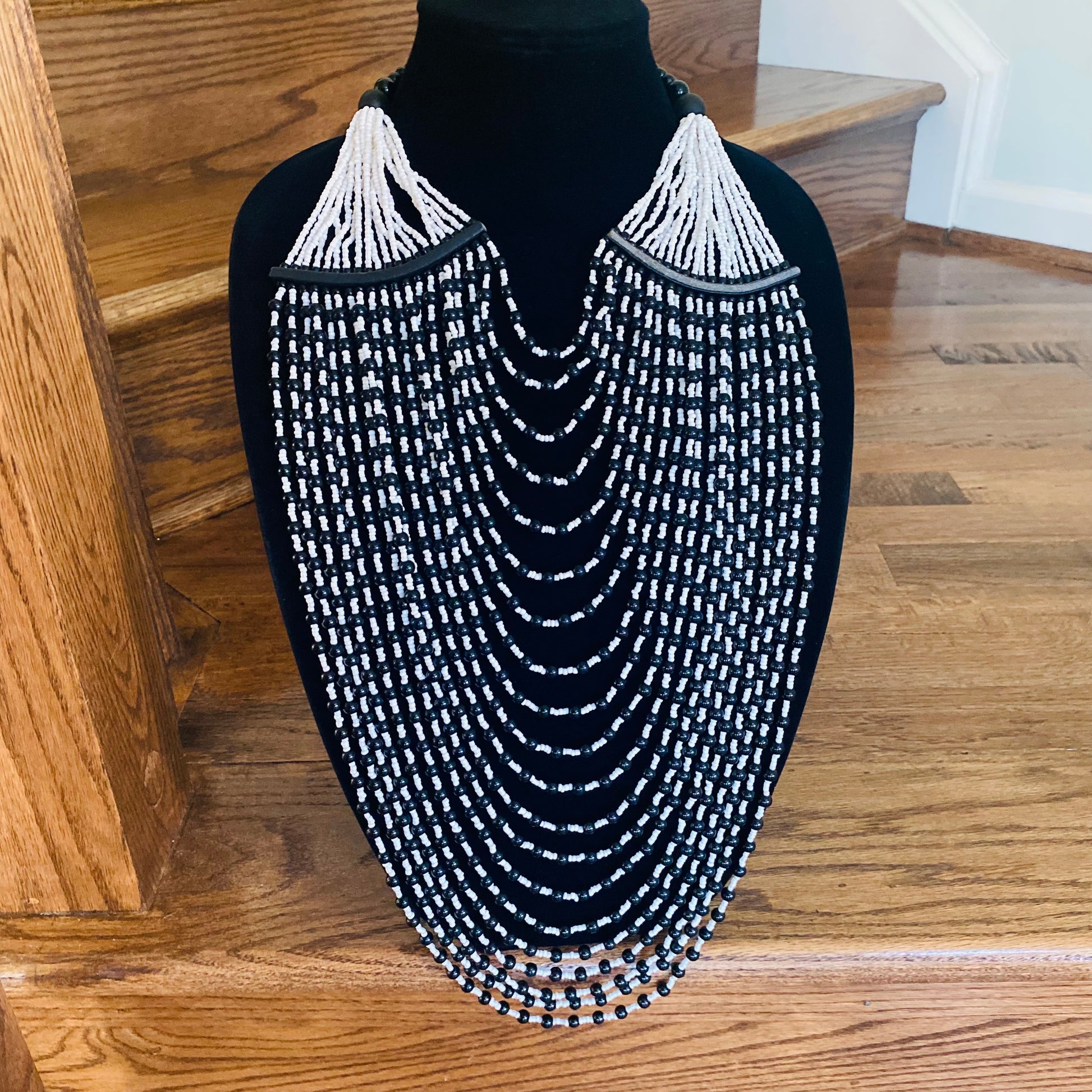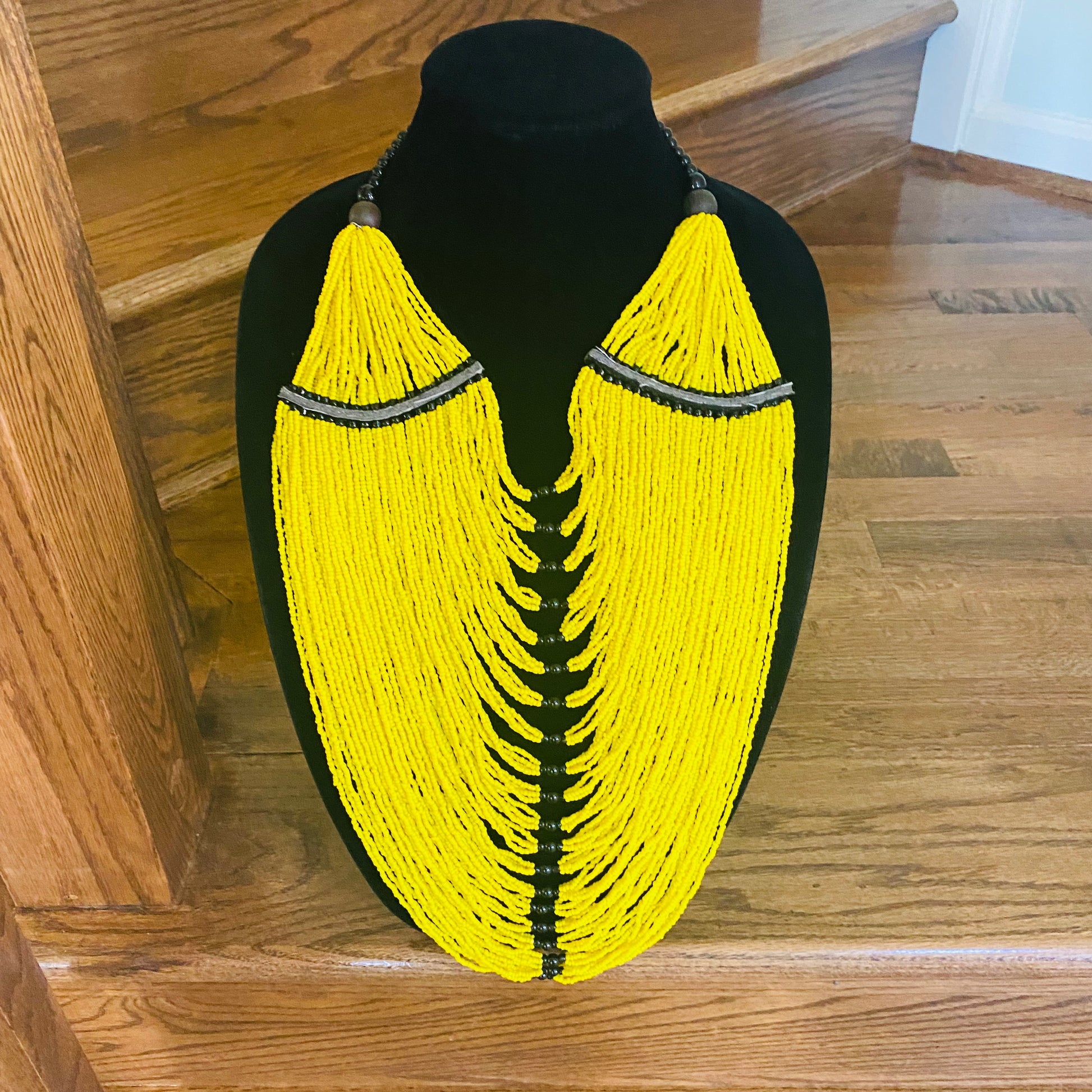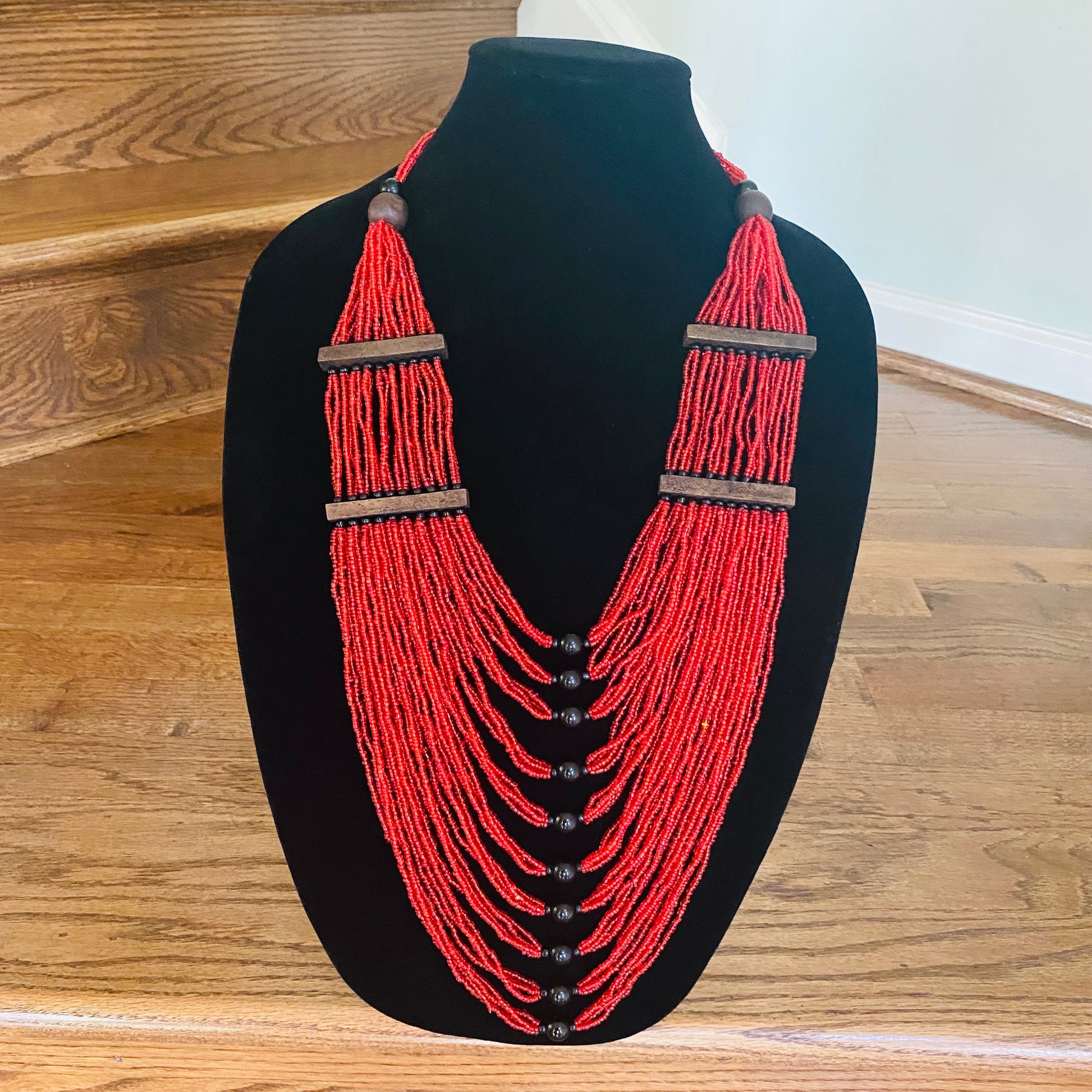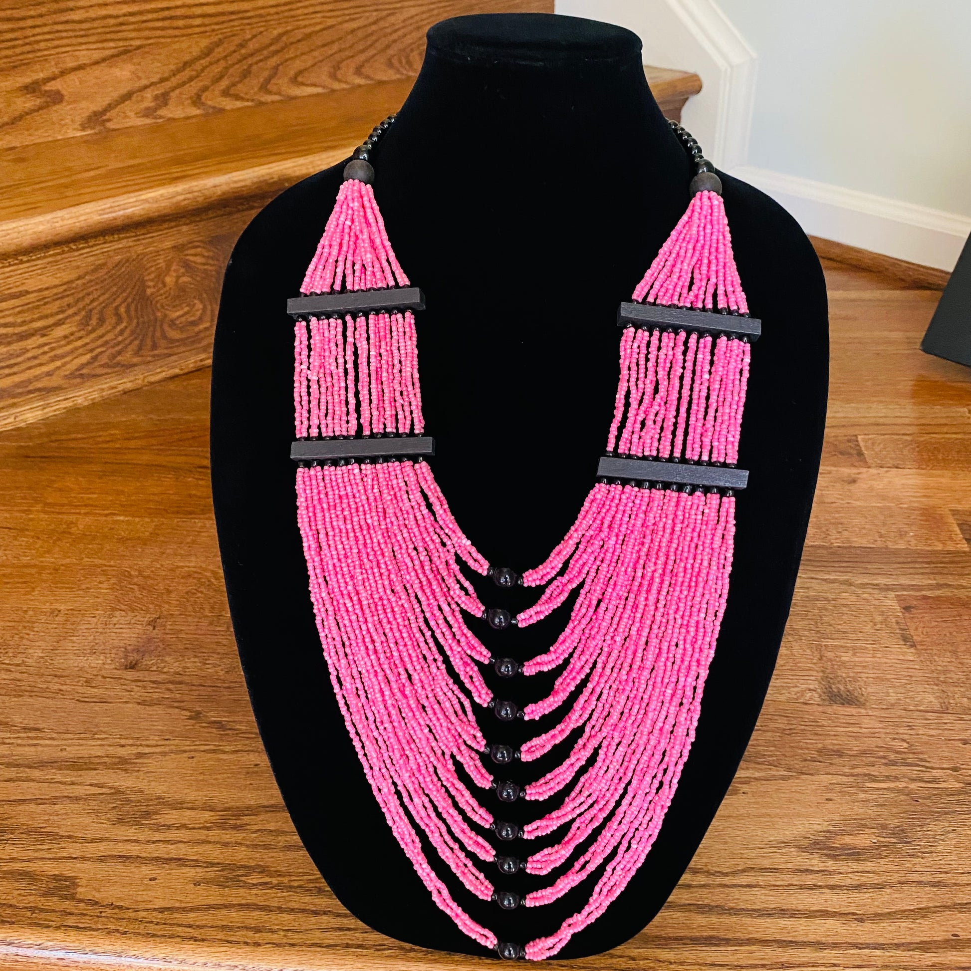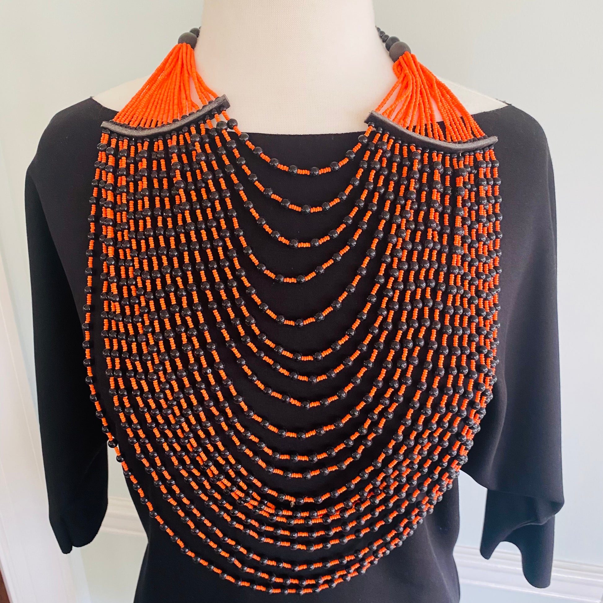 African beads, intricately strung together to create this elegant statement necklace; wear it anytime and anywhere; it can be dressed up or down for a casual look.