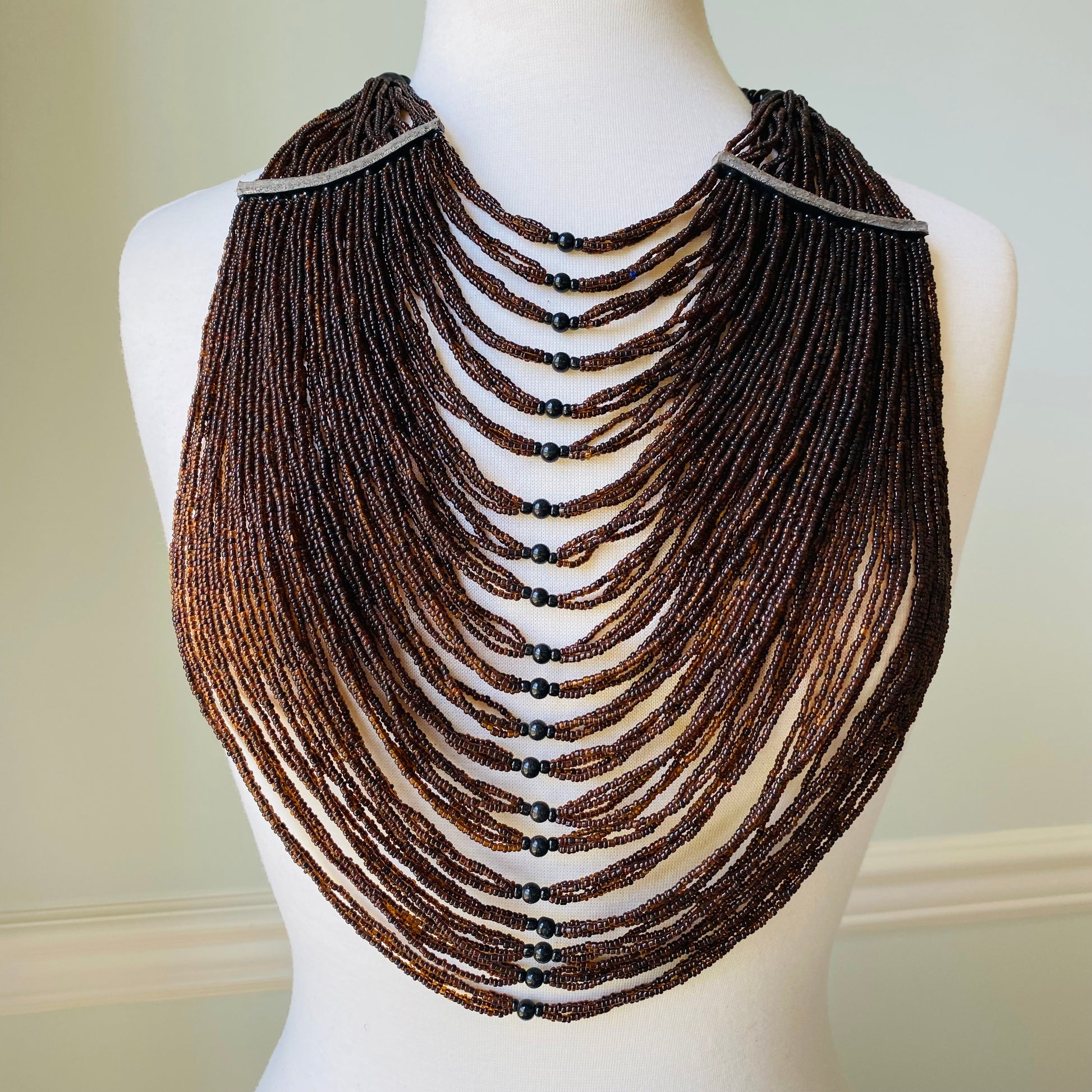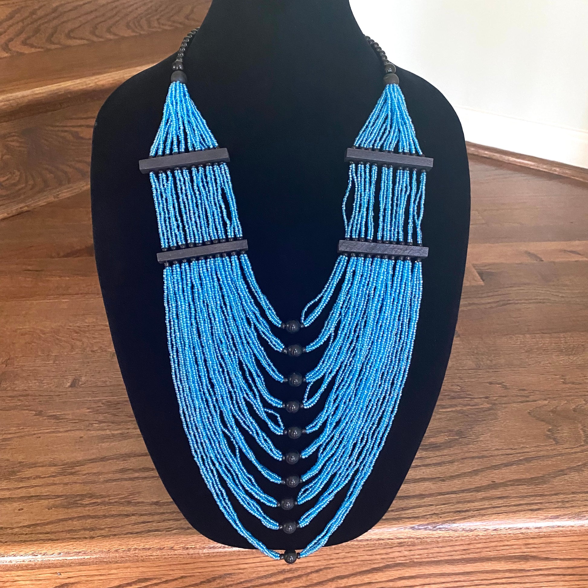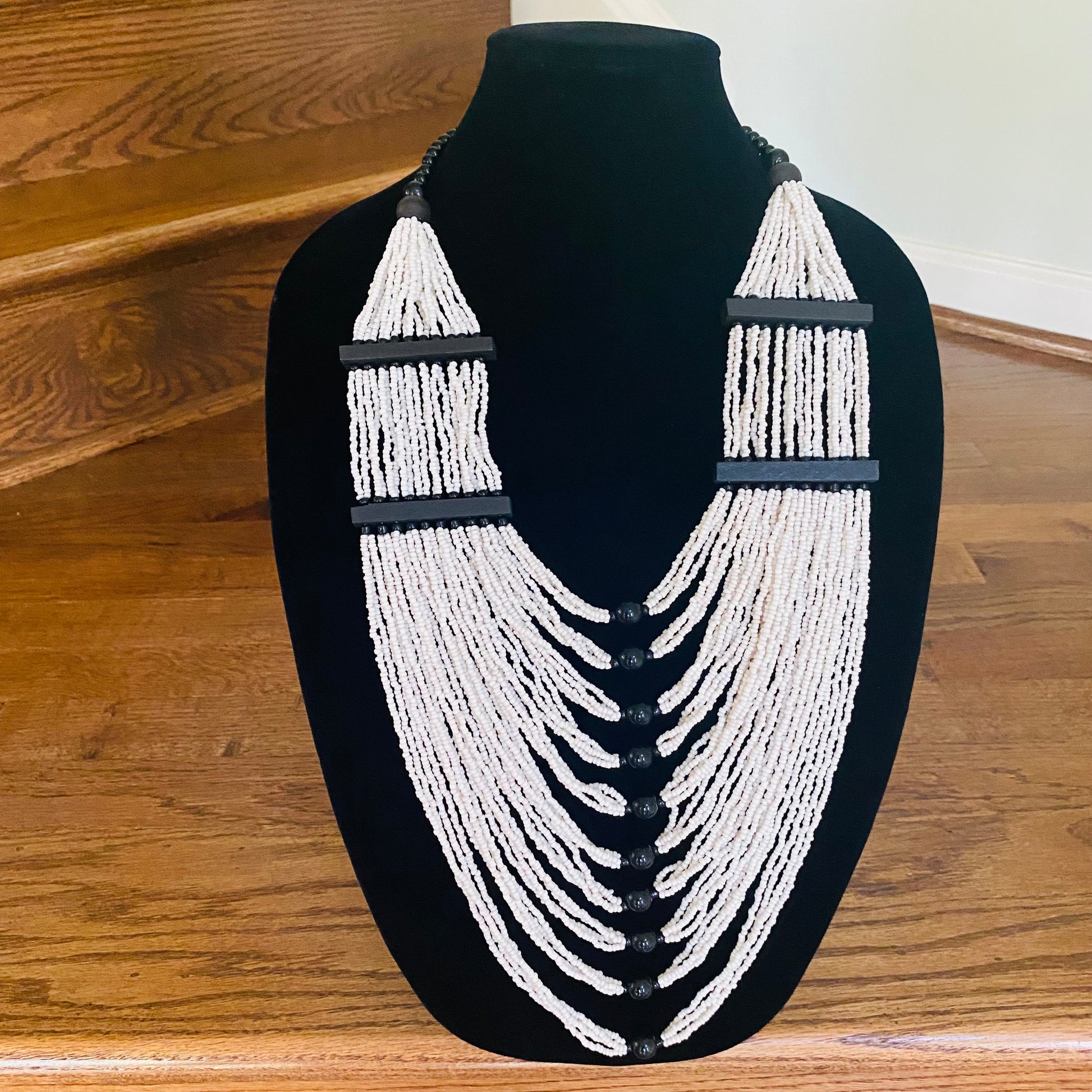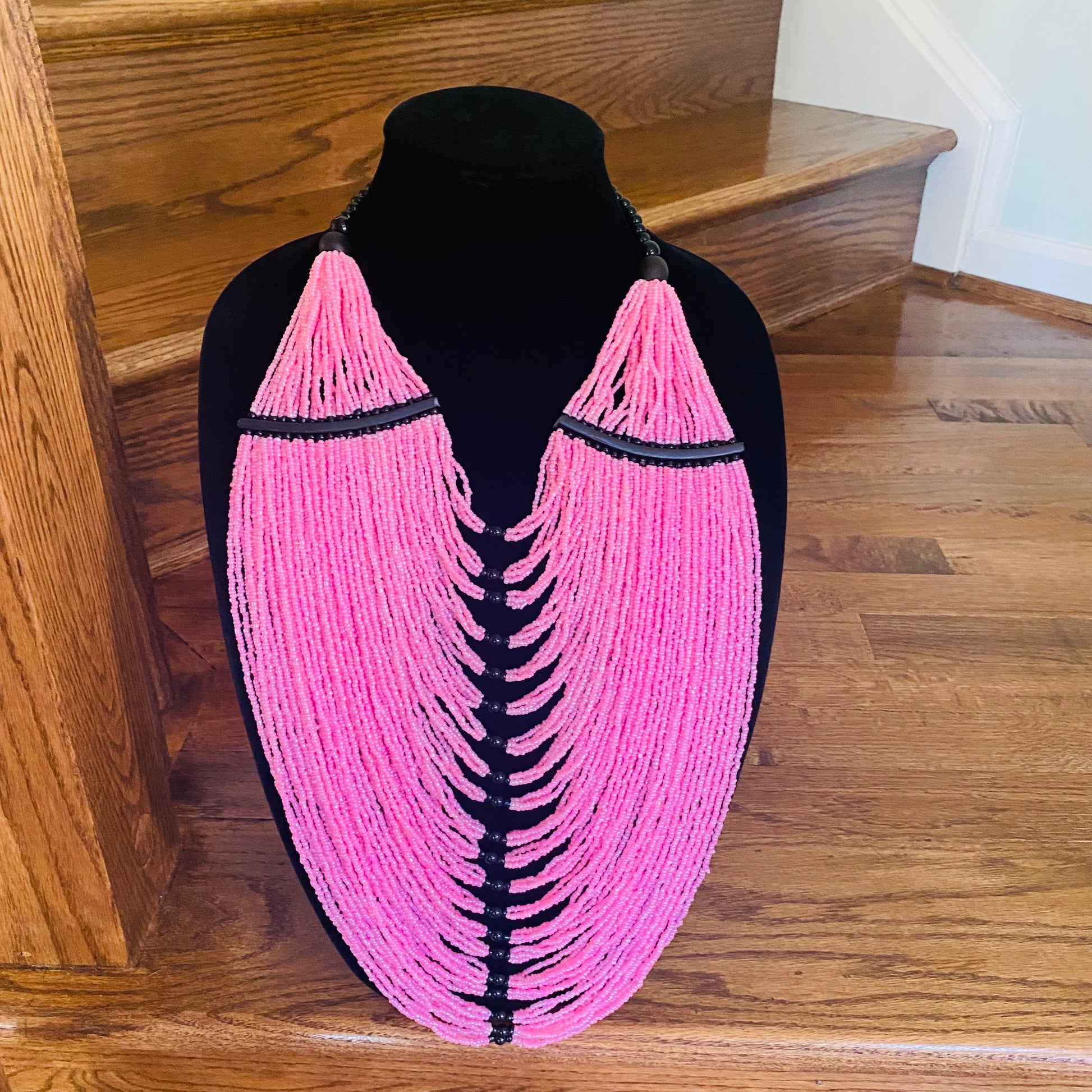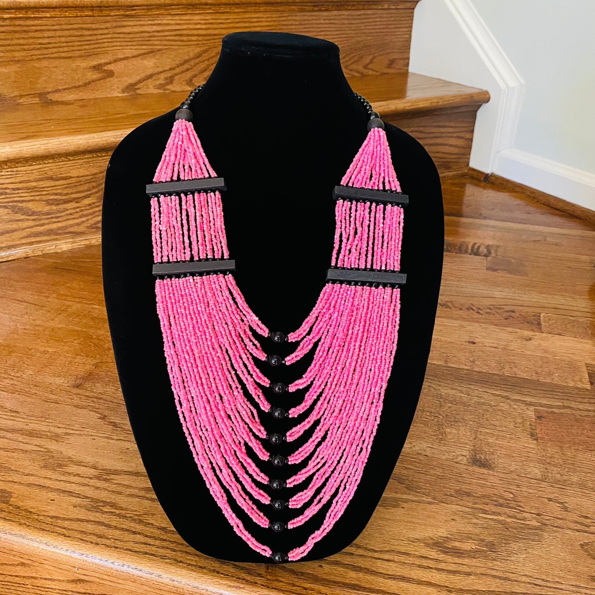 African beads, intricately strung together to create this elegant statement necklace; wear it anytime and anywhere; it can be dressed up or down for a casual look.
