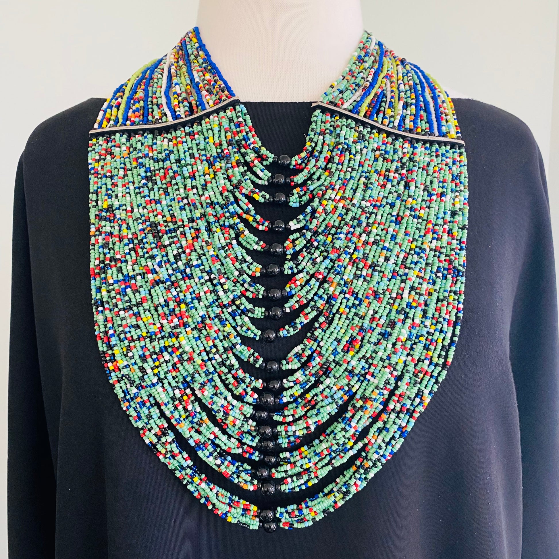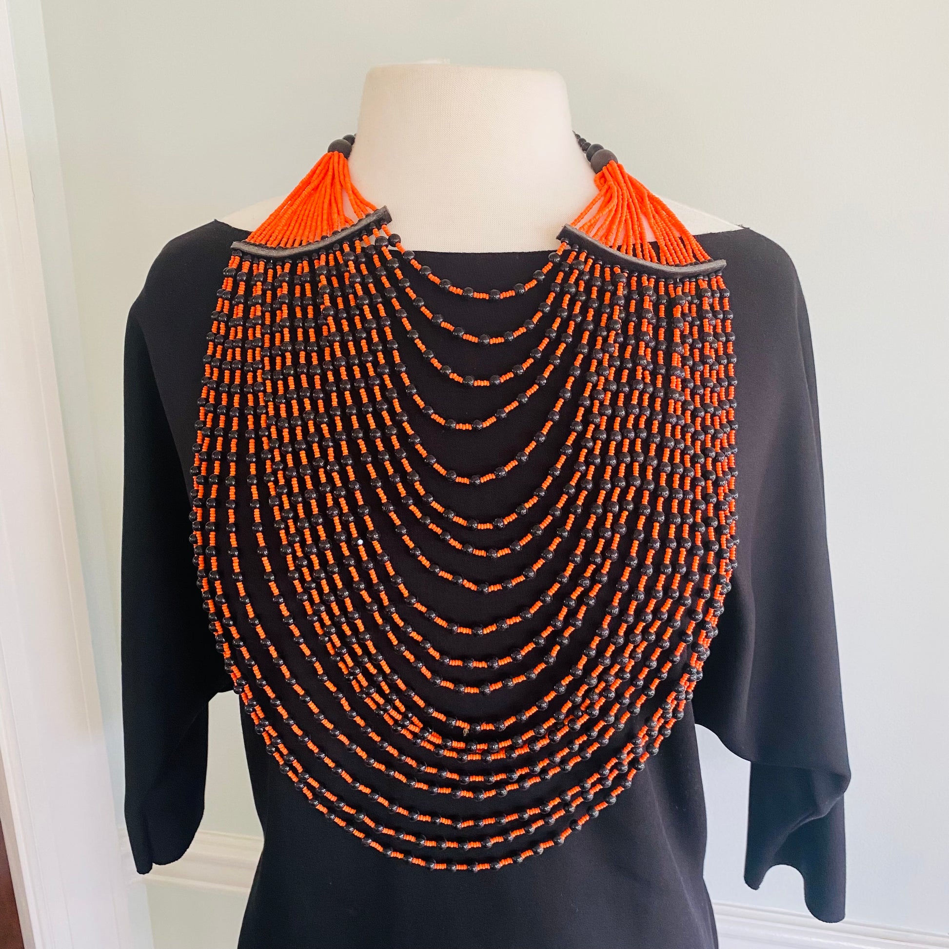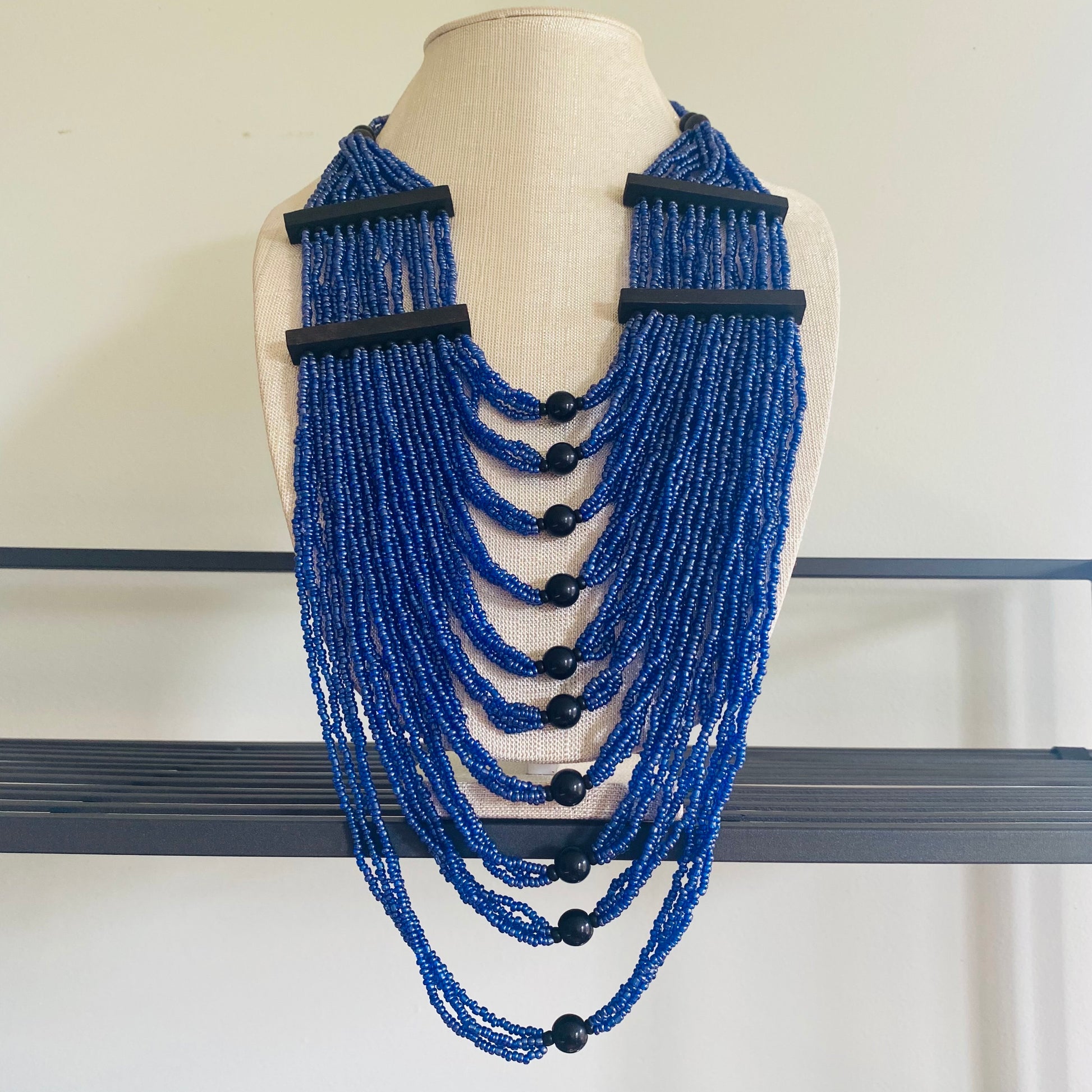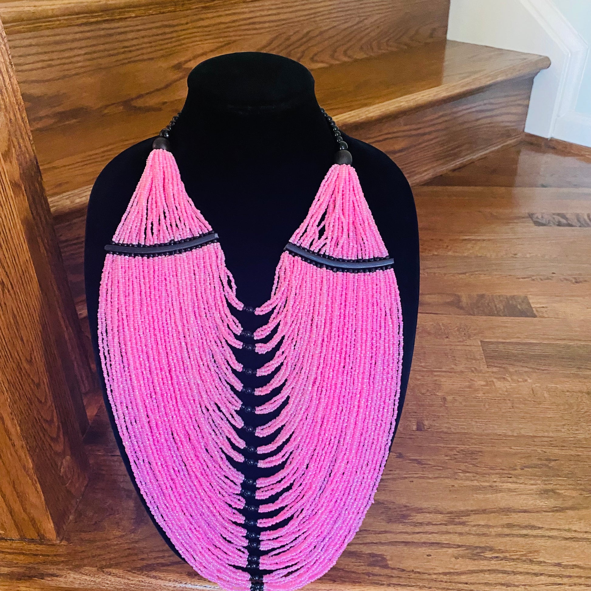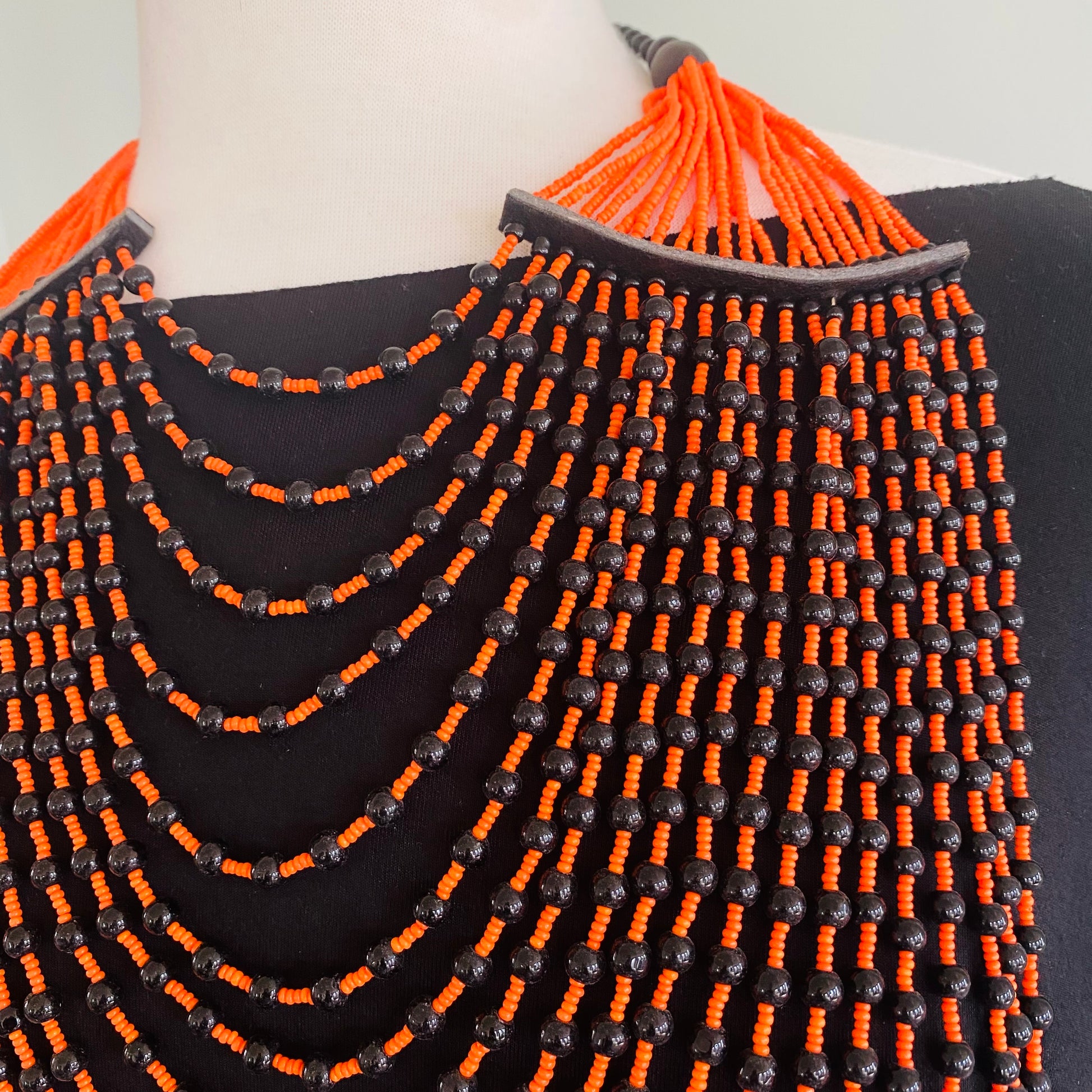 African beads, intricately strung together to create this elegant statement necklace; wear it anytime and anywhere; it can be dressed up or down for a casual look.