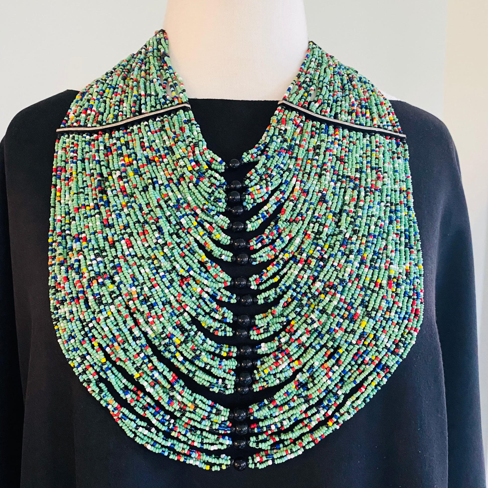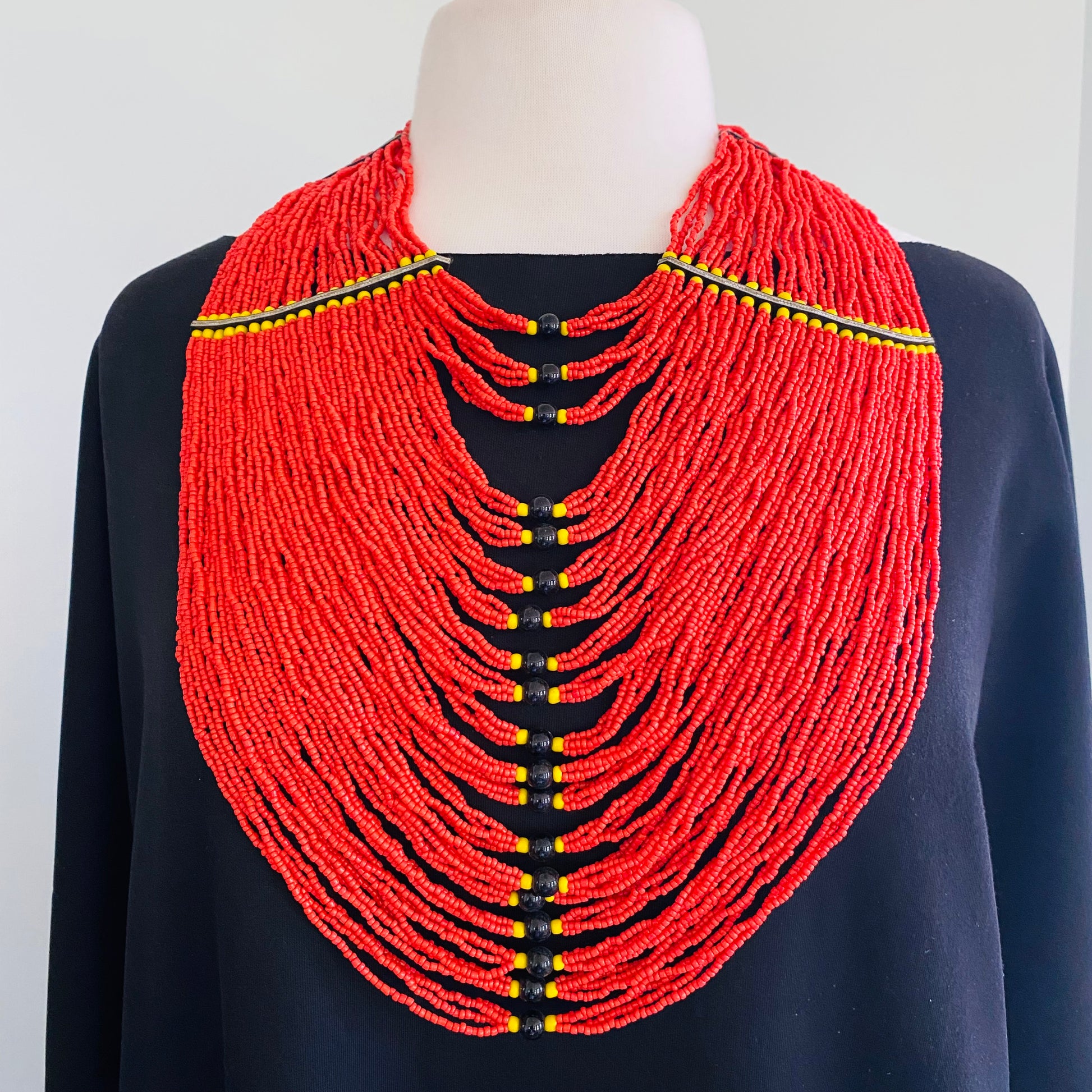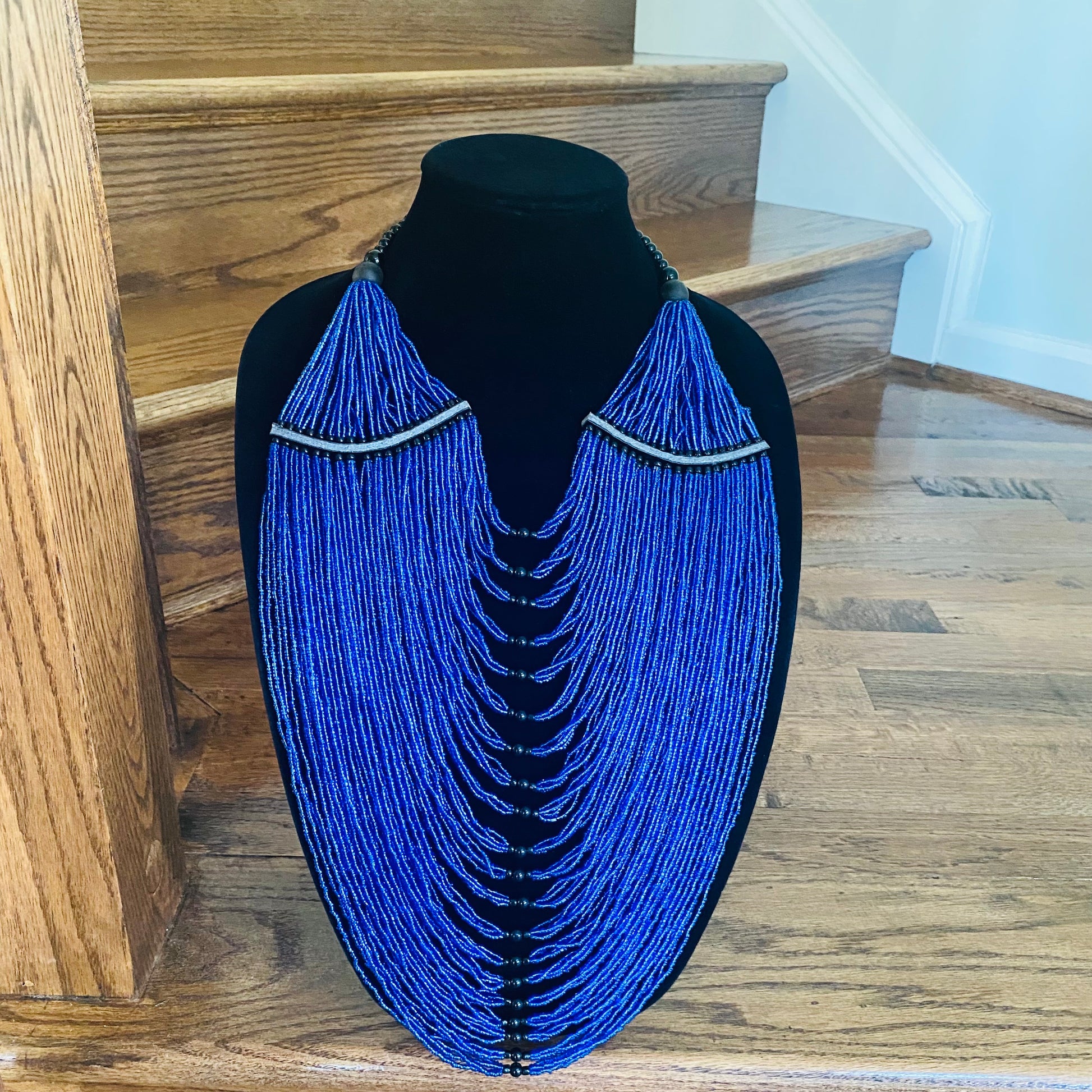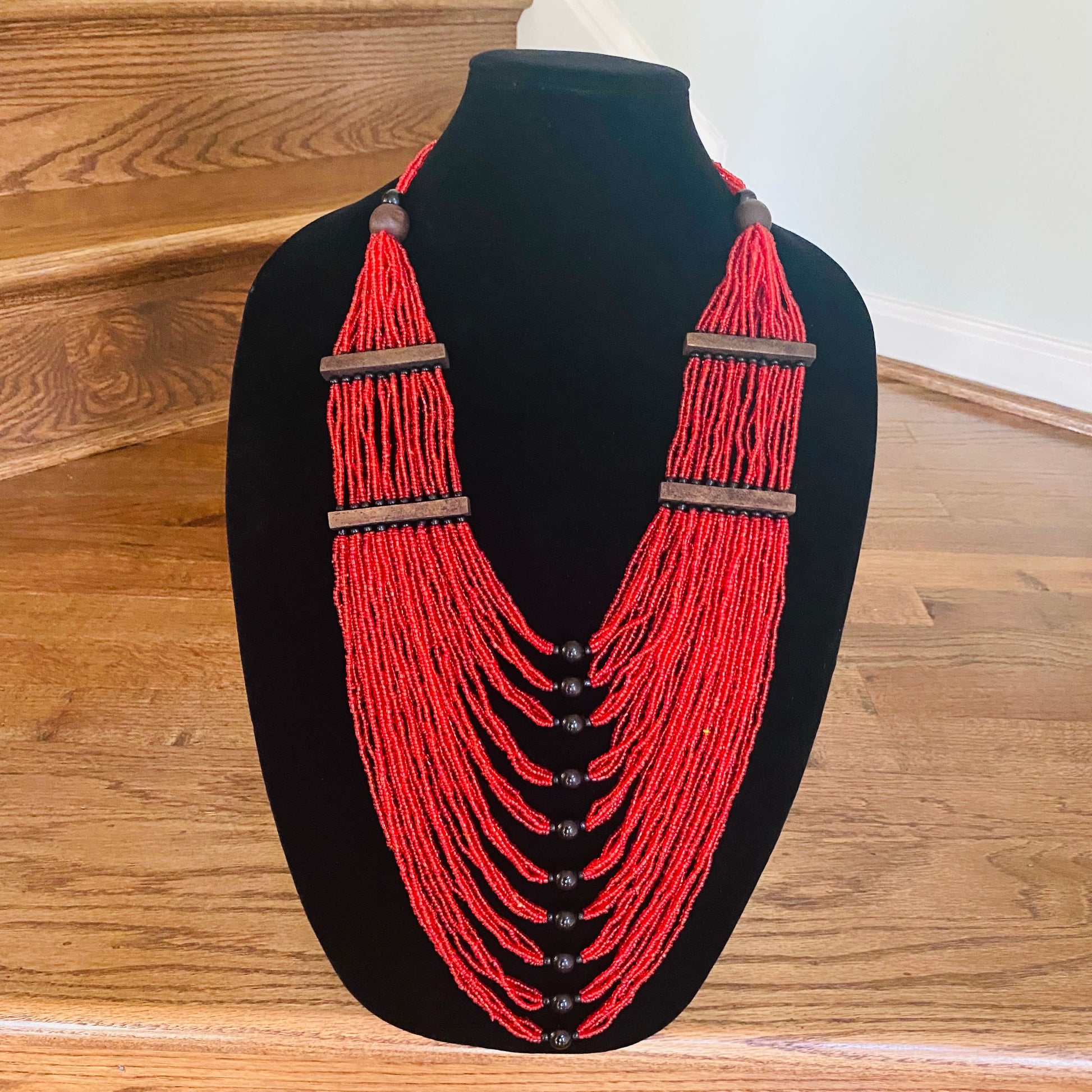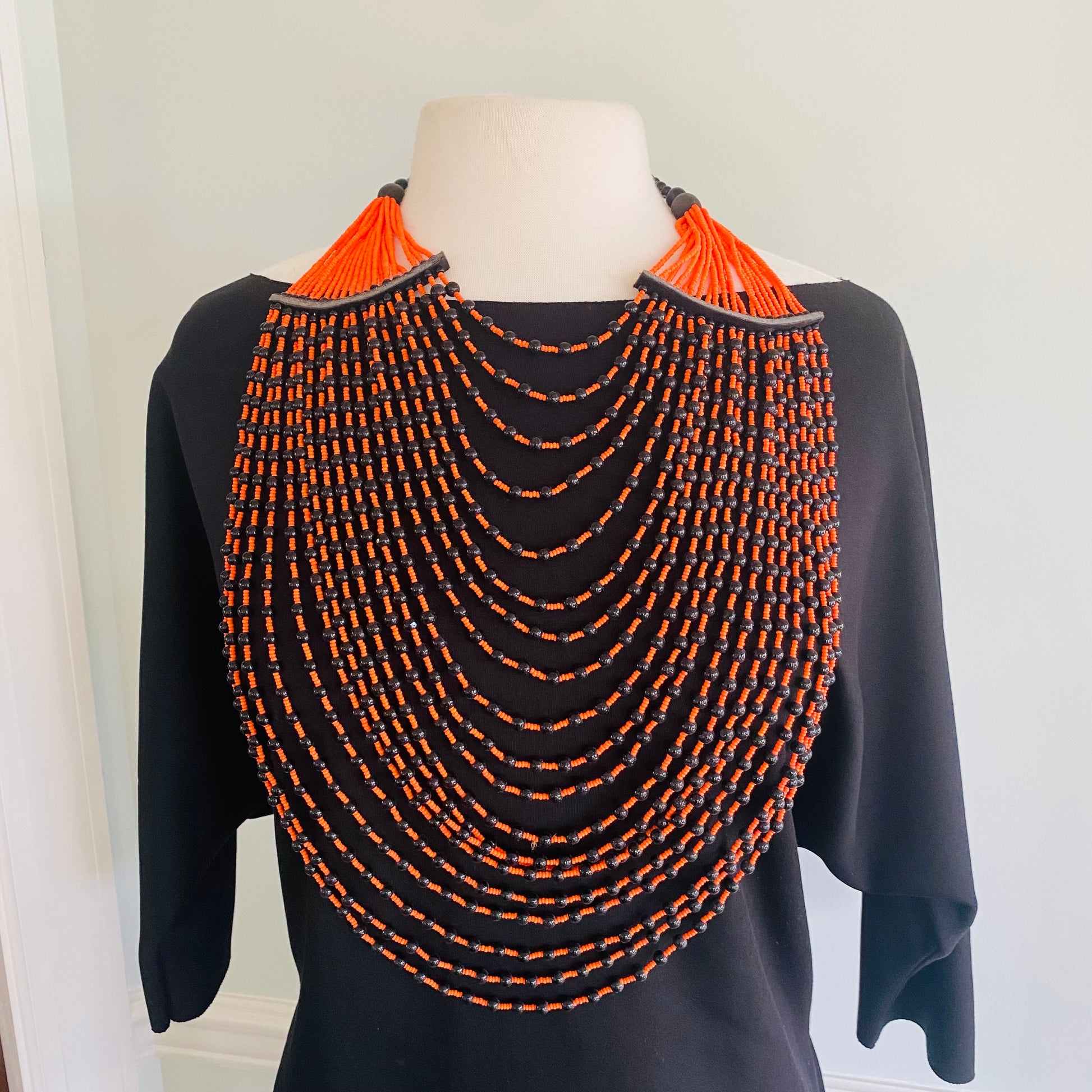 African beads, intricately strung together to create this elegant statement necklace; wear it anytime and anywhere; it can be dressed up or down for a casual look.