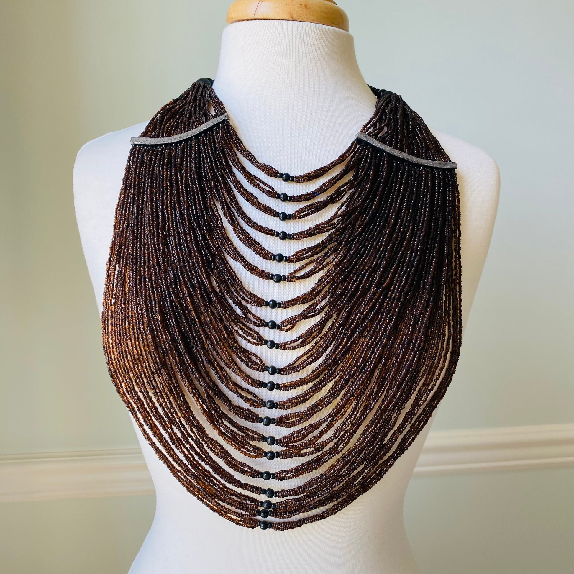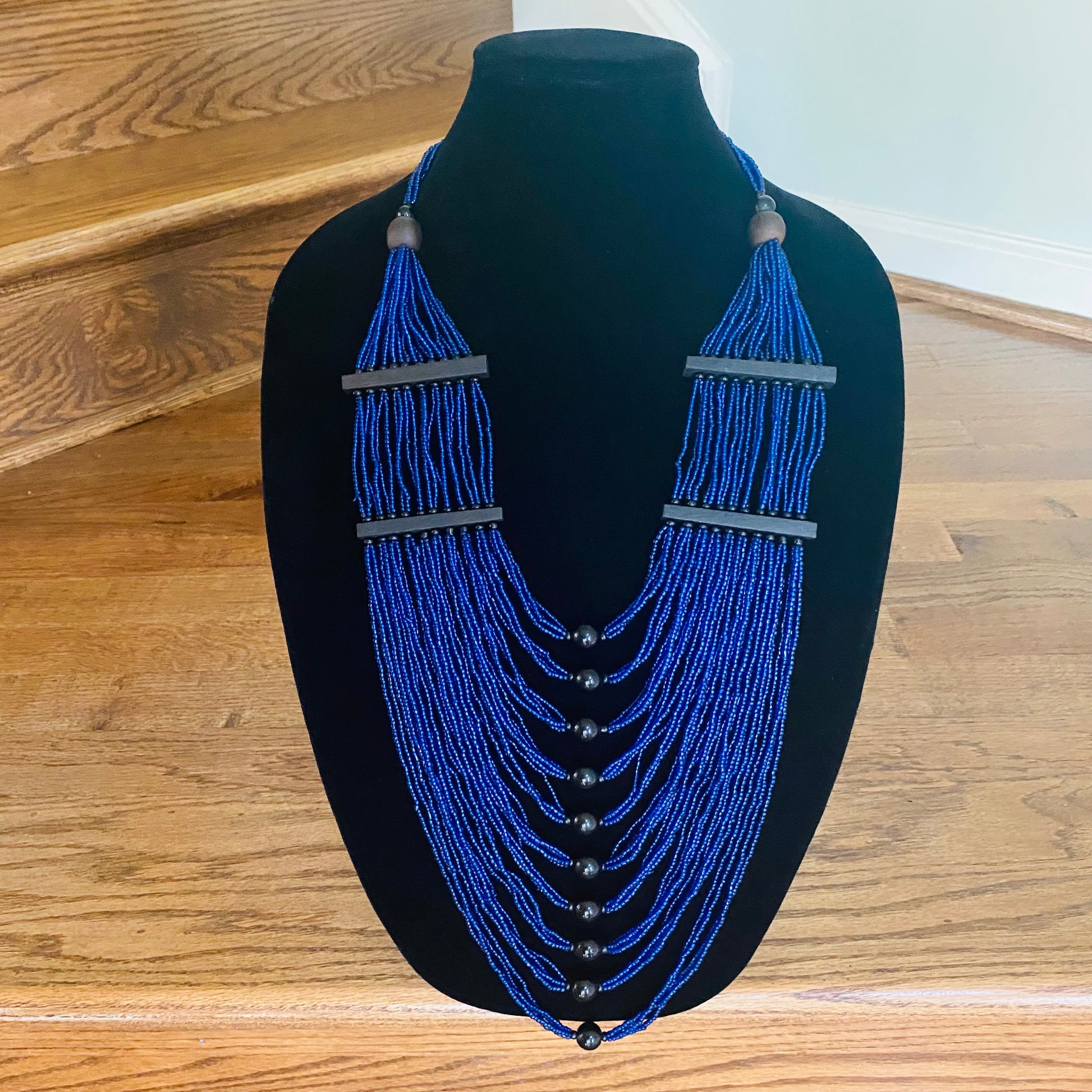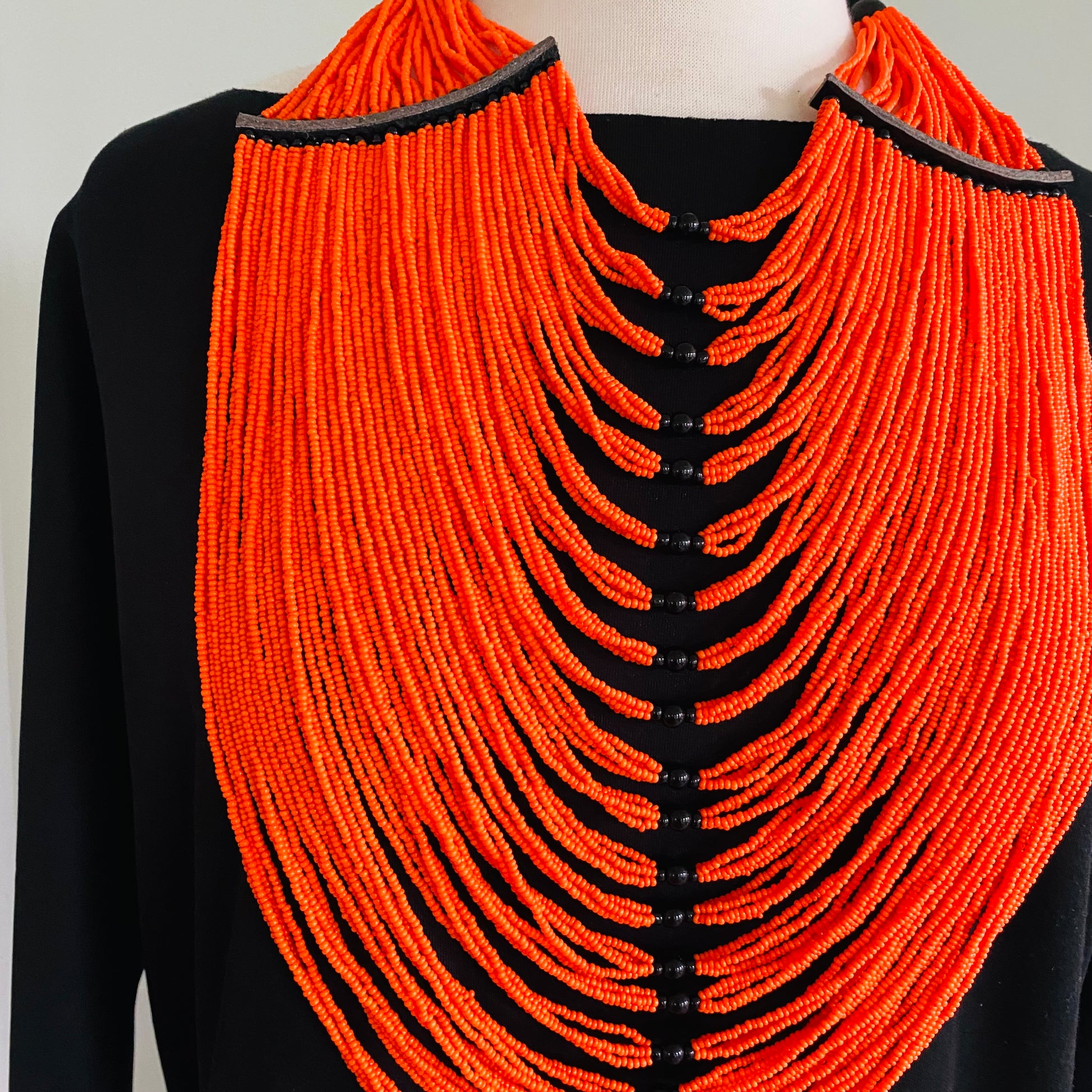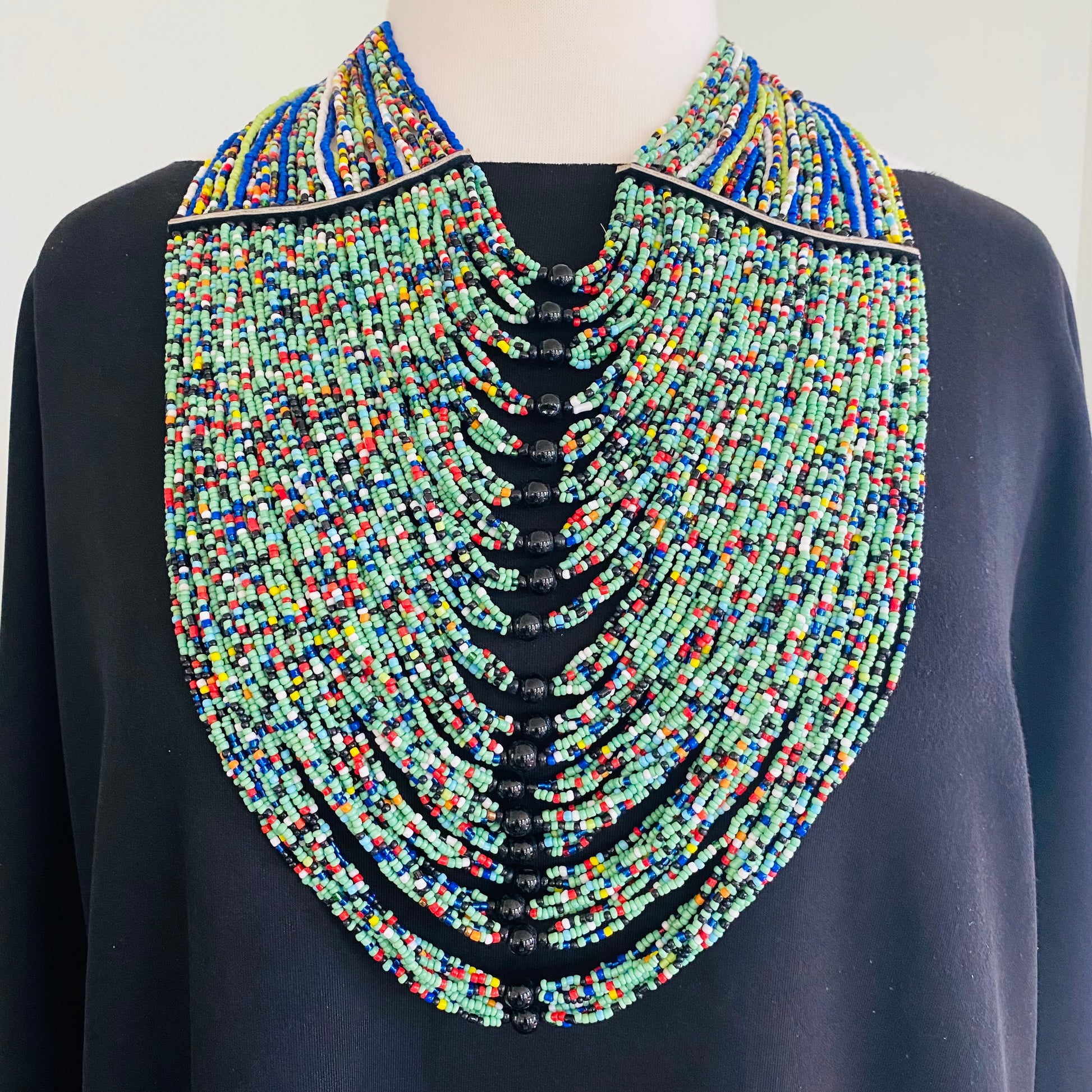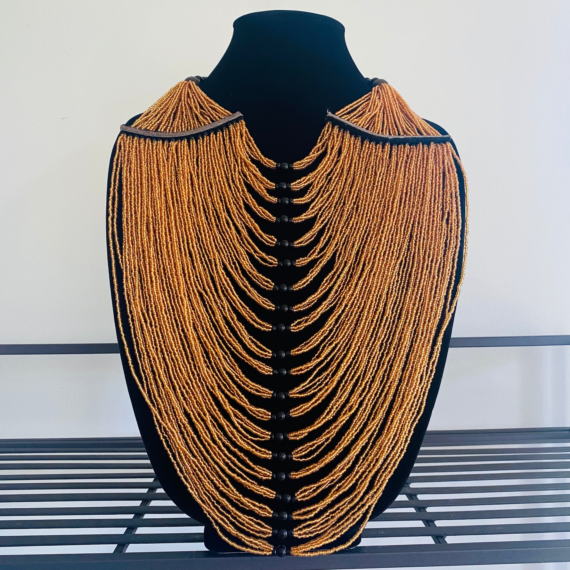 African beads, intricately strung together to create this elegant statement necklace; wear it anytime and anywhere; it can be dressed up or down for a casual look.