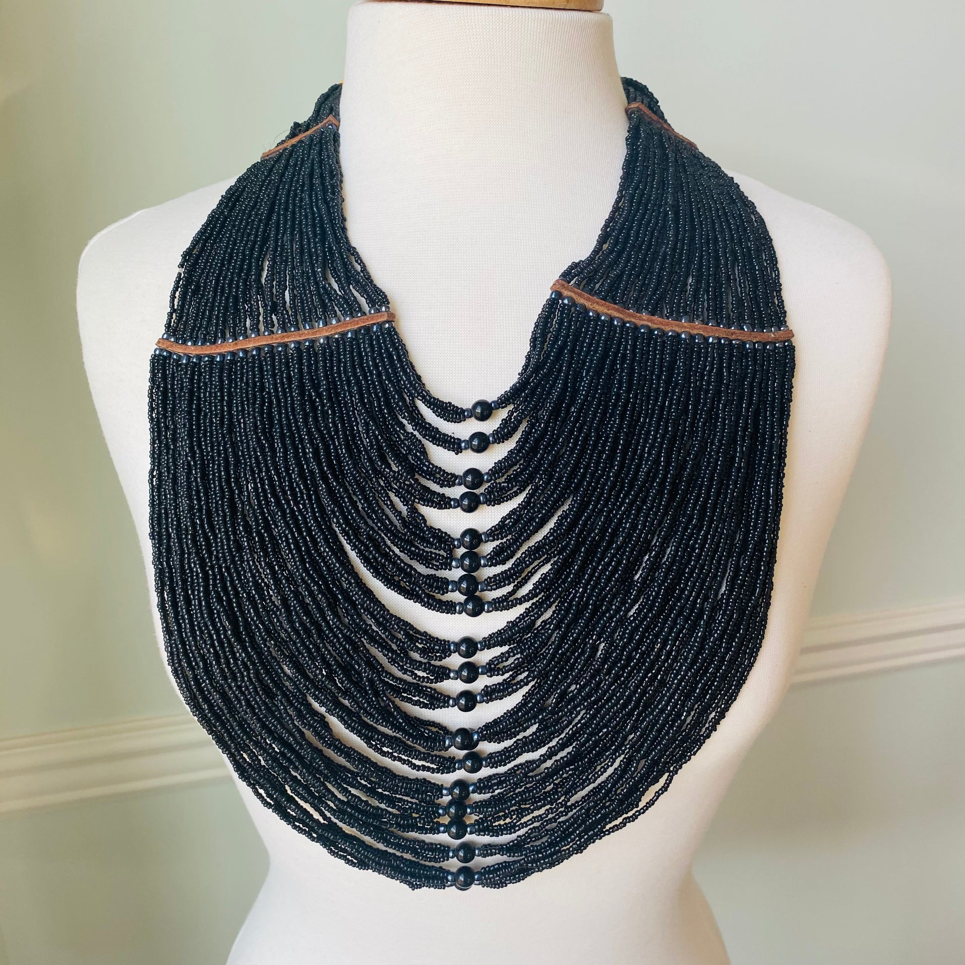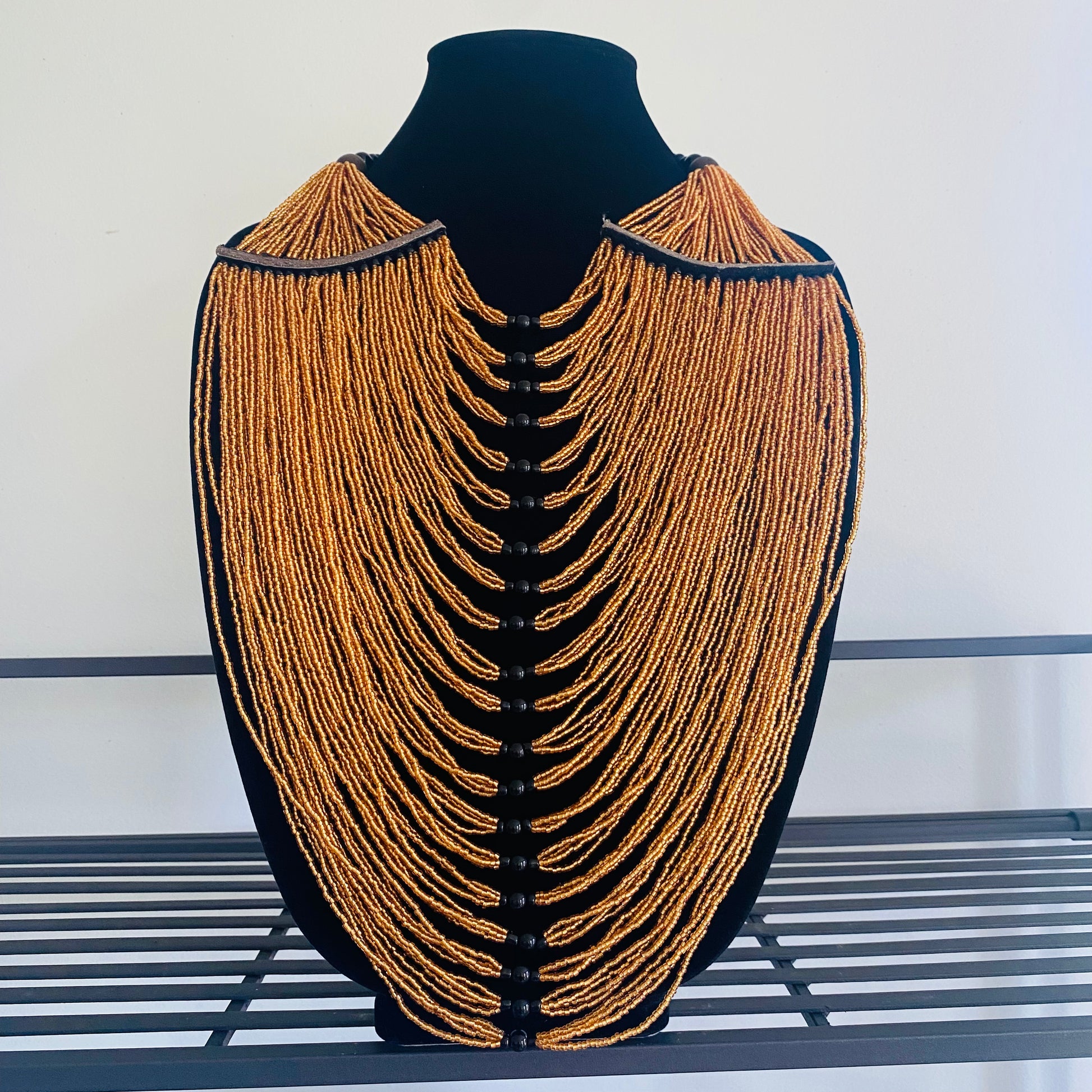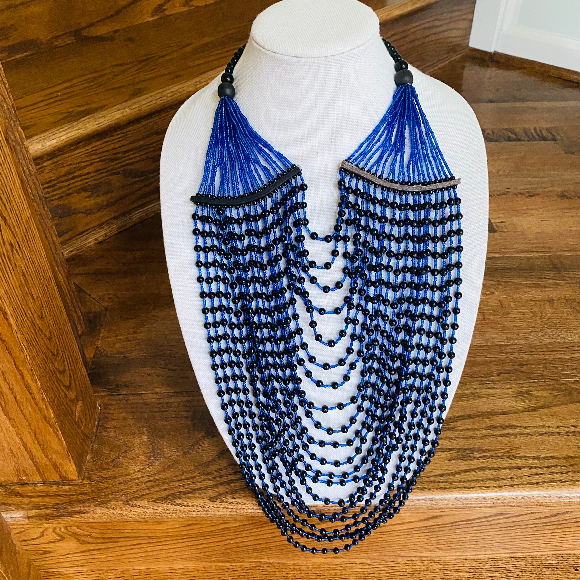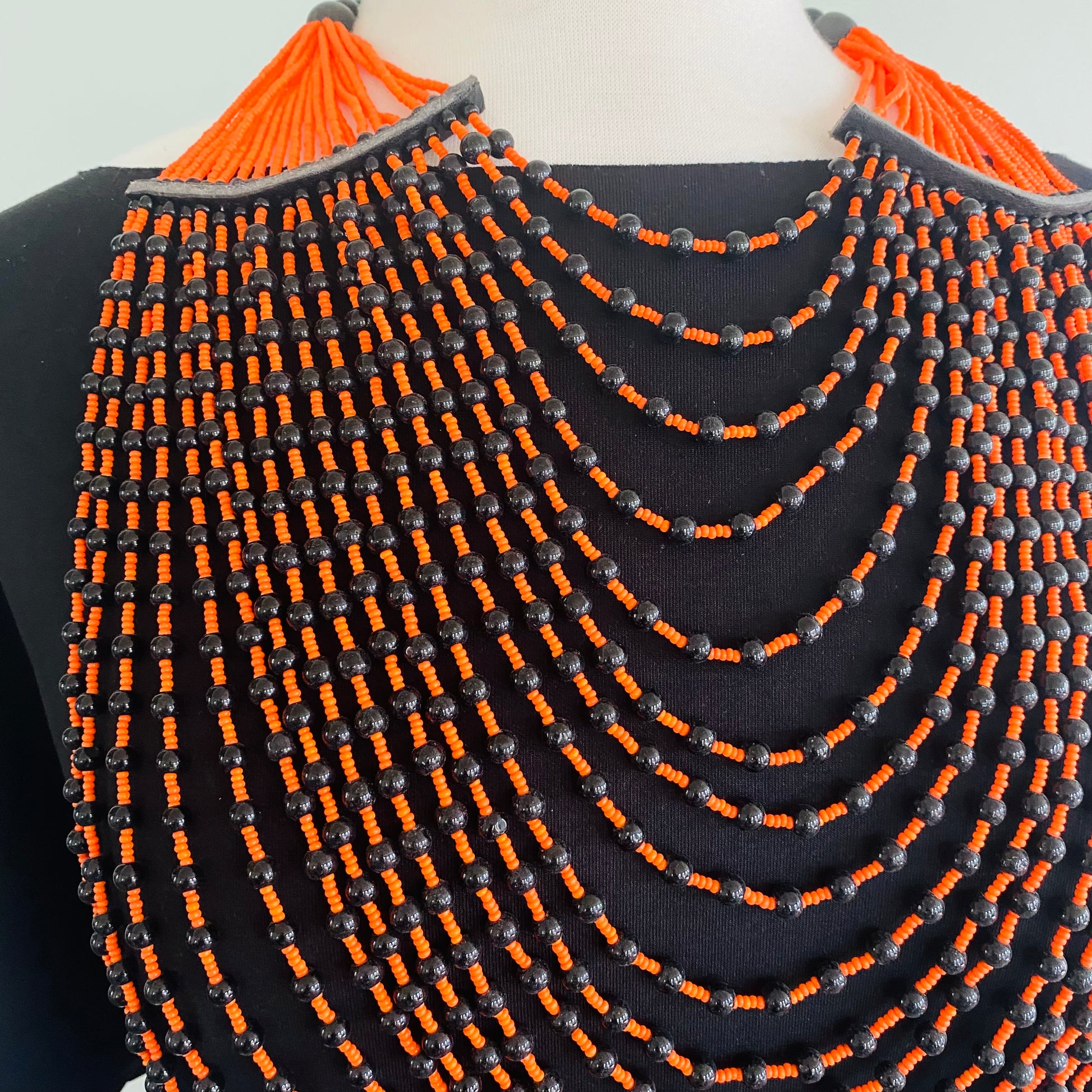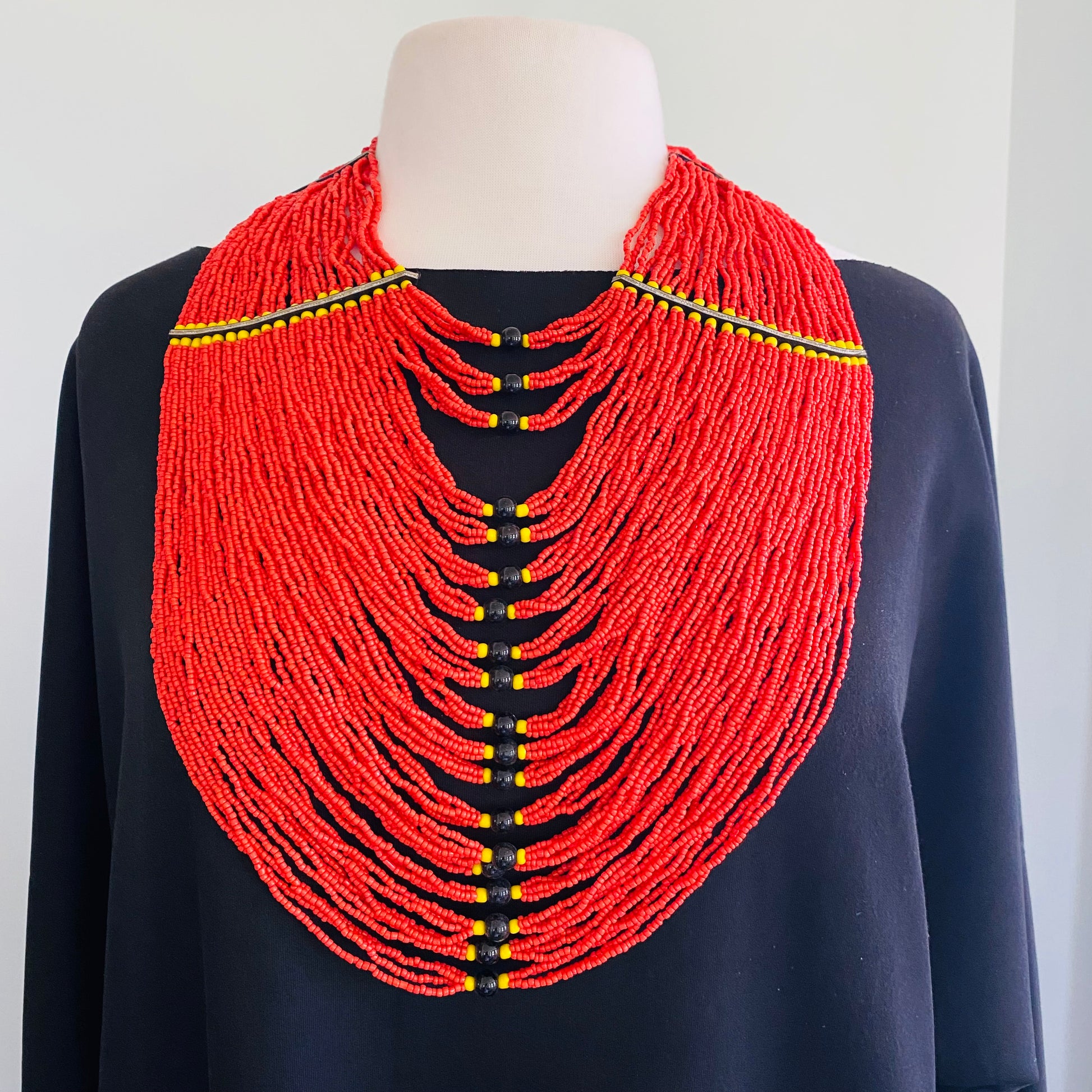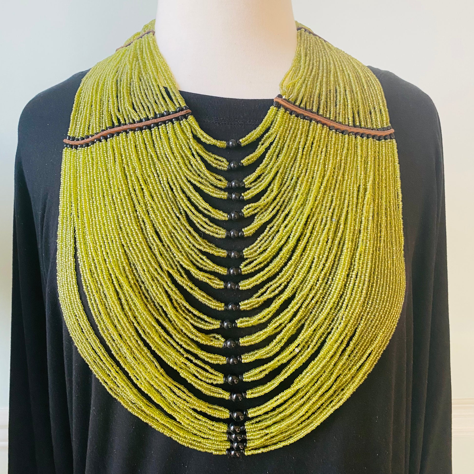 African beads, intricately strung together to create this elegant statement necklace; wear it anytime and anywhere; it can be dressed up or down for a casual look.