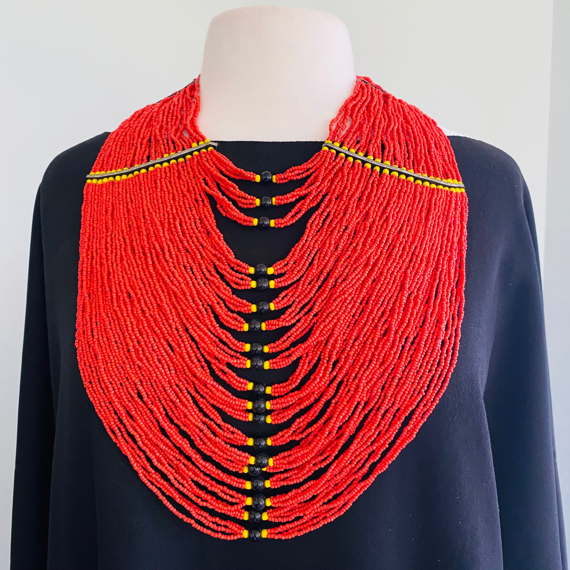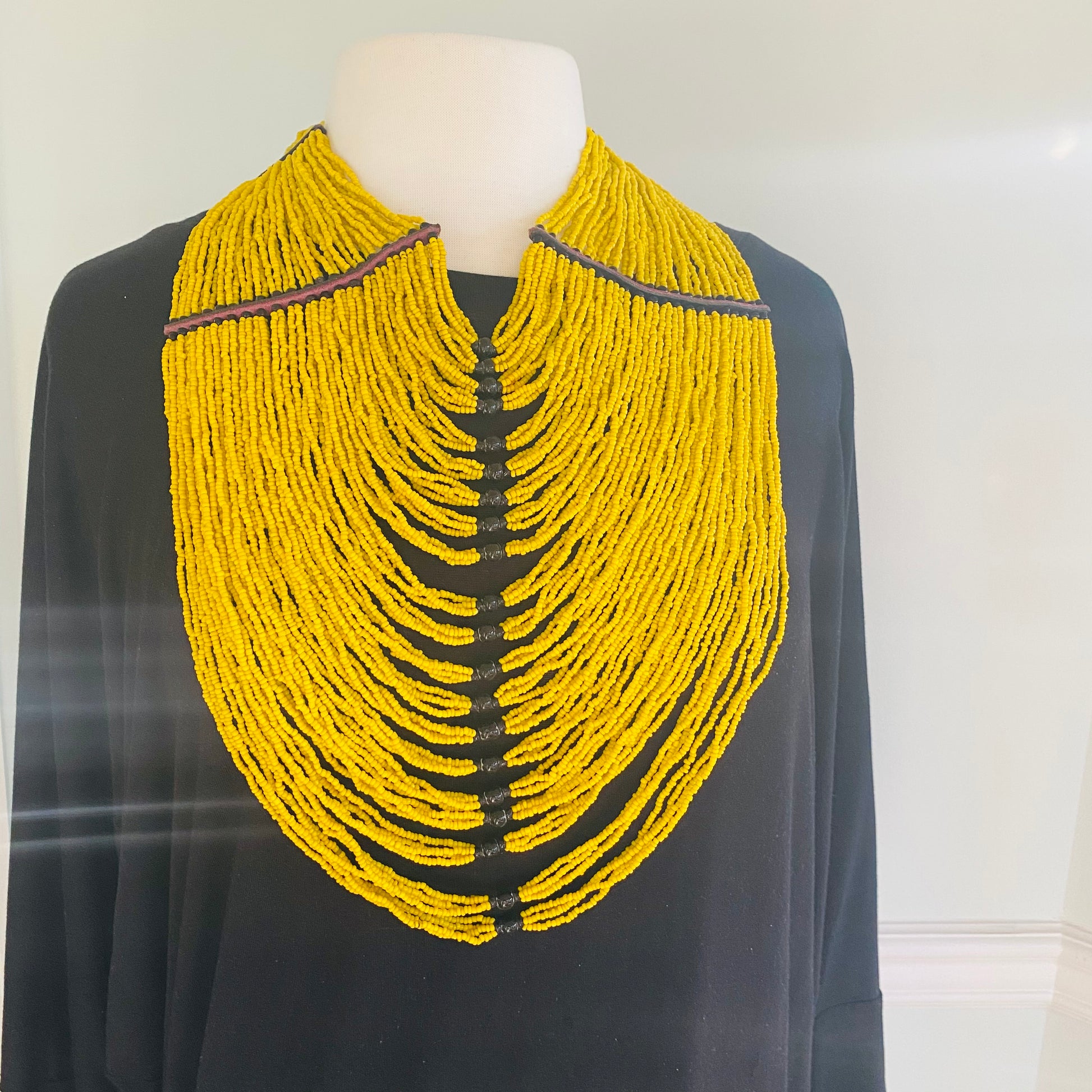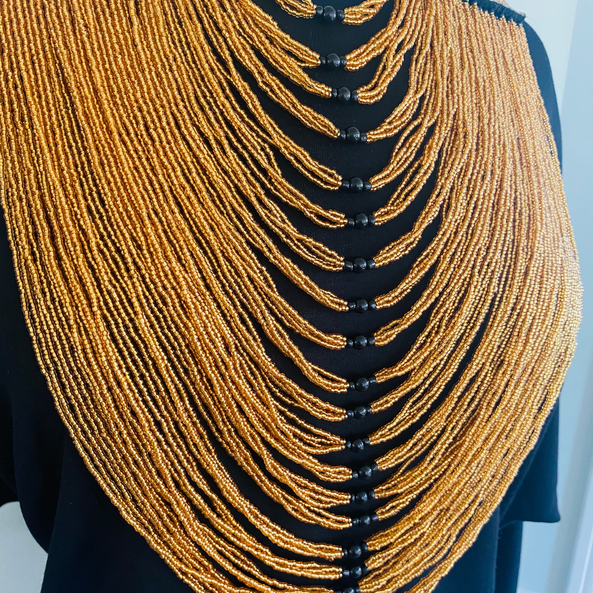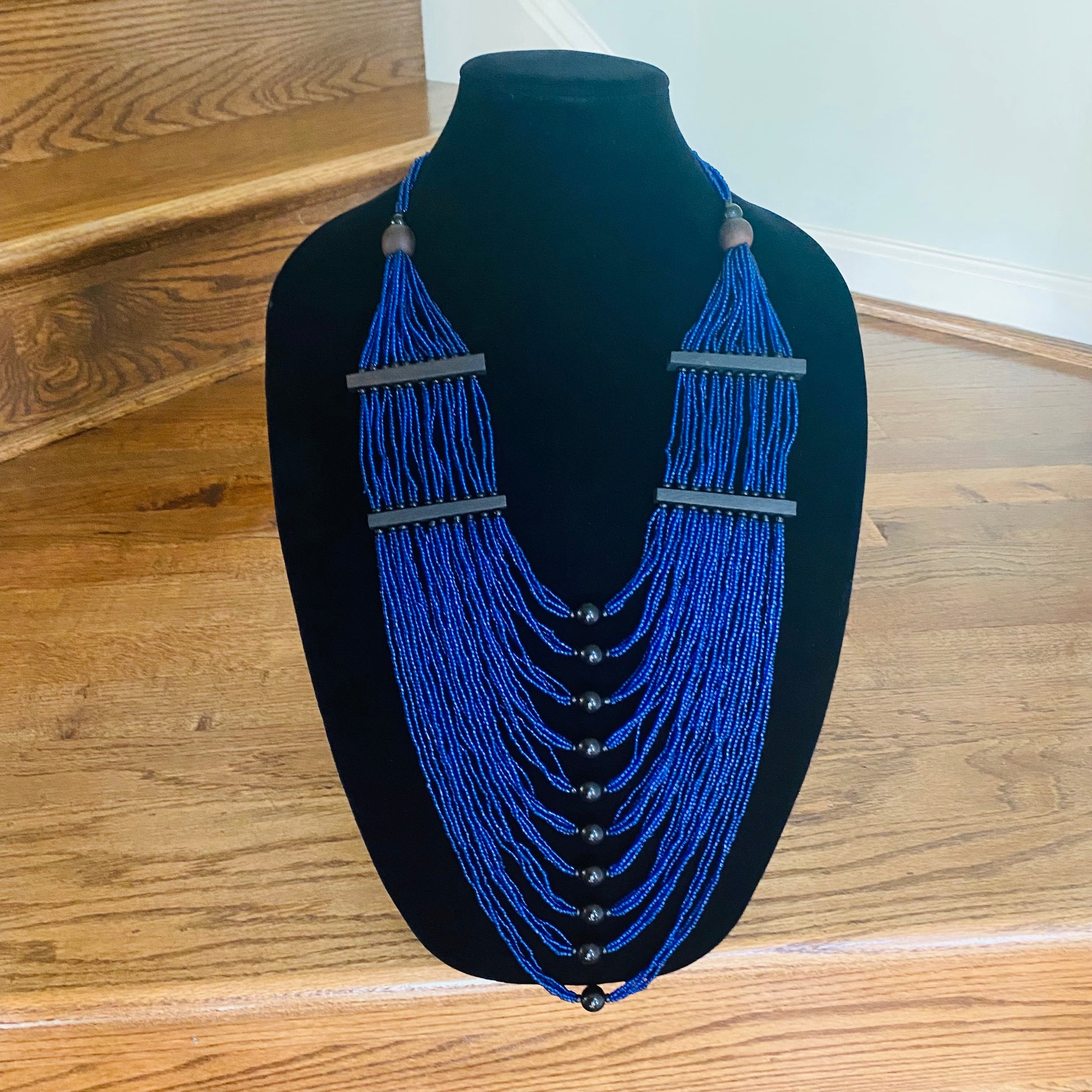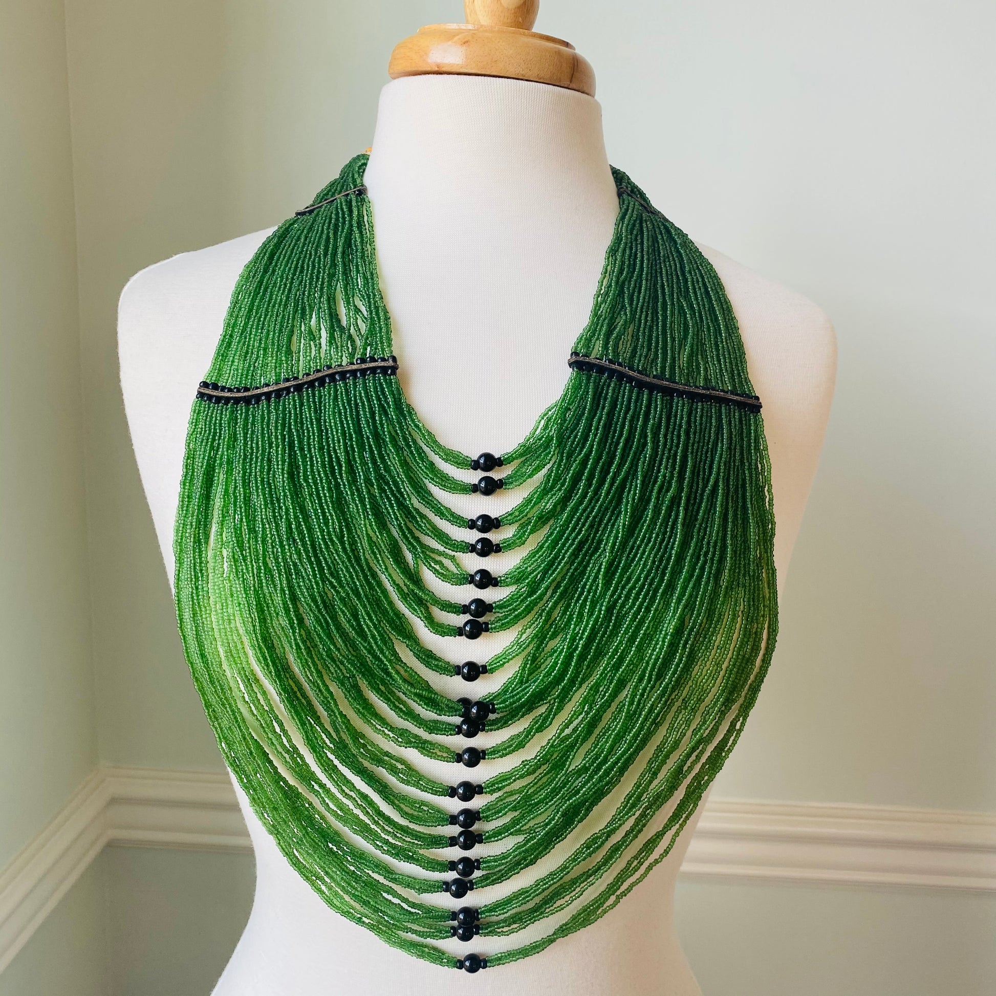 African beads, intricately strung together to create this elegant statement necklace; wear it anytime and anywhere; it can be dressed up or down for a casual look.