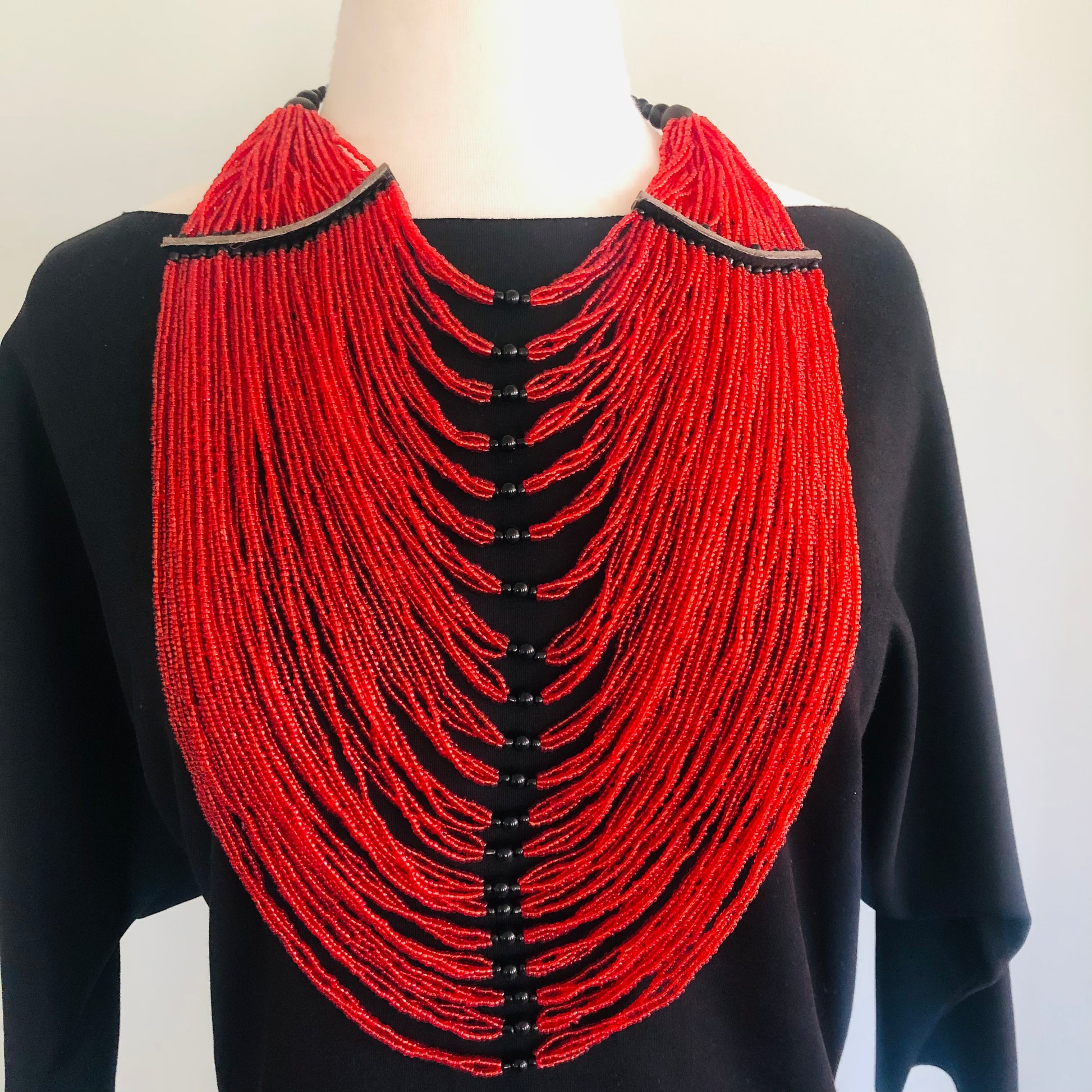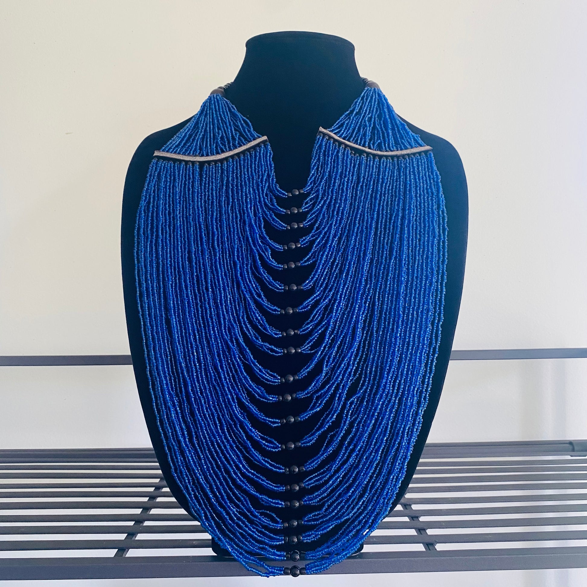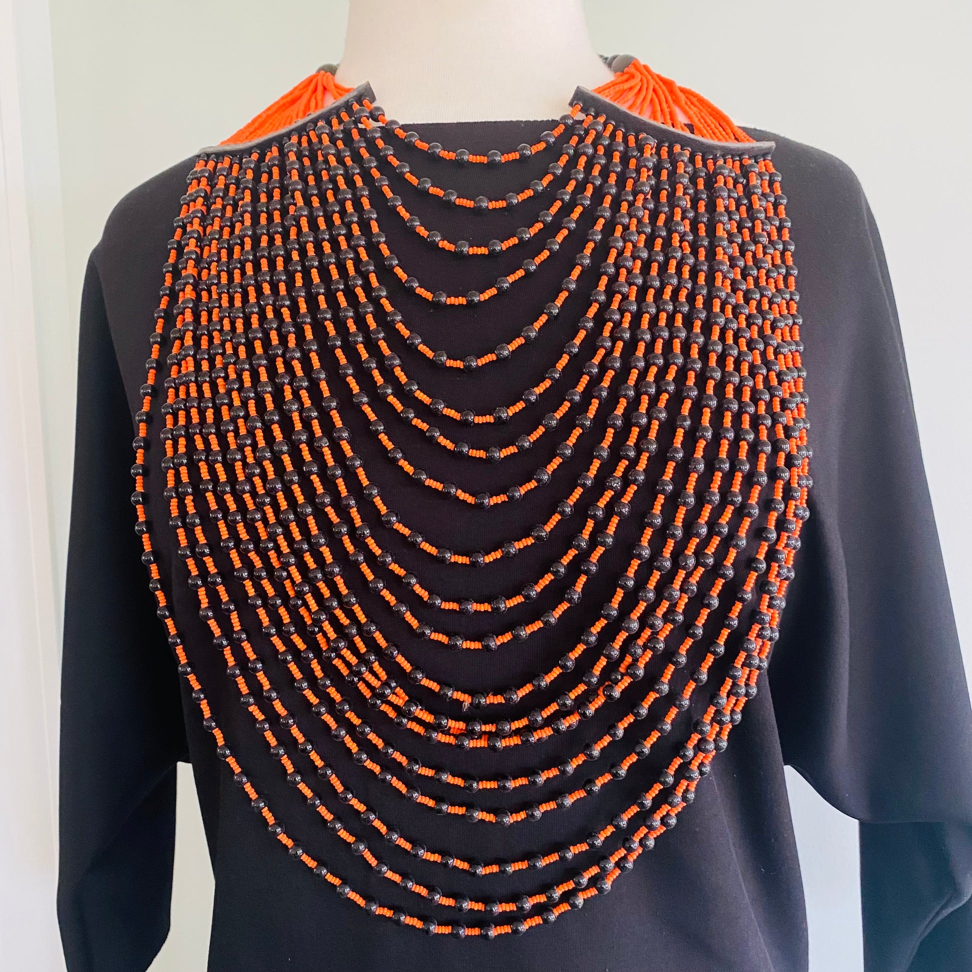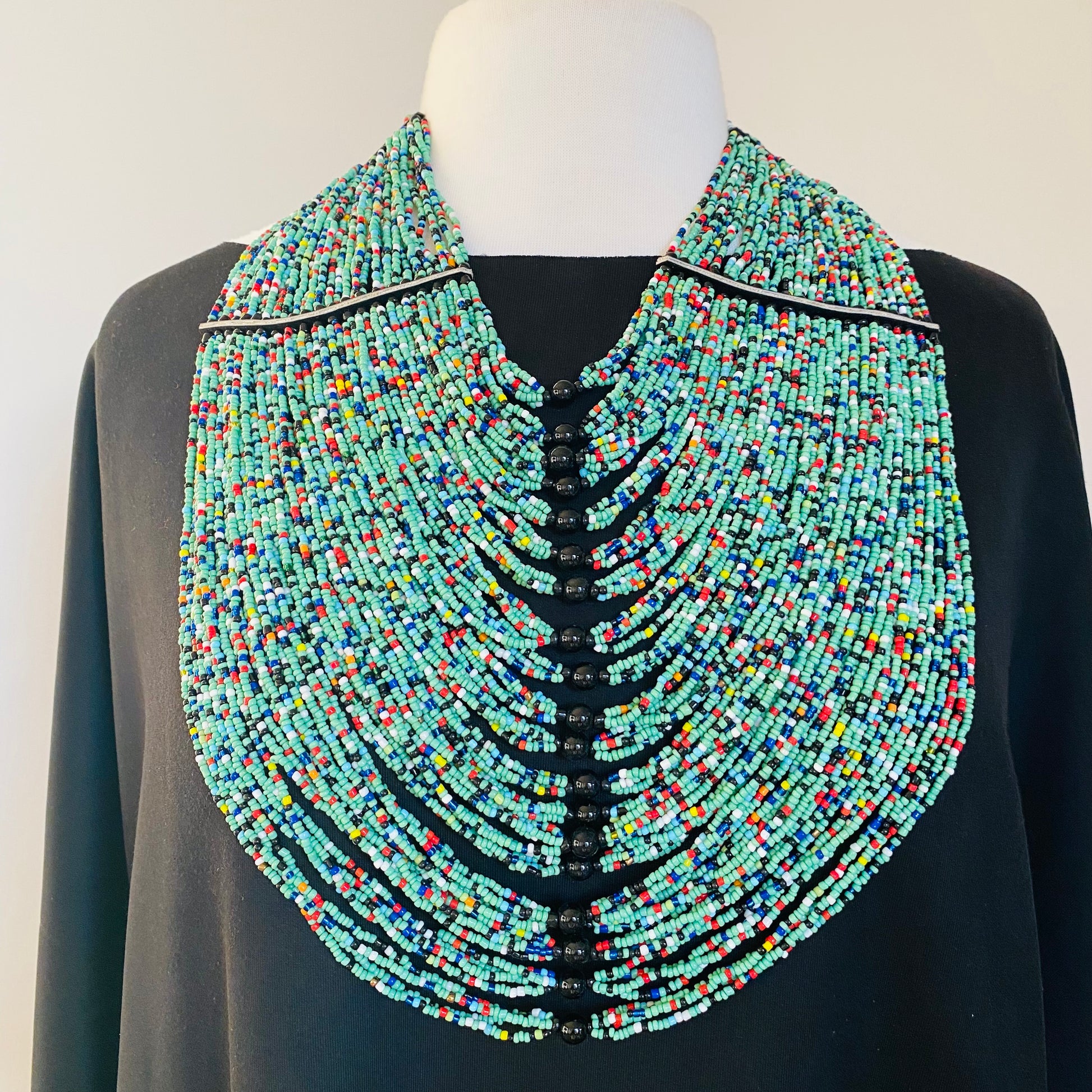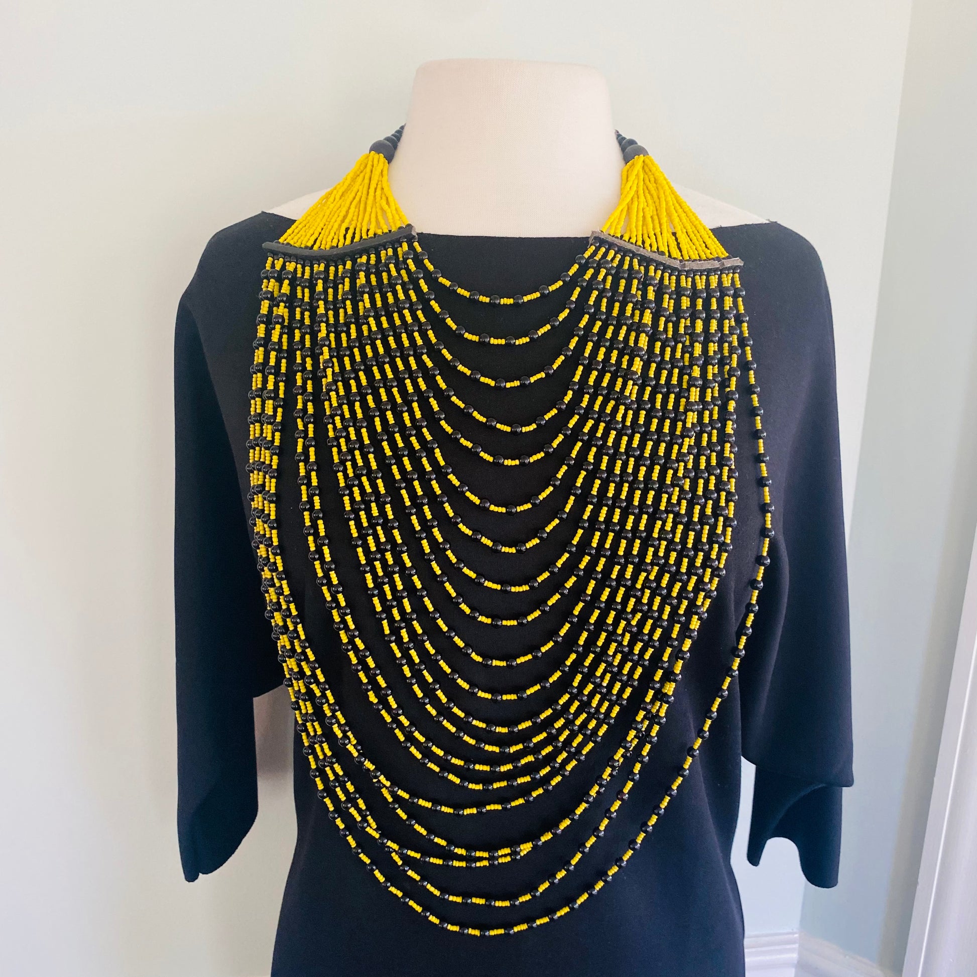 African beads, intricately strung together to create this elegant statement necklace; wear it anytime and anywhere; it can be dressed up or down for a casual look.