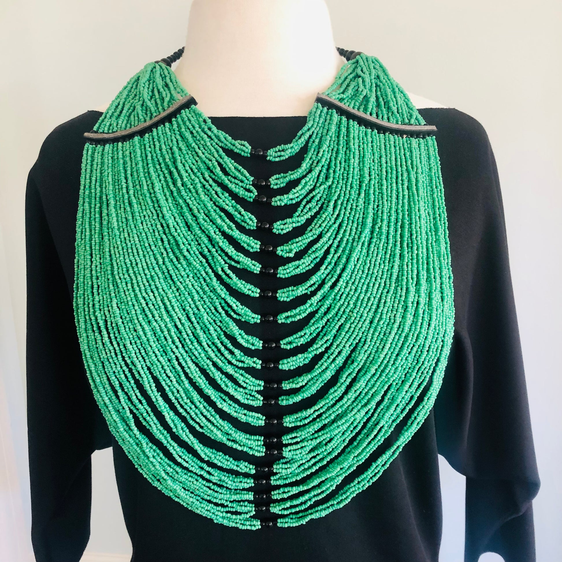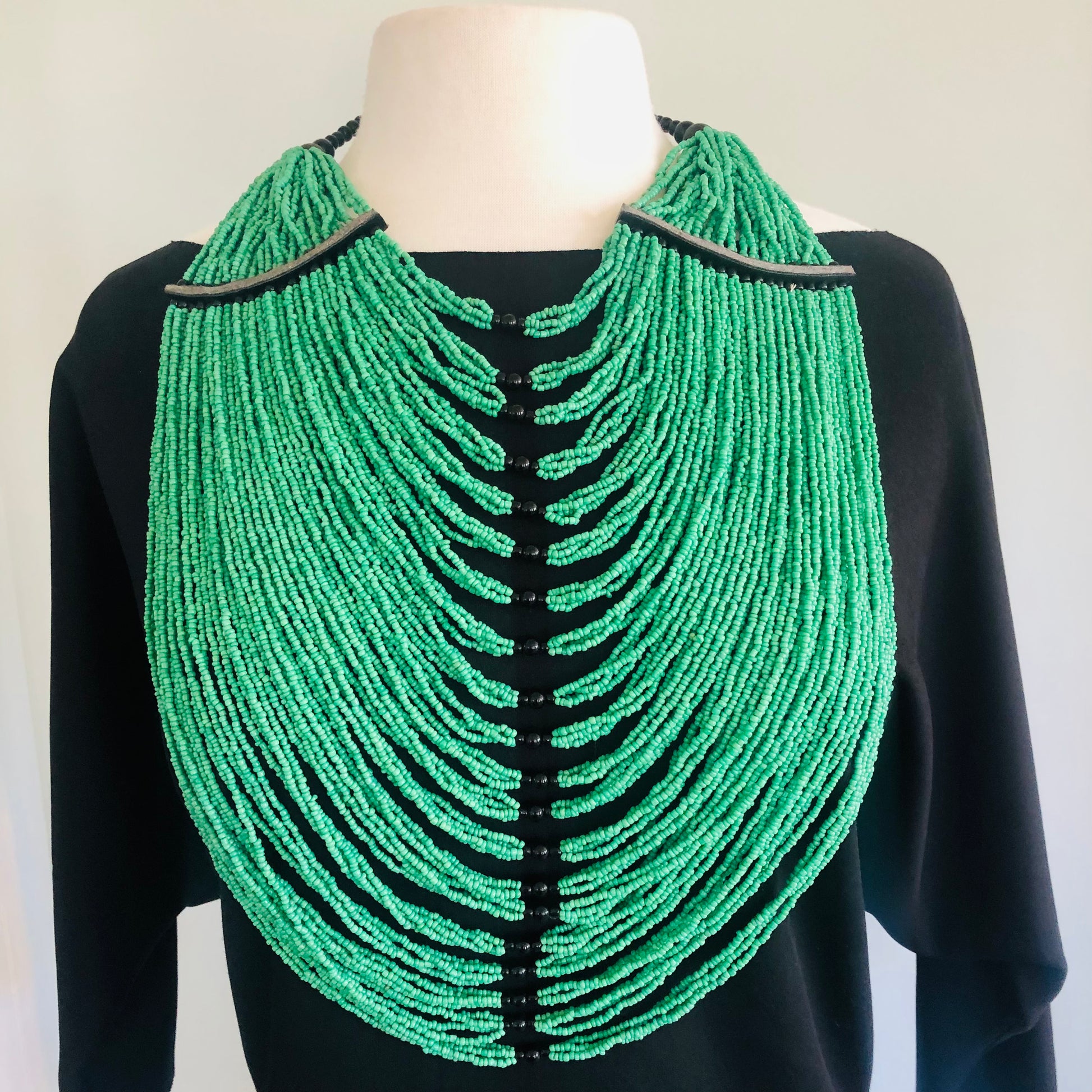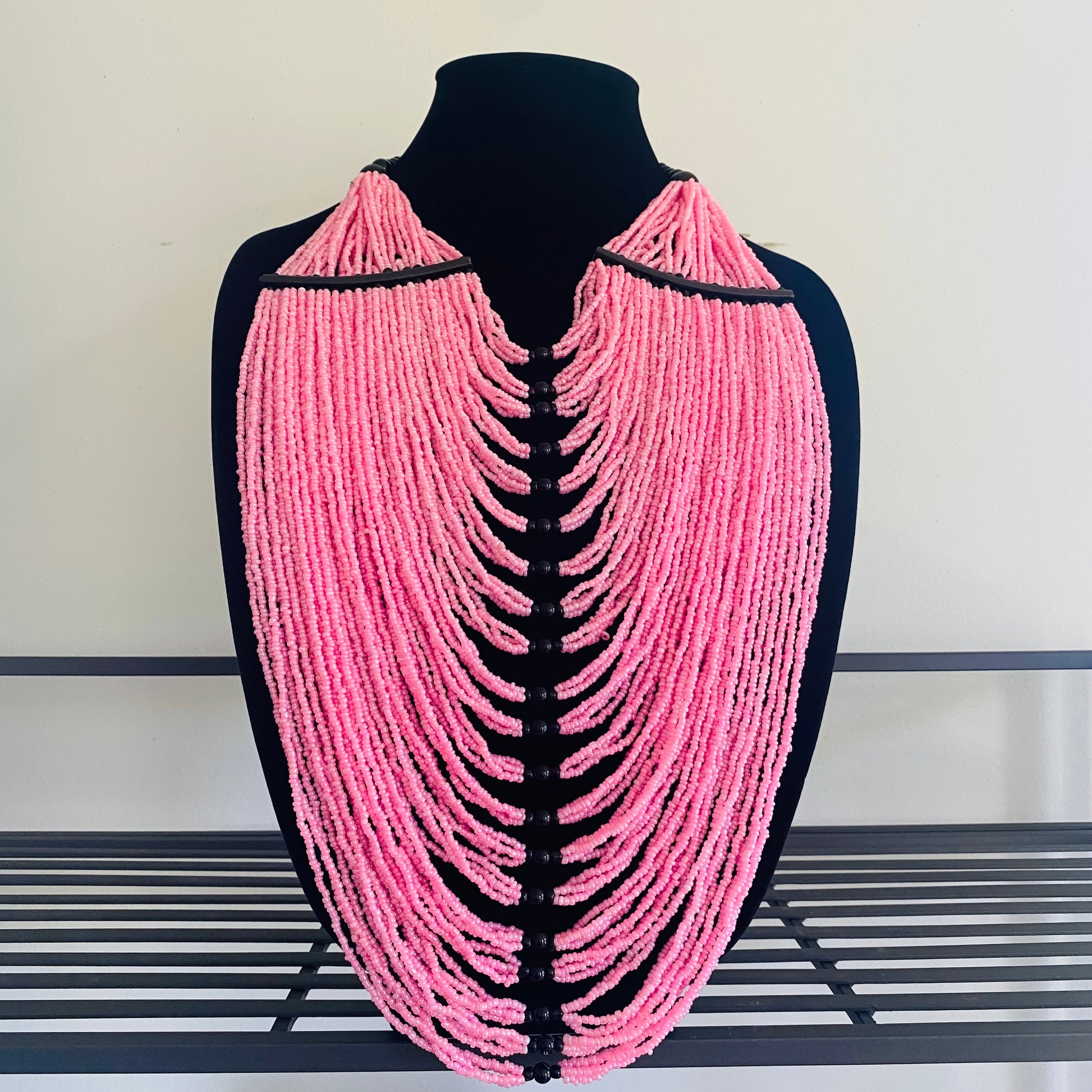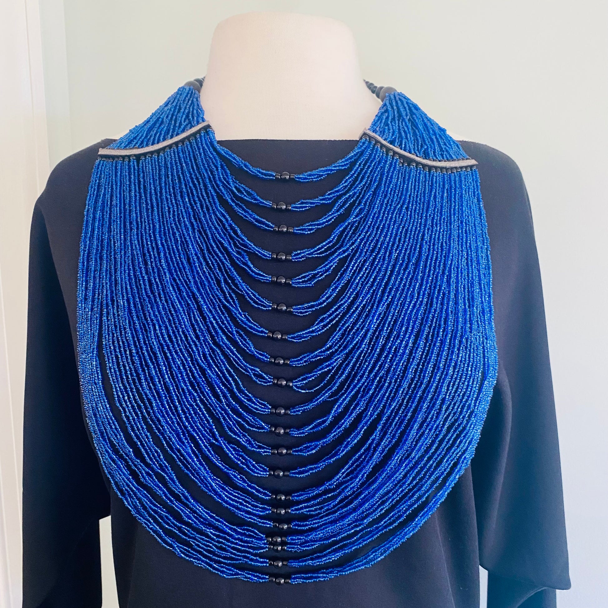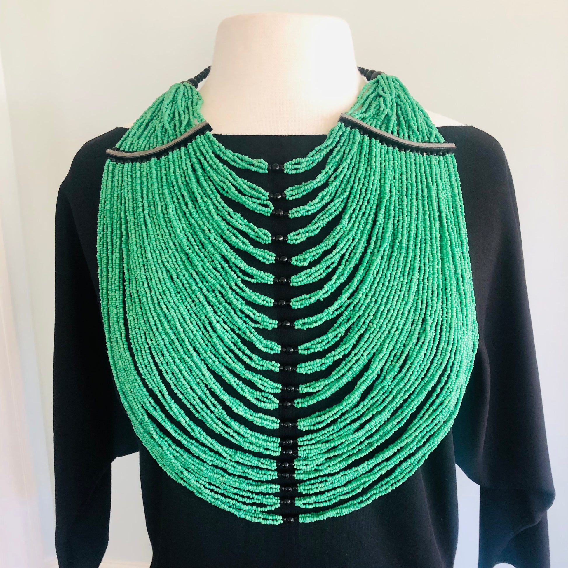 African beads, intricately strung together to create this elegant statement necklace; wear it anytime and anywhere; it can be dressed up or down for a casual look.