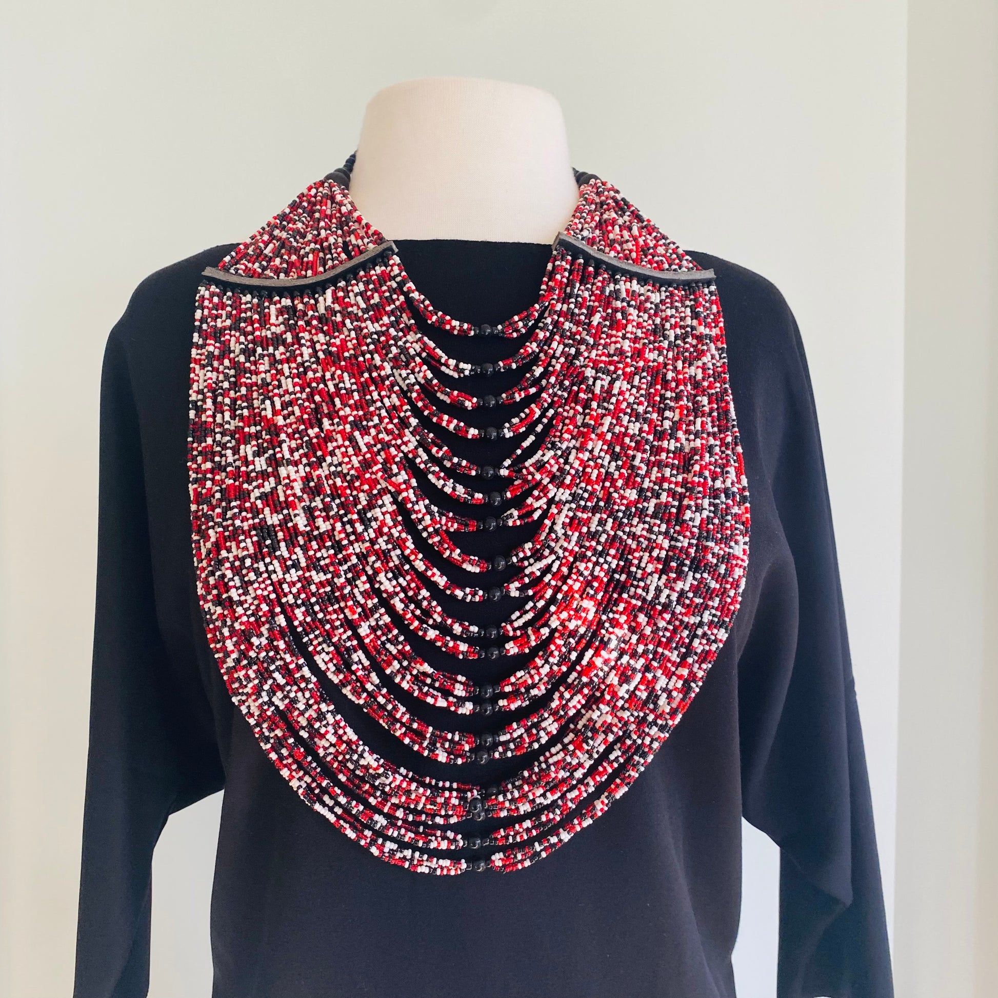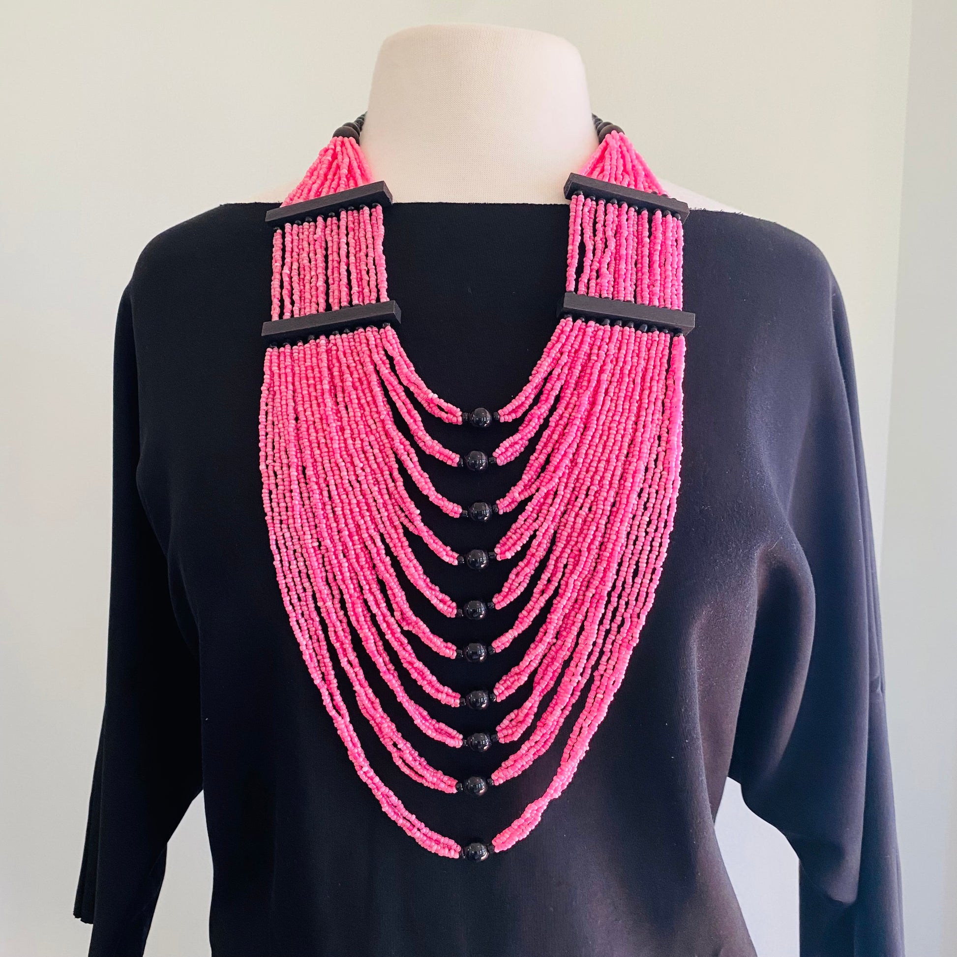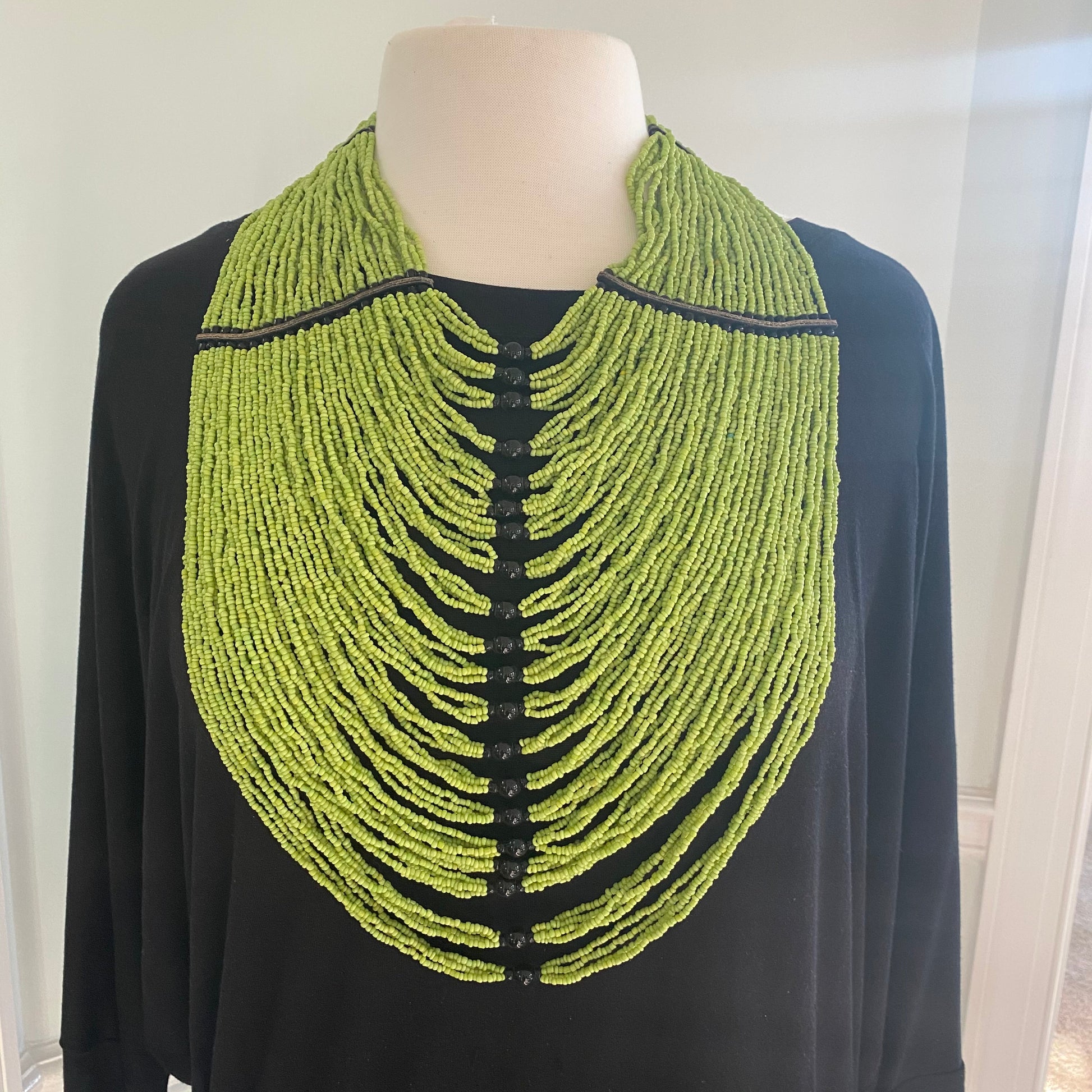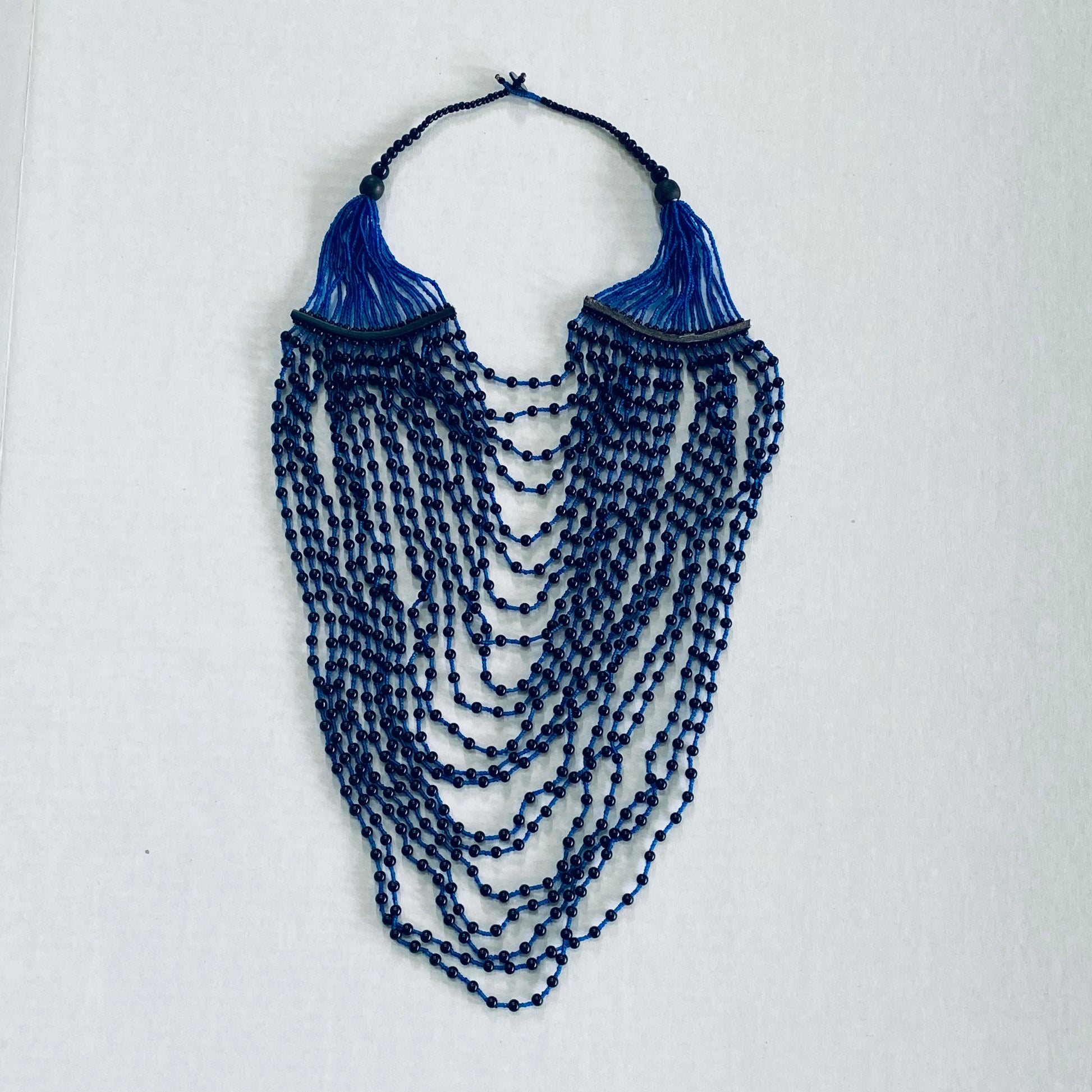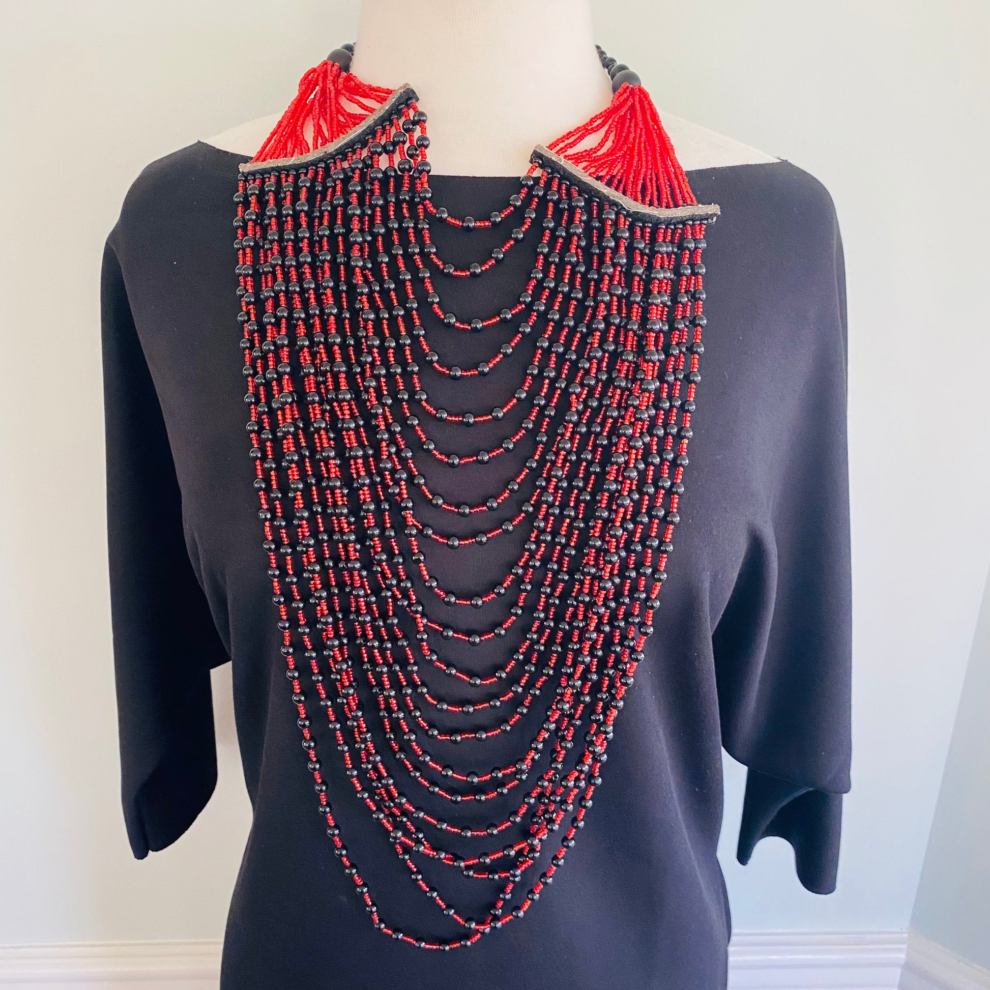 African beads, intricately strung together to create this elegant statement necklace; wear it anytime and anywhere; it can be dressed up or down for a casual look.