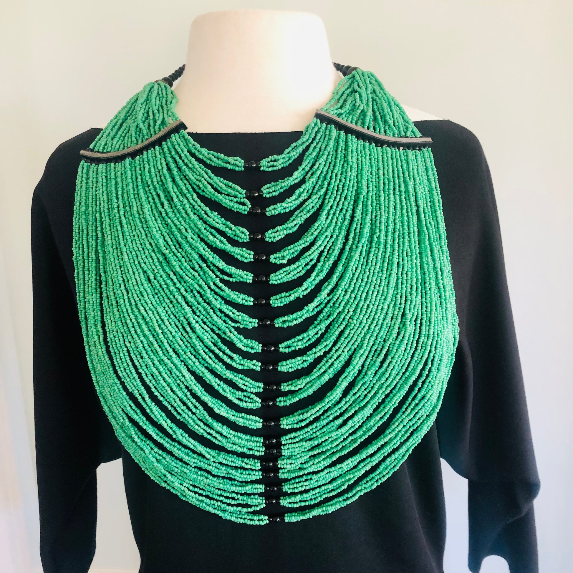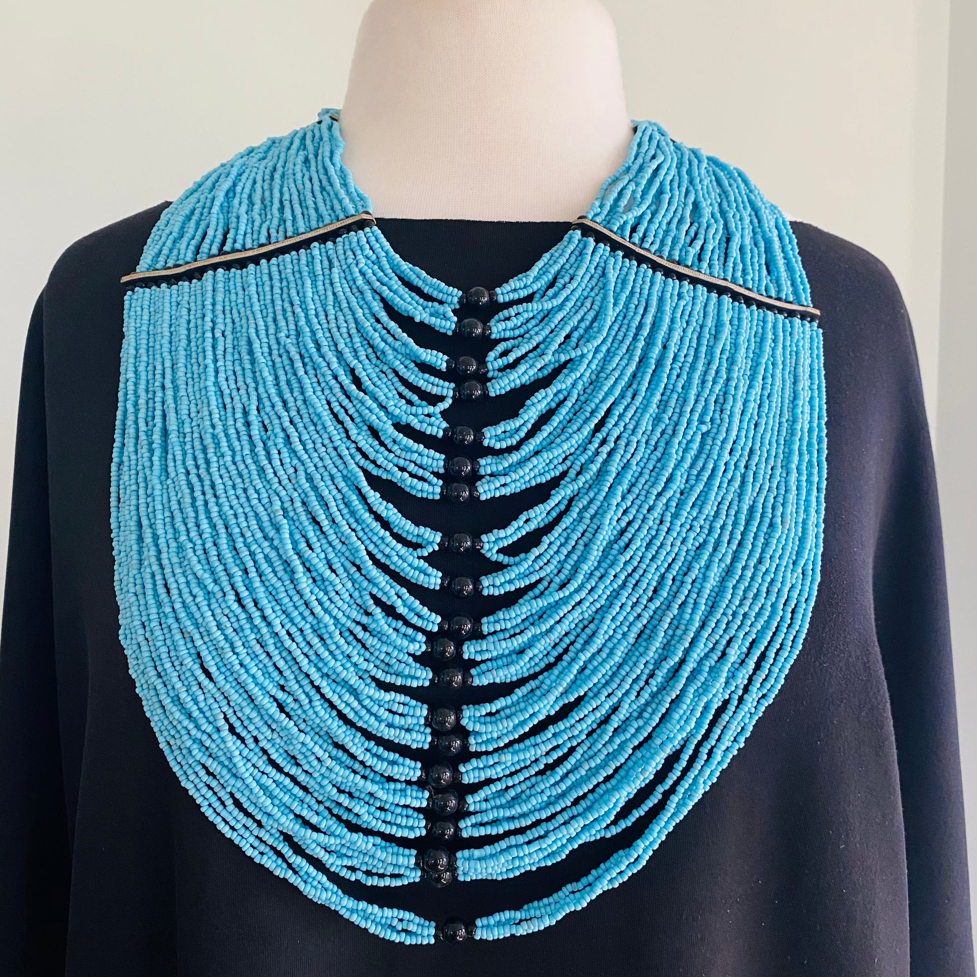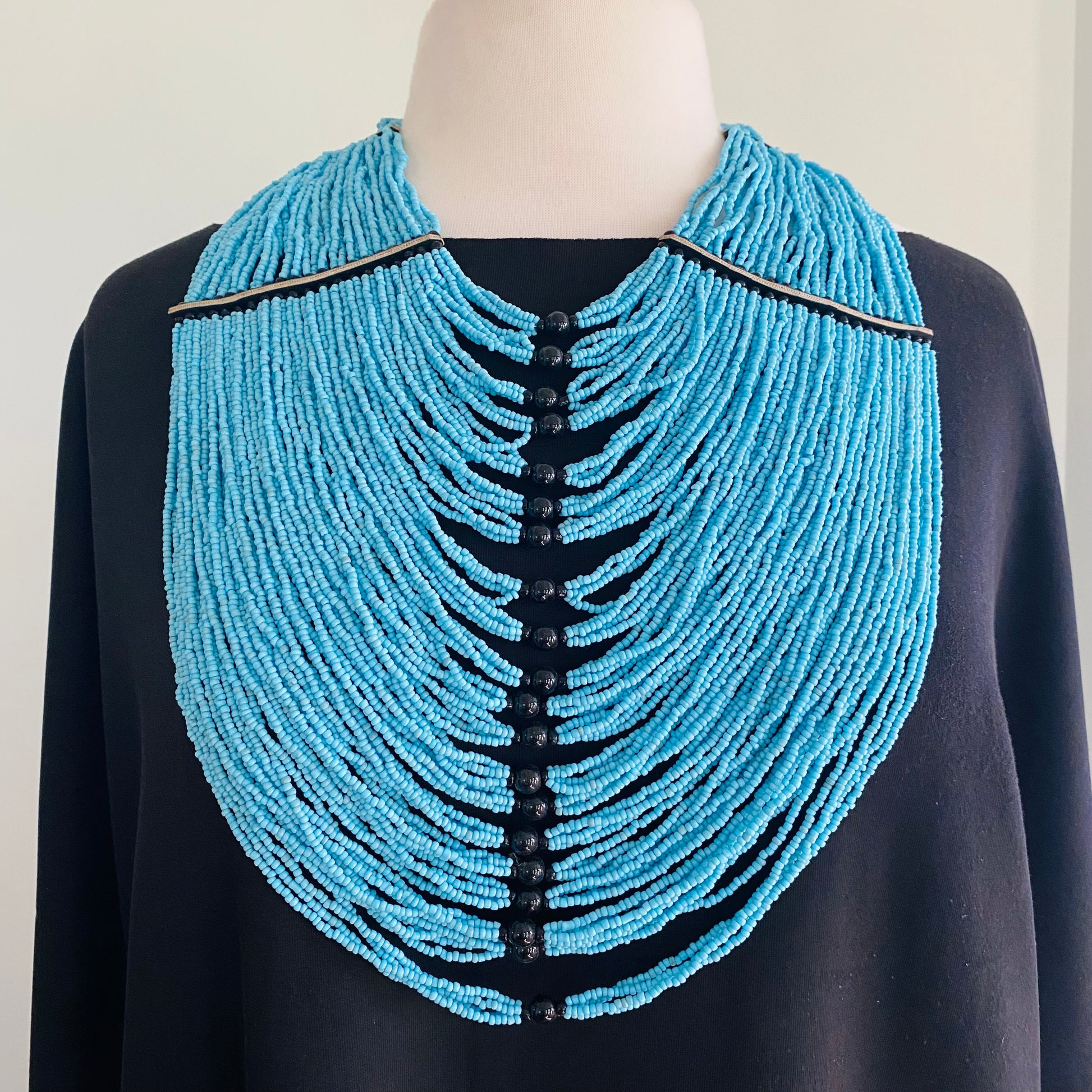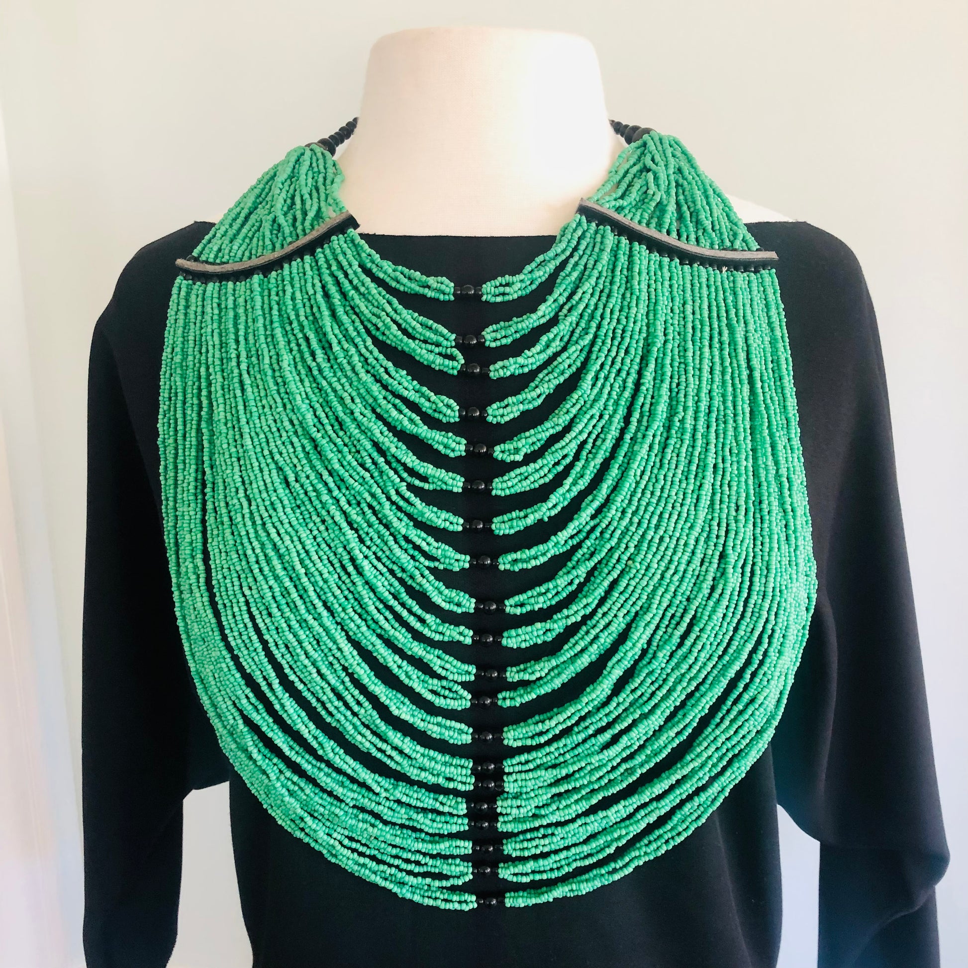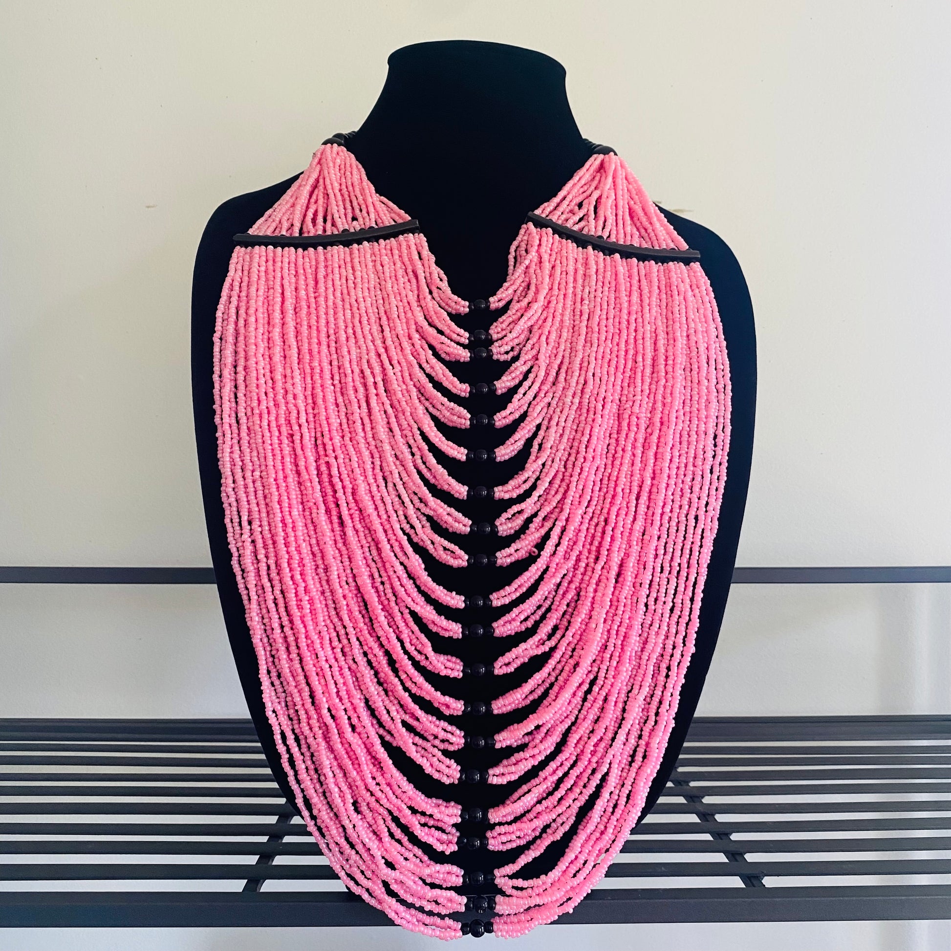 African beads, intricately strung together to create this elegant statement necklace; wear it anytime and anywhere; it can be dressed up or down for a casual look.