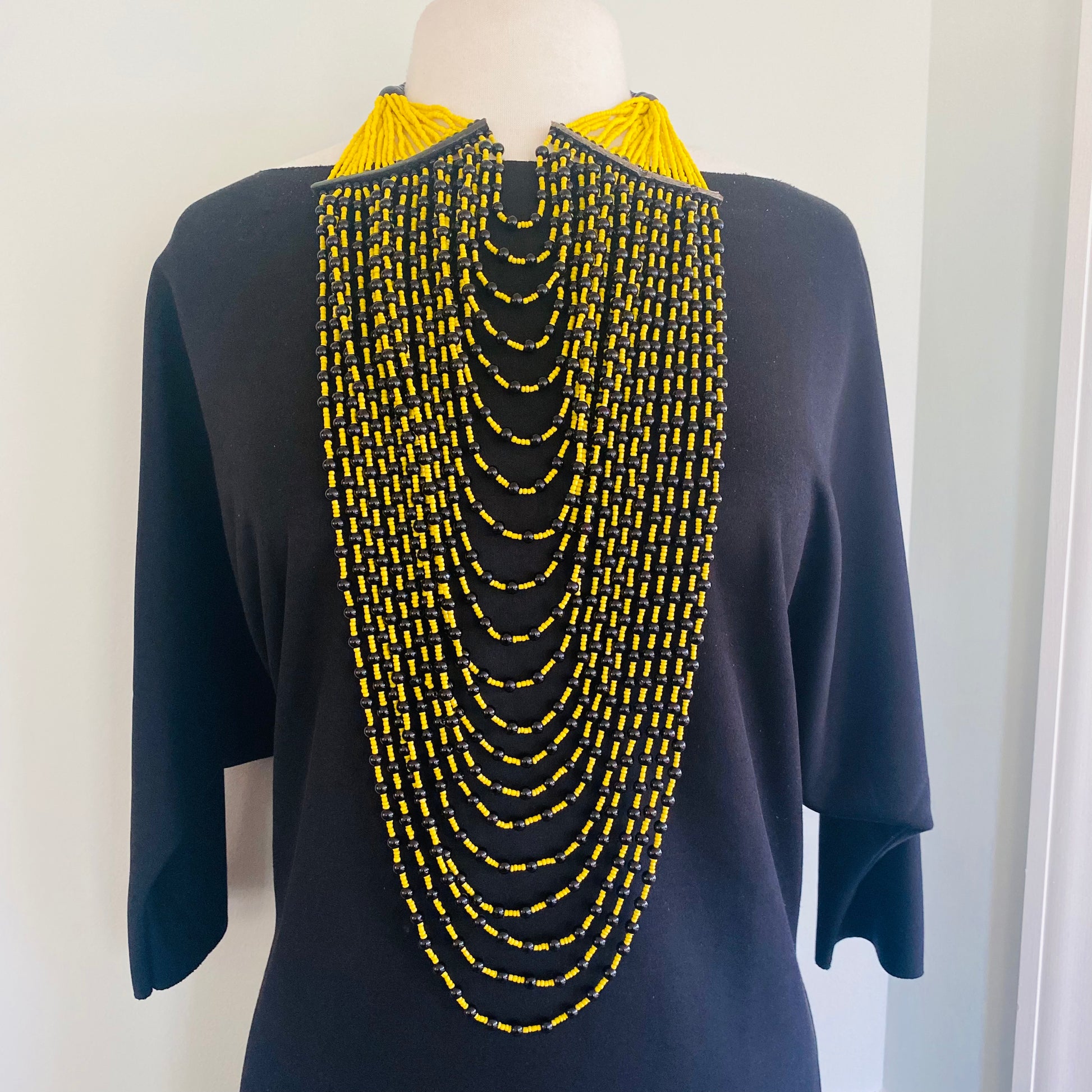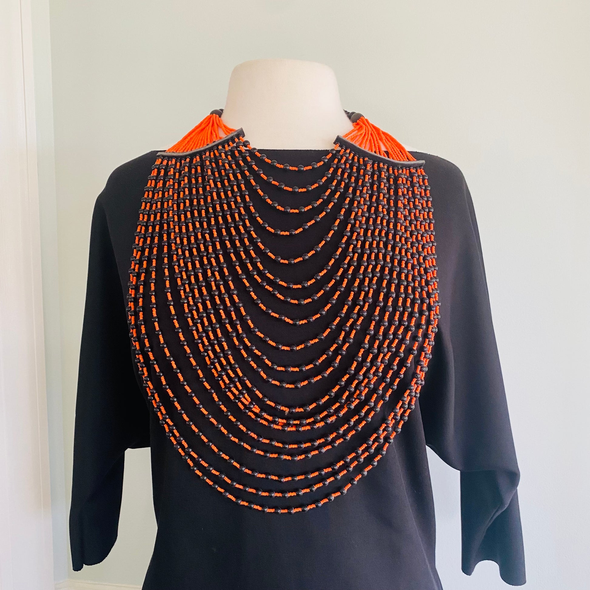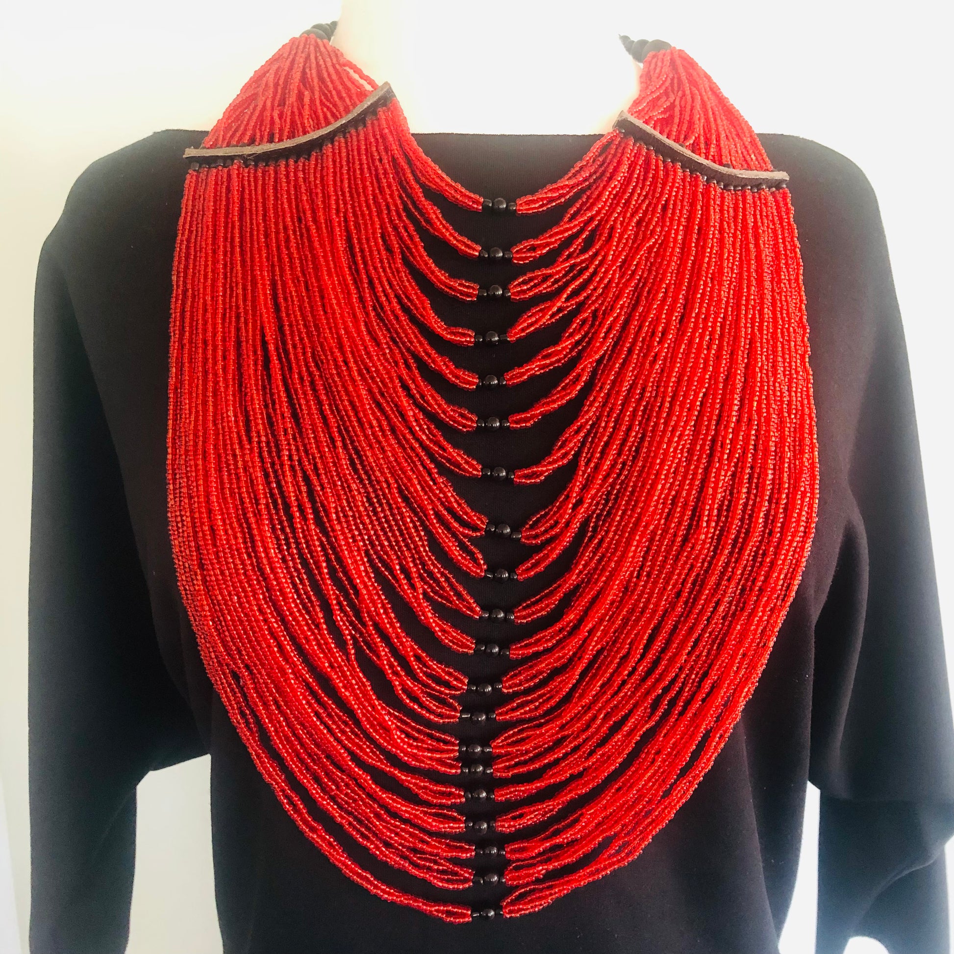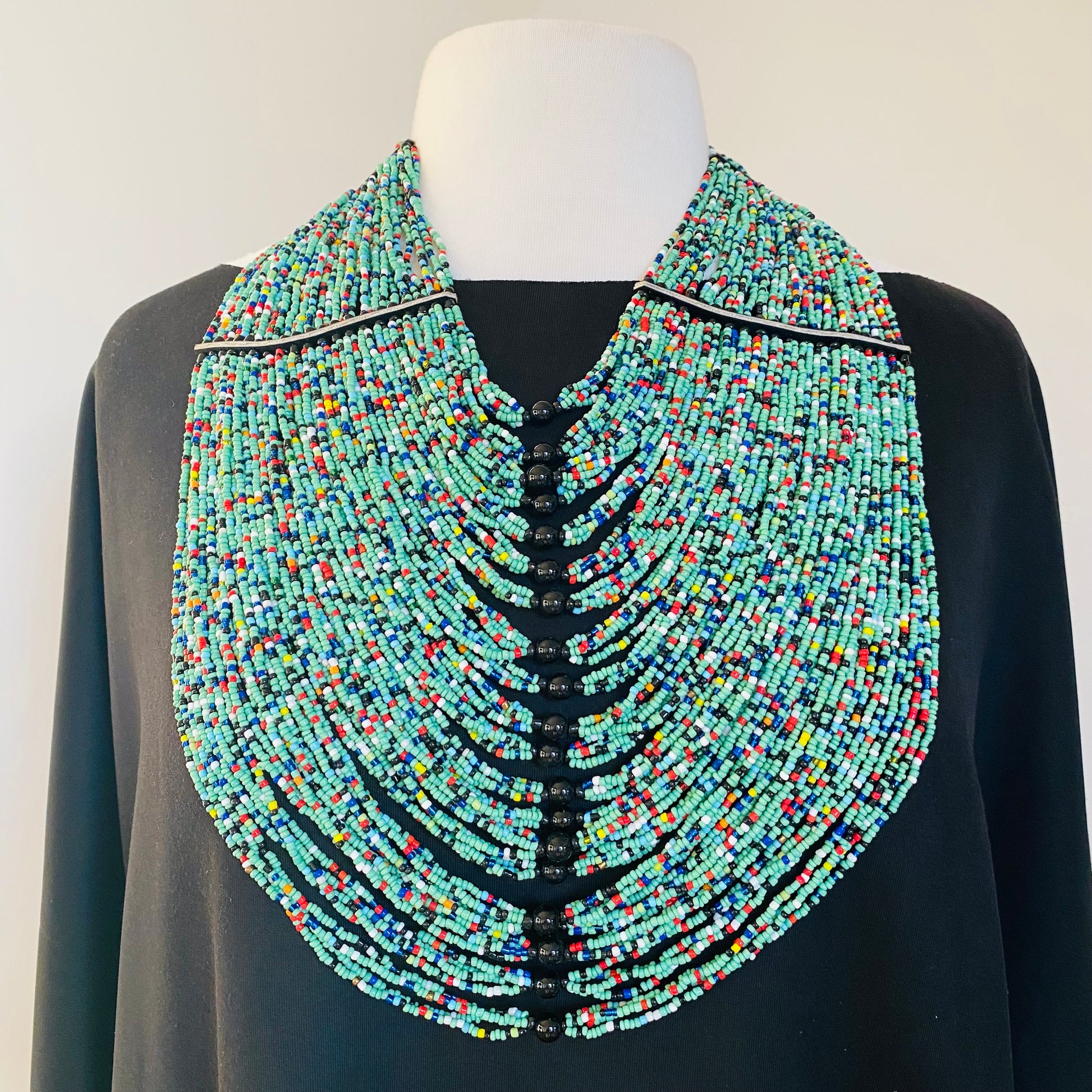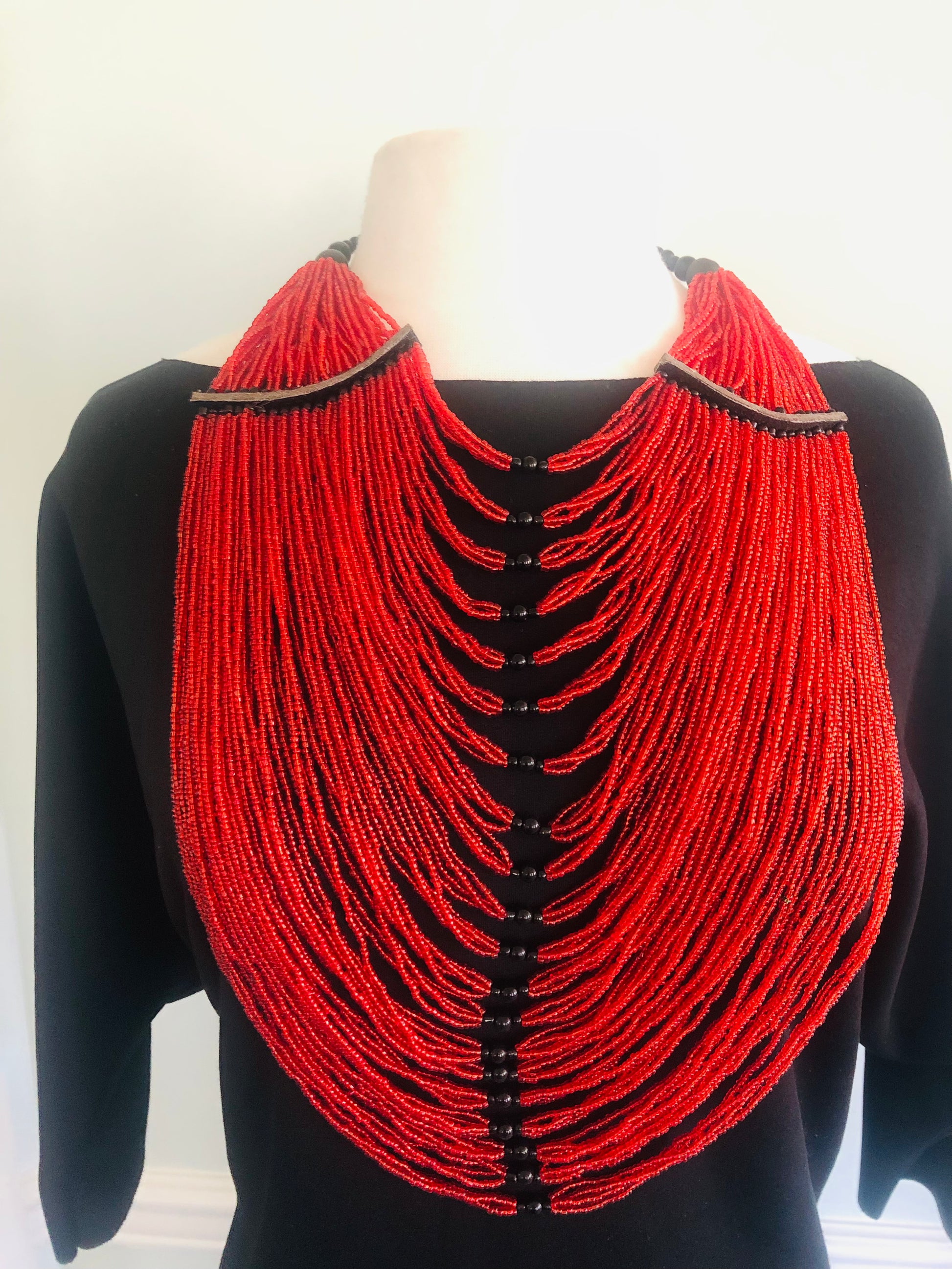 African beads, intricately strung together to create this elegant statement necklace; wear it anytime and anywhere; it can be dressed up or down for a casual look.