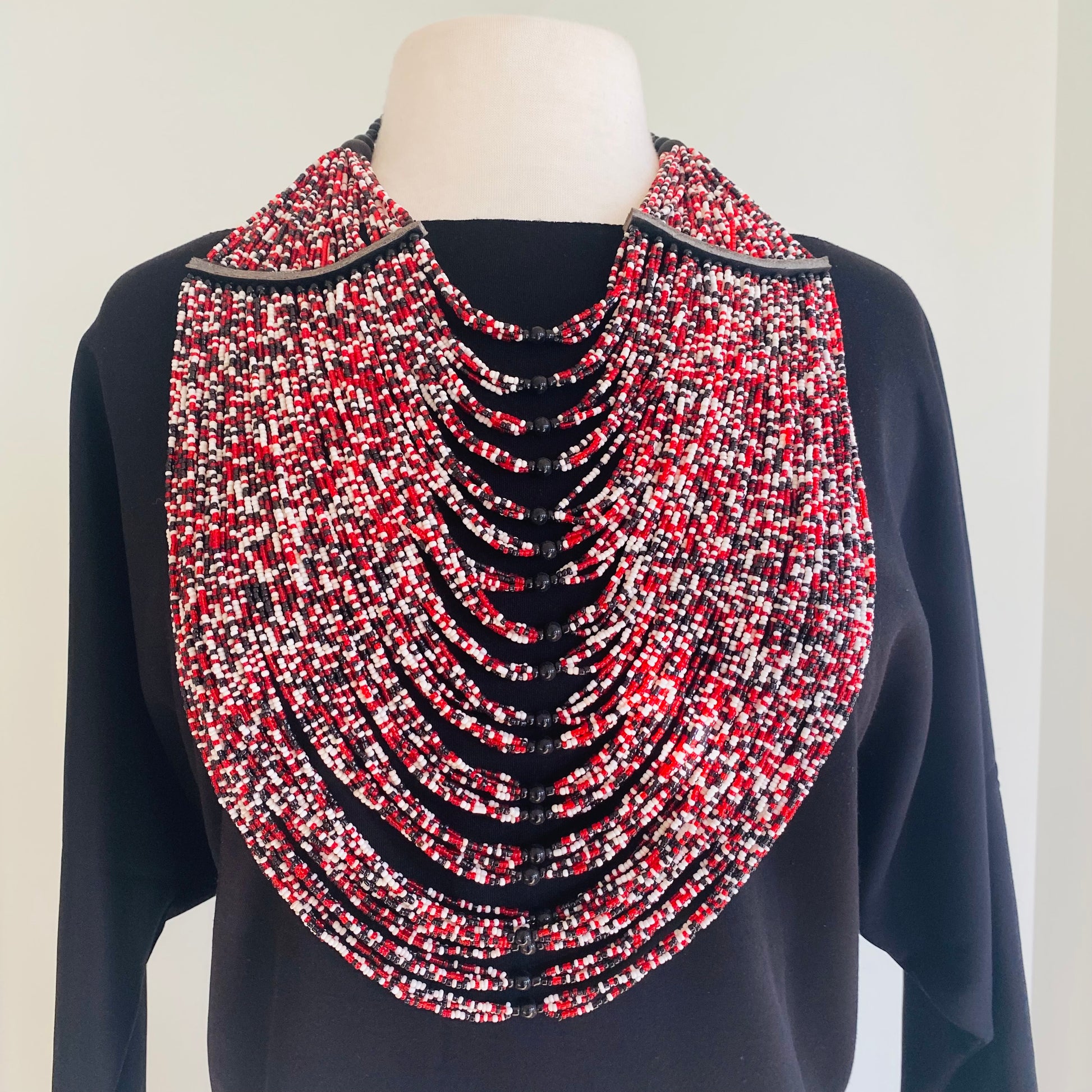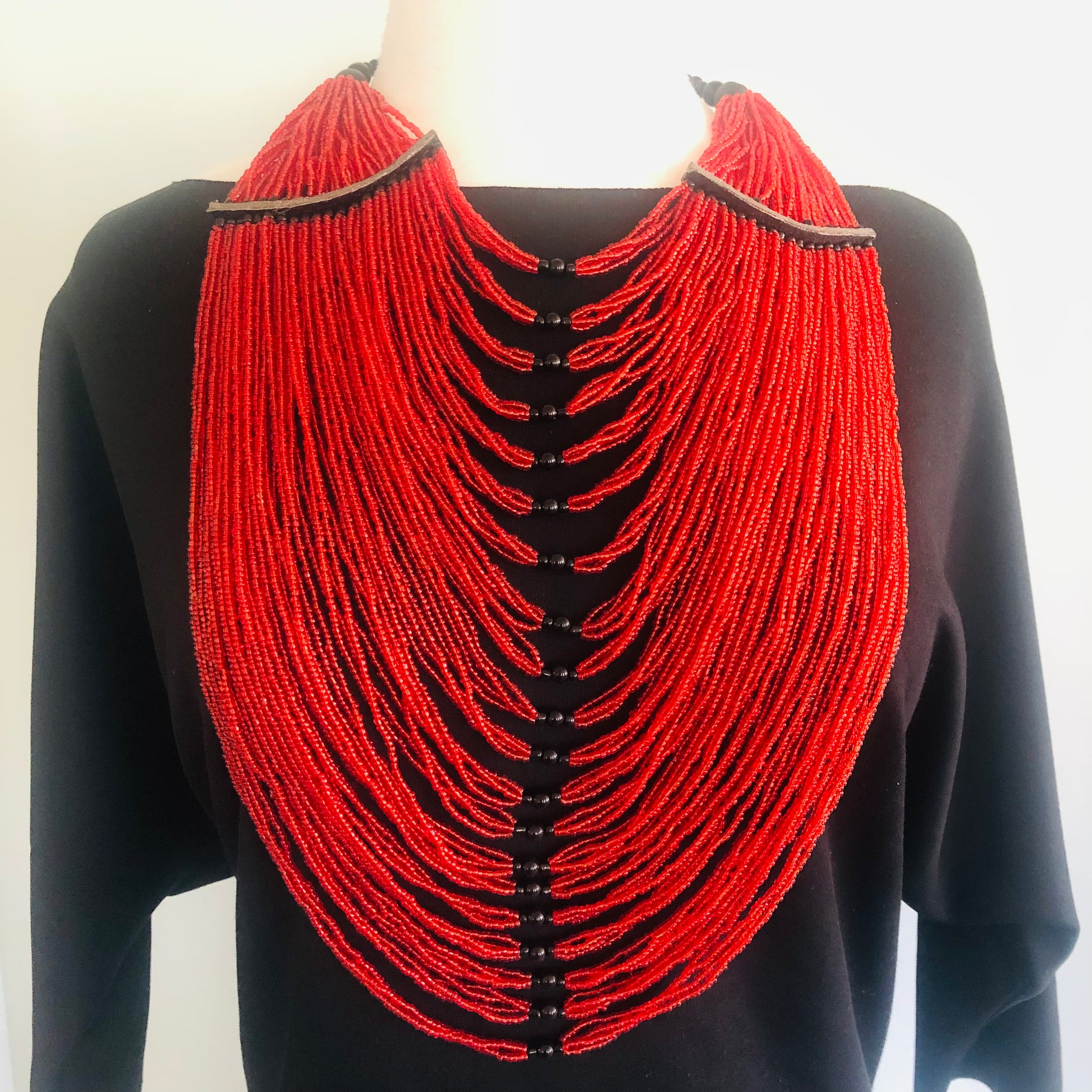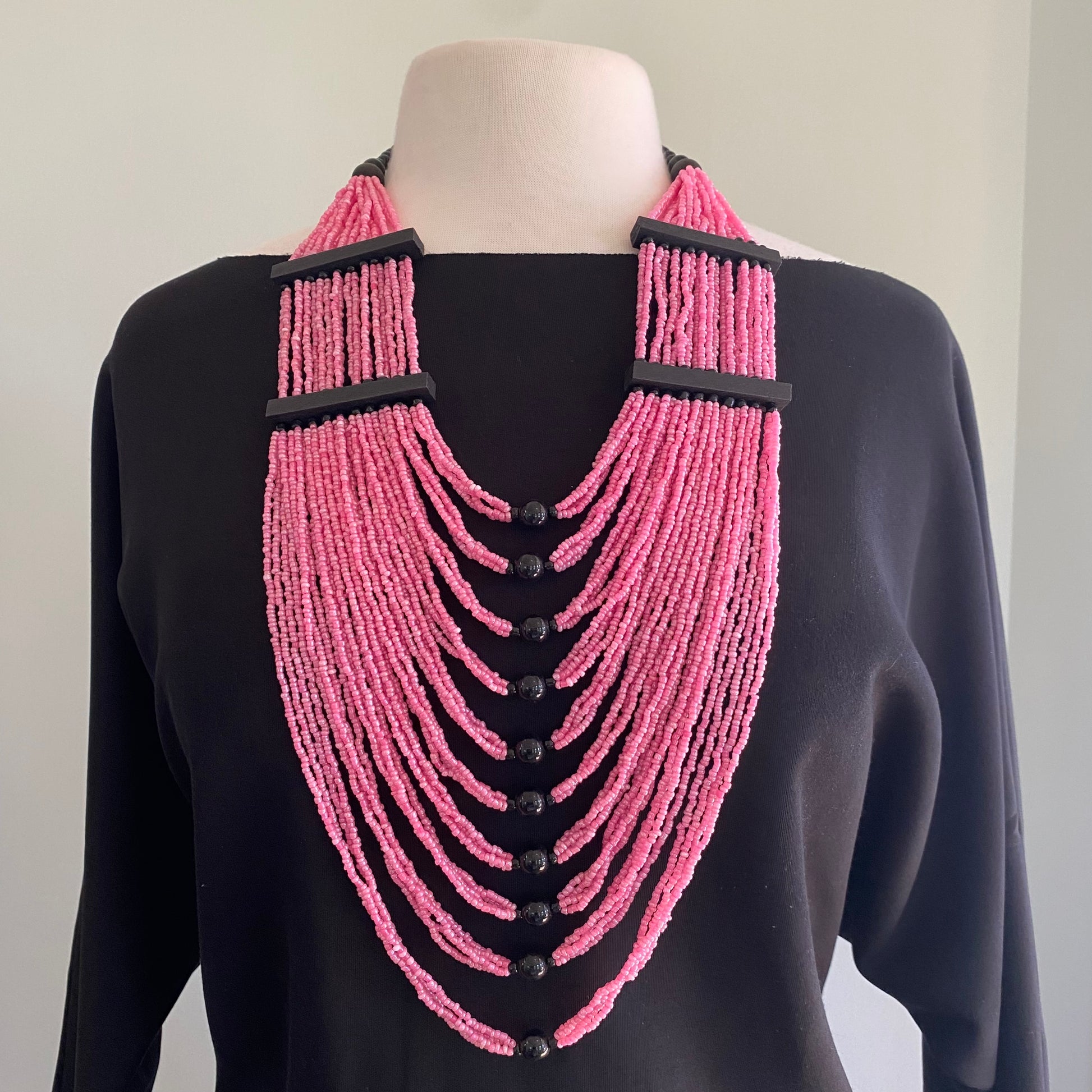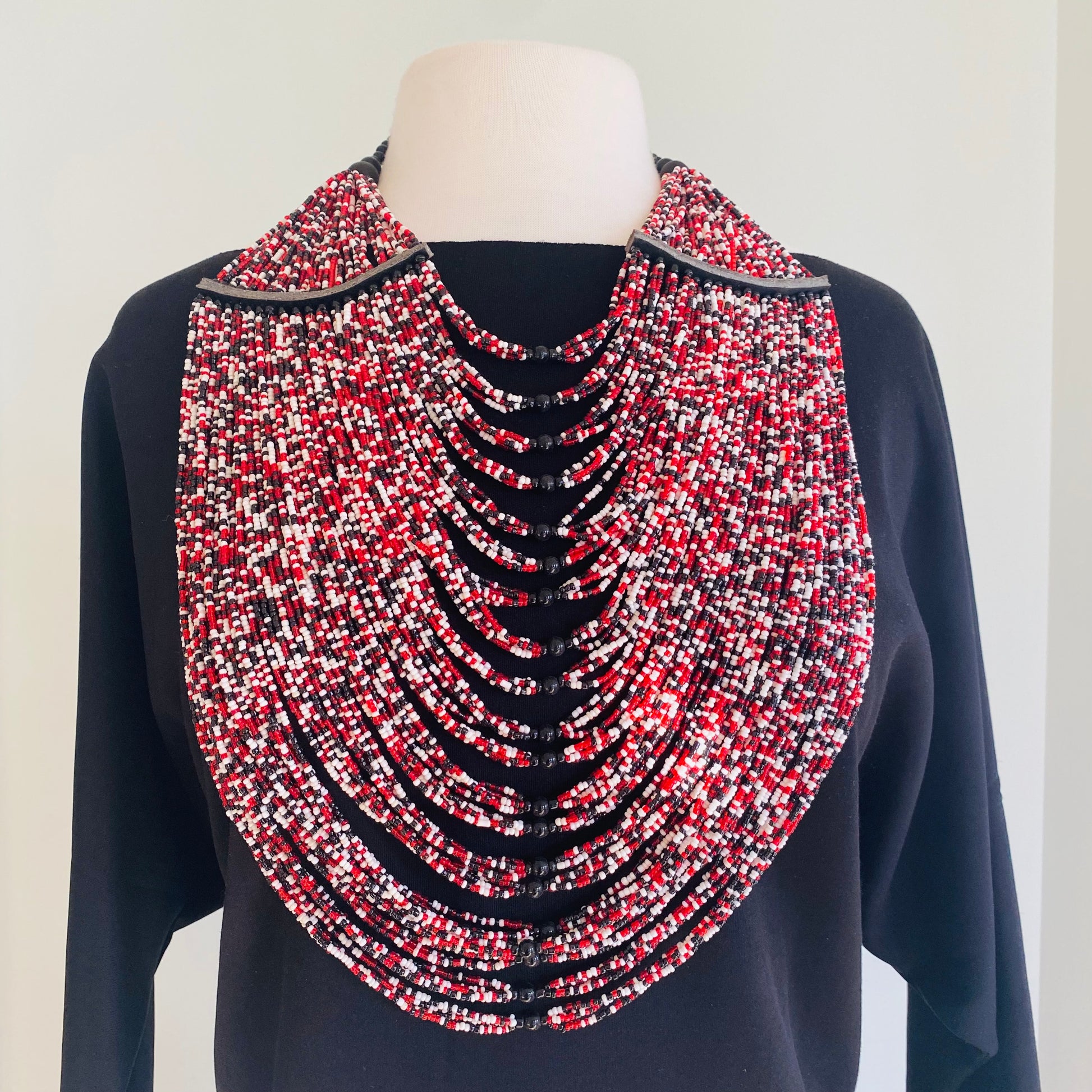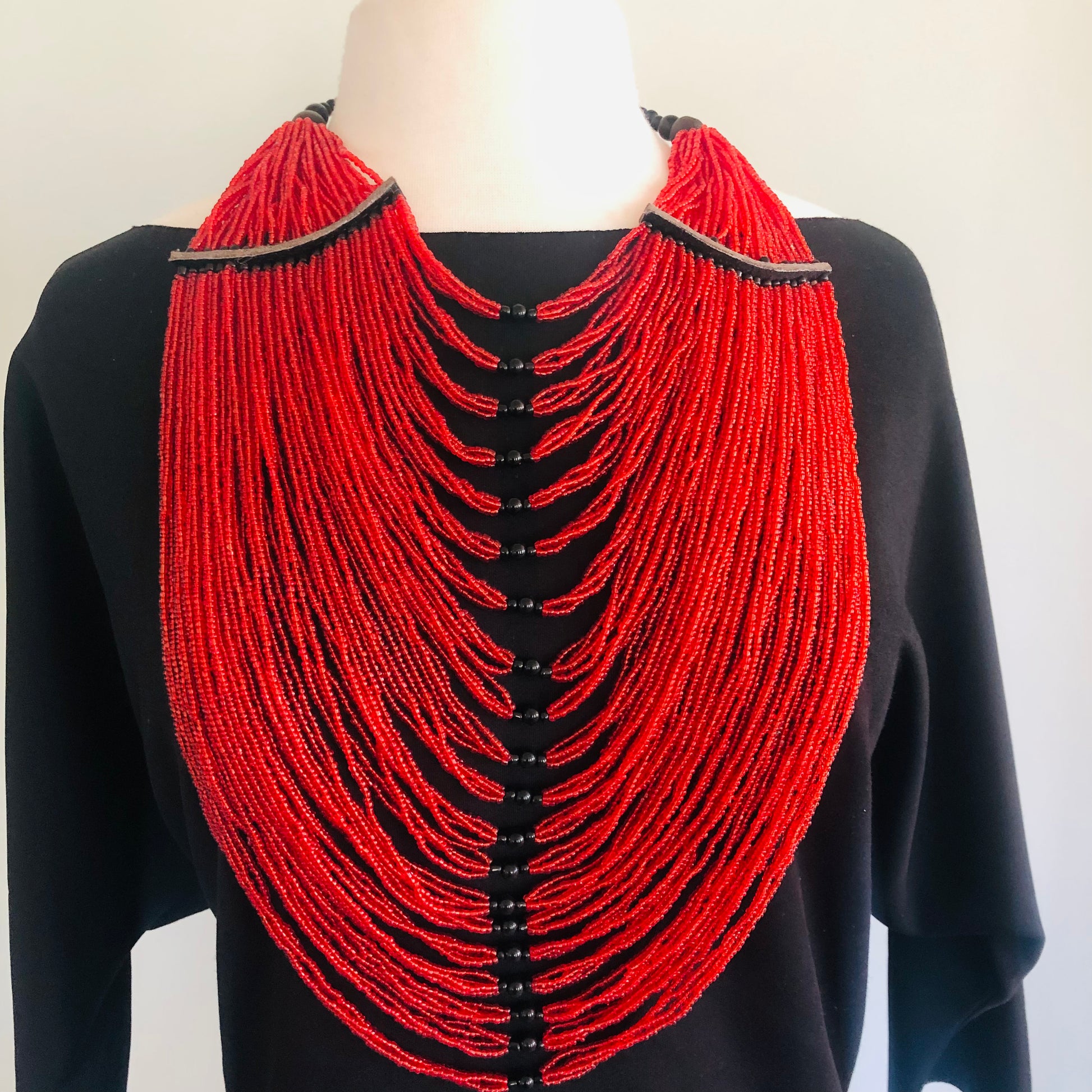 African beads, intricately strung together to create this elegant statement necklace; wear it anytime and anywhere; it can be dressed up or down for a casual look.