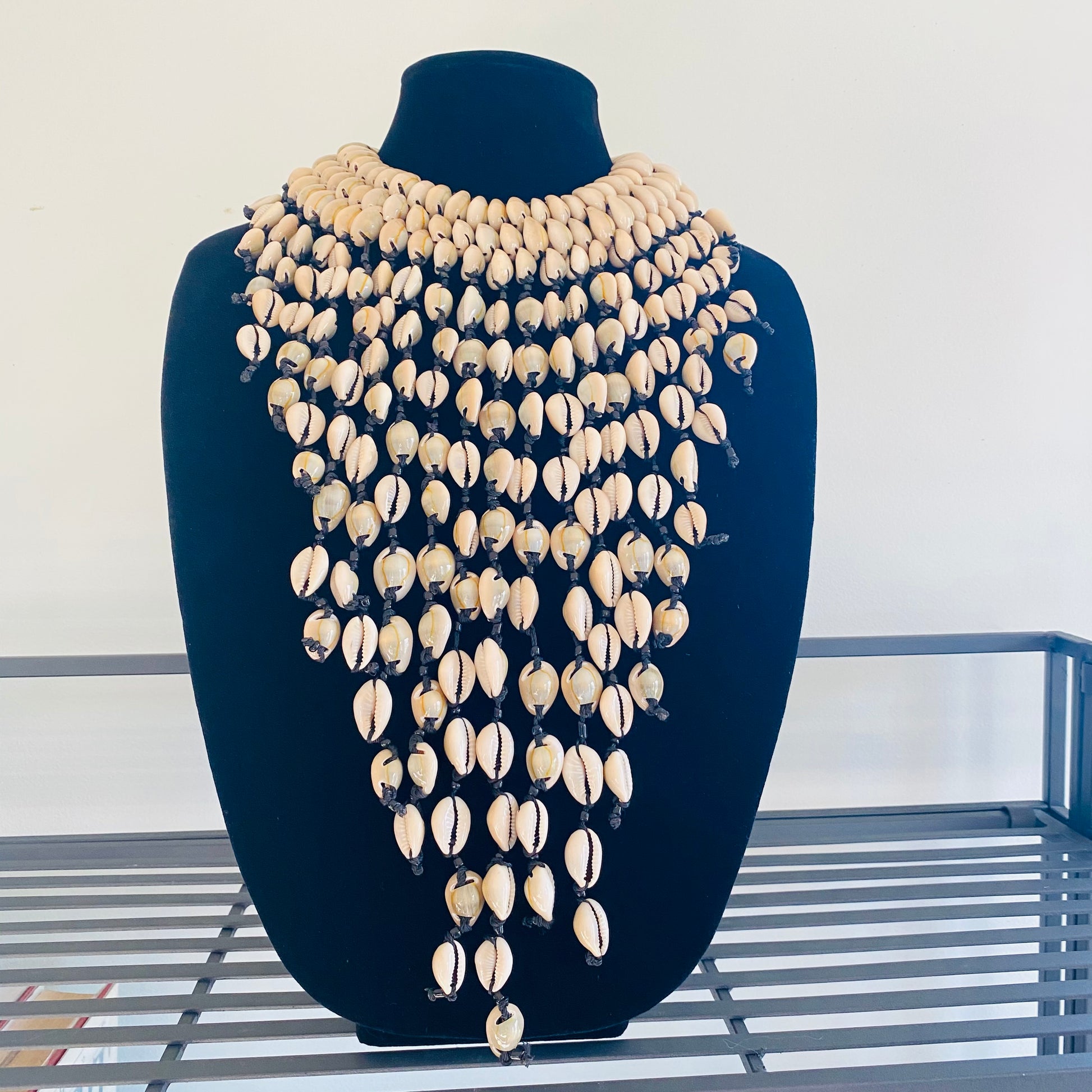 Real, authentic African Cowrie shells straight from the Motherland, intertwined together to create this dramatically stunning, cascading waterfall necklace; adjustable lobster clasp closure; rock it formally with an evening attire or casually with a t-shirt, jeans, leggings or shorts; any way you wear it, it speaks volumes of your character and style. DO YOU, SIS!