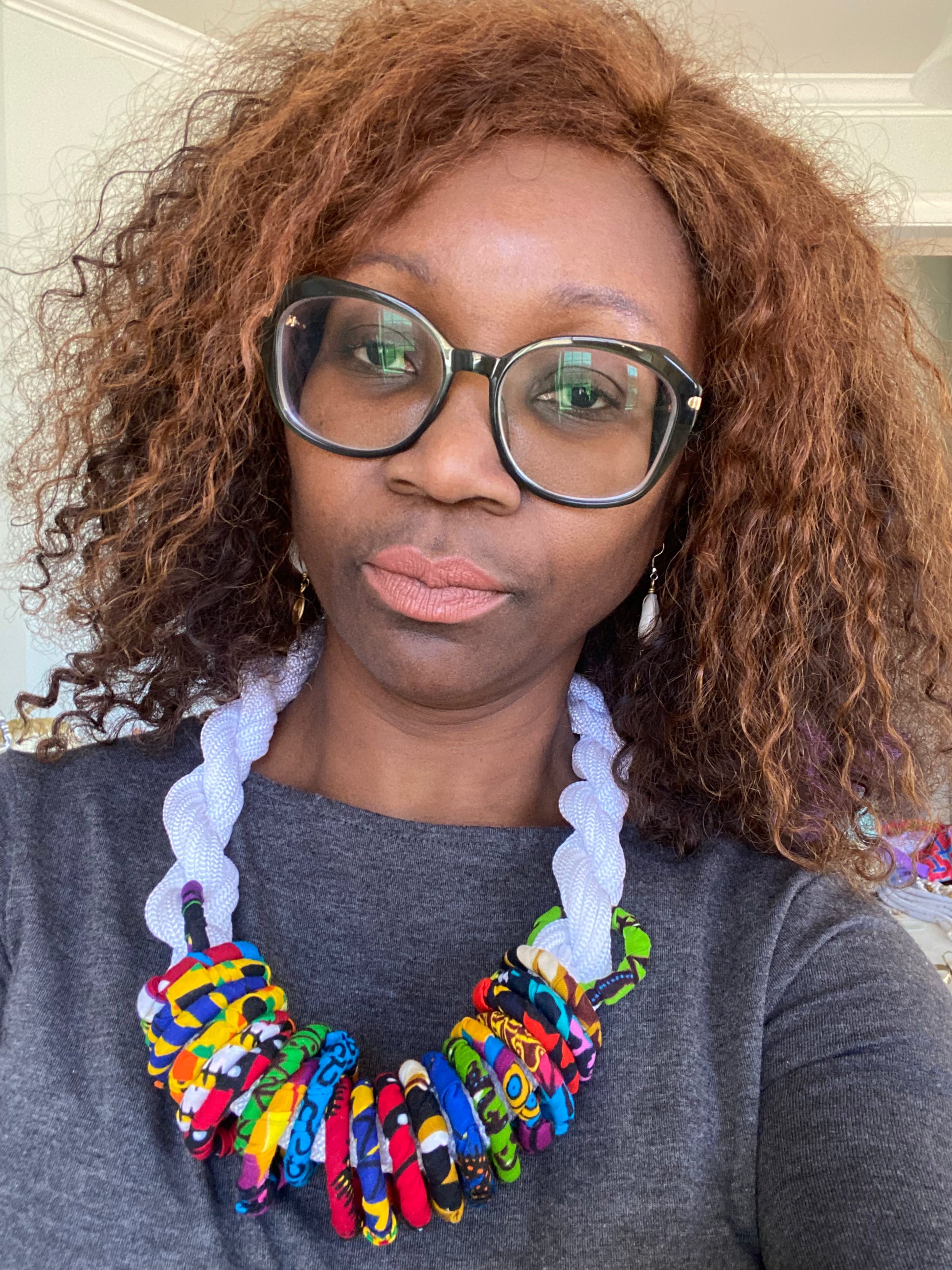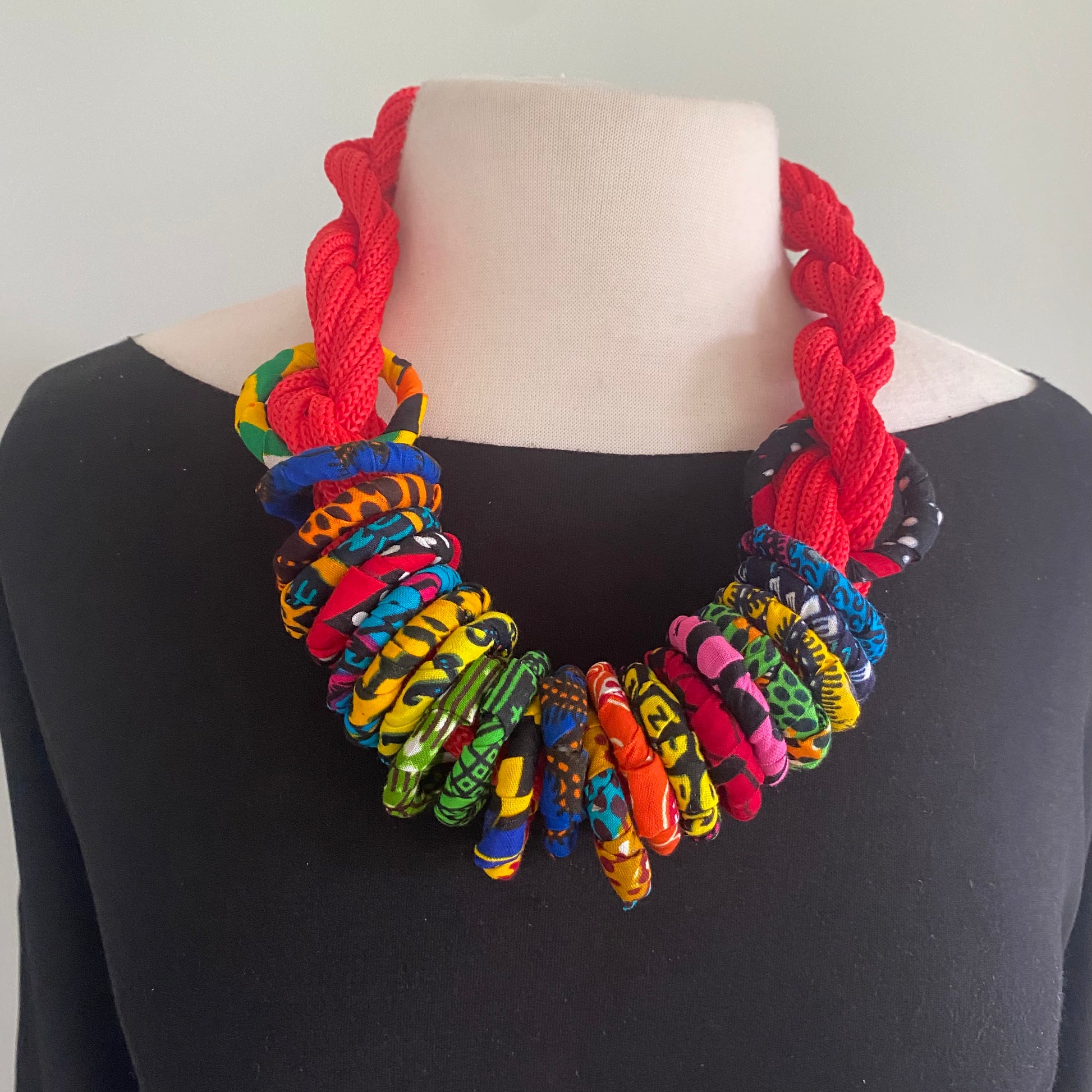 Super lightweight cord, braided and mixed with African print rings, topped off on a silver chain.