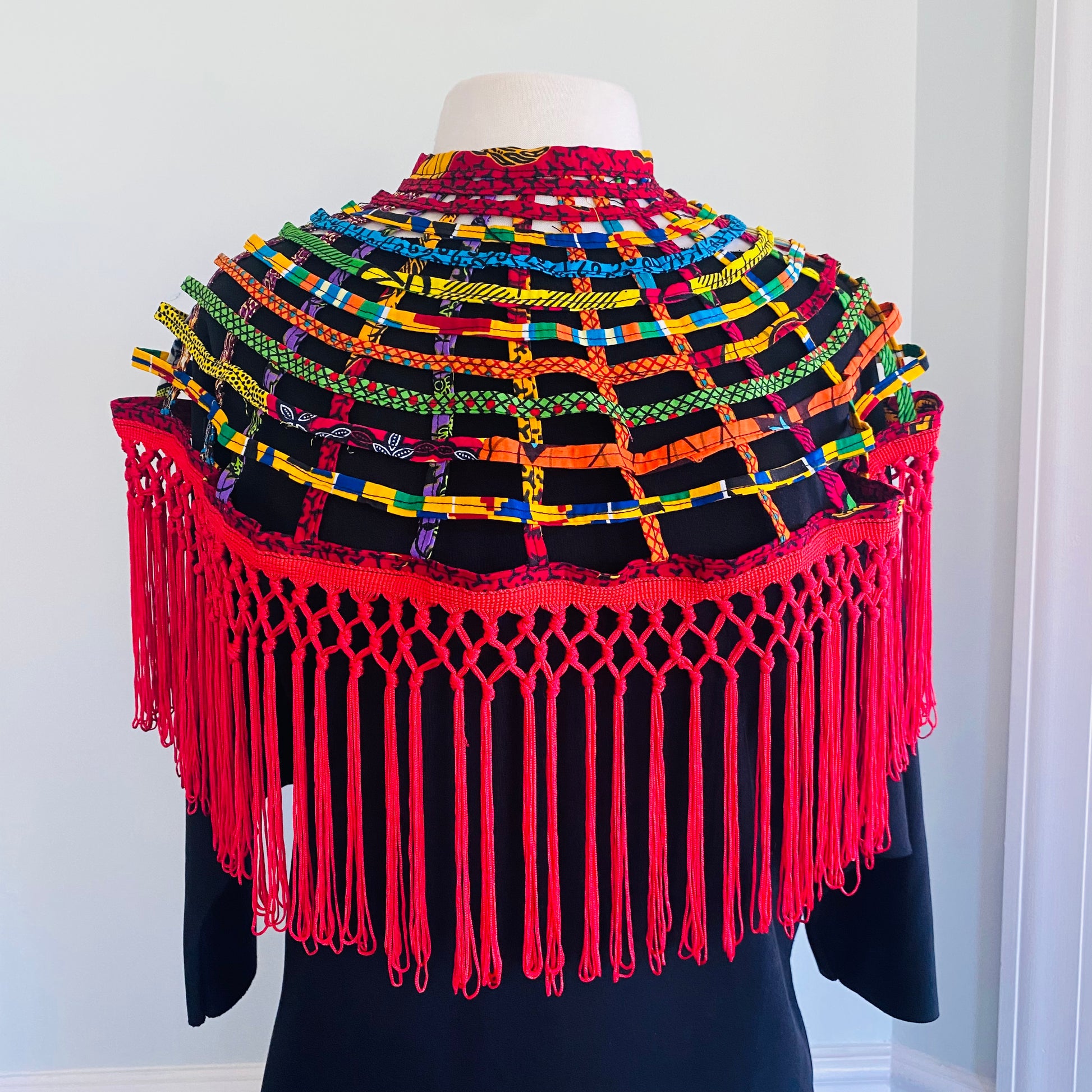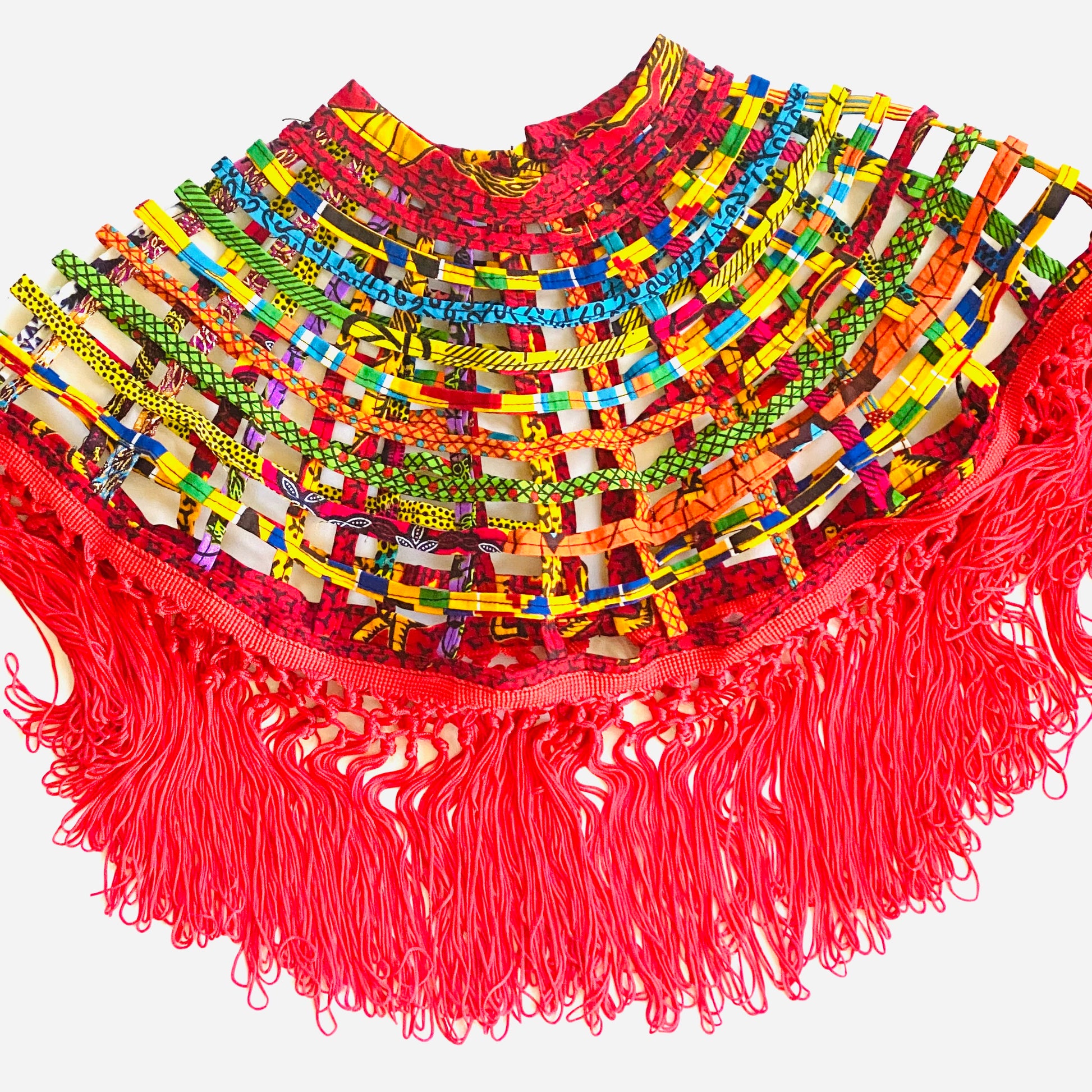 Authentic African print fabric carefully stitched together into a web, accented with red fringes; double button closure; neck measures 16 inches.