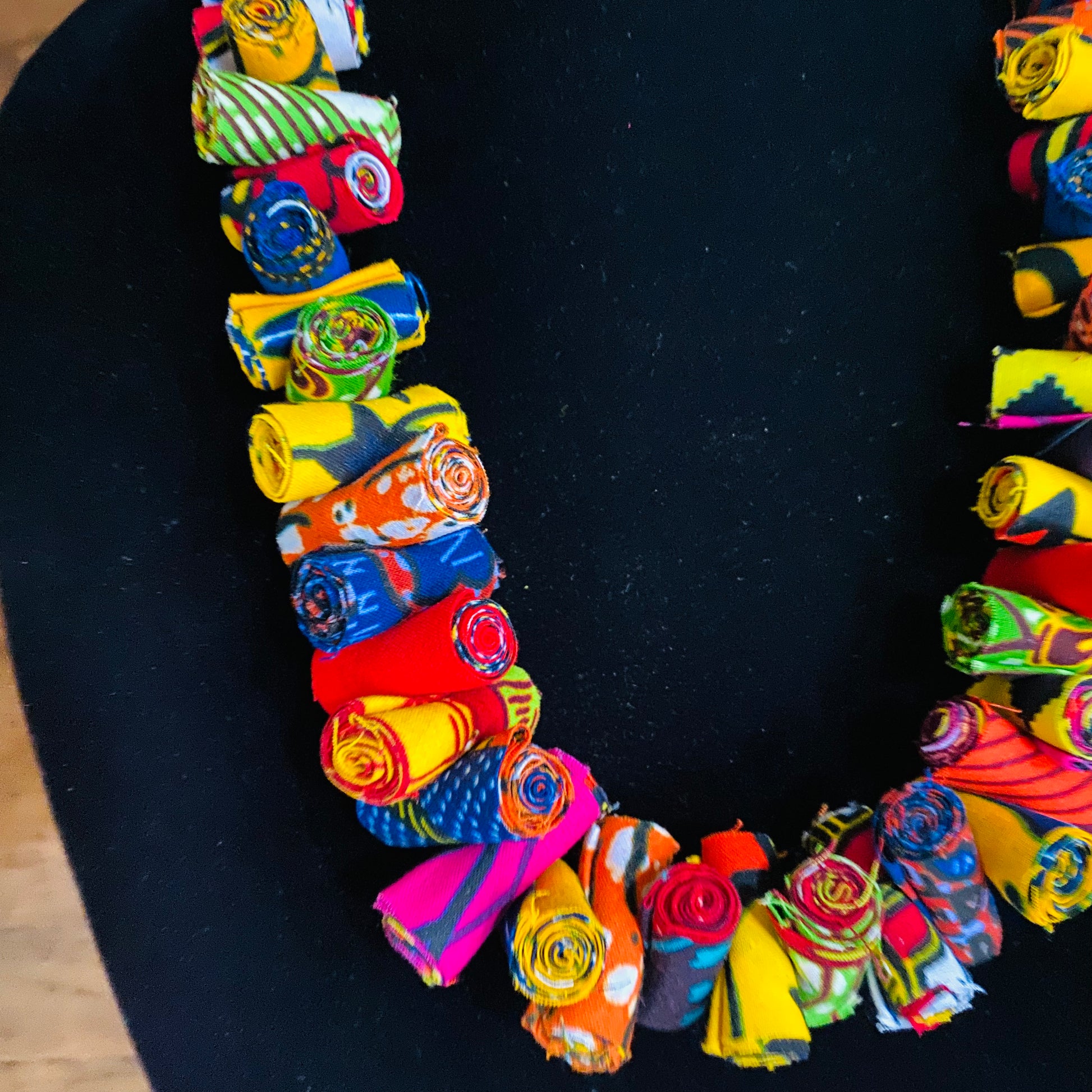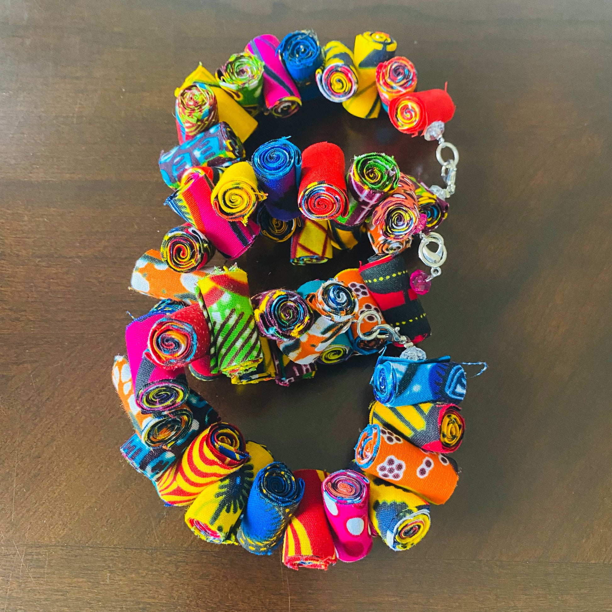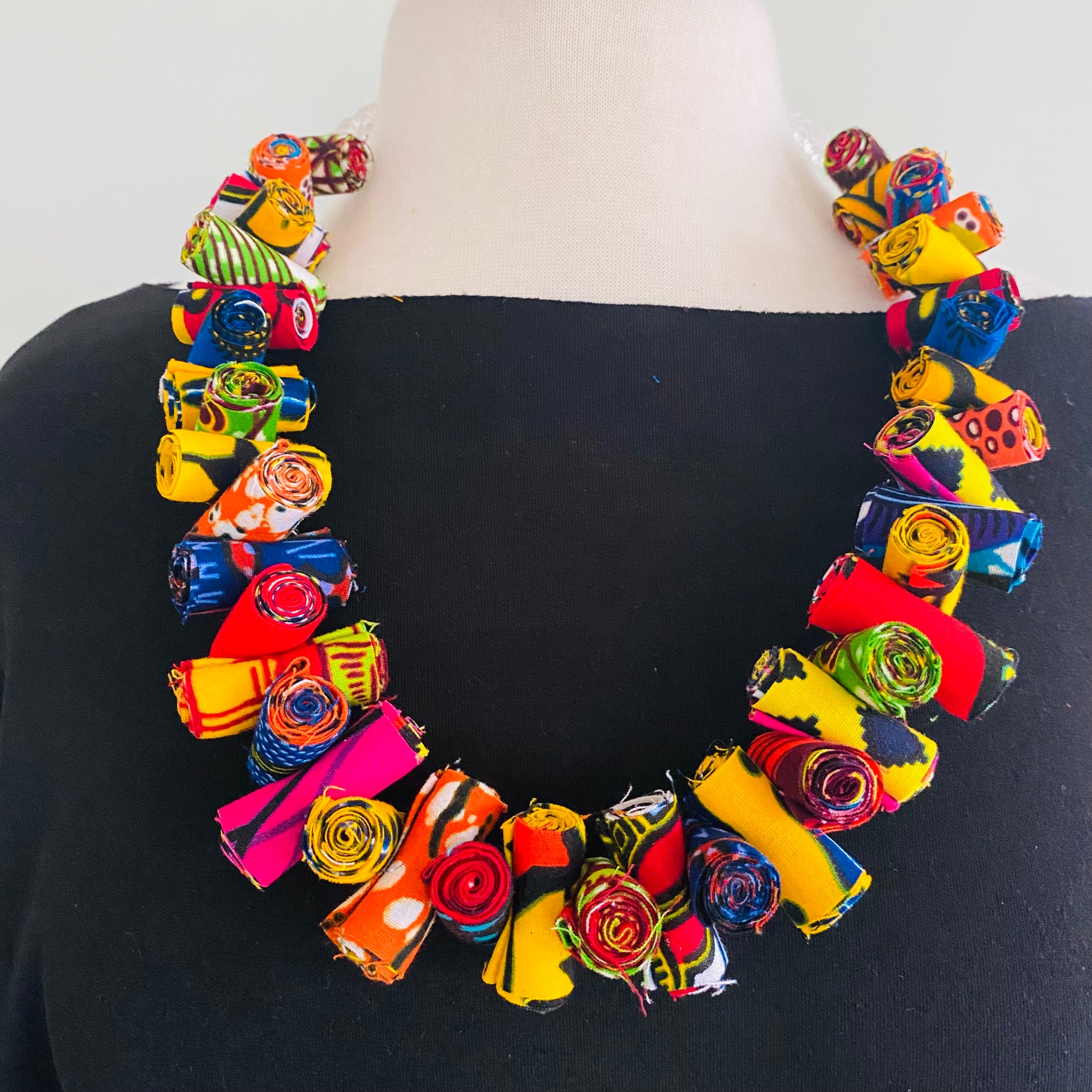 Authentic African fabric scrolls, cleverly linked to create this unique statement piece; super lightweight; necklace comes with matching earrings; adjustable chain; bracelet sold separately.