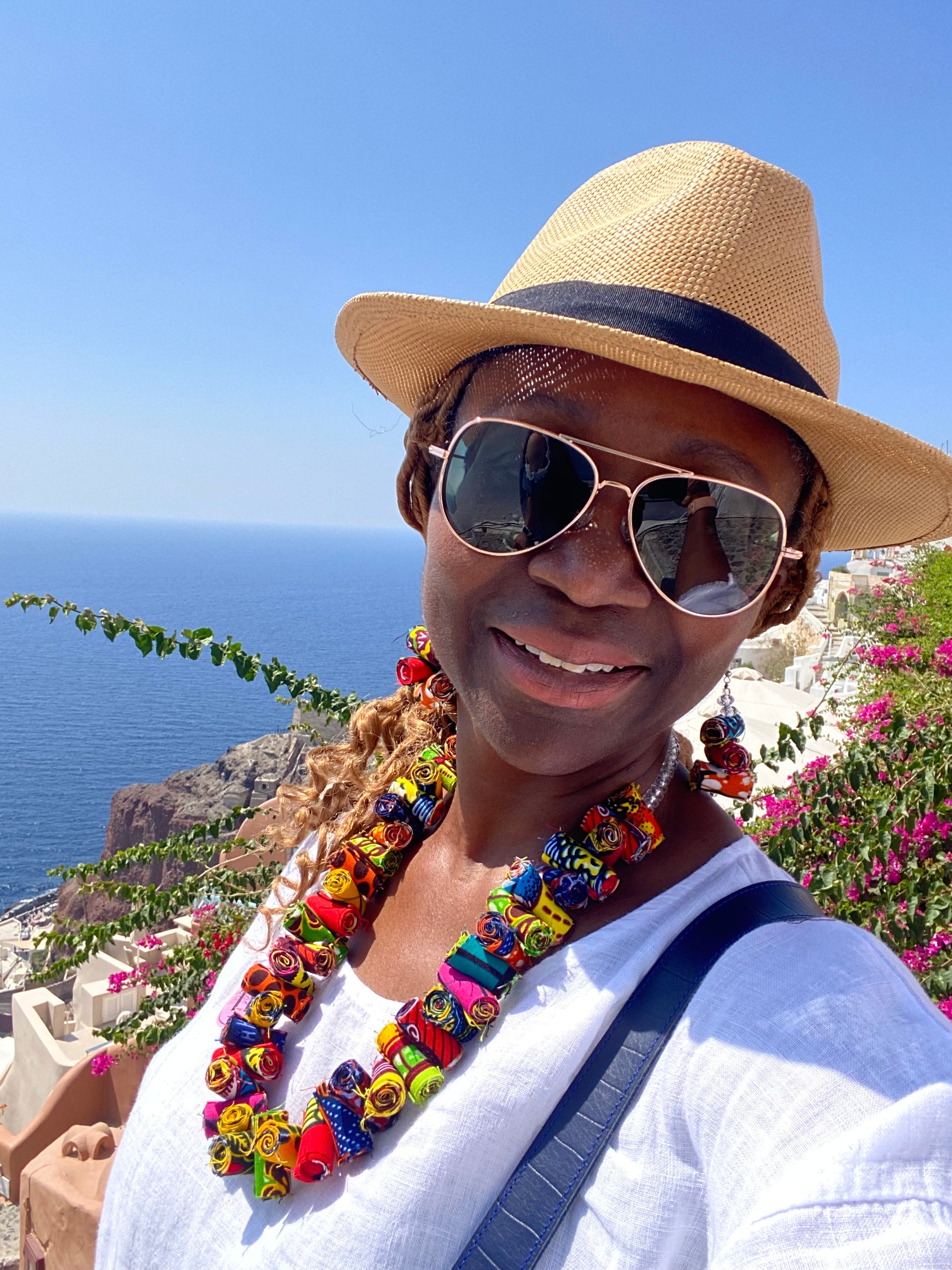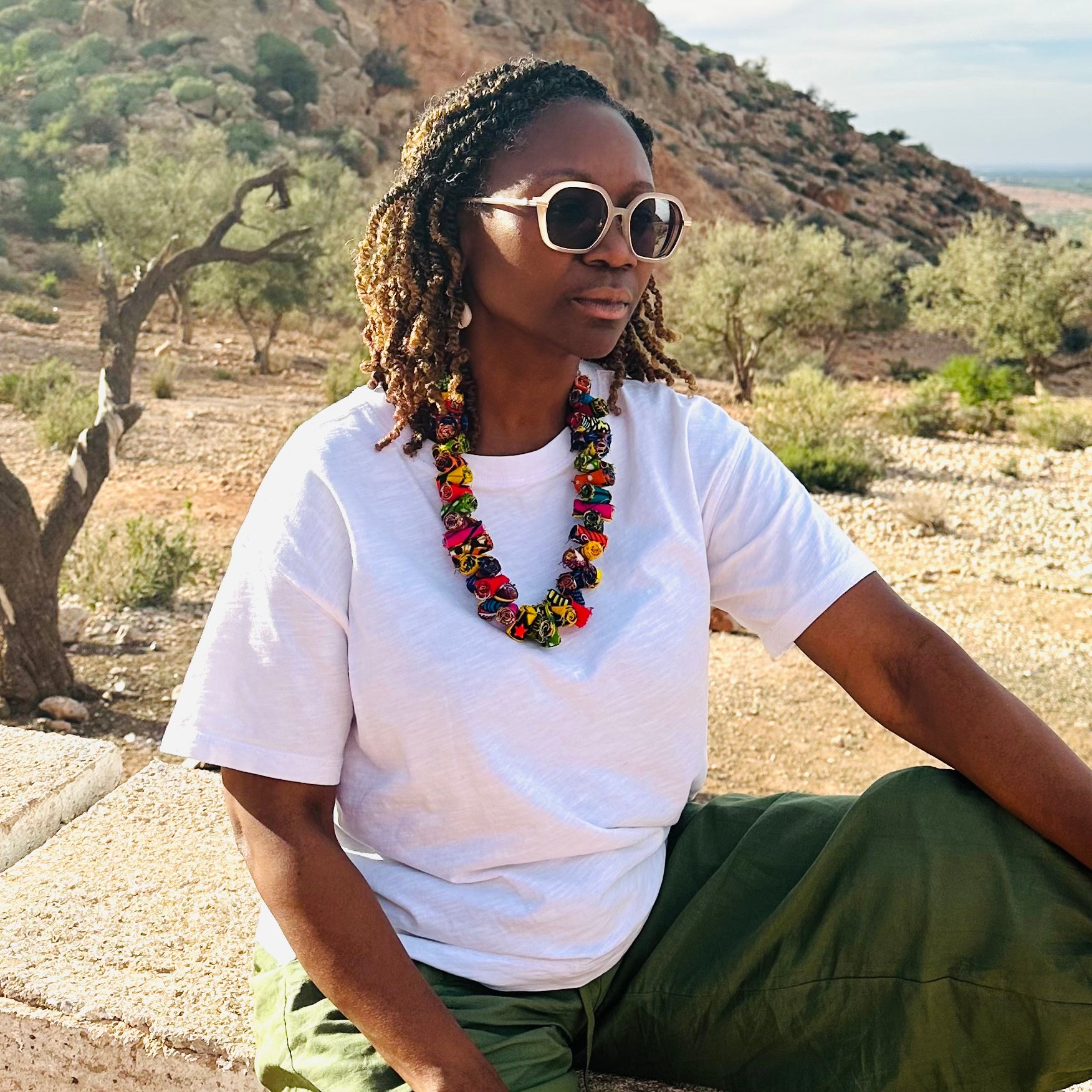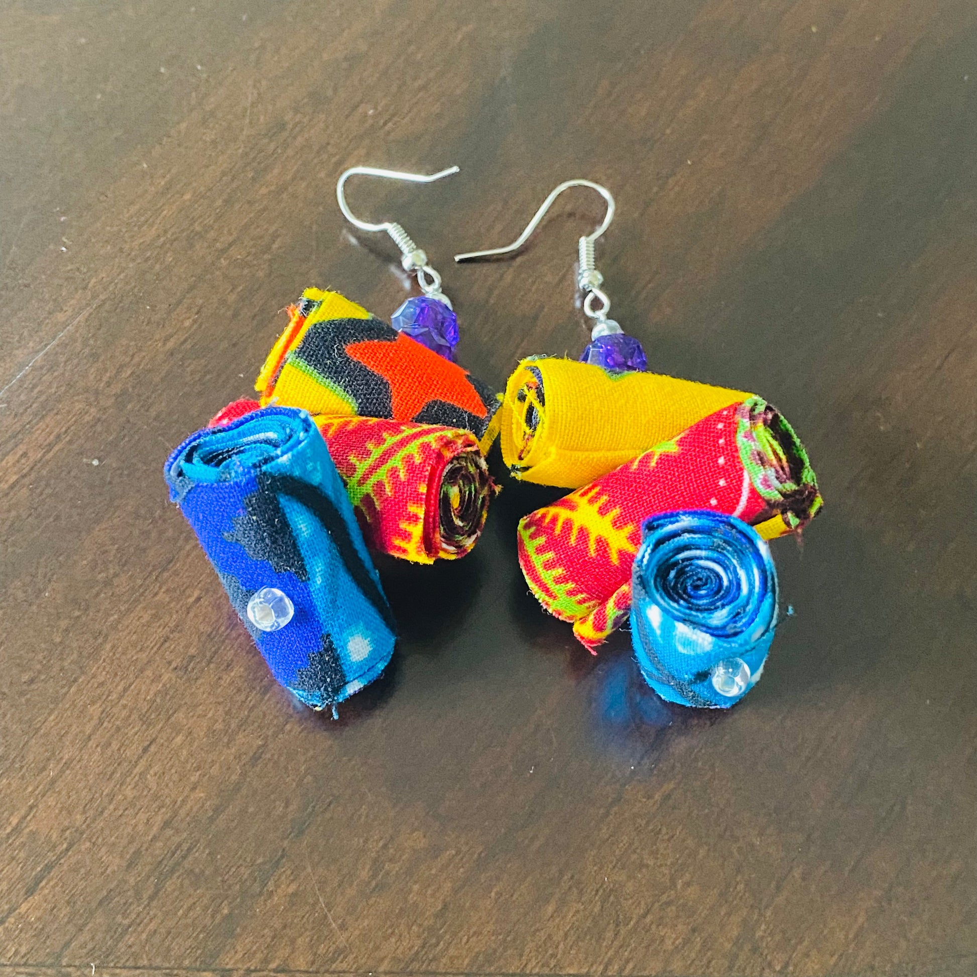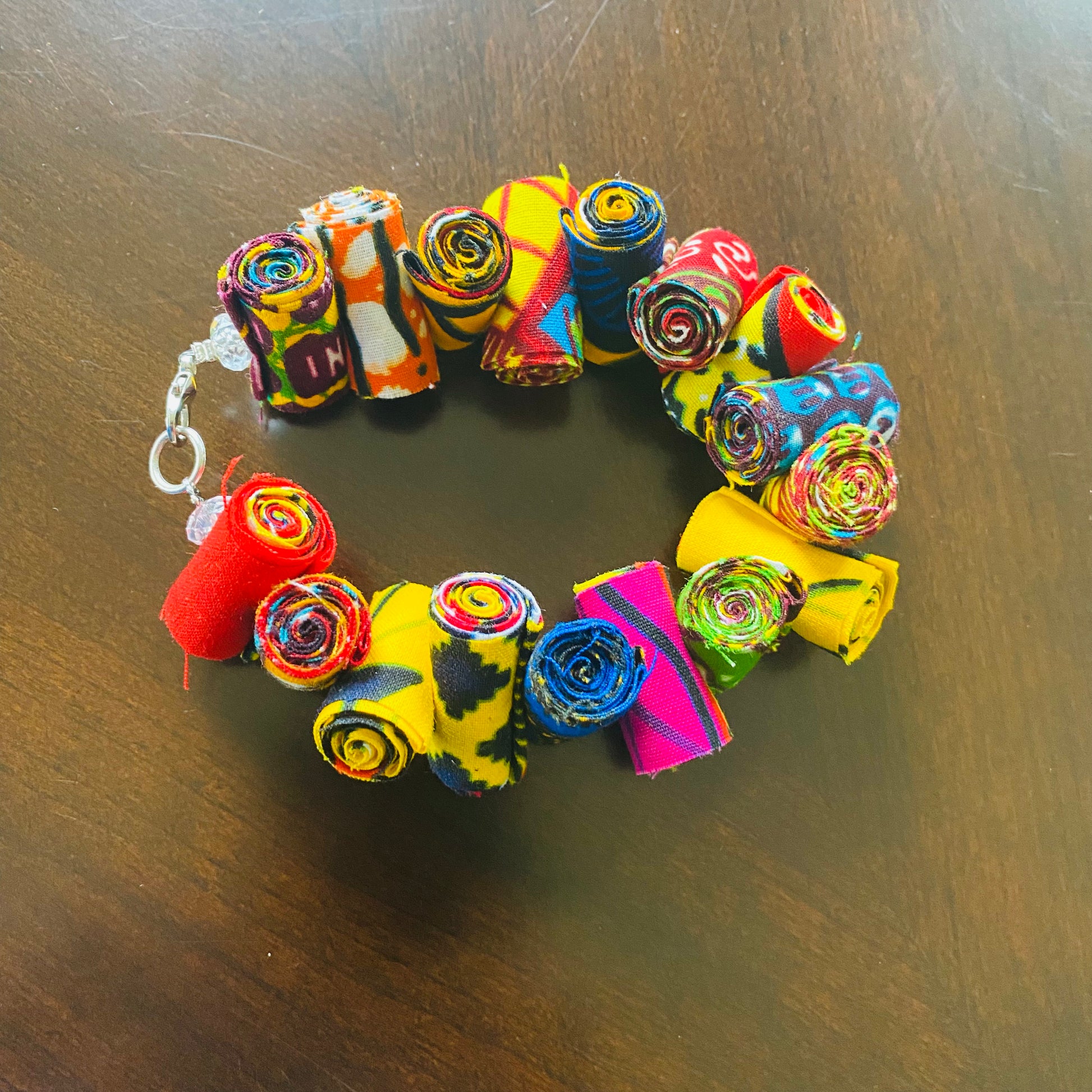 Authentic African fabric scrolls, cleverly linked to create this unique statement piece; super lightweight; necklace comes with matching earrings; adjustable chain; bracelet sold separately.